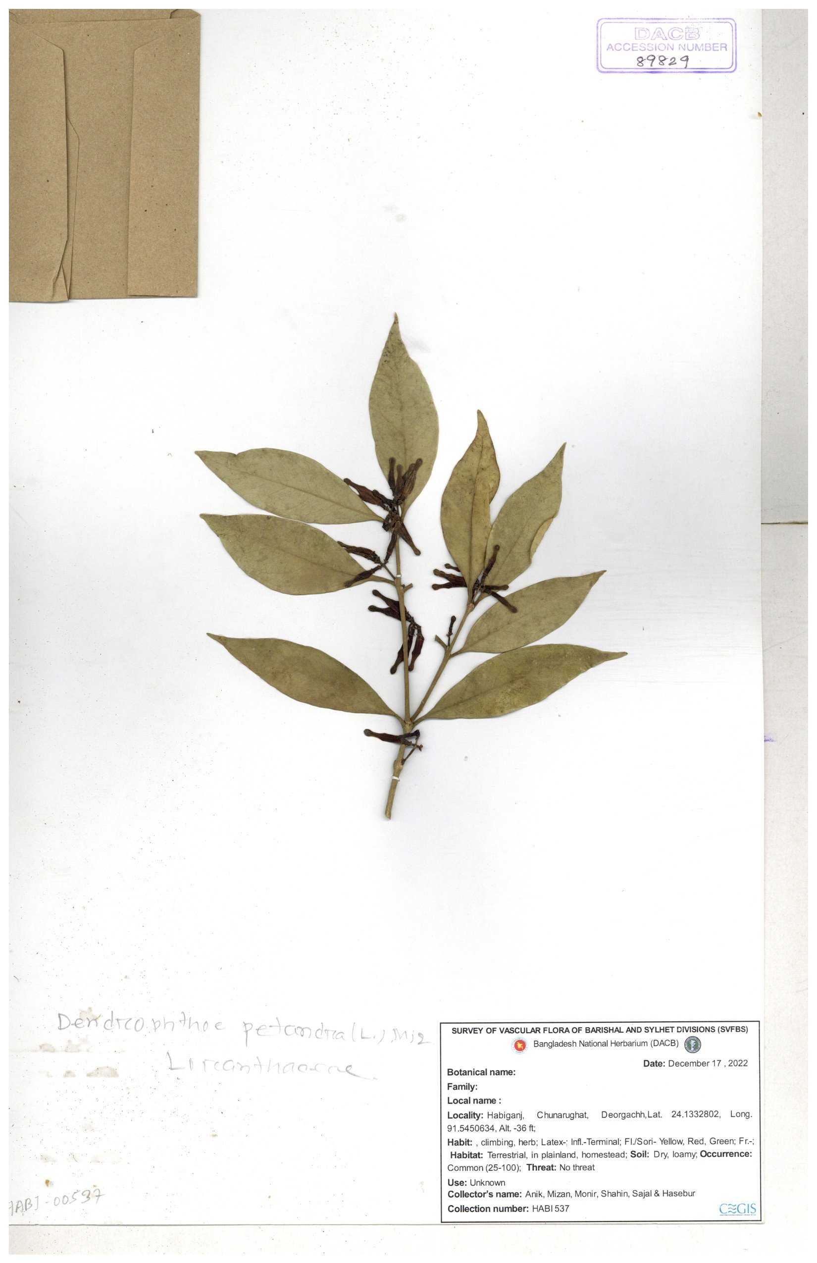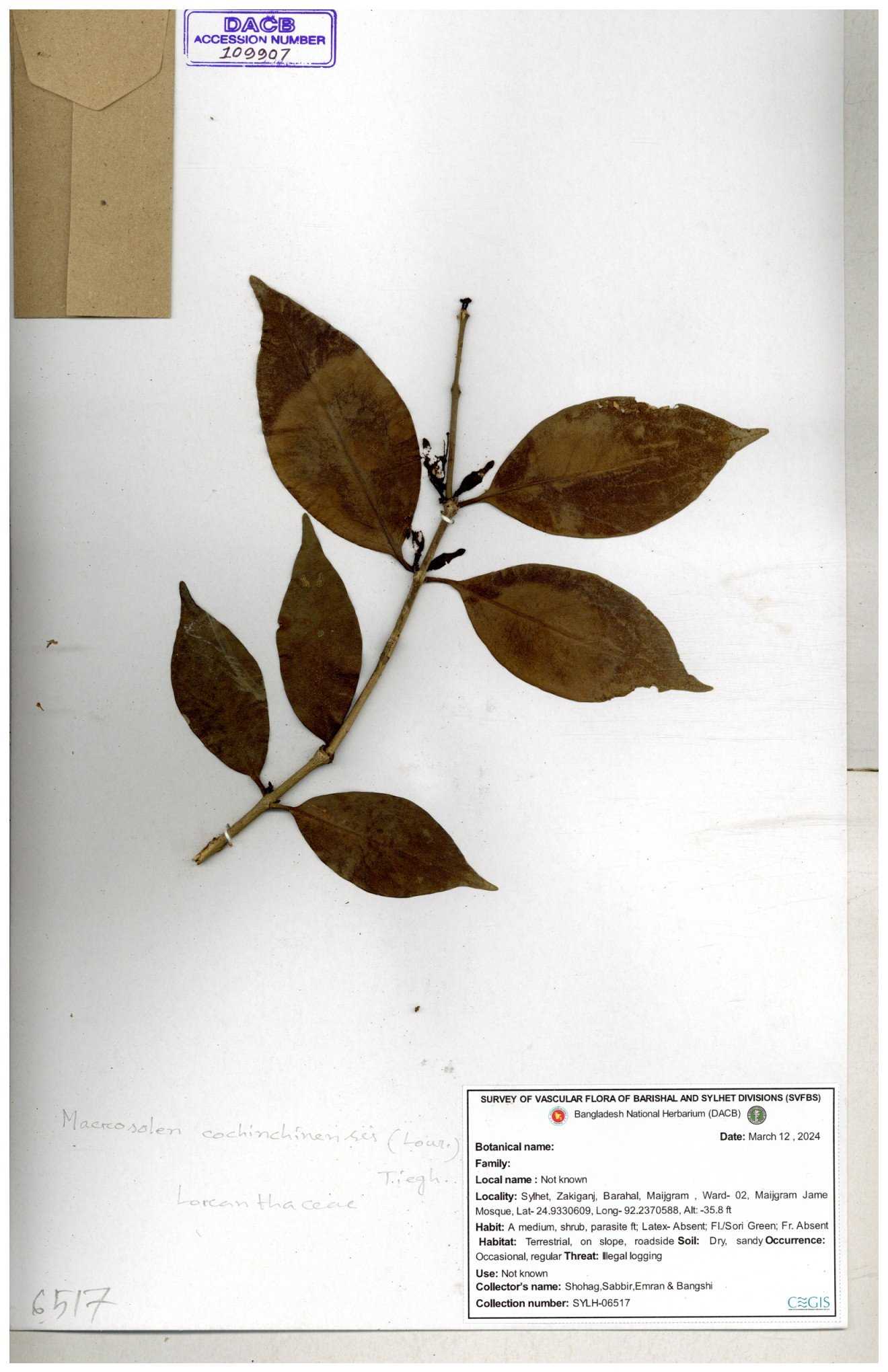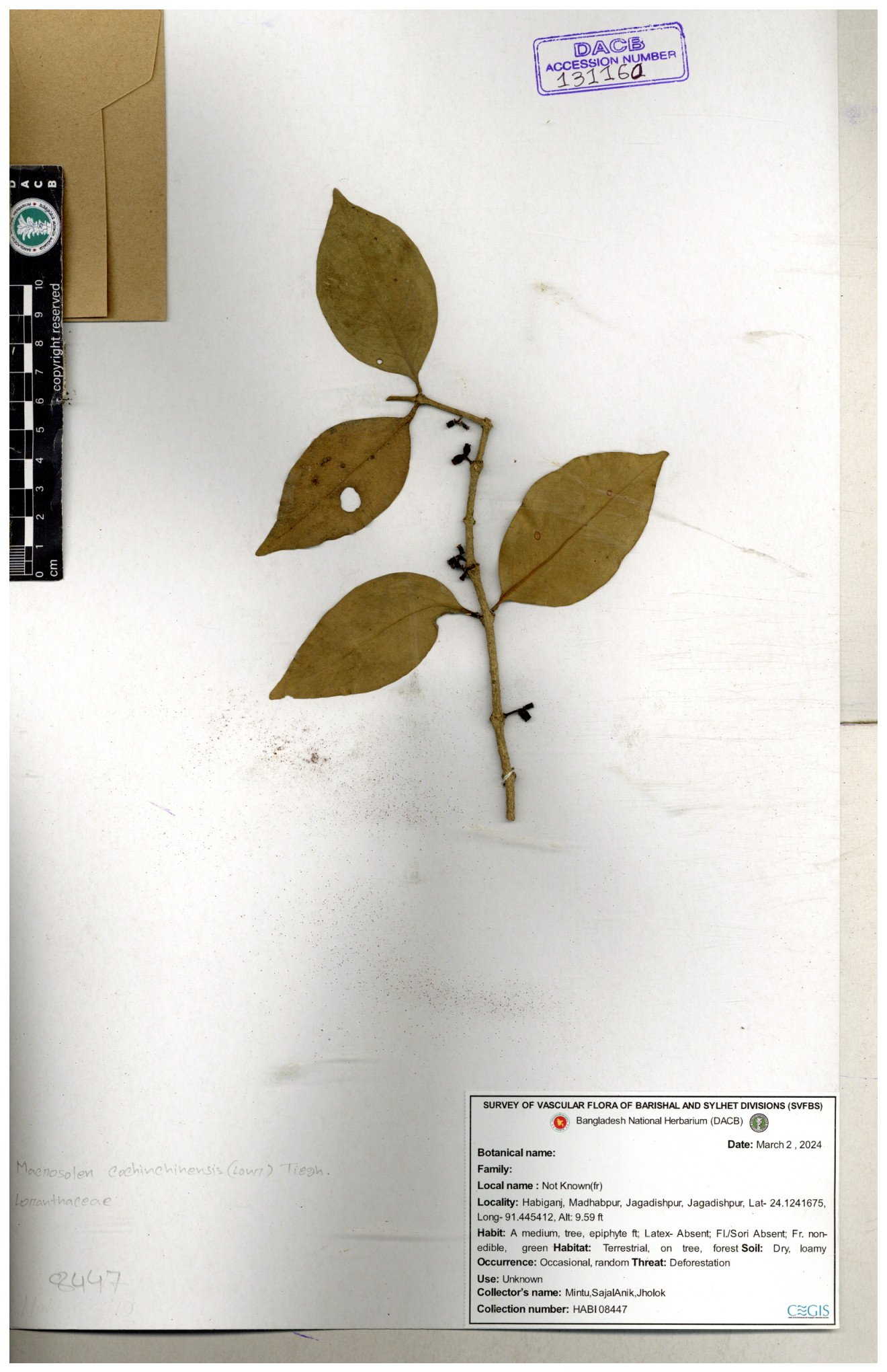 | 6337 | Loranthaceae | Macrosolen cochichinensis (Loun) | Huq & Rahman & Mia | H-5912 30-11--0001 |