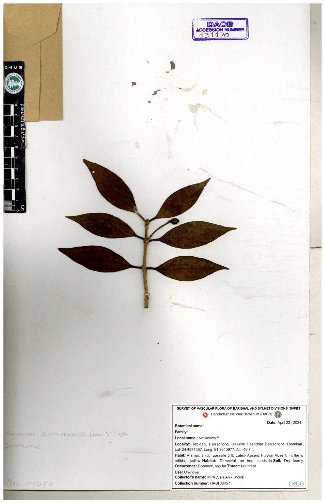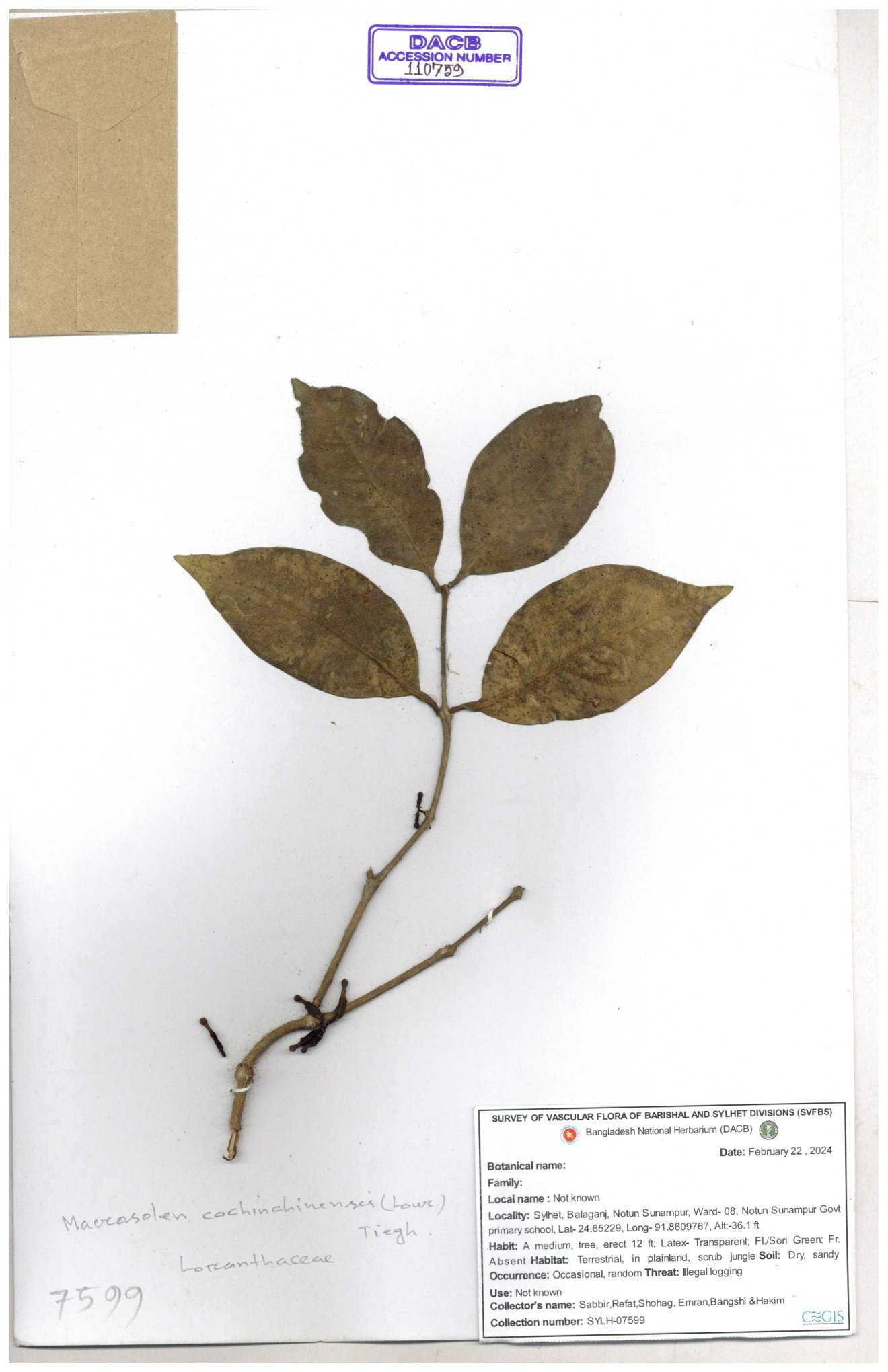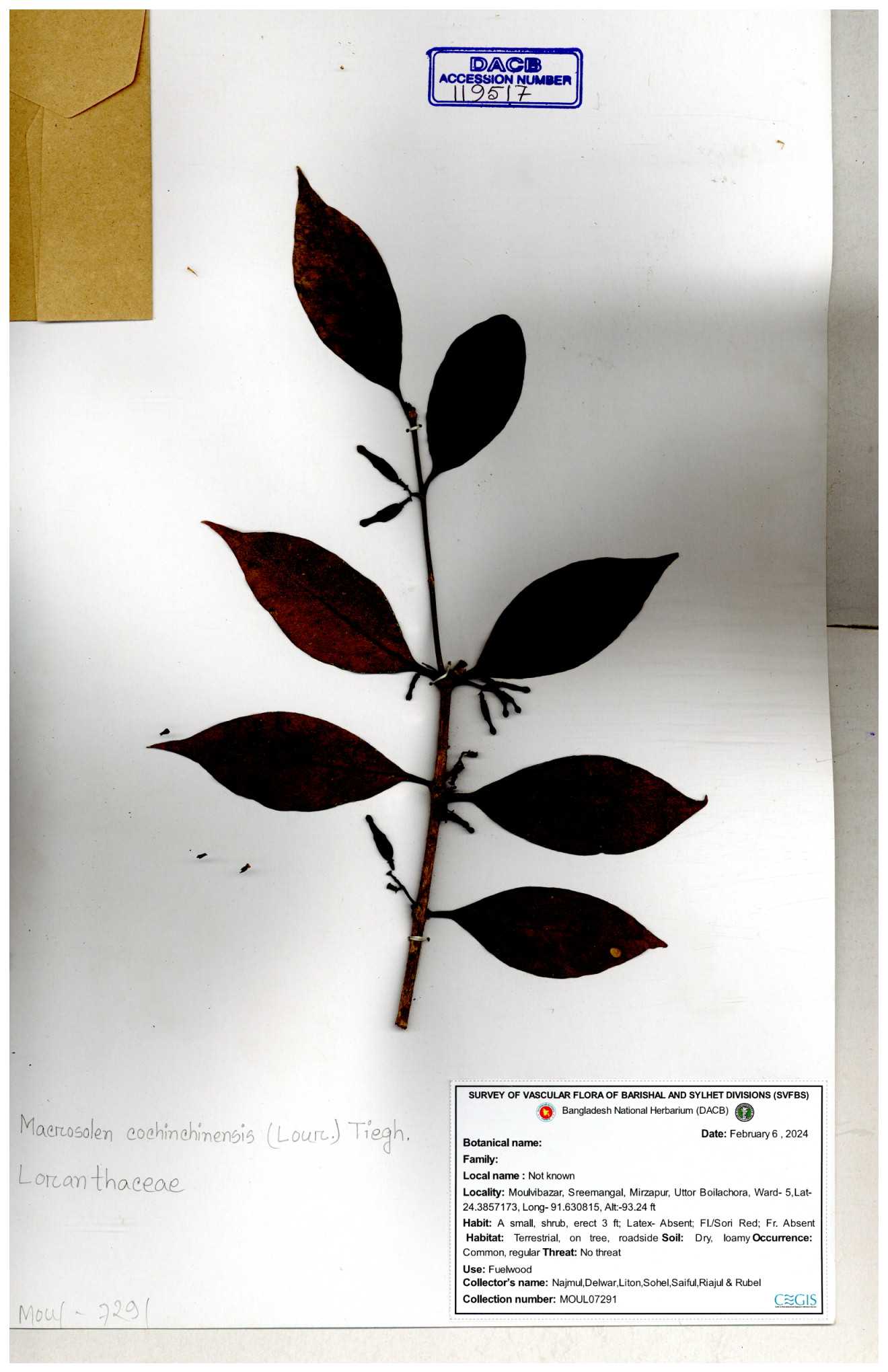 | 42198 | Loranthaceae | Macrosolen cochichinensis (Lour.) | Khandakar Kamrul Islam | KKI-58 30-11--0001 |