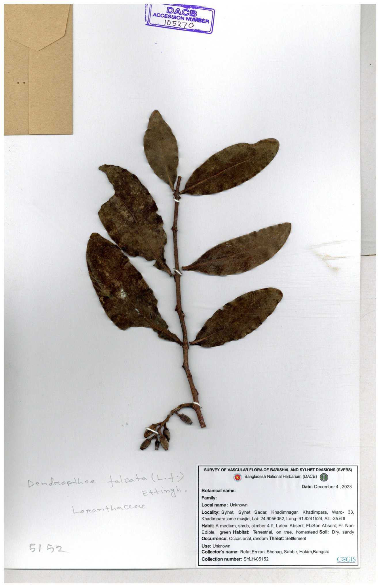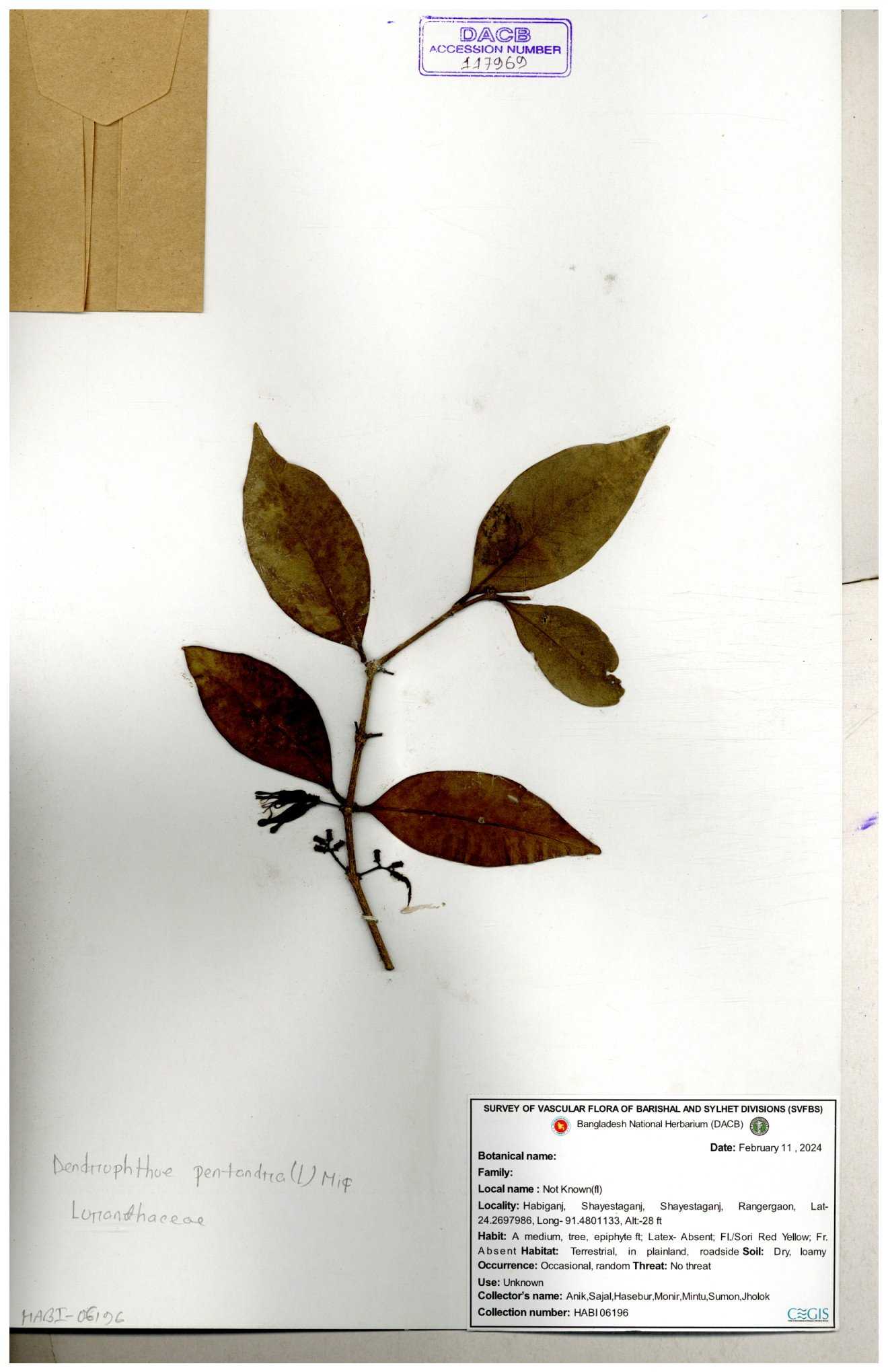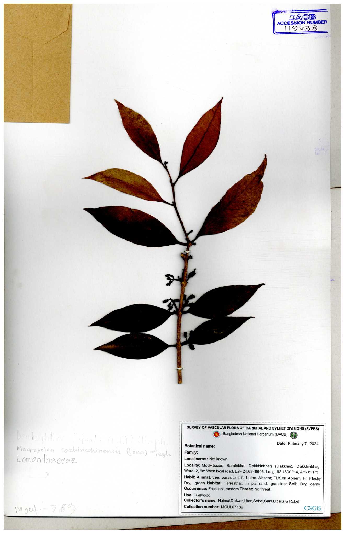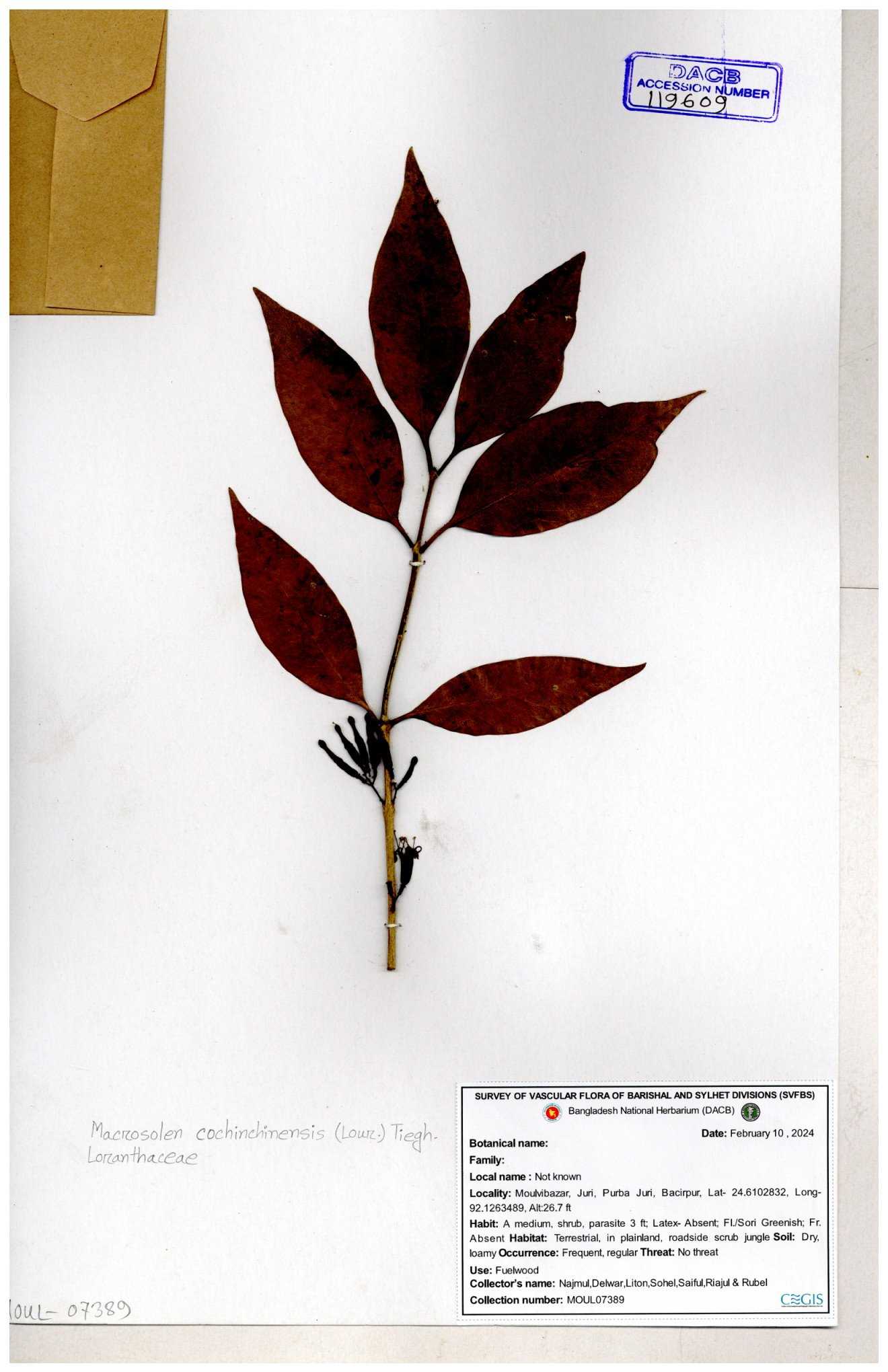 | 42198 | Loranthaceae | Macrosolen cochichinensis (Lour.) | Khandakar Kamrul Islam | KKI-58 30-11--0001 |