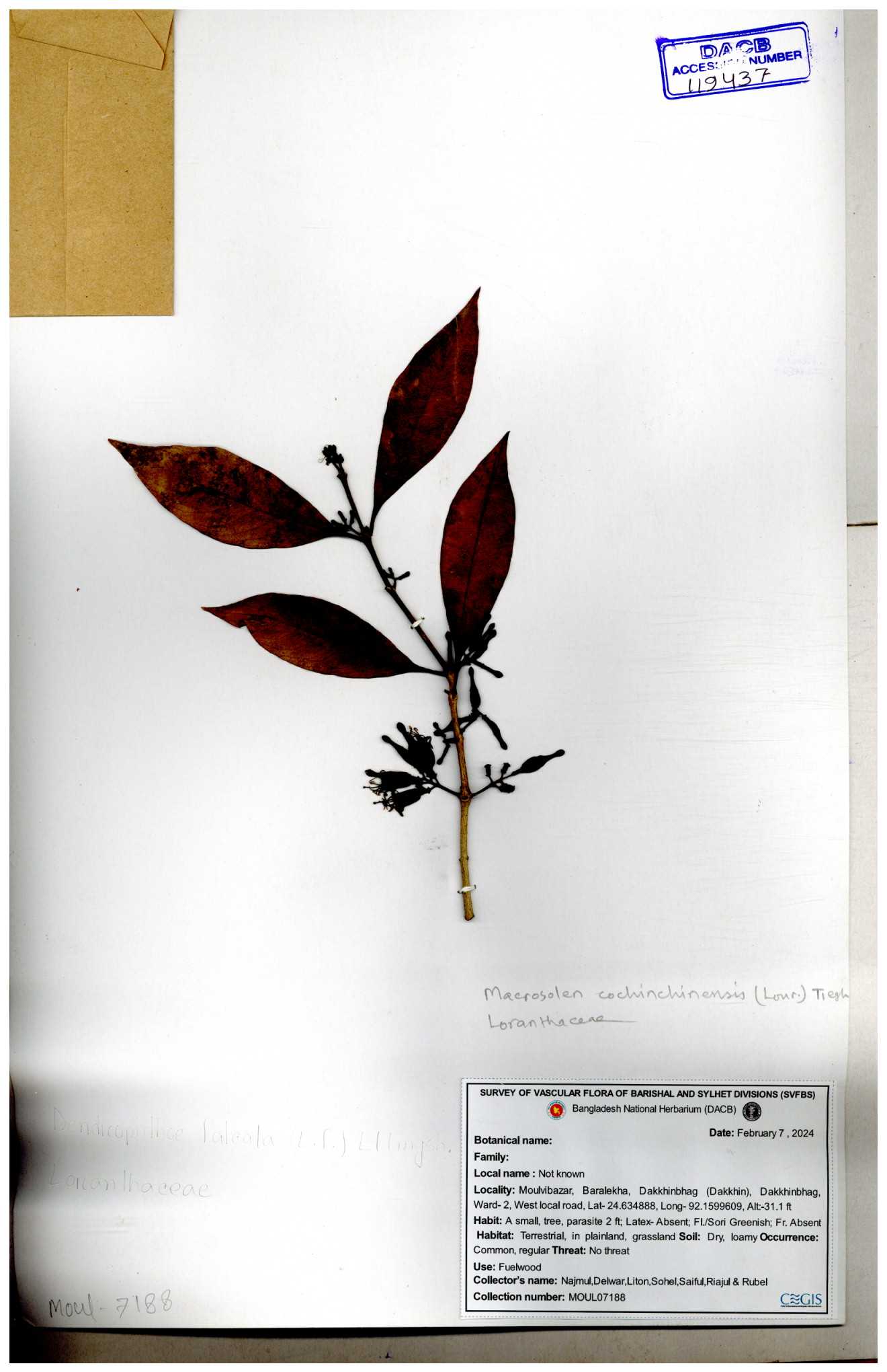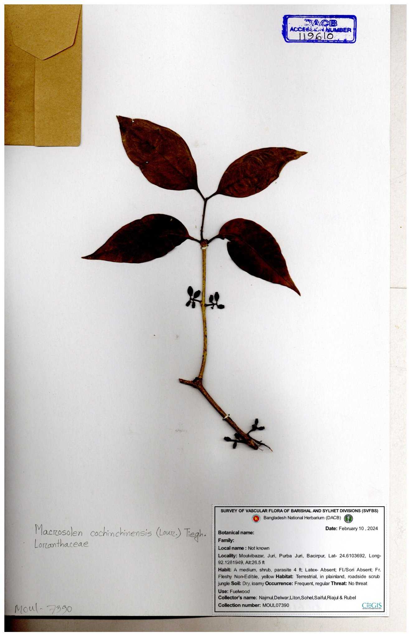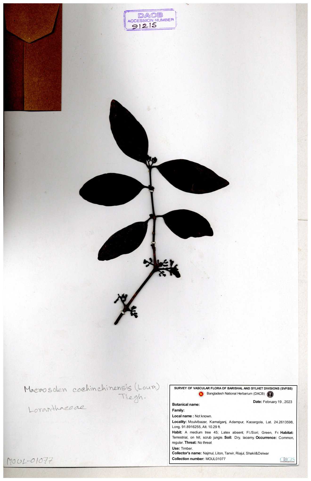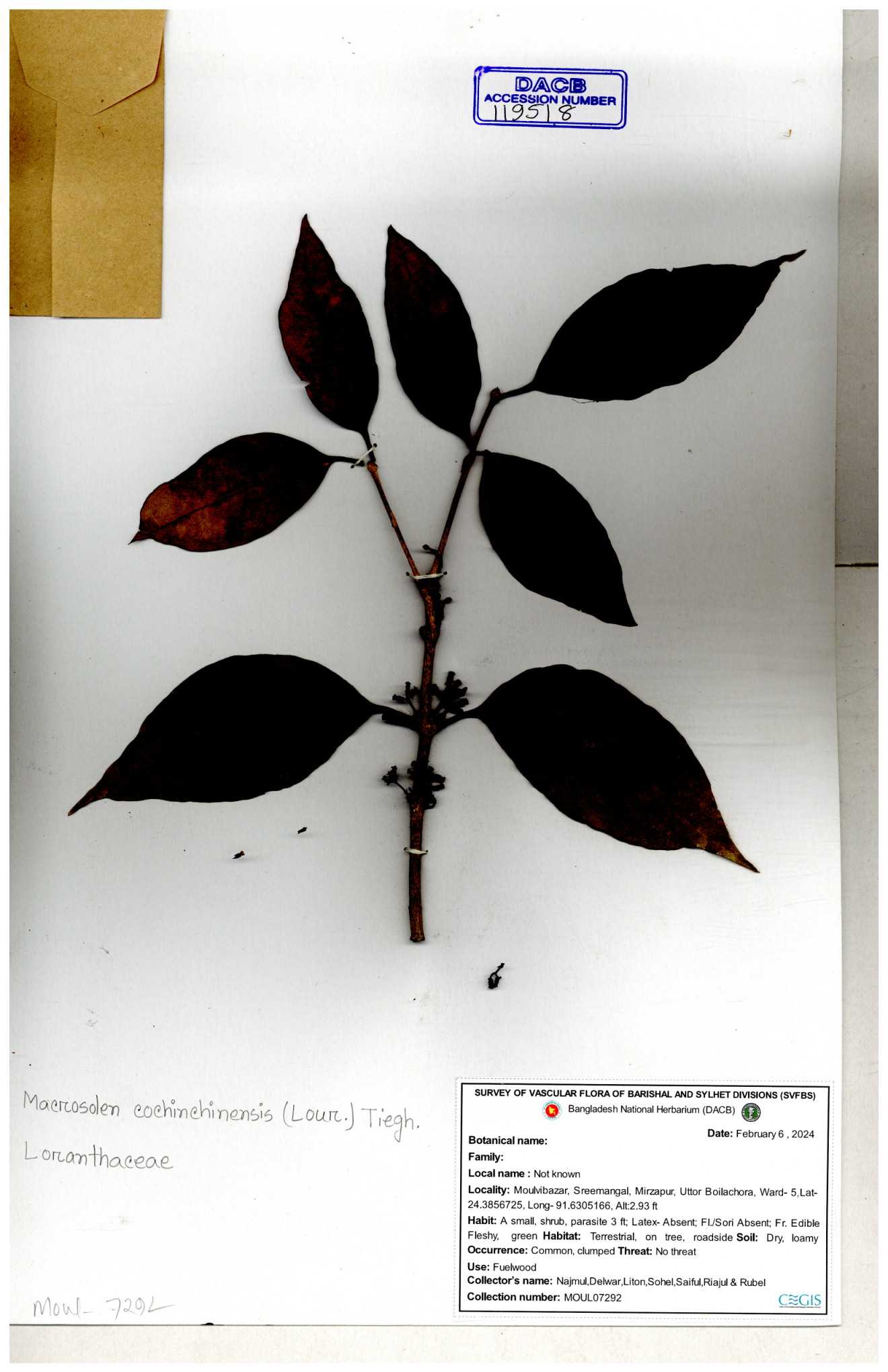 | 6336 | Loranthaceae | Macrosolen cochichinensis (Loun) | Mia, Rahman & Zaman | M-969 30-11--0001 |