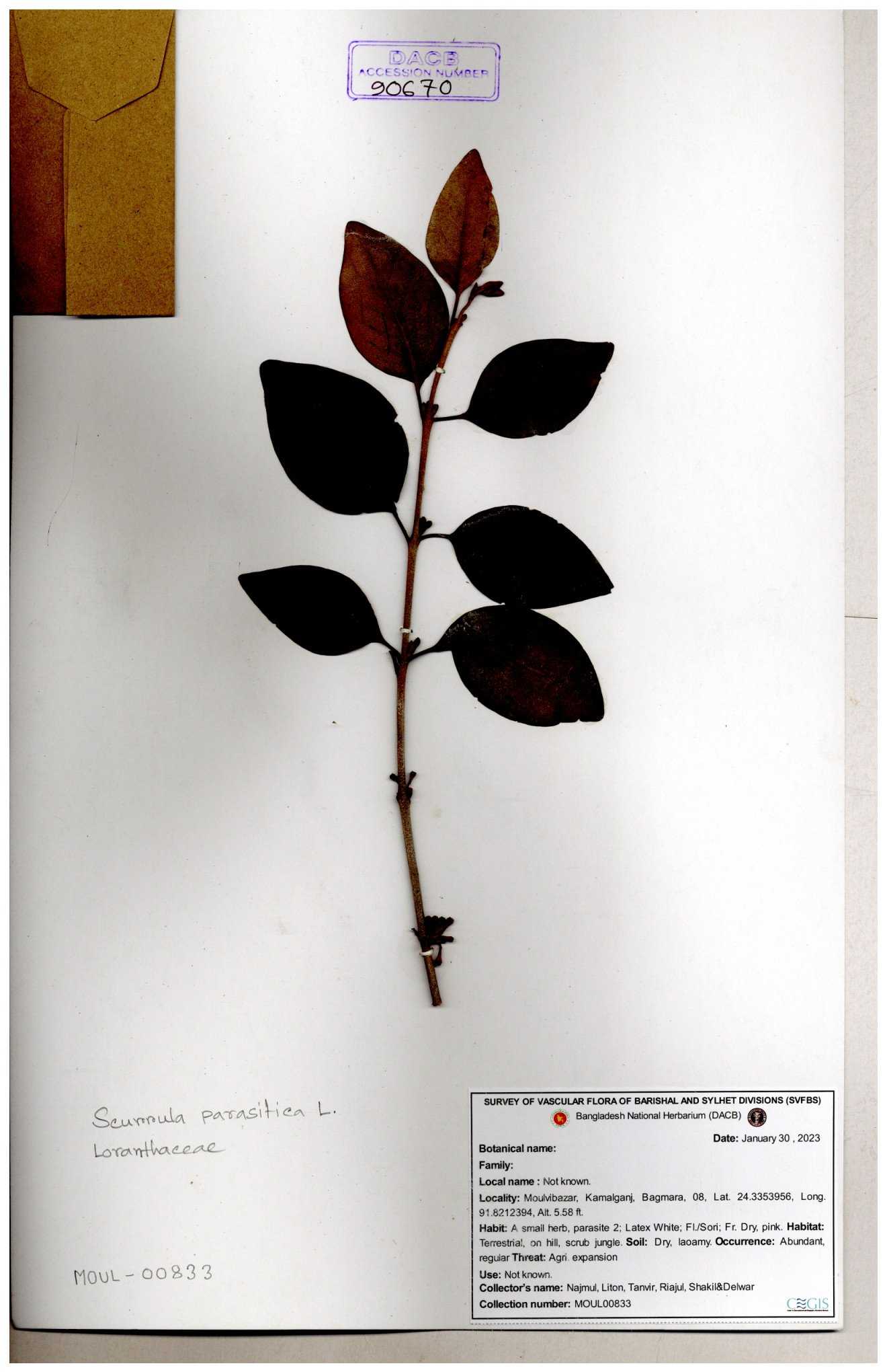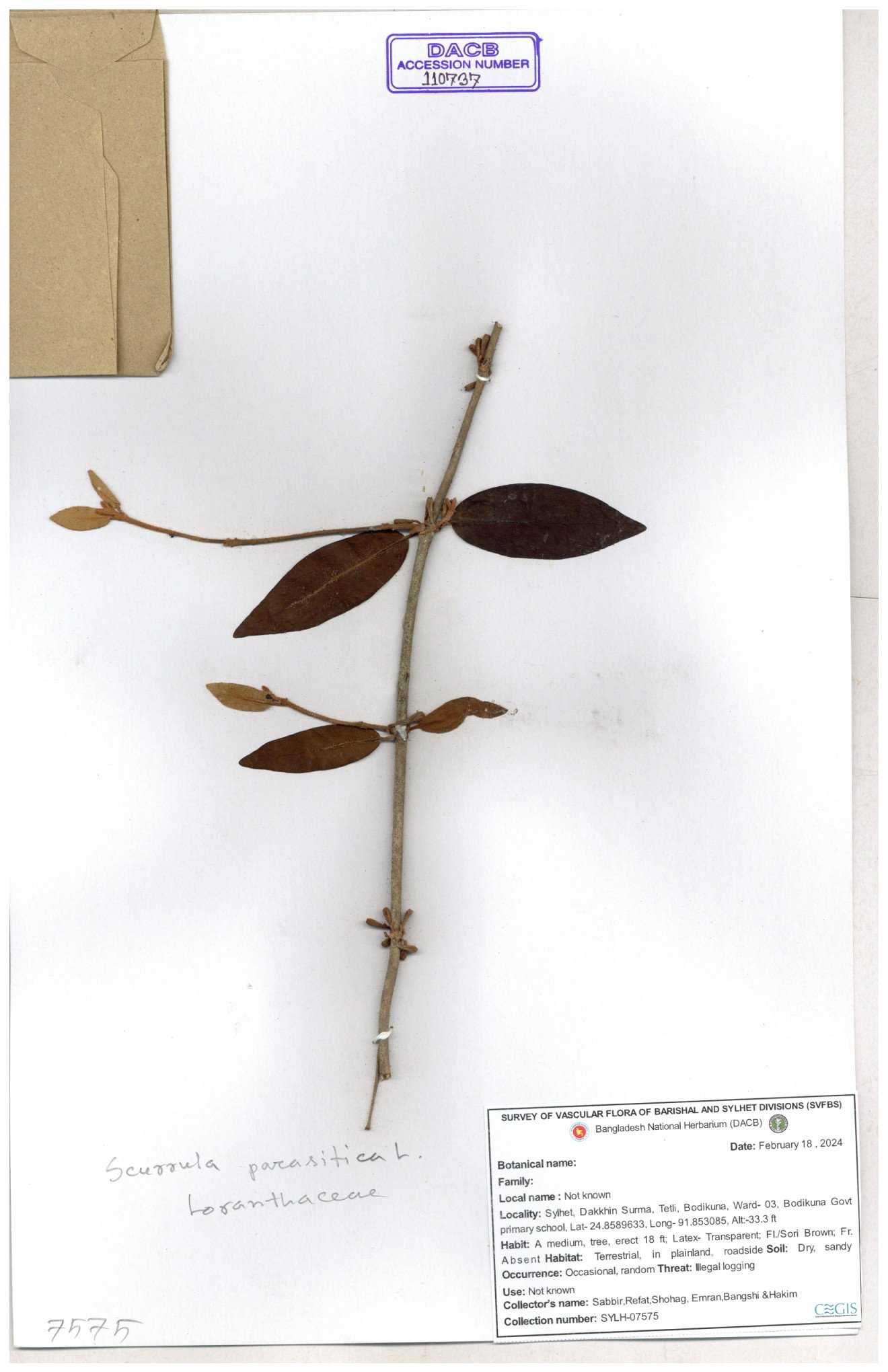 | 72729 | Loranthaceae | Scurrula perverulenta | Pargash | I Hossen, MS Islam, MKR Rahman & MR Miah | IH-1714 30-11--0001 |