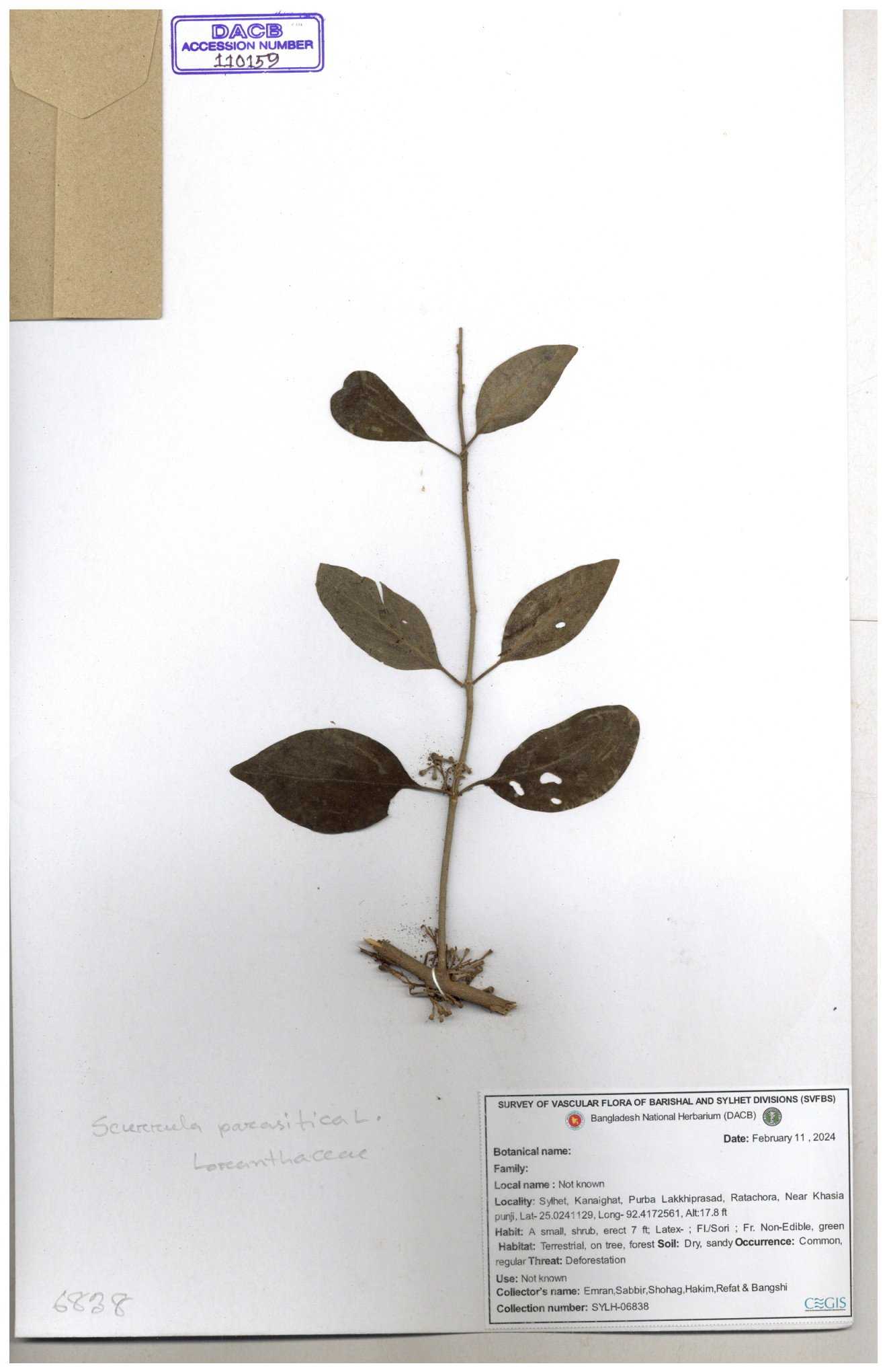 | 6376 | Loranthaceae | Scurrula pulvenulentai G. Don. | Huq & Rahman | H-4612 05-08-1980 |