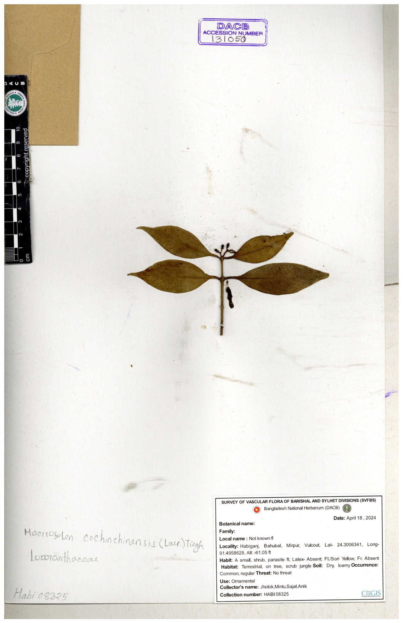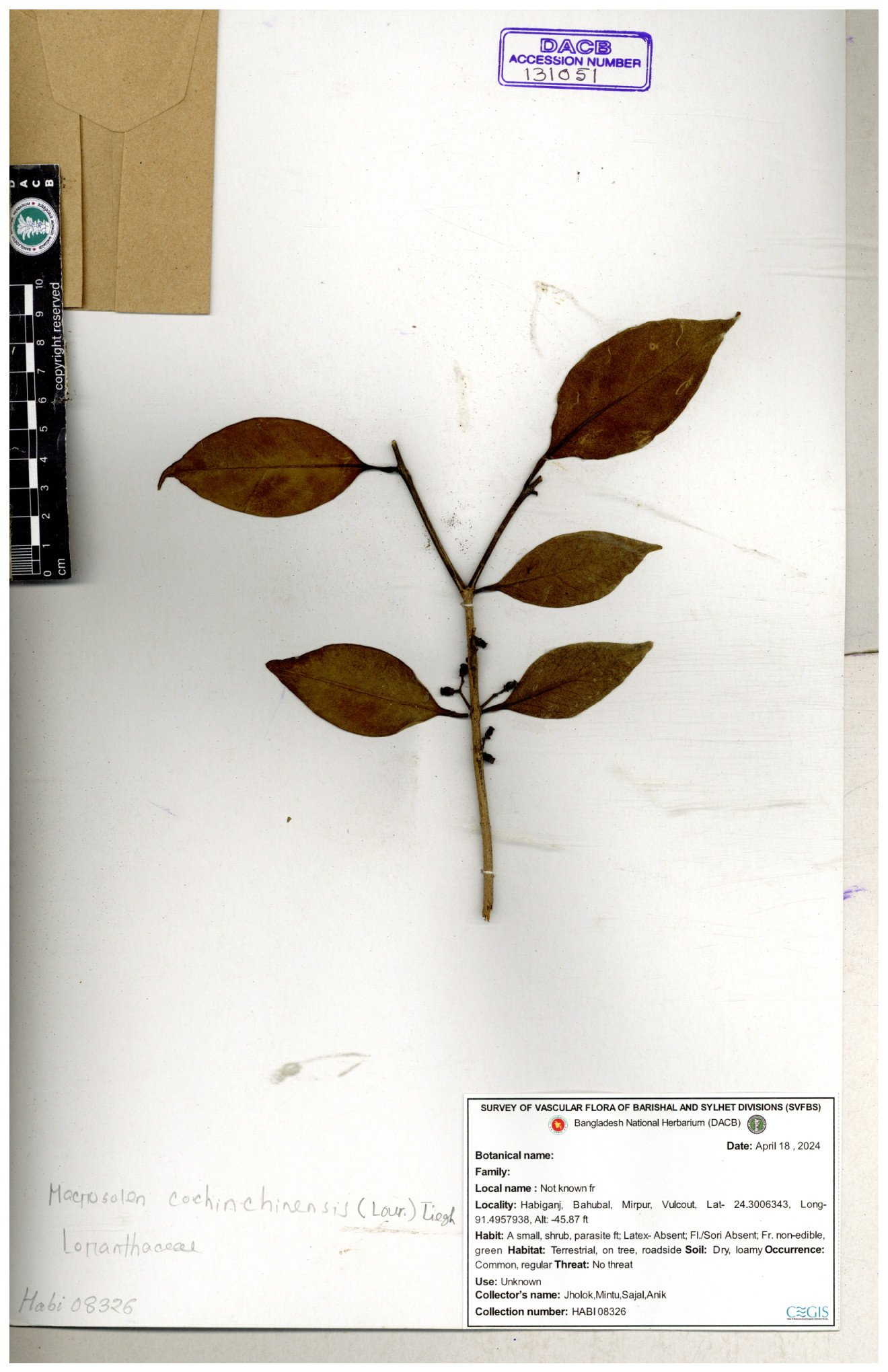 | 6326 | Loranthaceae | Macrosolen cochichinensis | Huq & Mia | H-7231 30-11--0001 |