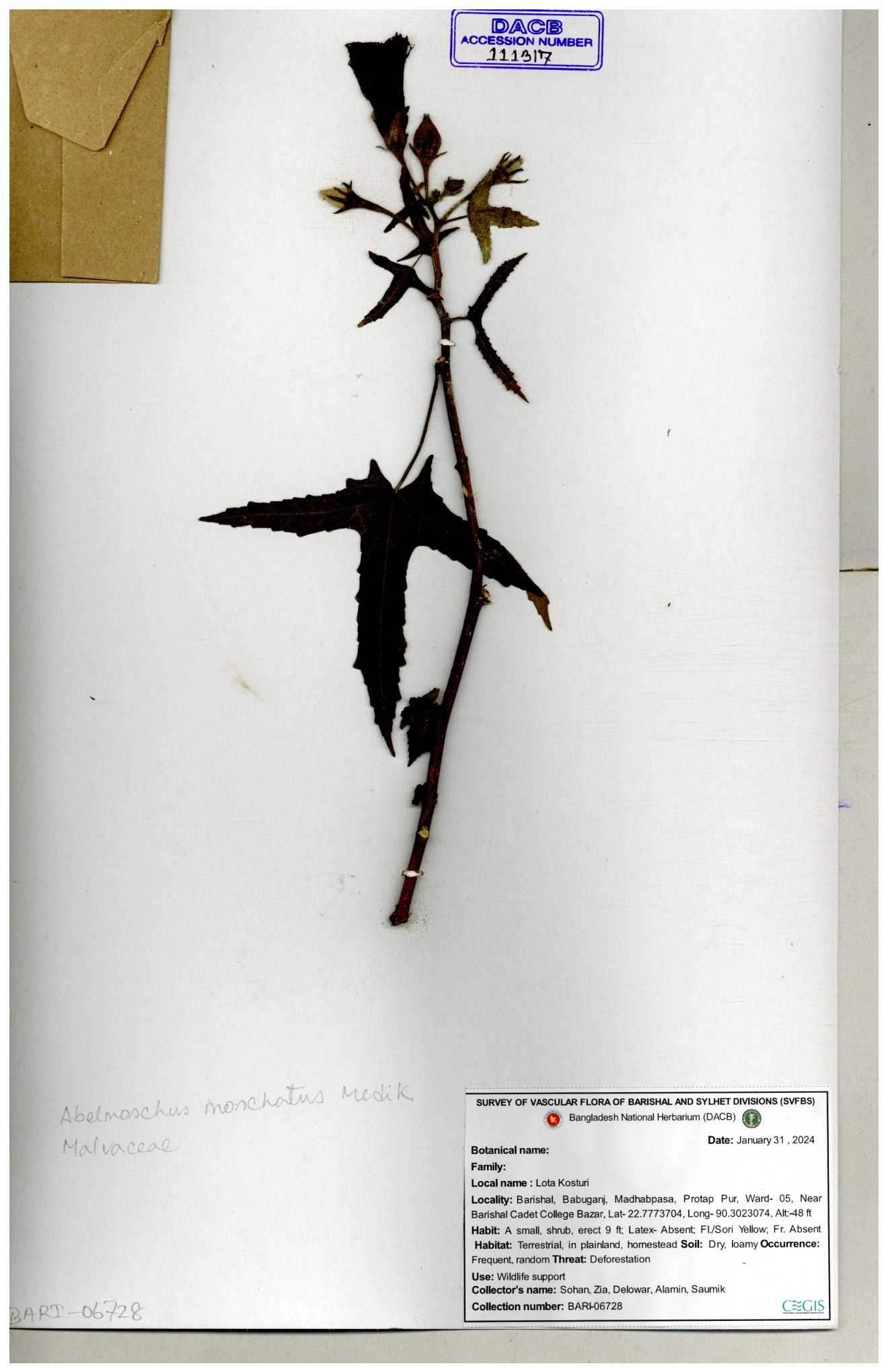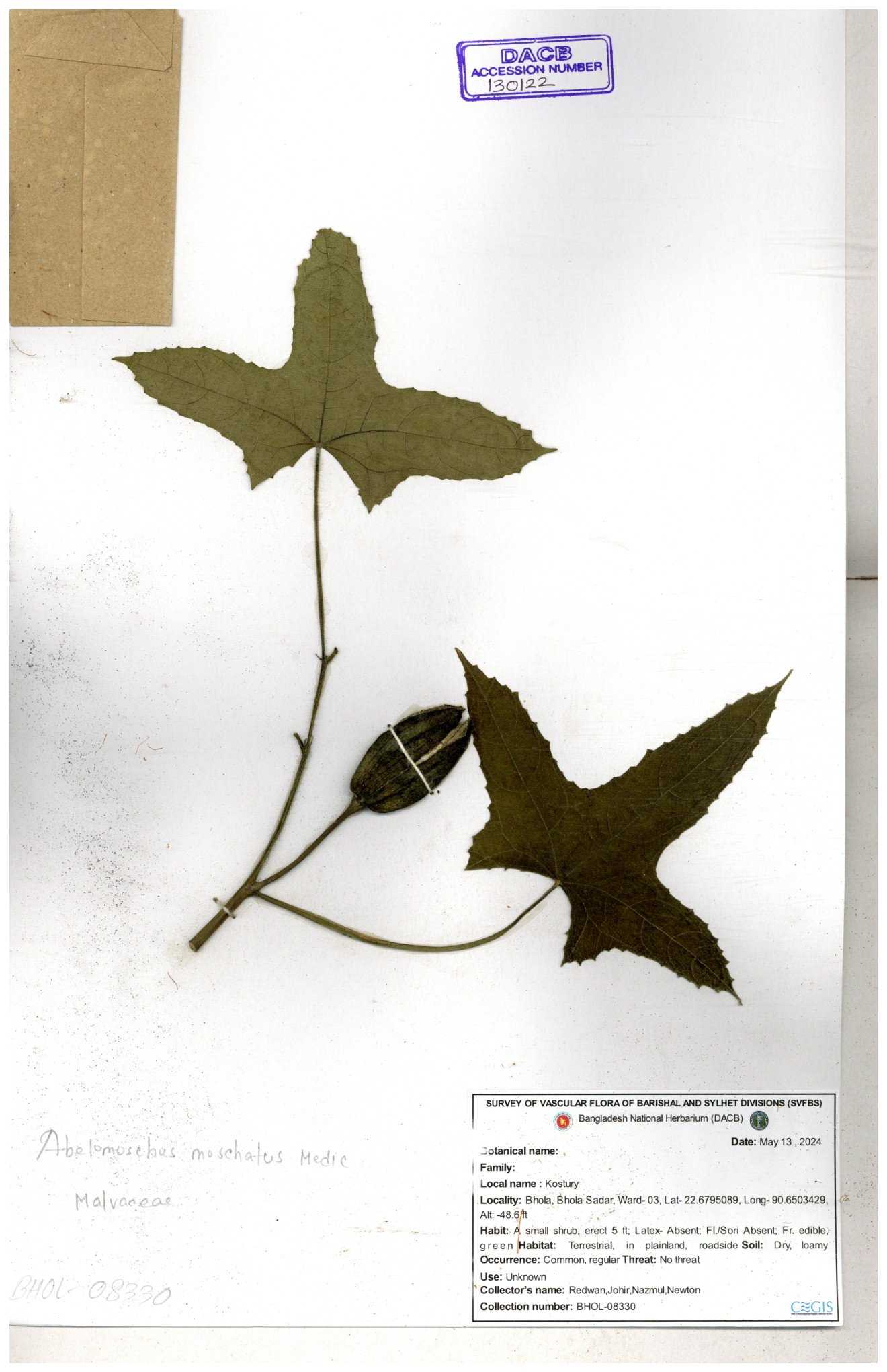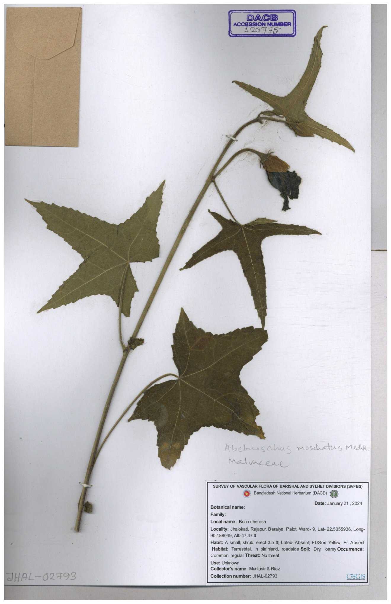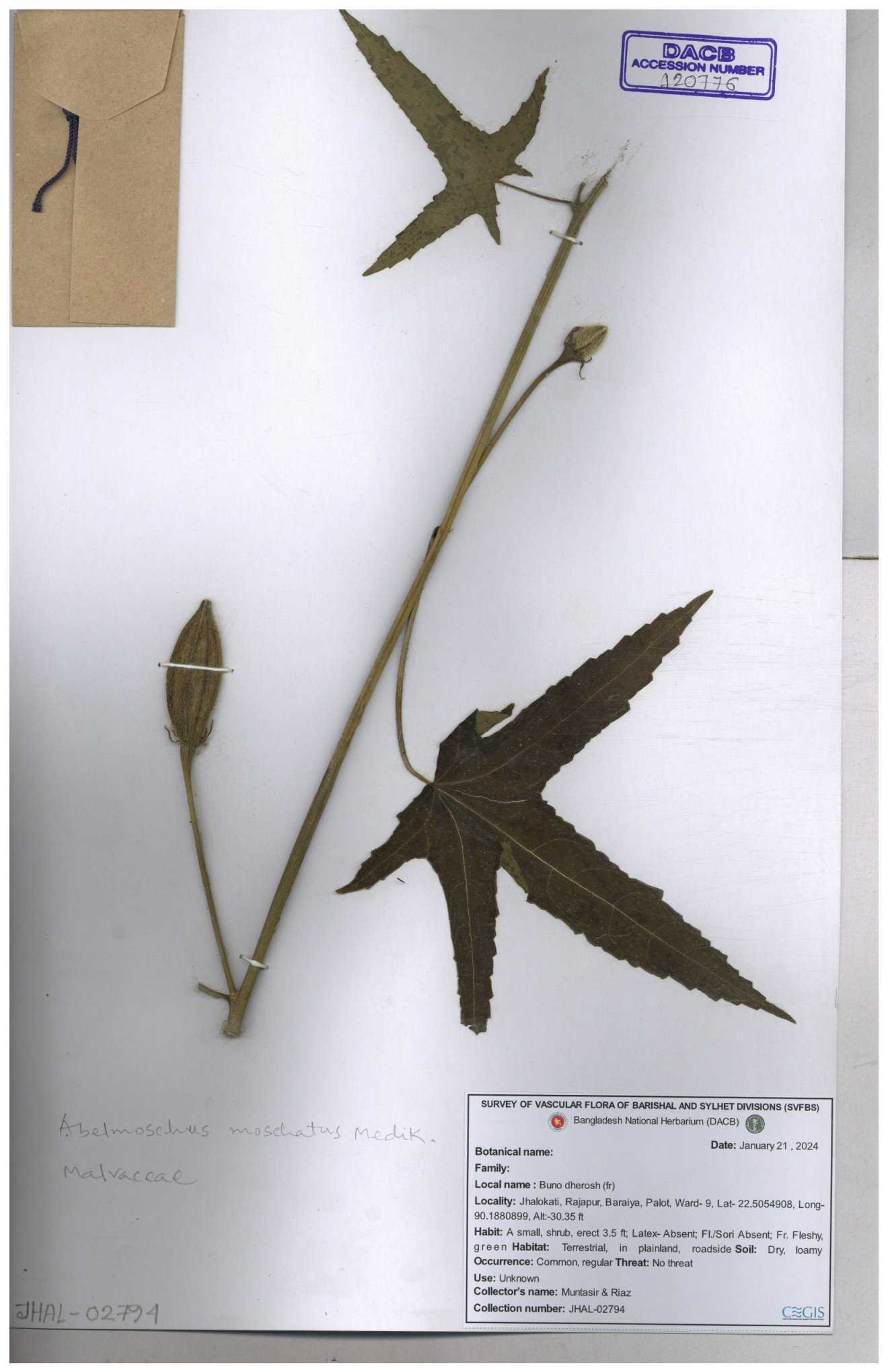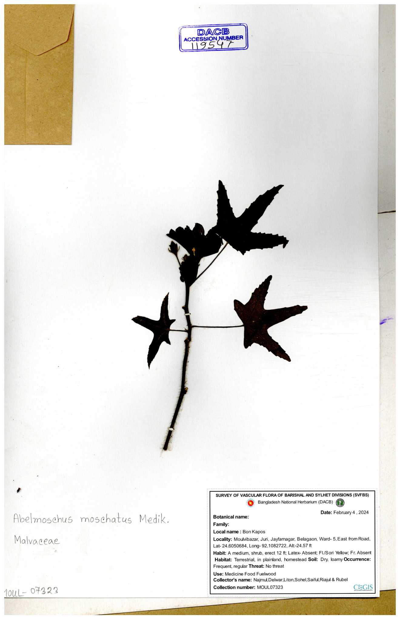 | 55195 | Malvaceae | Abelmoschus moschatus Medik. | Ban-Dherosh | Md. Moniruzzaman & Kawsar | MK- 7896 08-03-2018 |