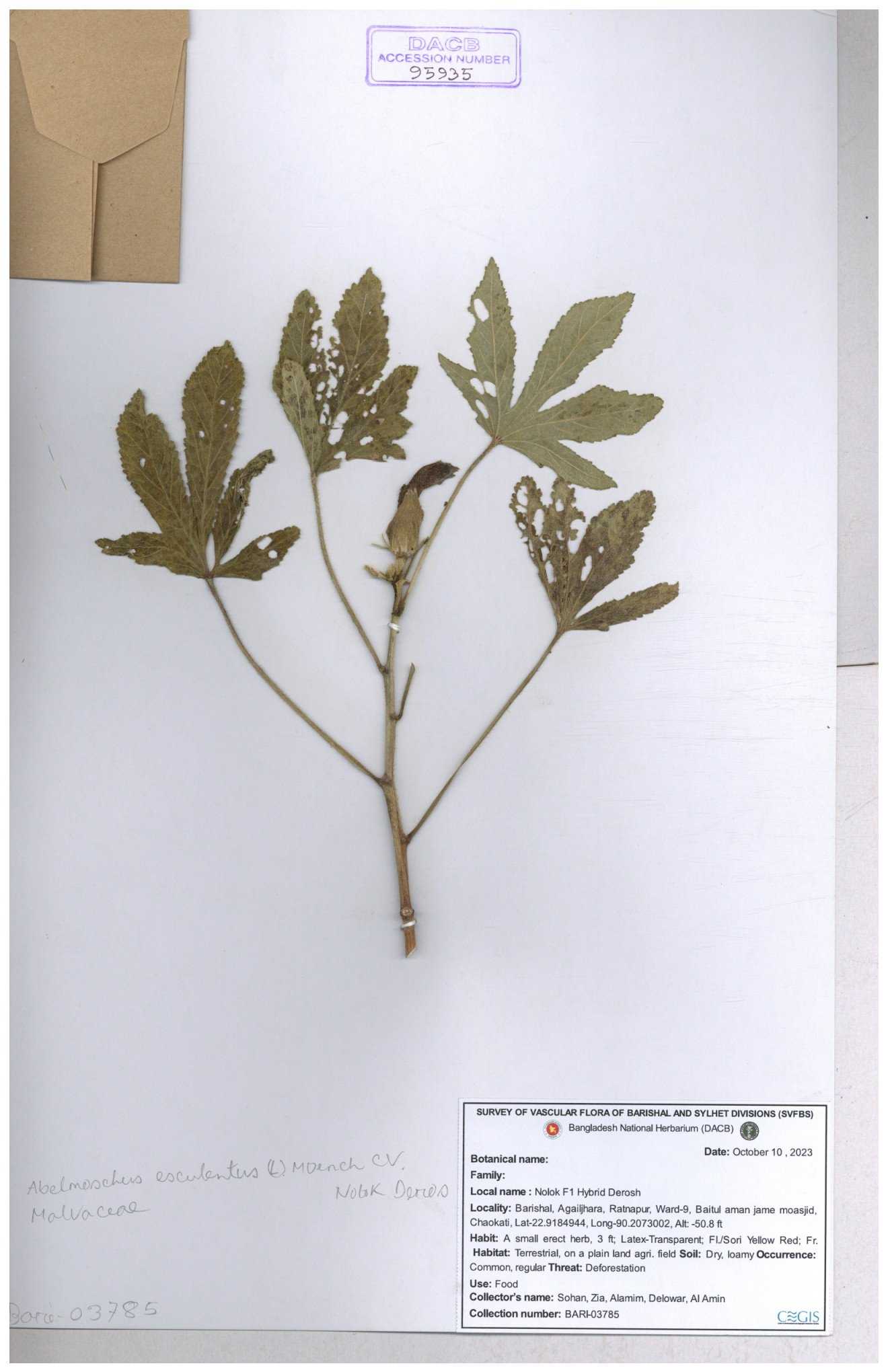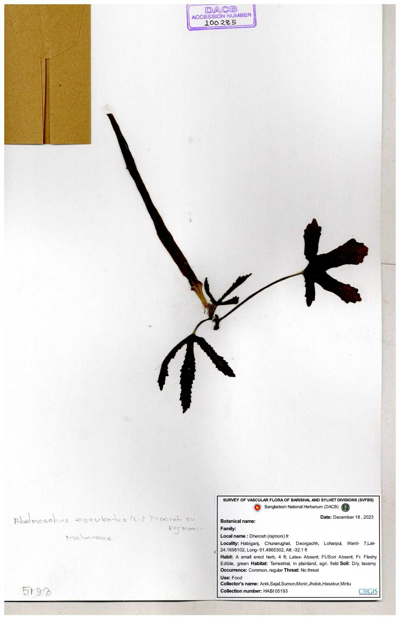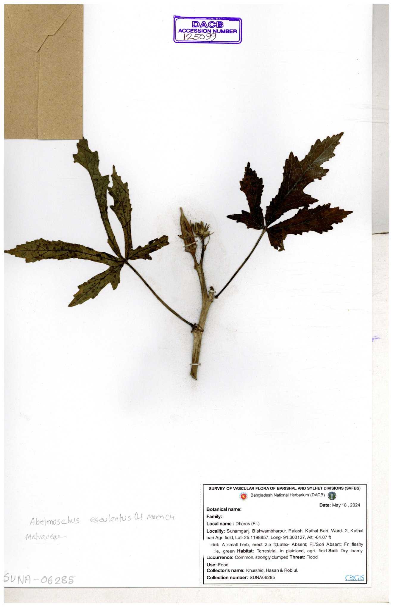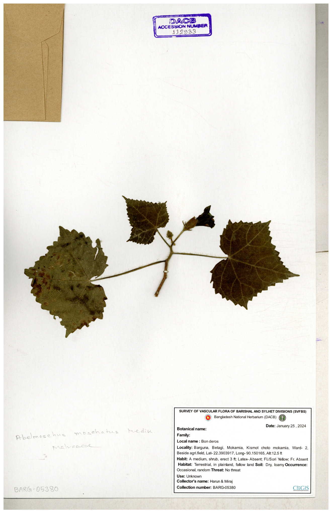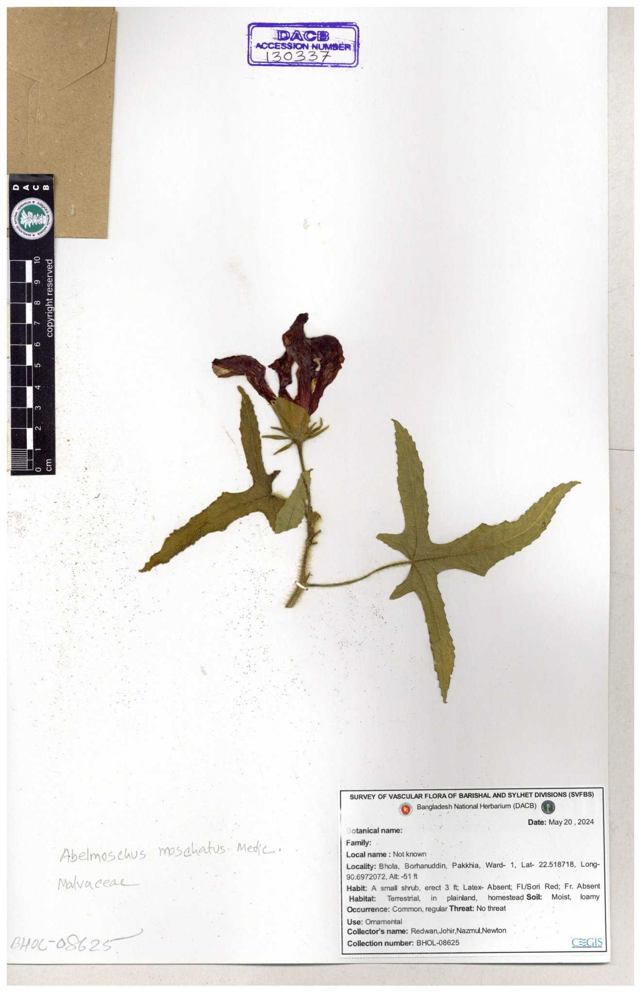 | 55195 | Malvaceae | Abelmoschus moschatus Medik. | Ban-Dherosh | Md. Moniruzzaman & Kawsar | MK- 7896 08-03-2018 |