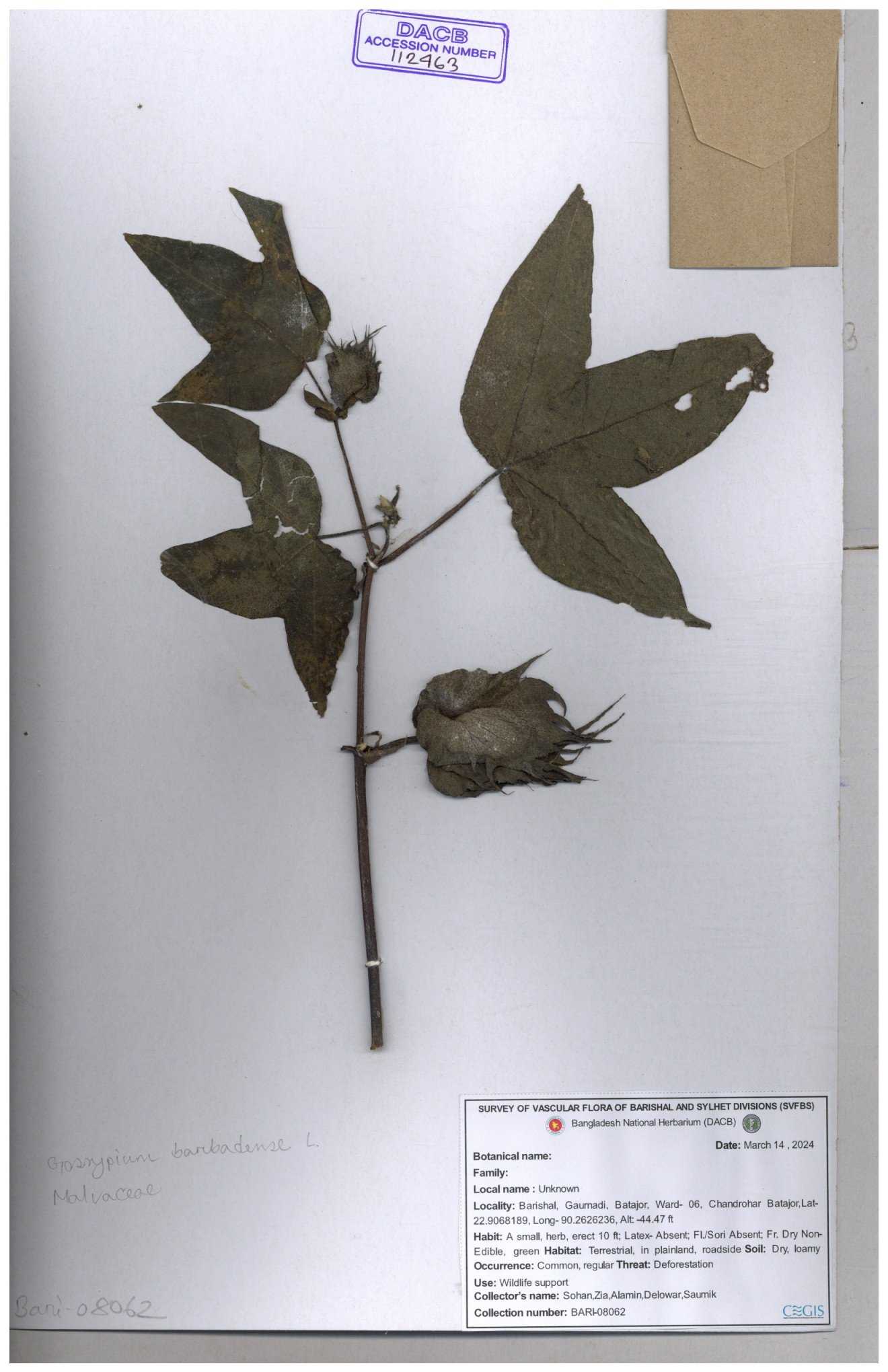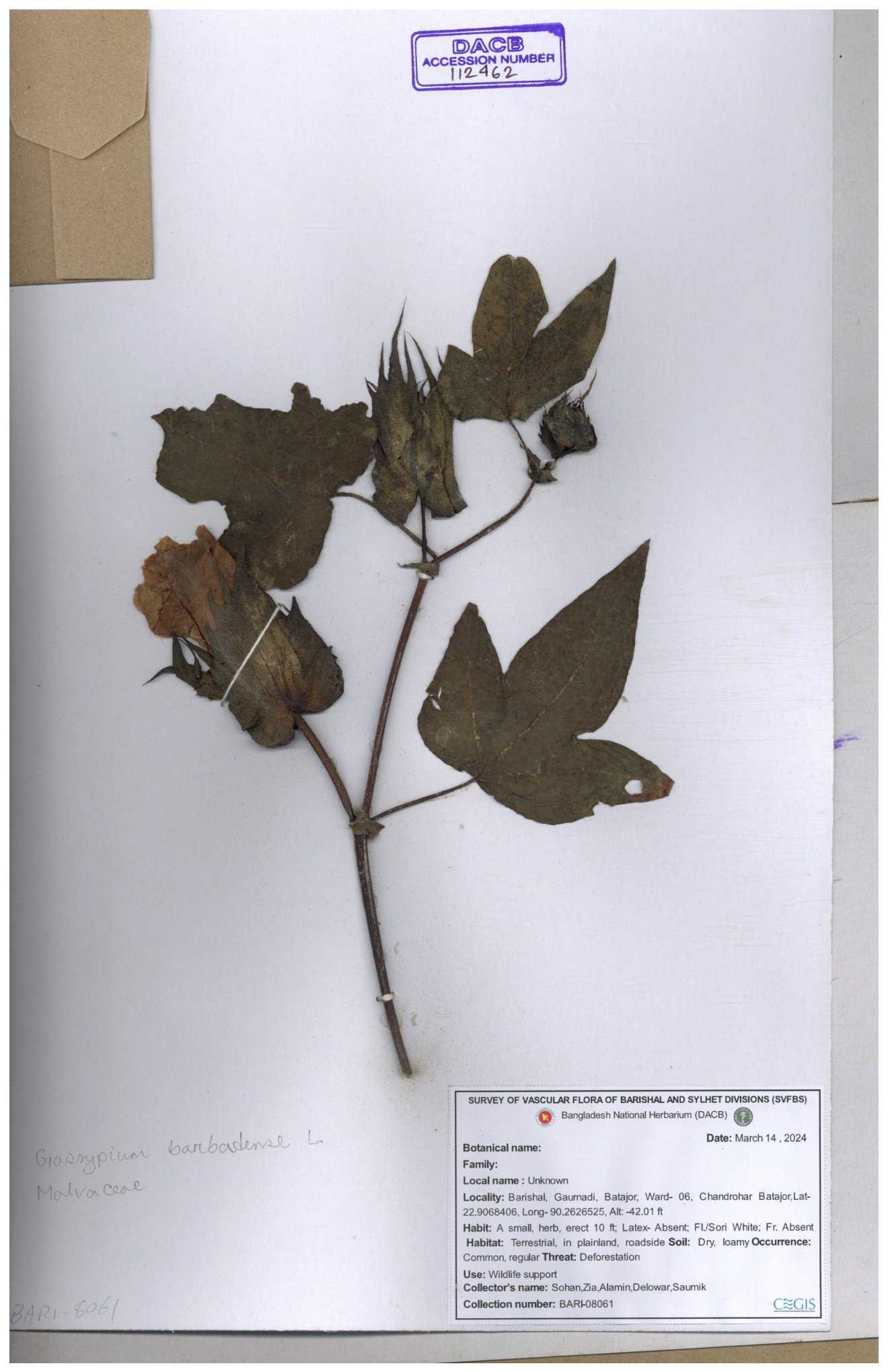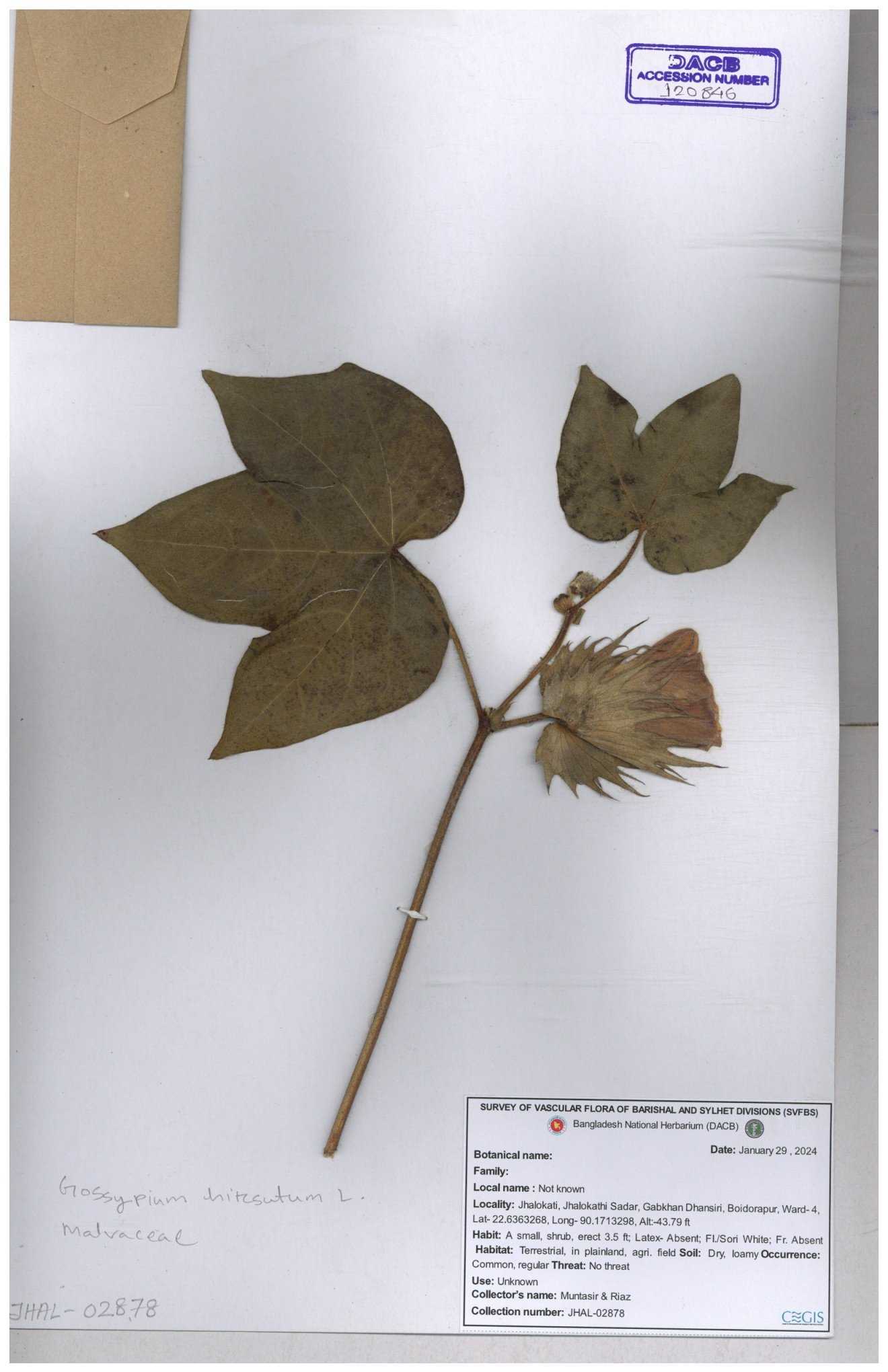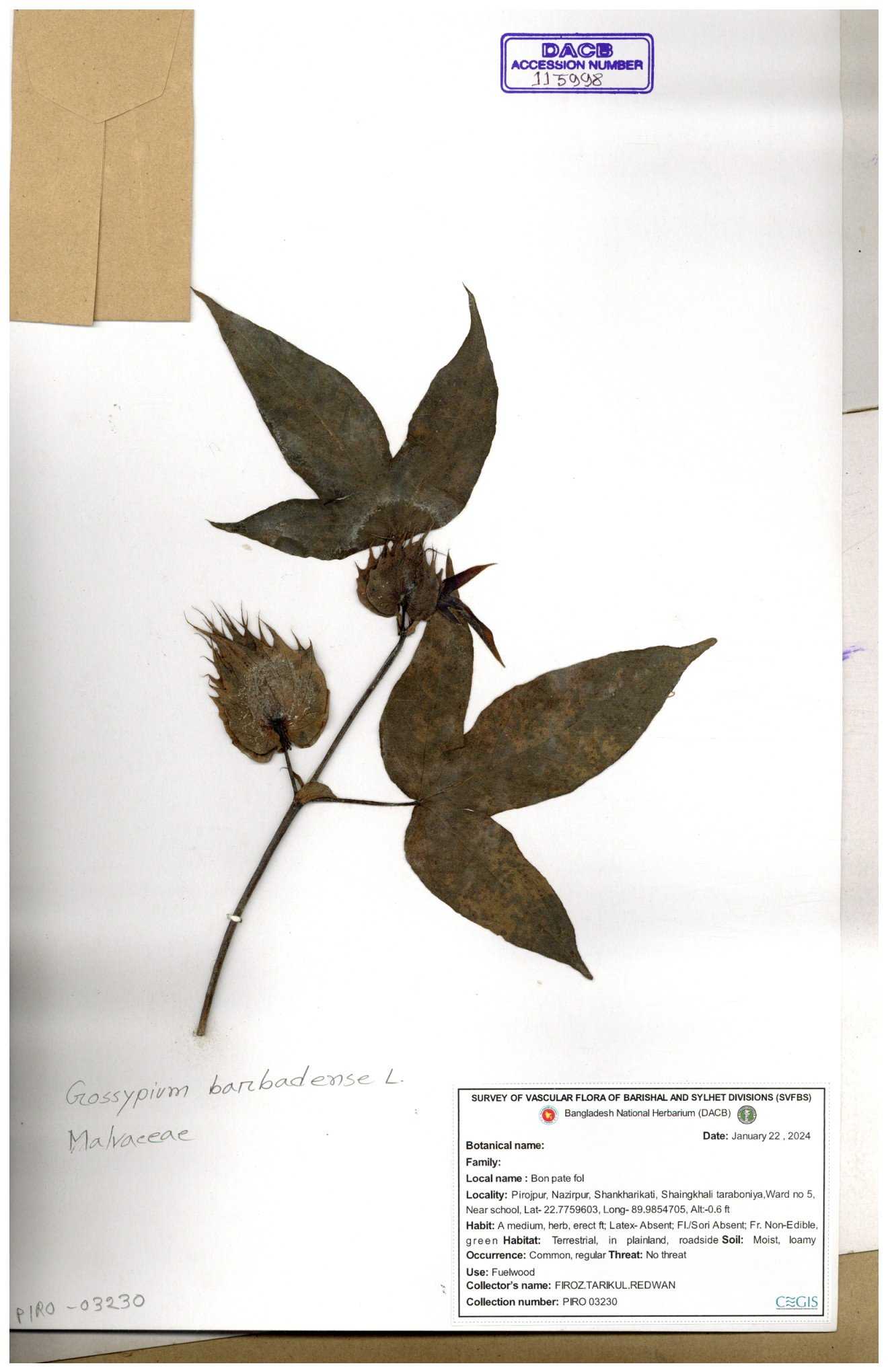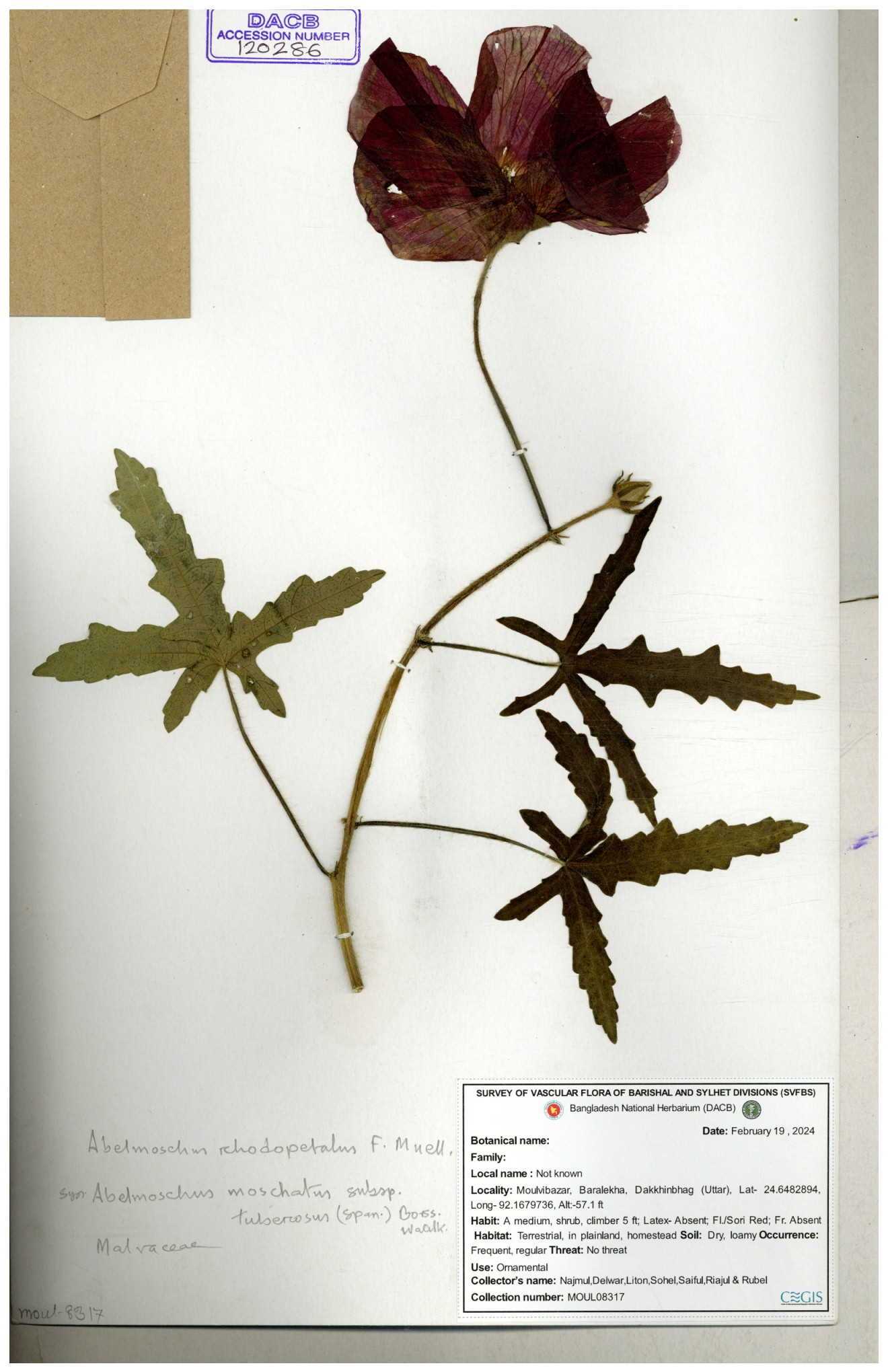 | 55195 | Malvaceae | Abelmoschus moschatus Medik. | Ban-Dherosh | Md. Moniruzzaman & Kawsar | MK- 7896 08-03-2018 |