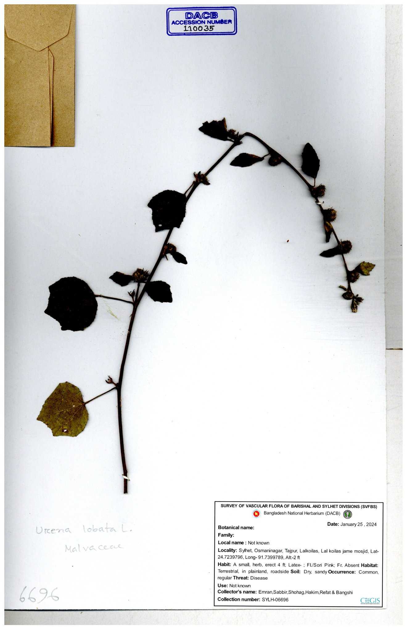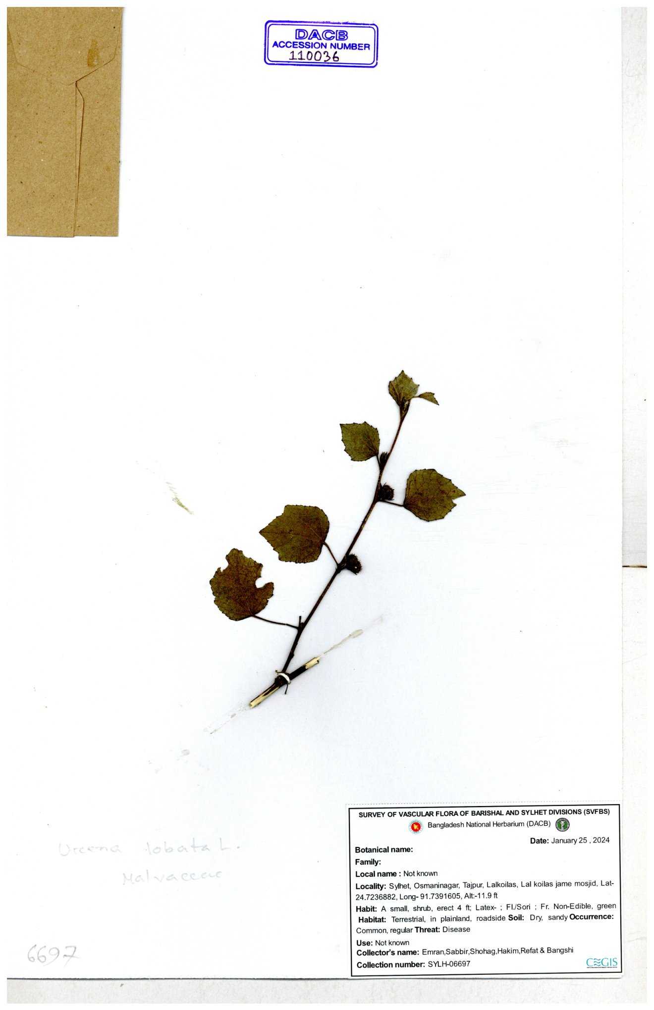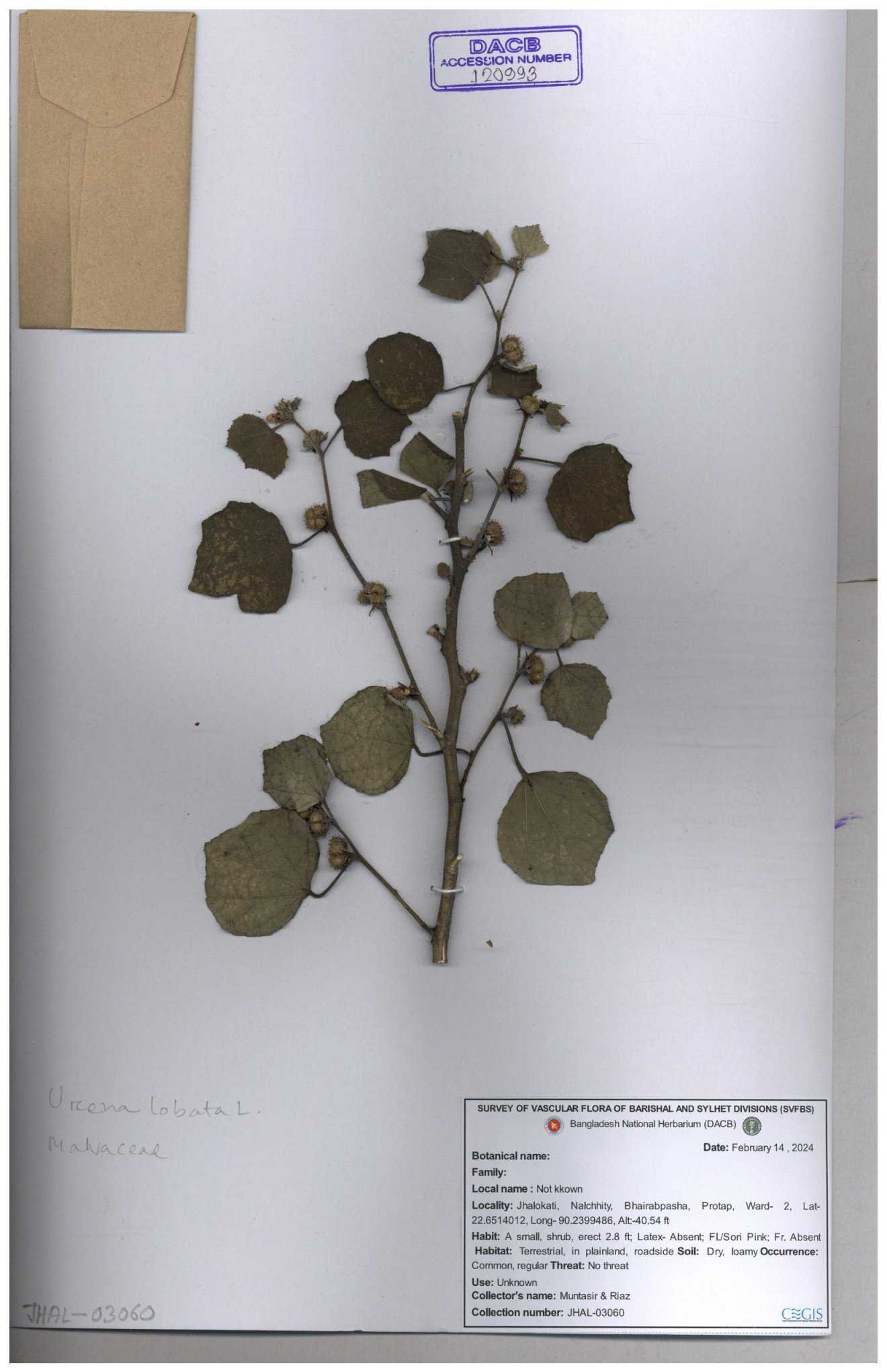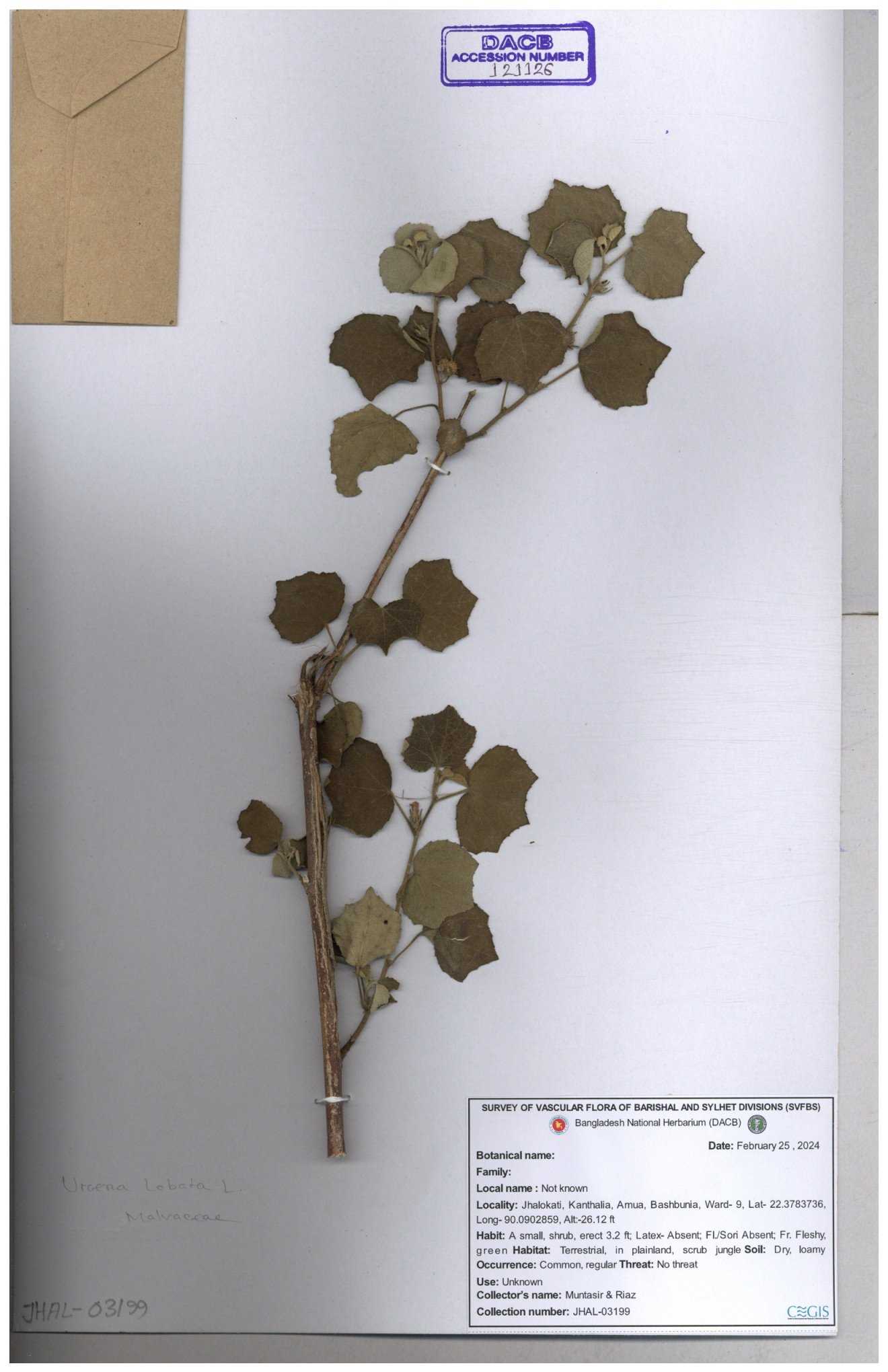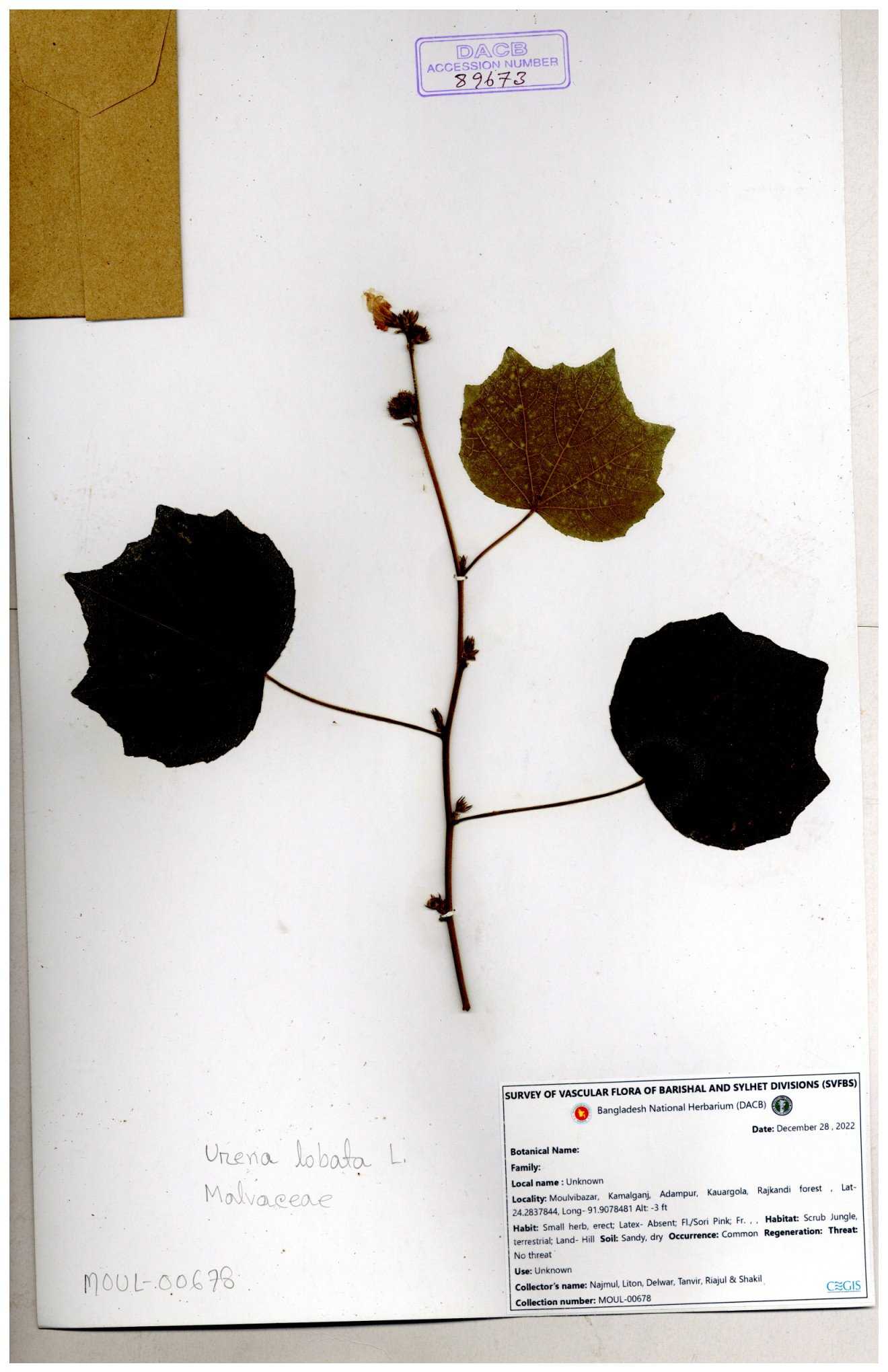| 65293 | Malvaceae | Urena lobata | Mominur Rahman, Al amin & Kamrul Islam | JCR-1693 14-11-2016 |