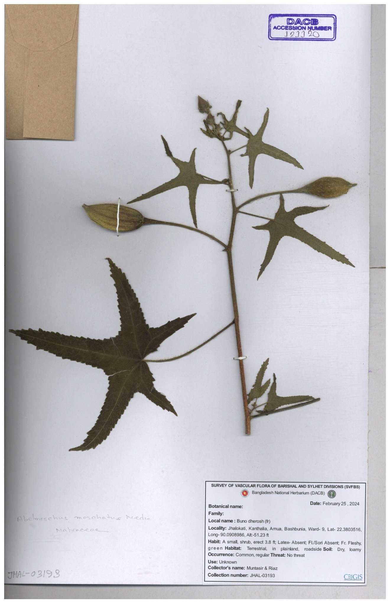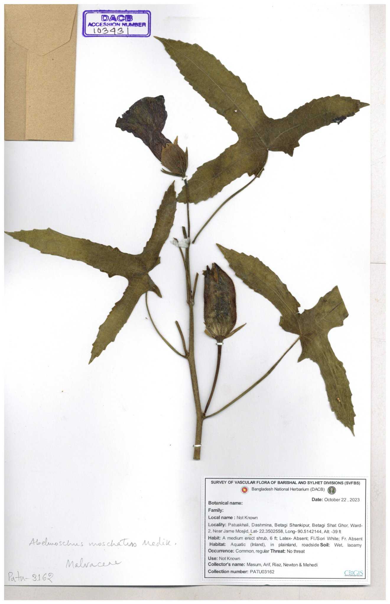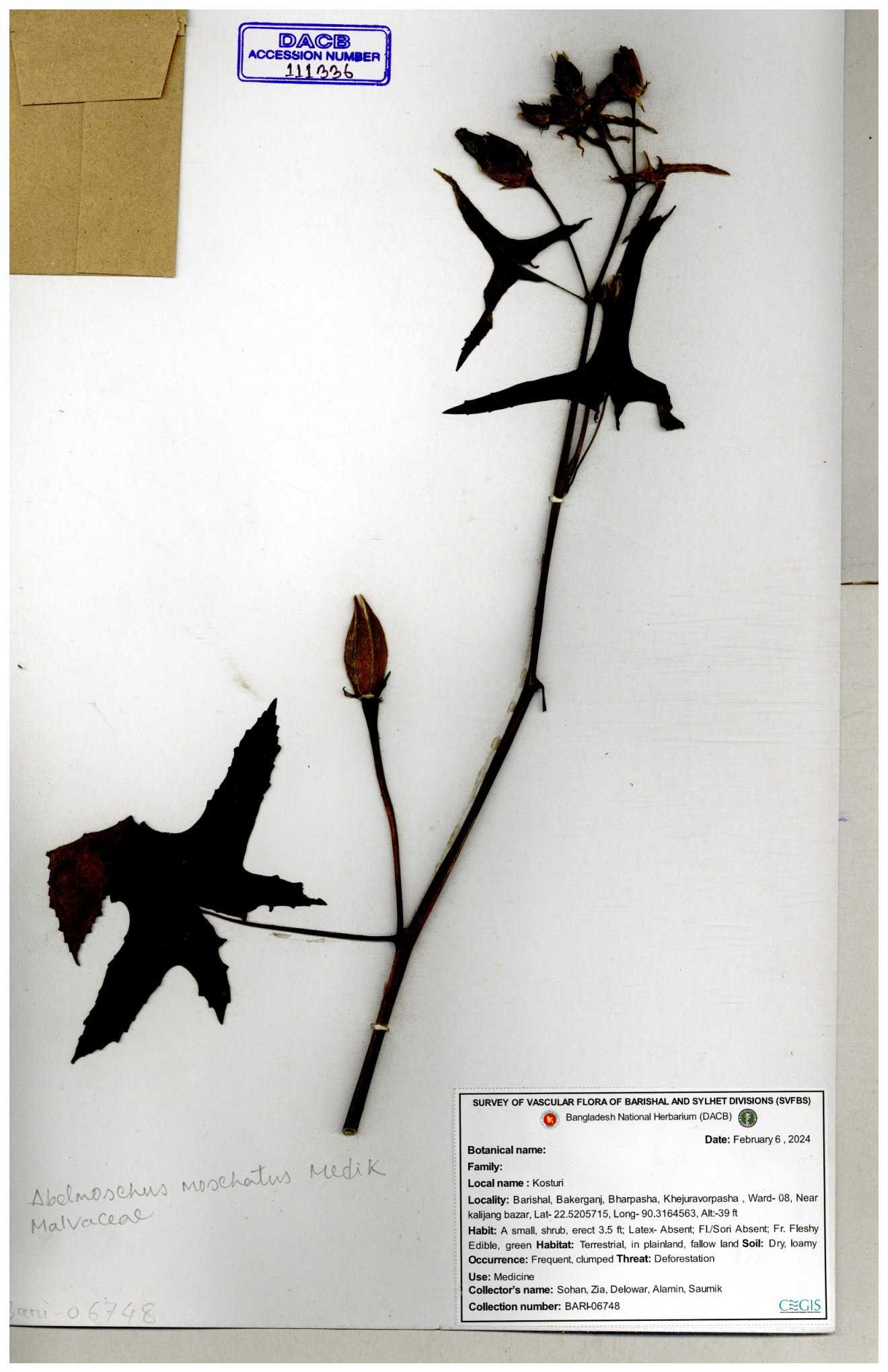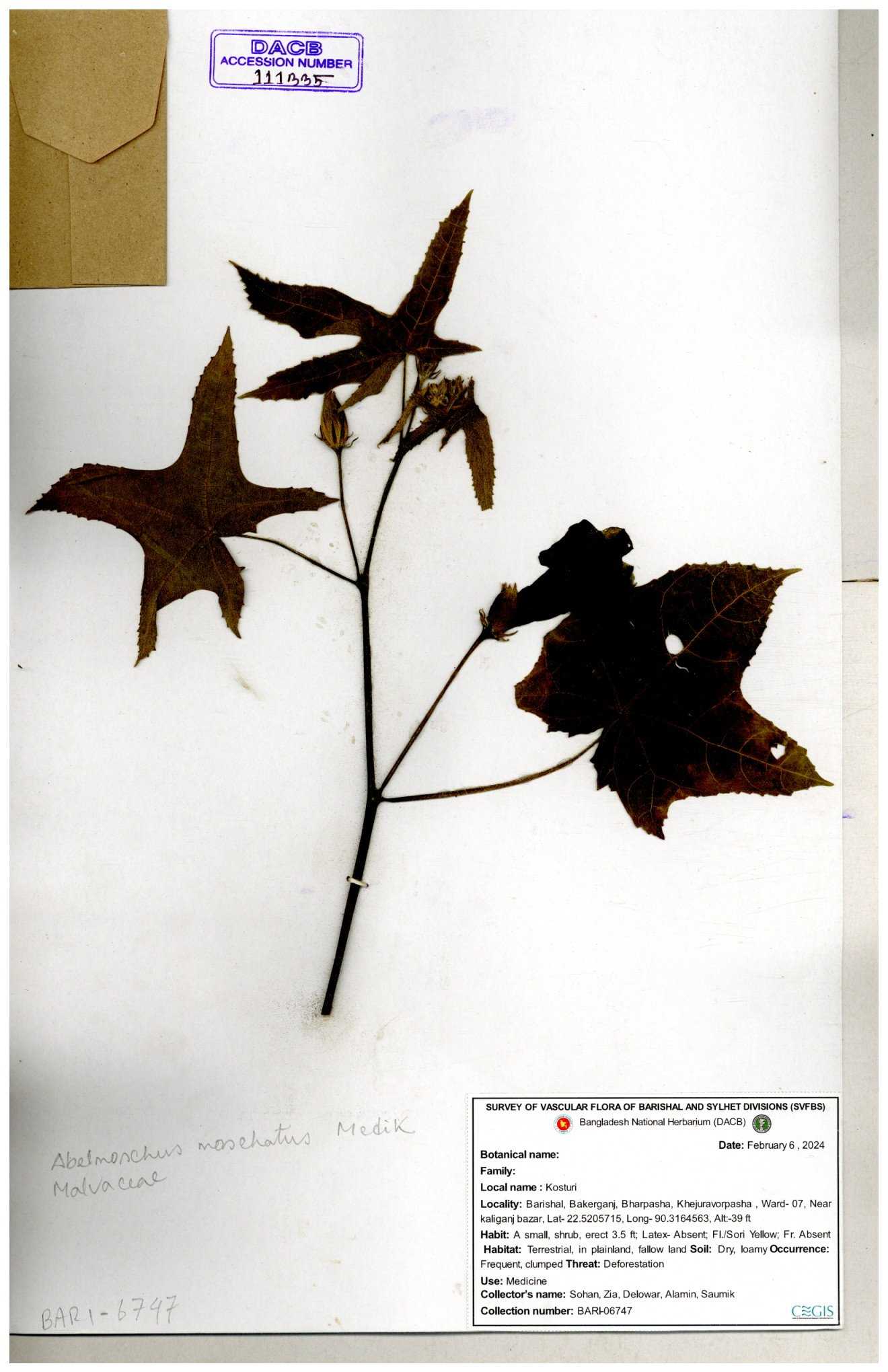 | 54195 | Malvaceae | Abelmoschus moschatus Medik. | Ban-Dheras | Md. Moniruzzaman, Al-Amin & Kawsar | MAK- 6113 23-10-2017 |