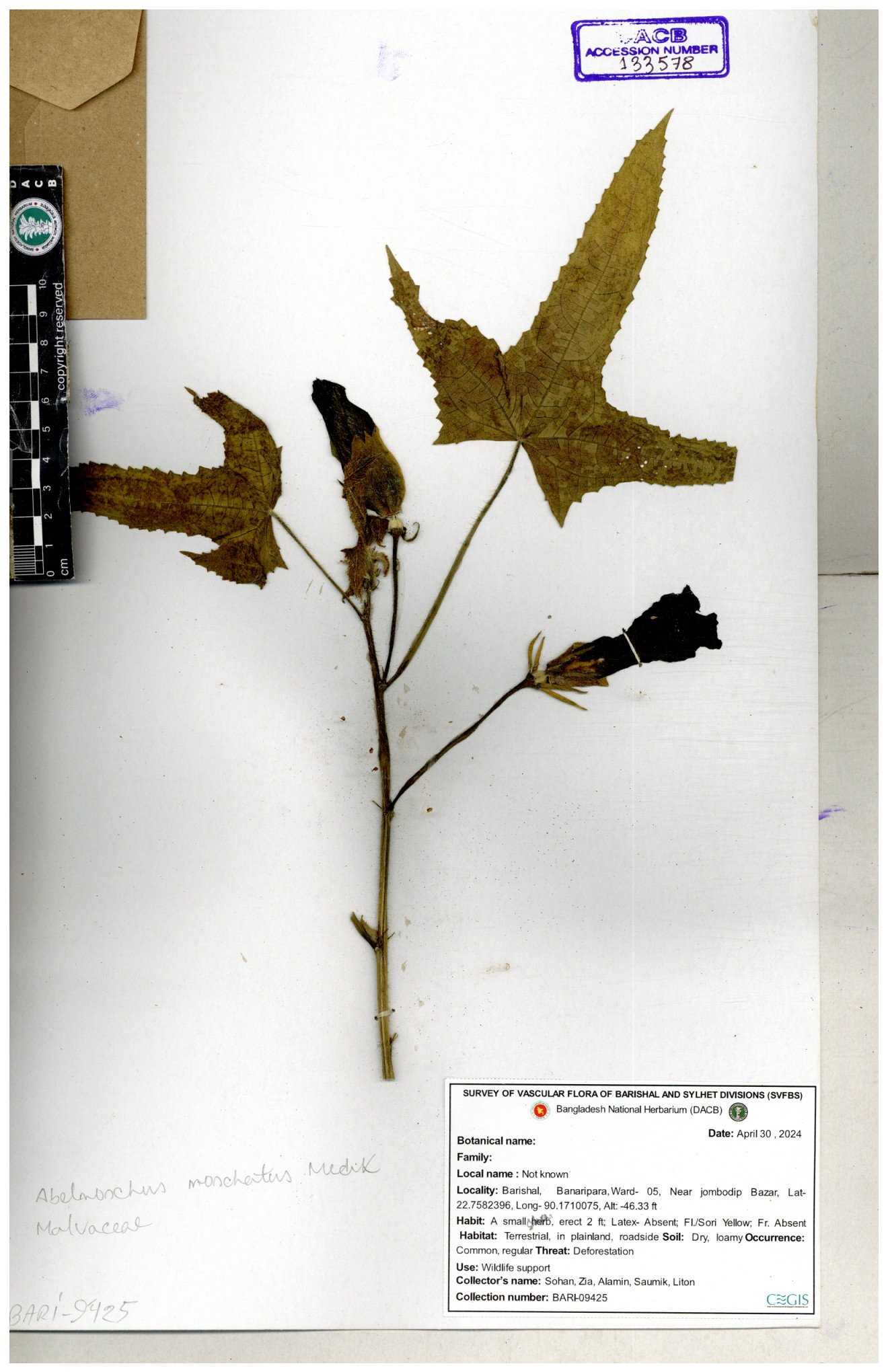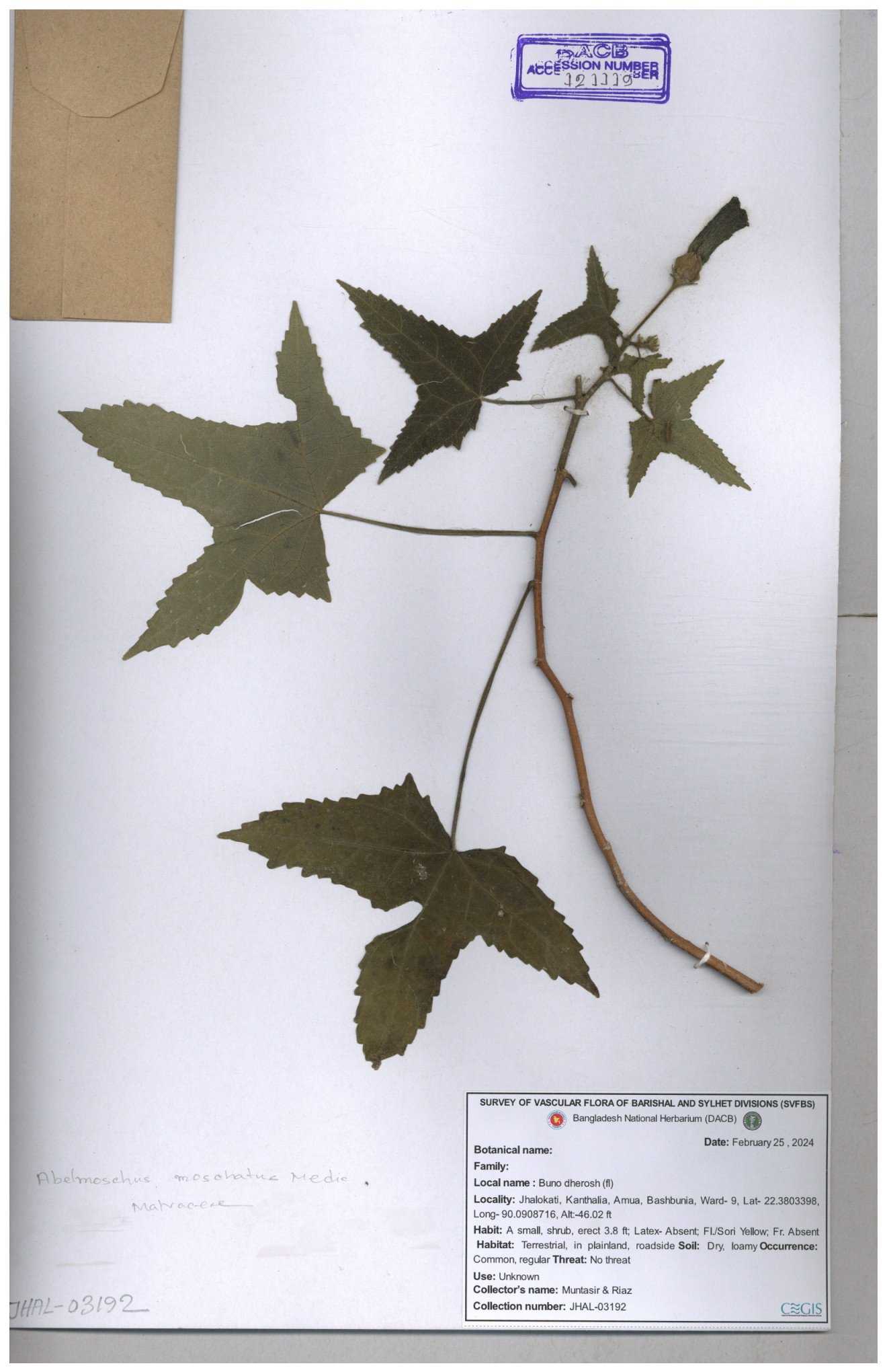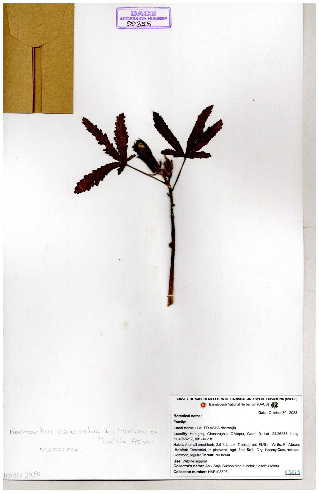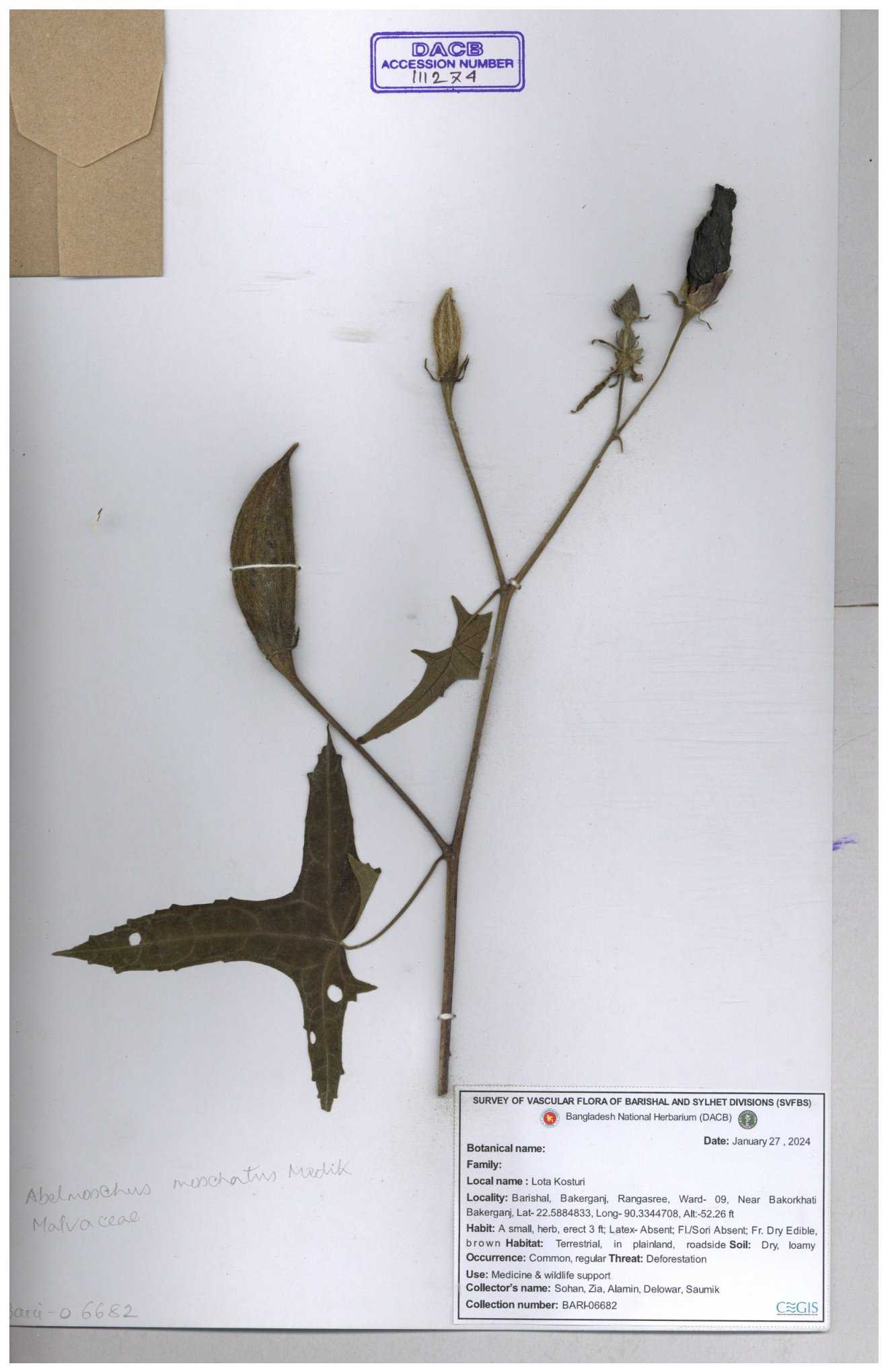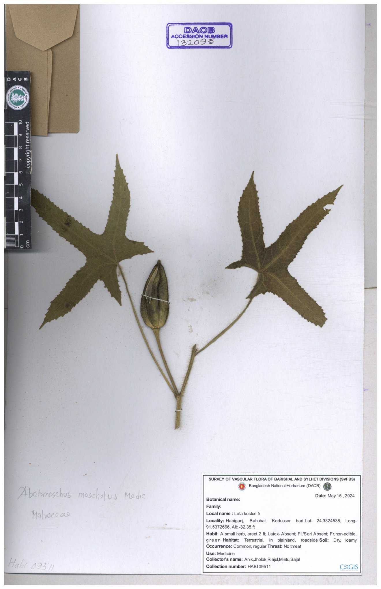 | 54195 | Malvaceae | Abelmoschus moschatus Medik. | Ban-Dheras | Md. Moniruzzaman, Al-Amin & Kawsar | MAK- 6113 23-10-2017 |