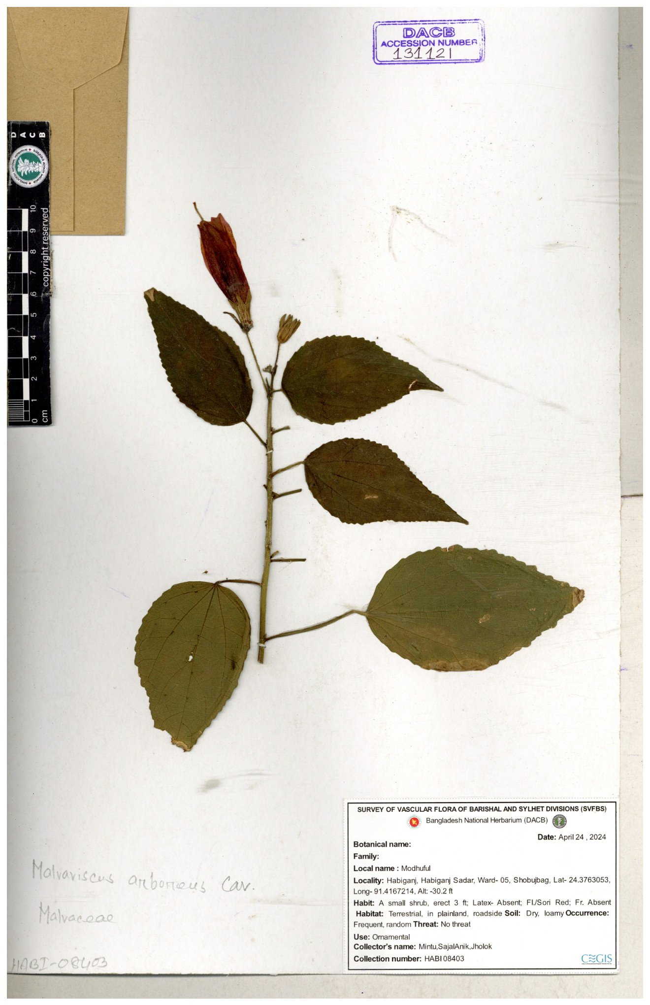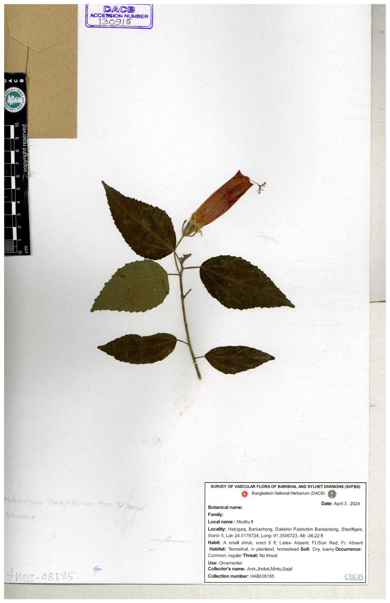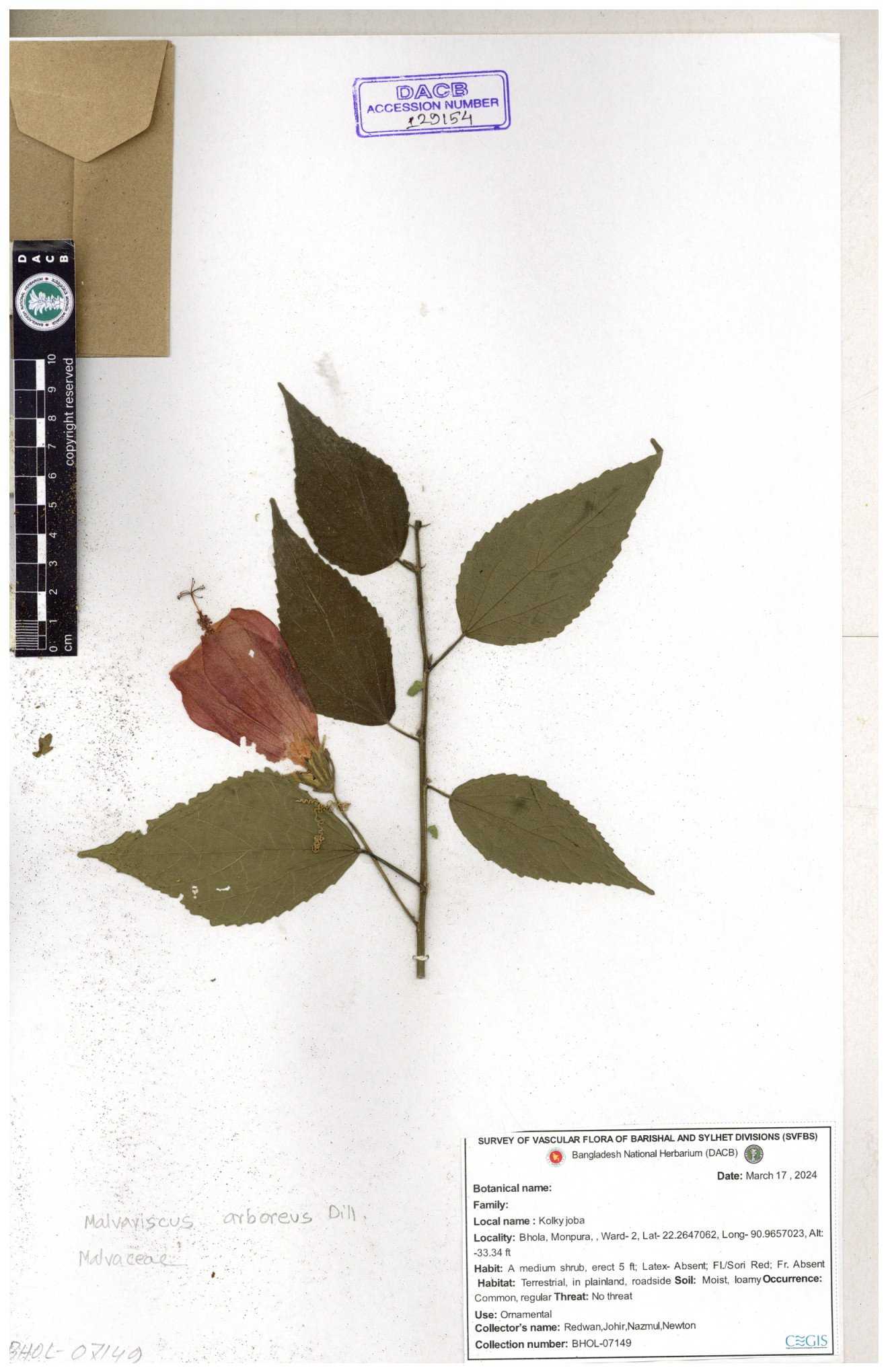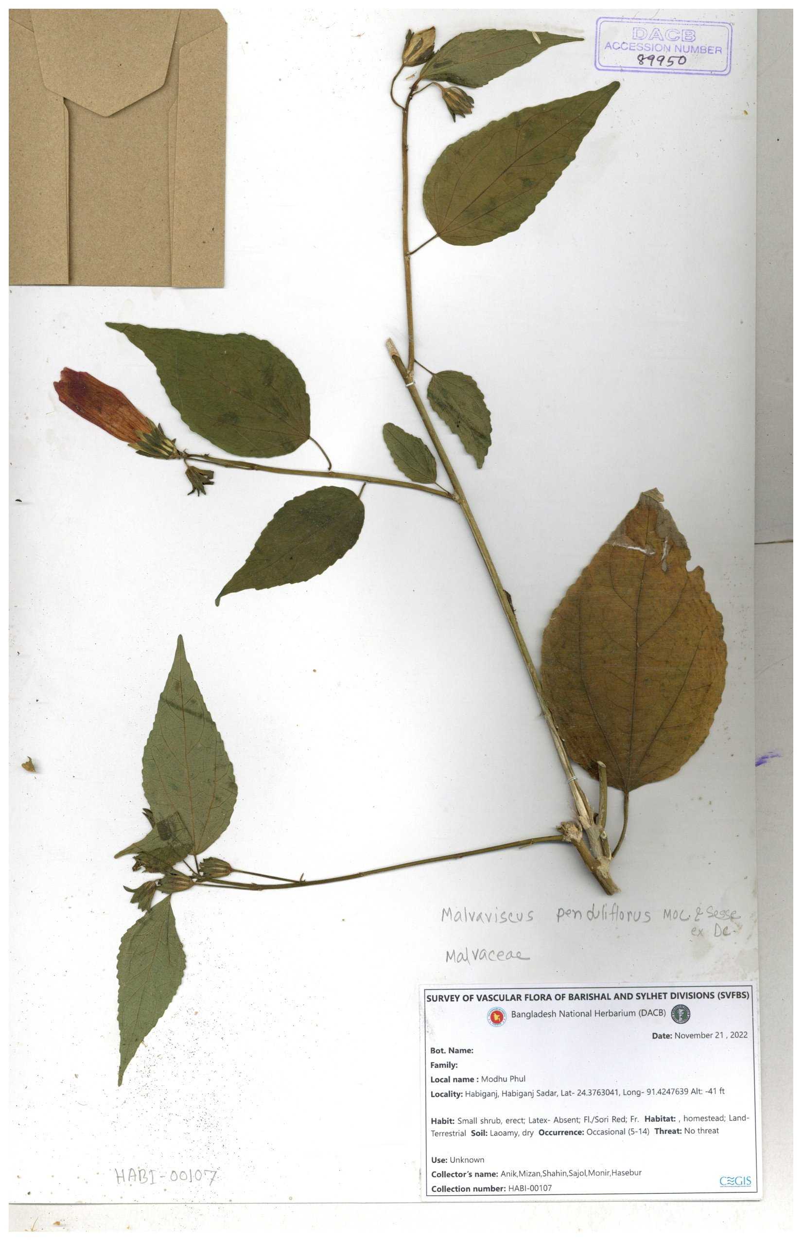 | 54195 | Malvaceae | Abelmoschus moschatus Medik. | Ban-Dheras | Md. Moniruzzaman, Al-Amin & Kawsar | MAK- 6113 23-10-2017 |