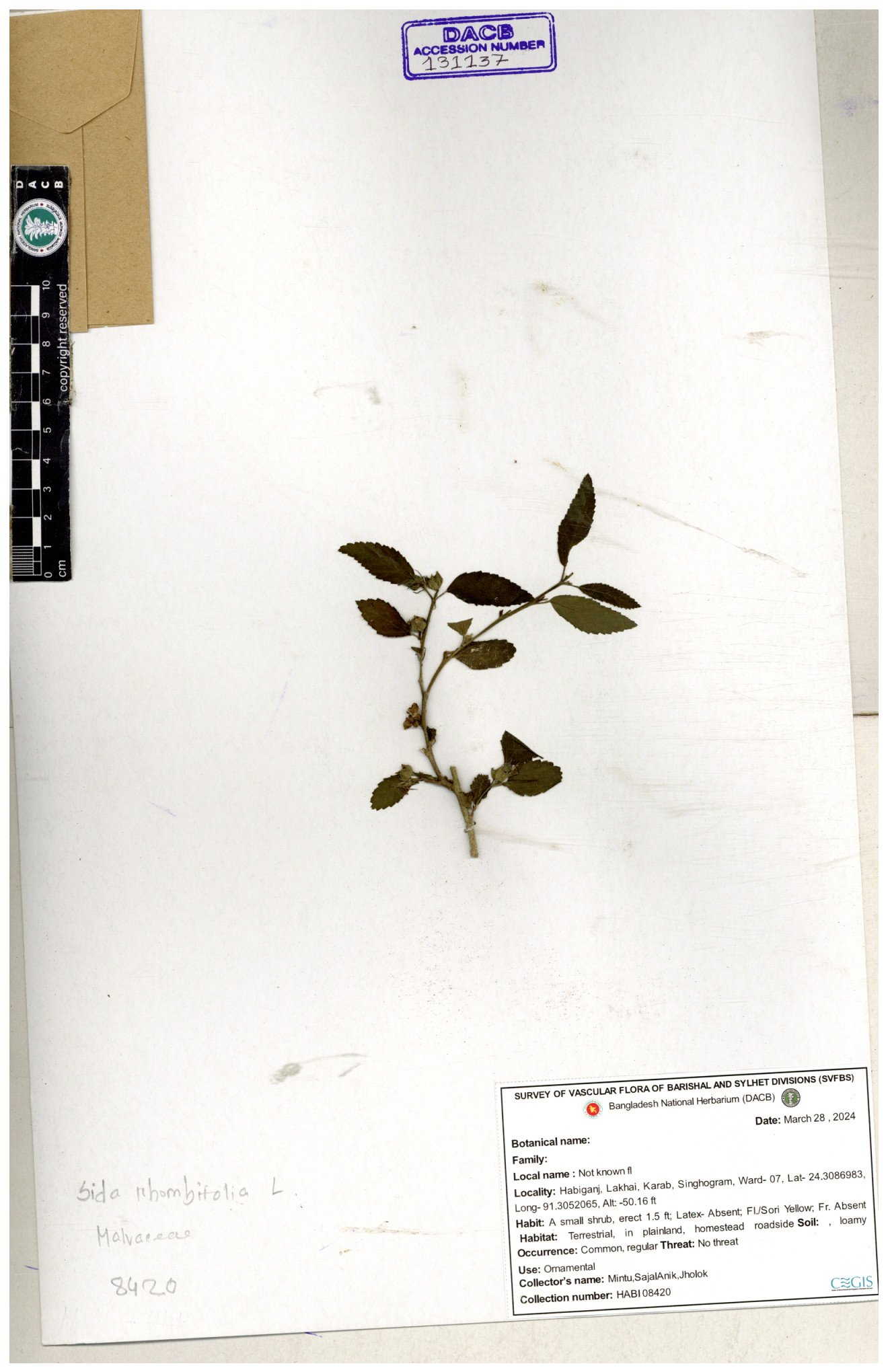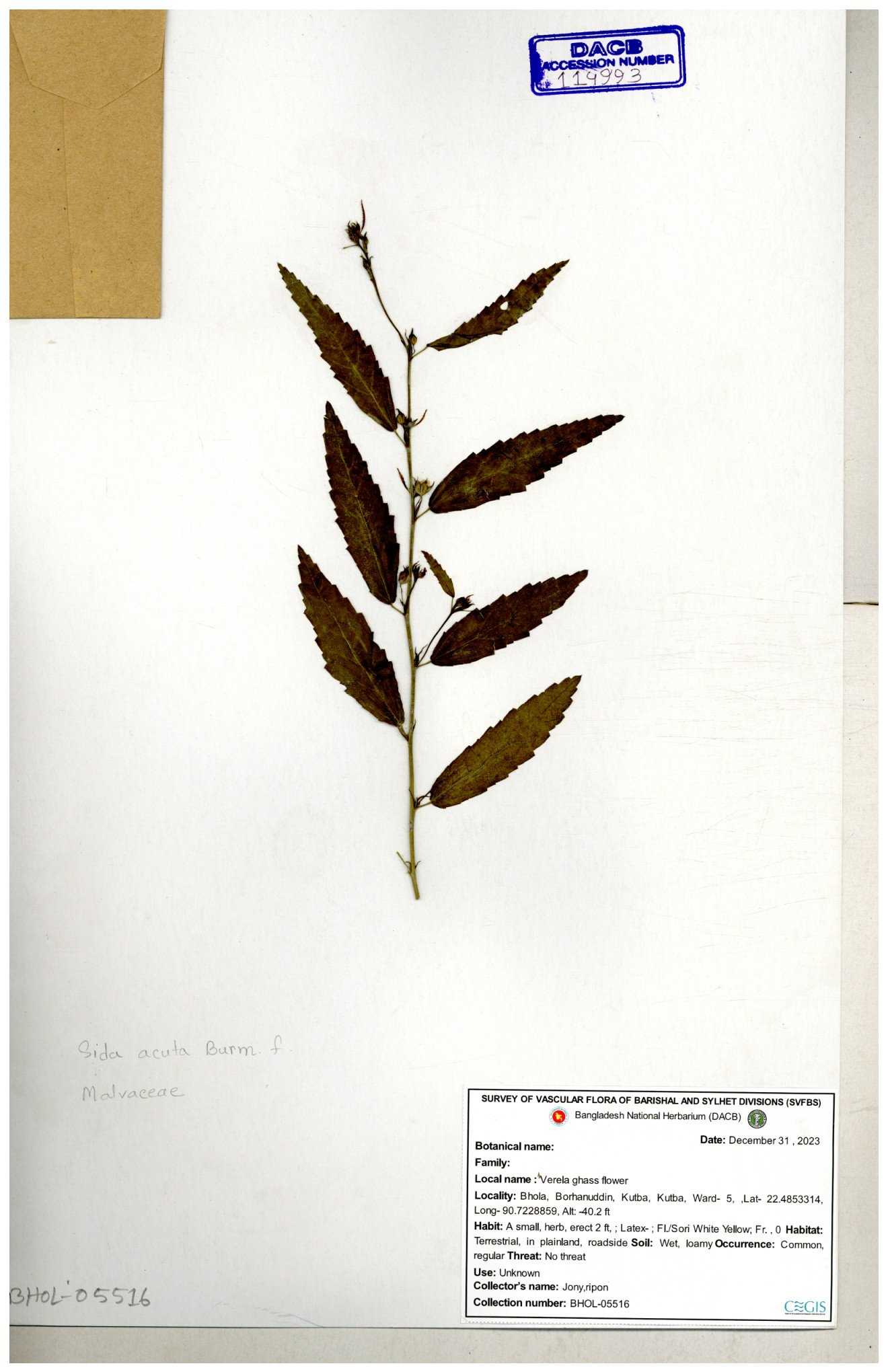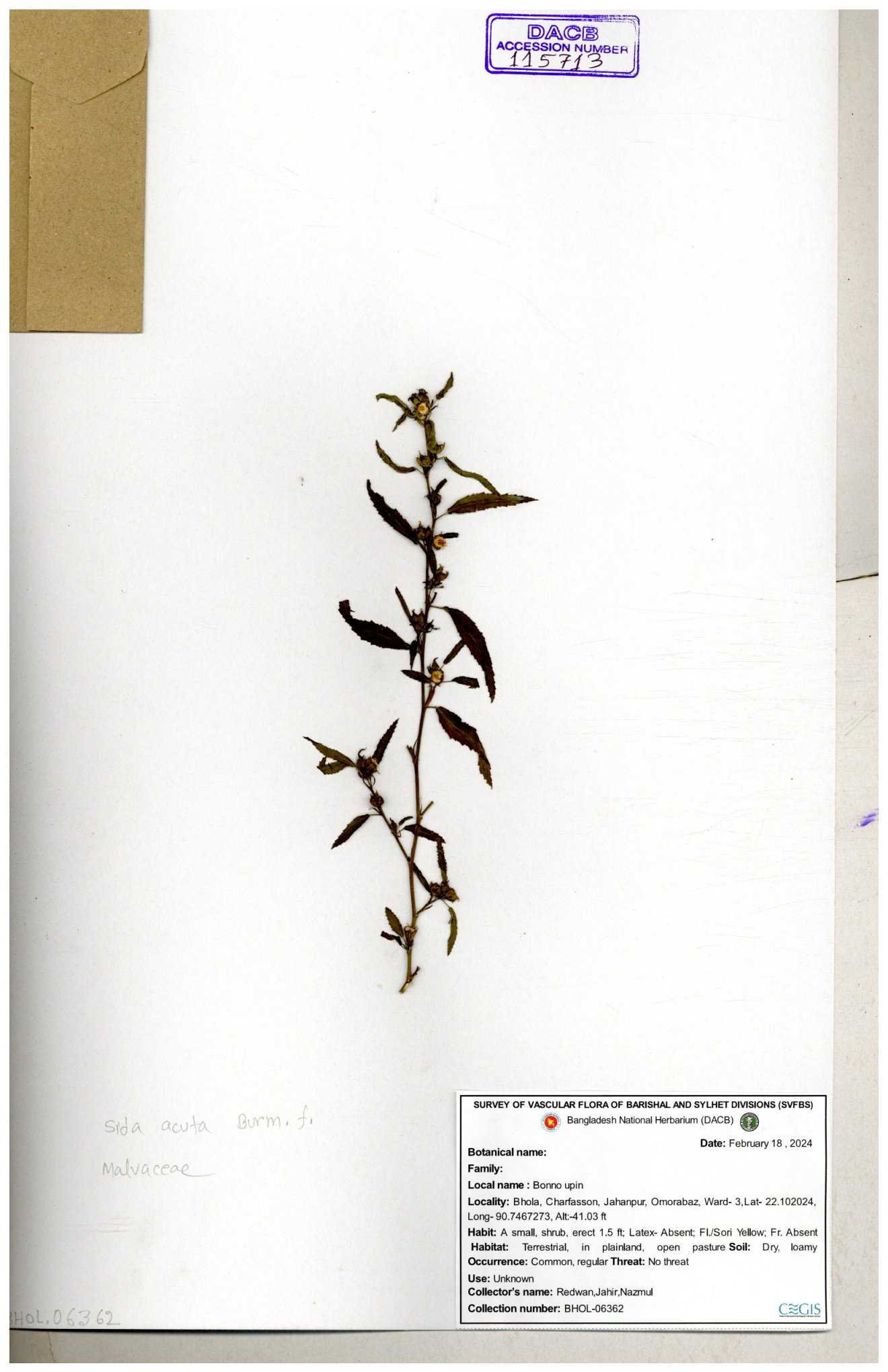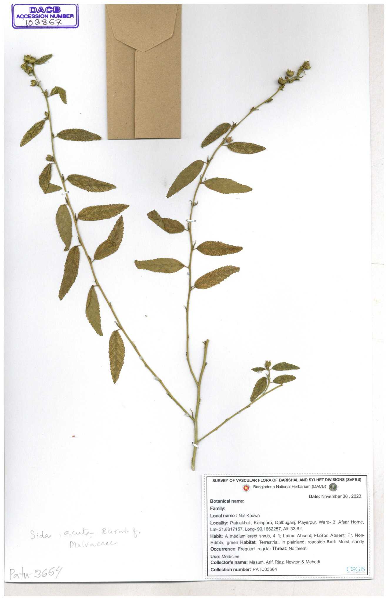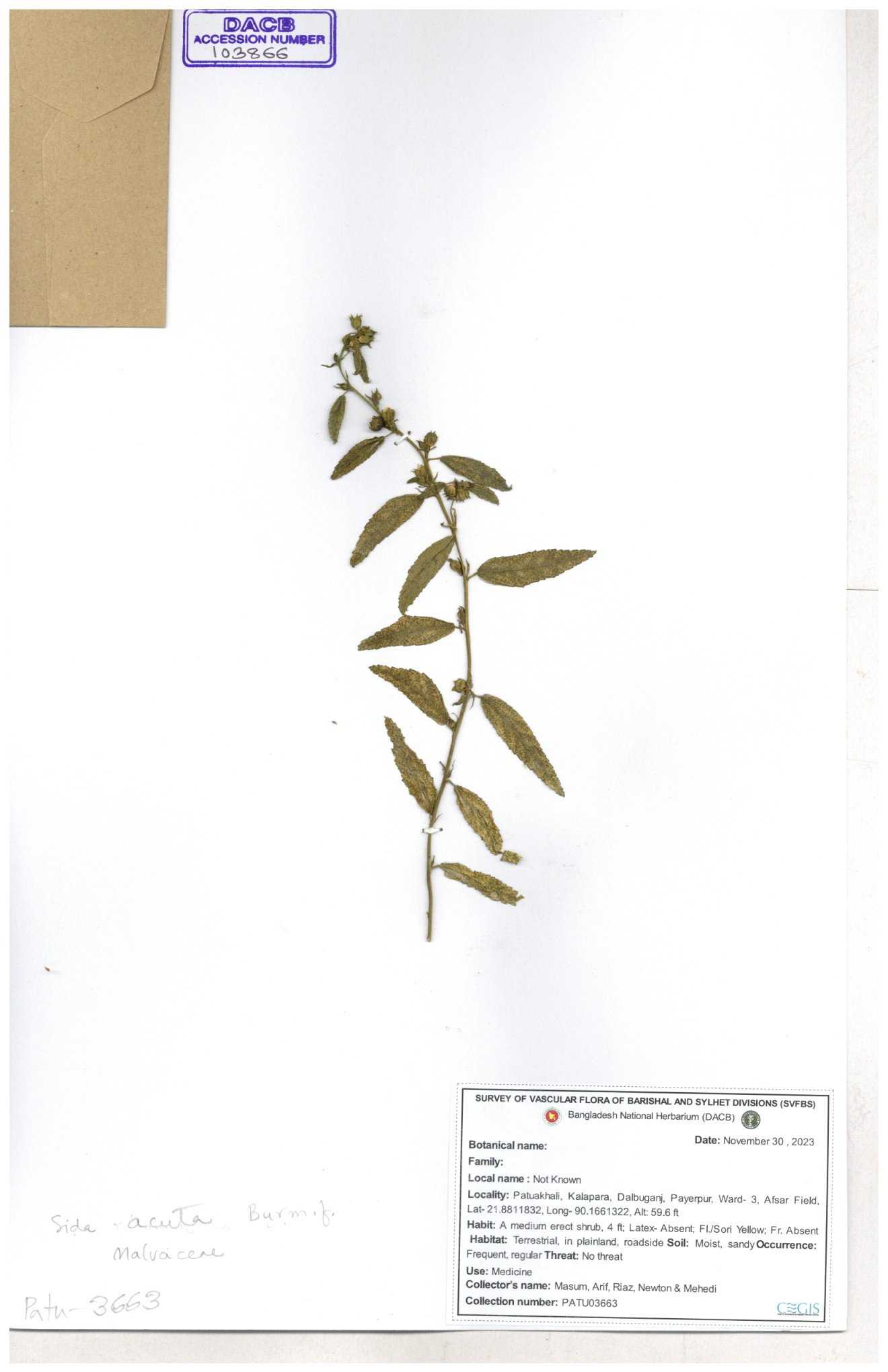 | 65983 | Malvaceae | Sida acuta Burm.f. | Berala | Khandakar Kamrul Islam | KKI-4066 12-03-2020 |
