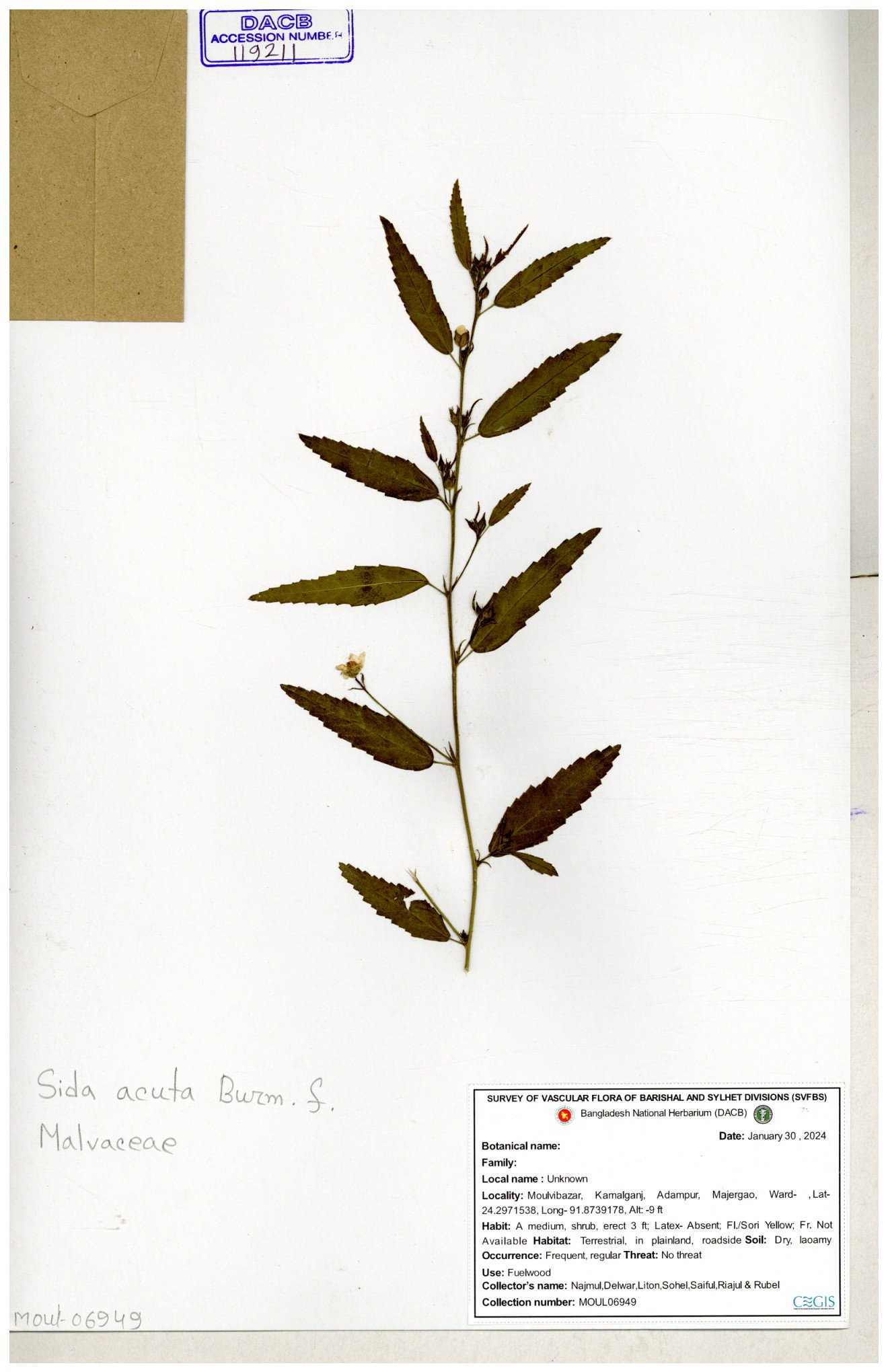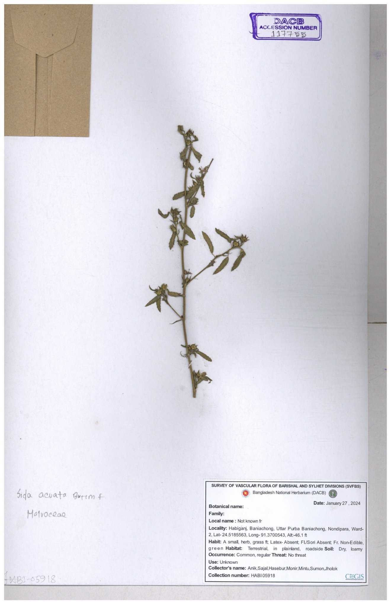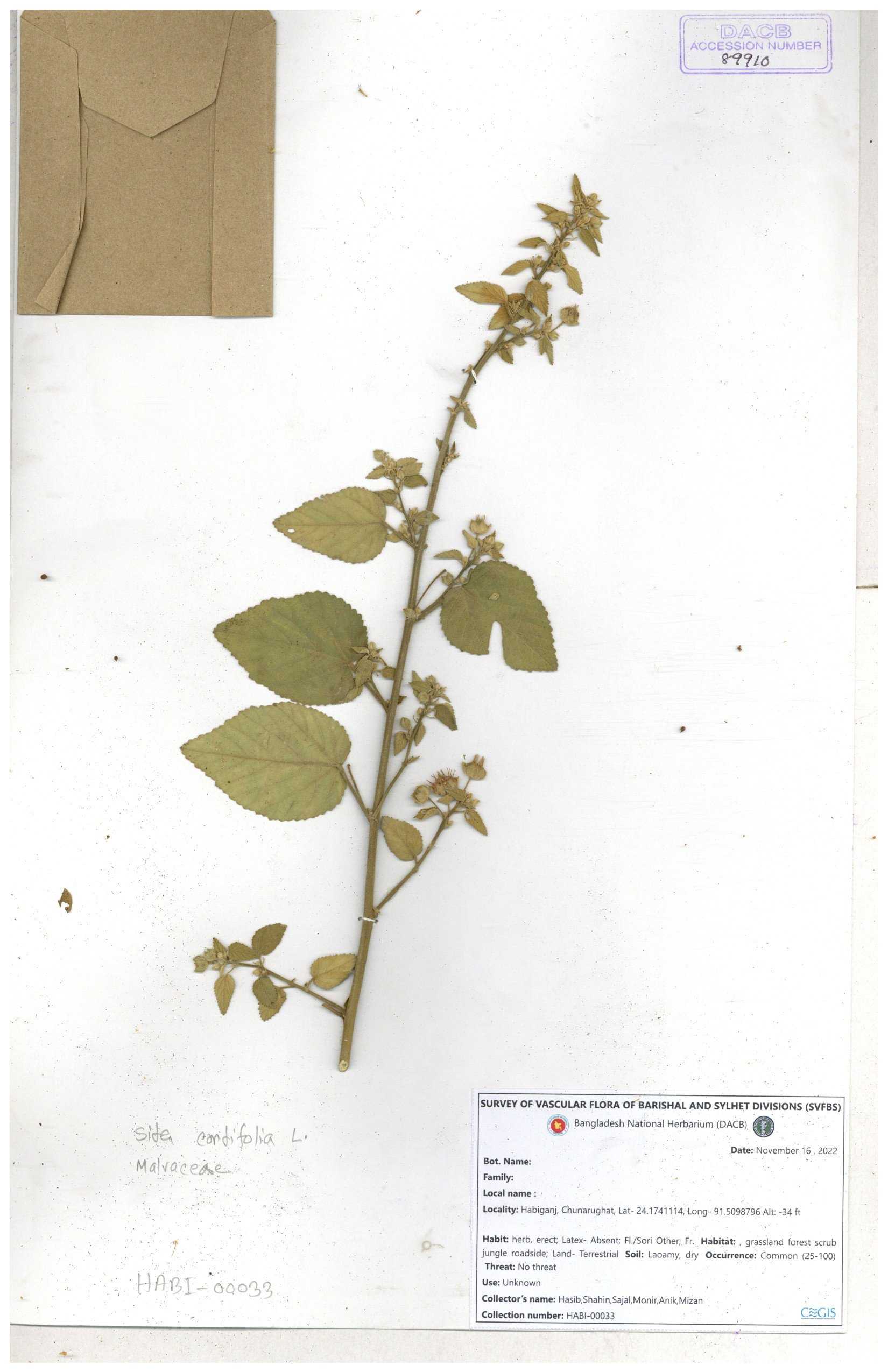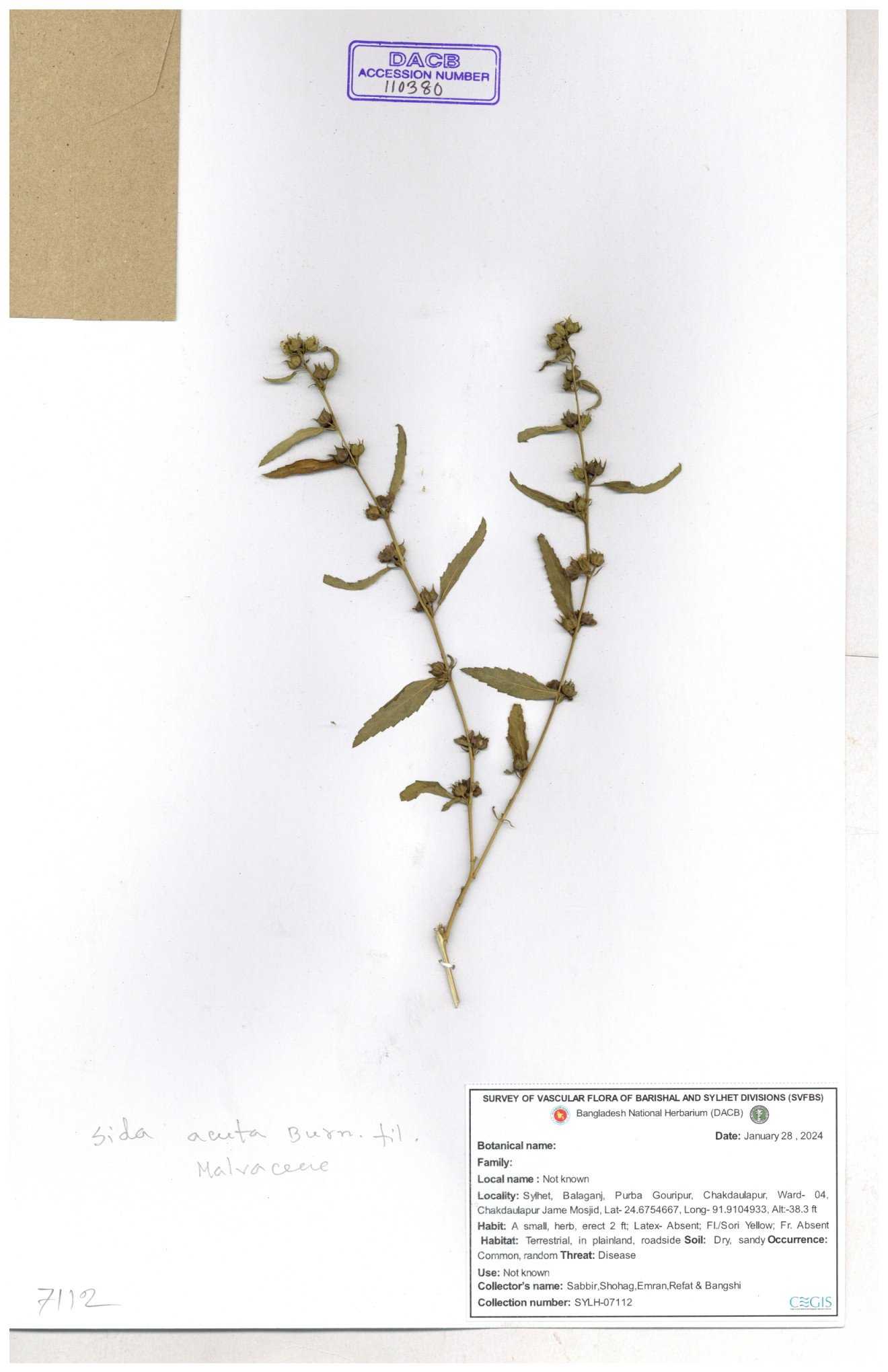 | 65983 | Malvaceae | Sida acuta Burm.f. | Berala | Khandakar Kamrul Islam | KKI-4066 12-03-2020 |