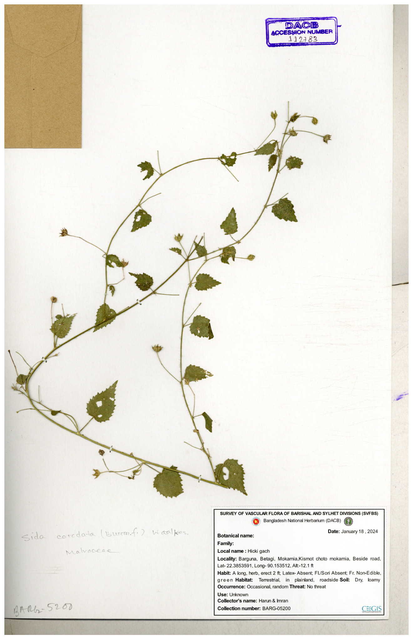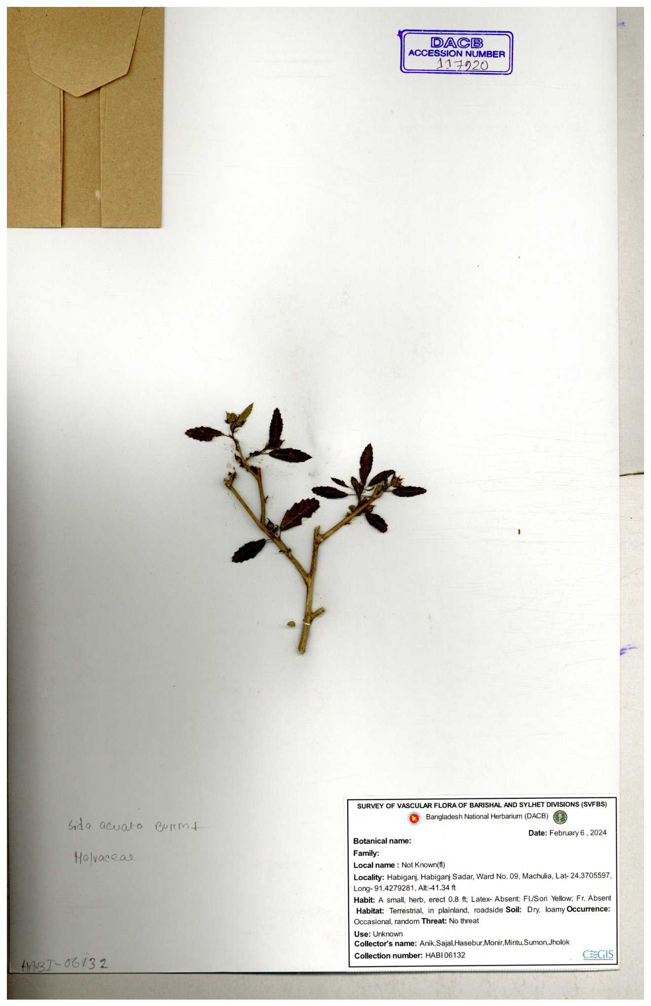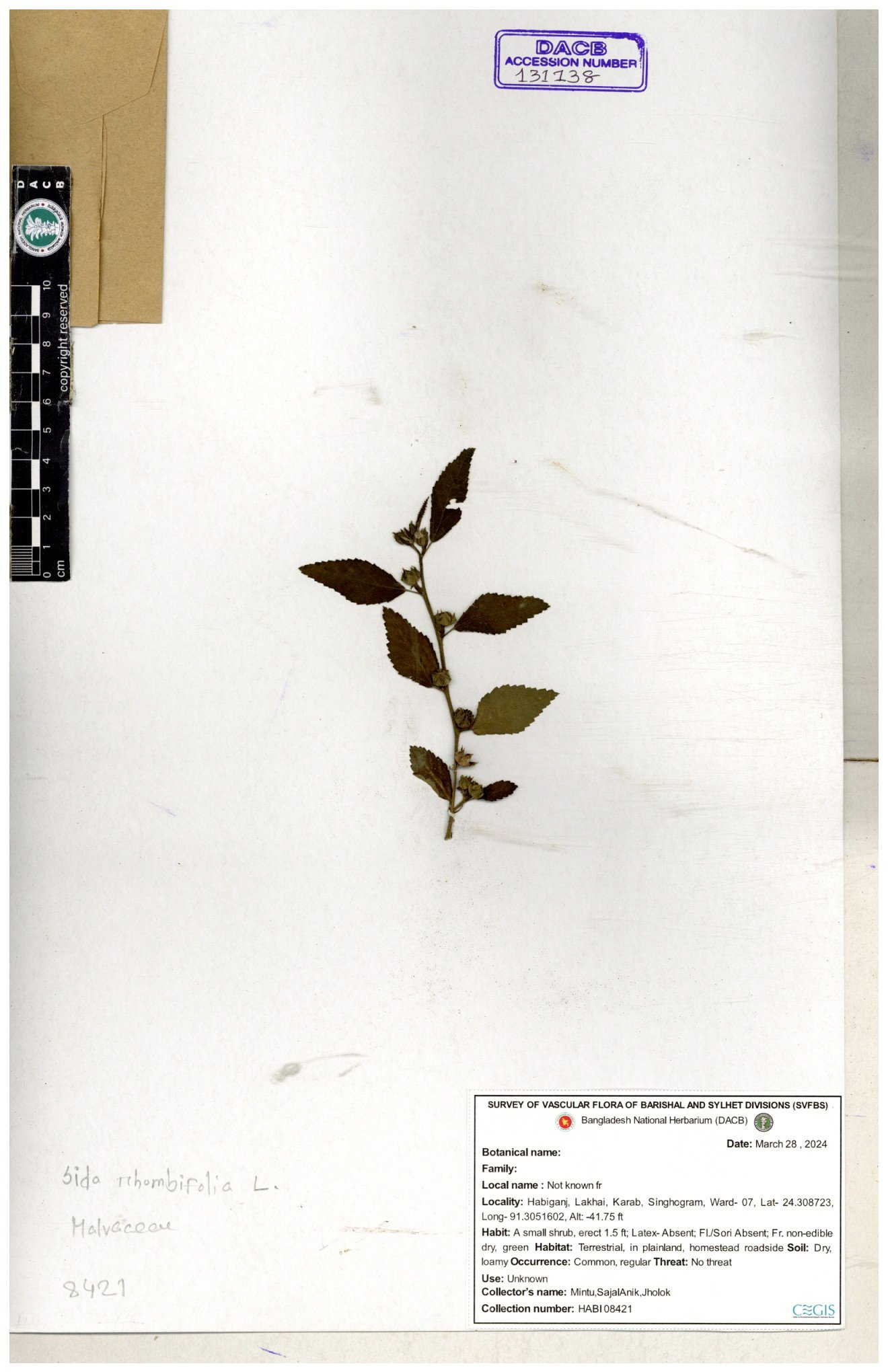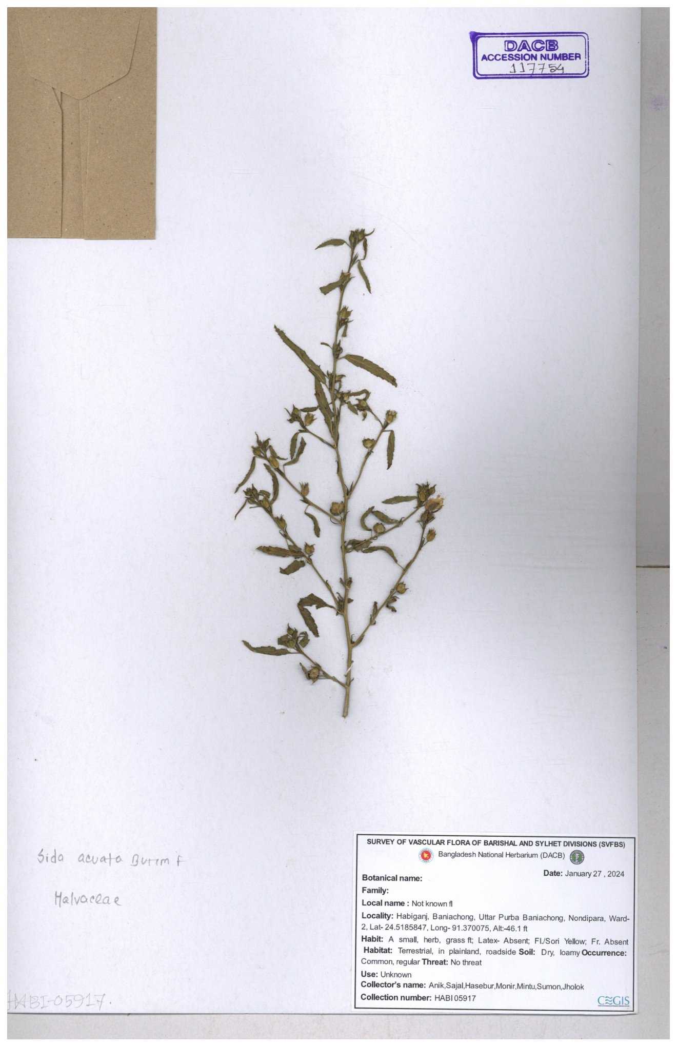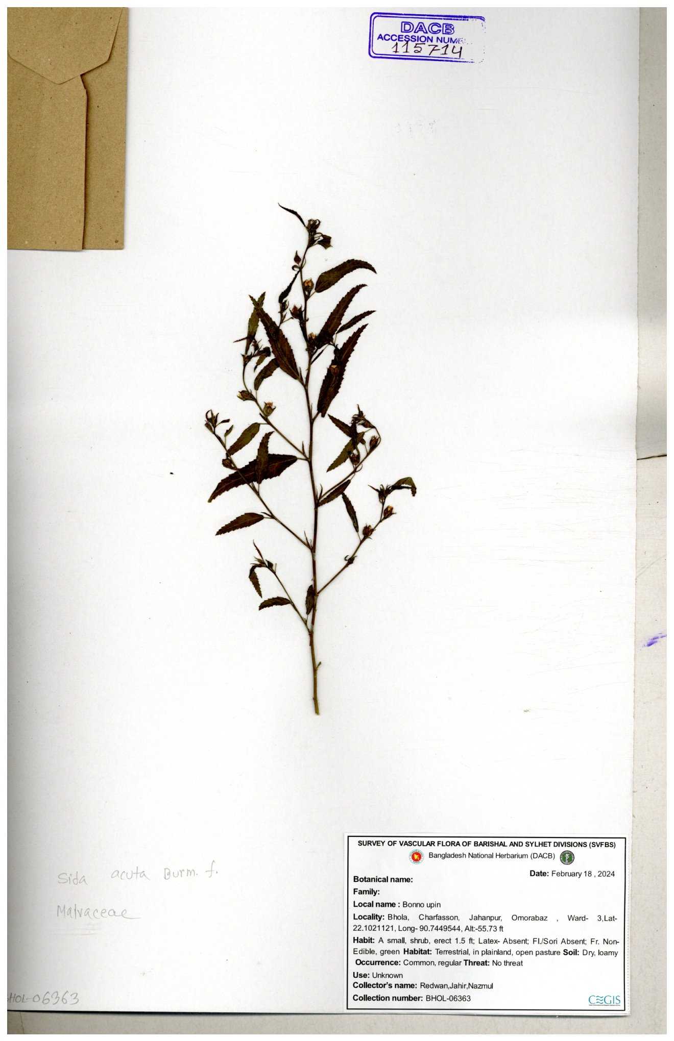 | 65983 | Malvaceae | Sida acuta Burm.f. | Berala | Khandakar Kamrul Islam | KKI-4066 12-03-2020 |