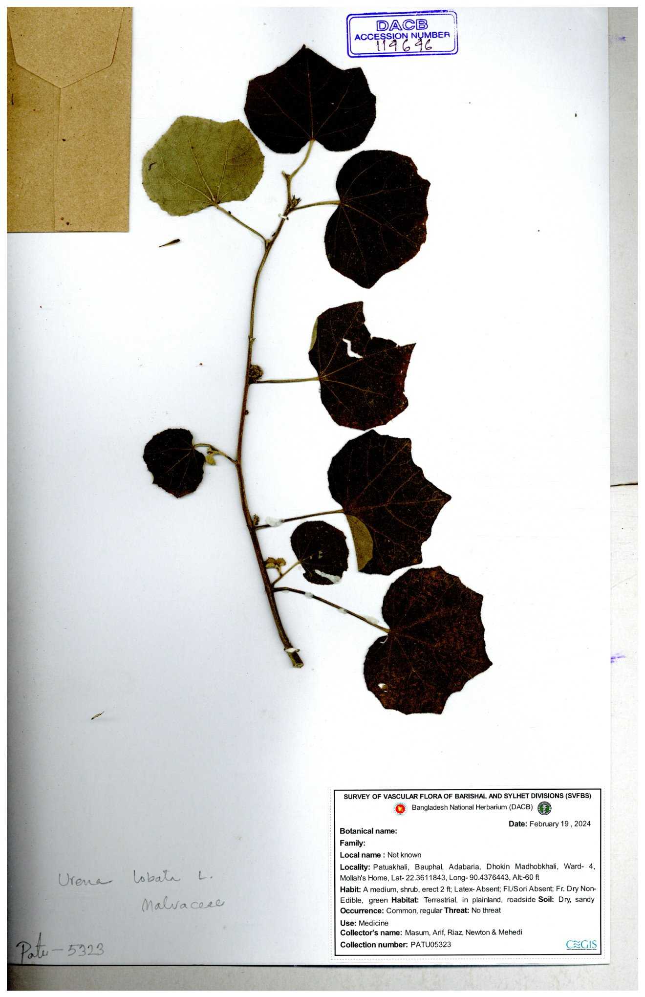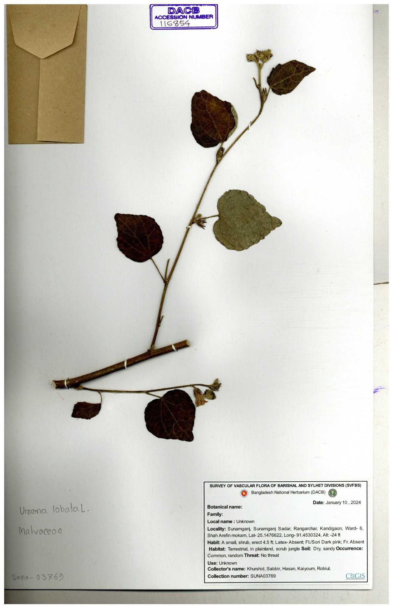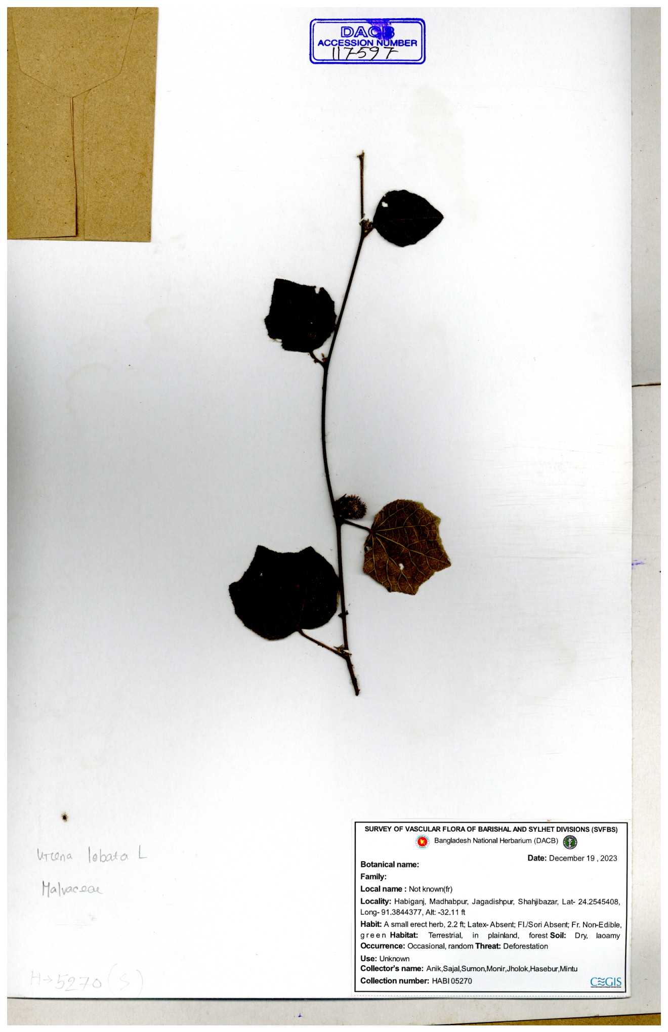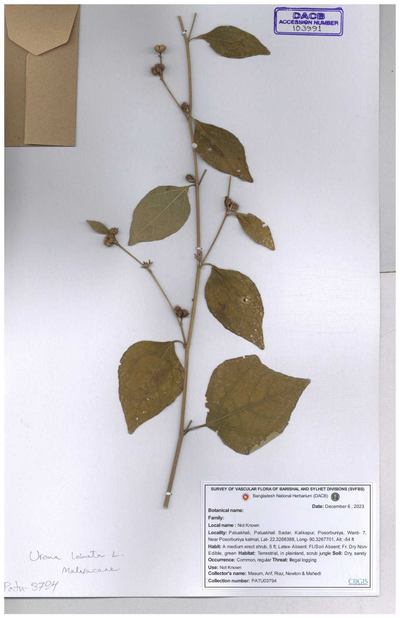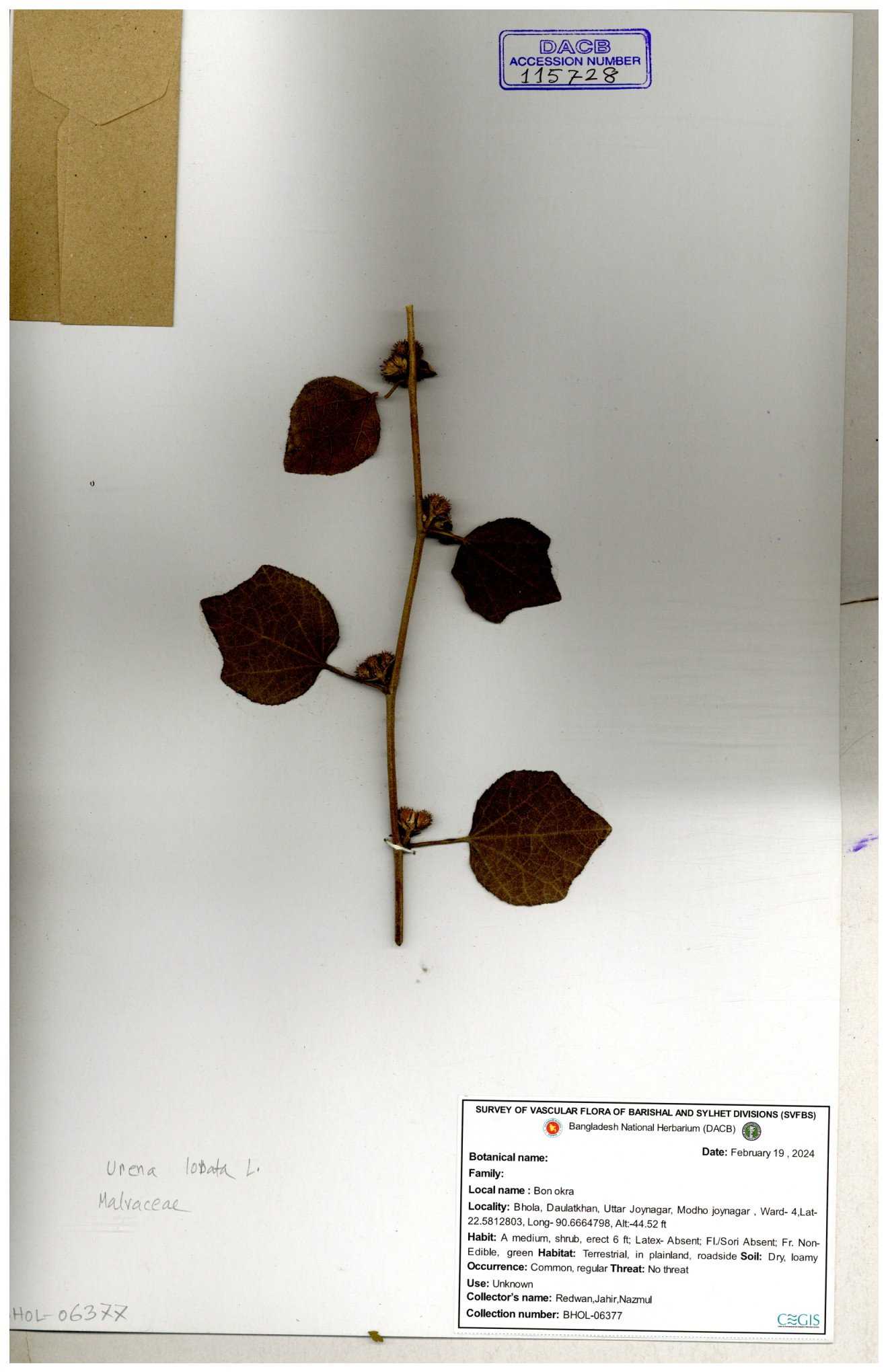 | 65947 | Malvaceae | Urena Urera L. | Khandakar Kamrul Islam | KKI-3982 12-02-2020 |