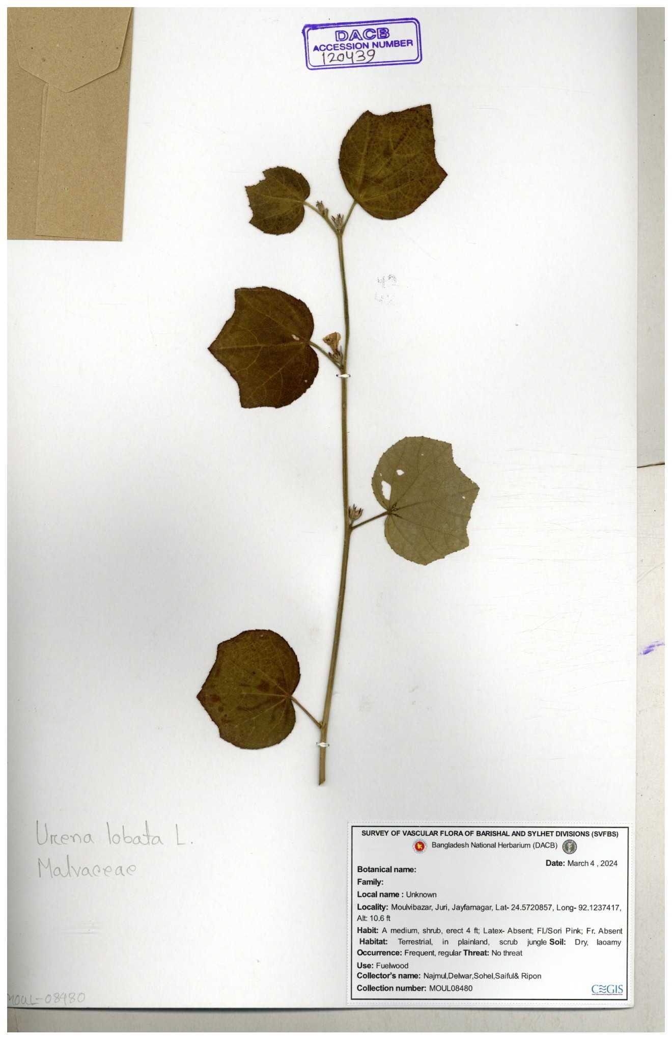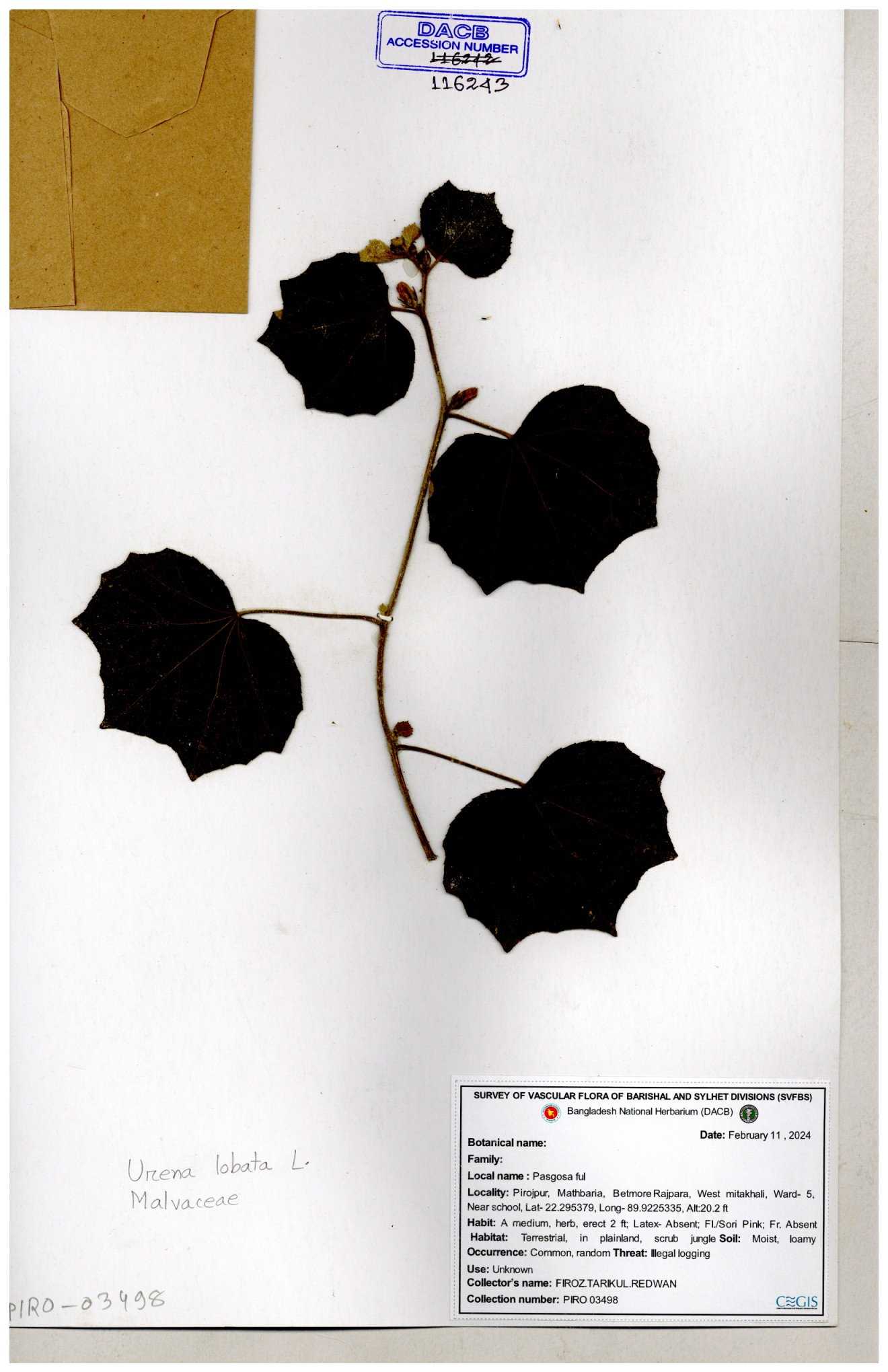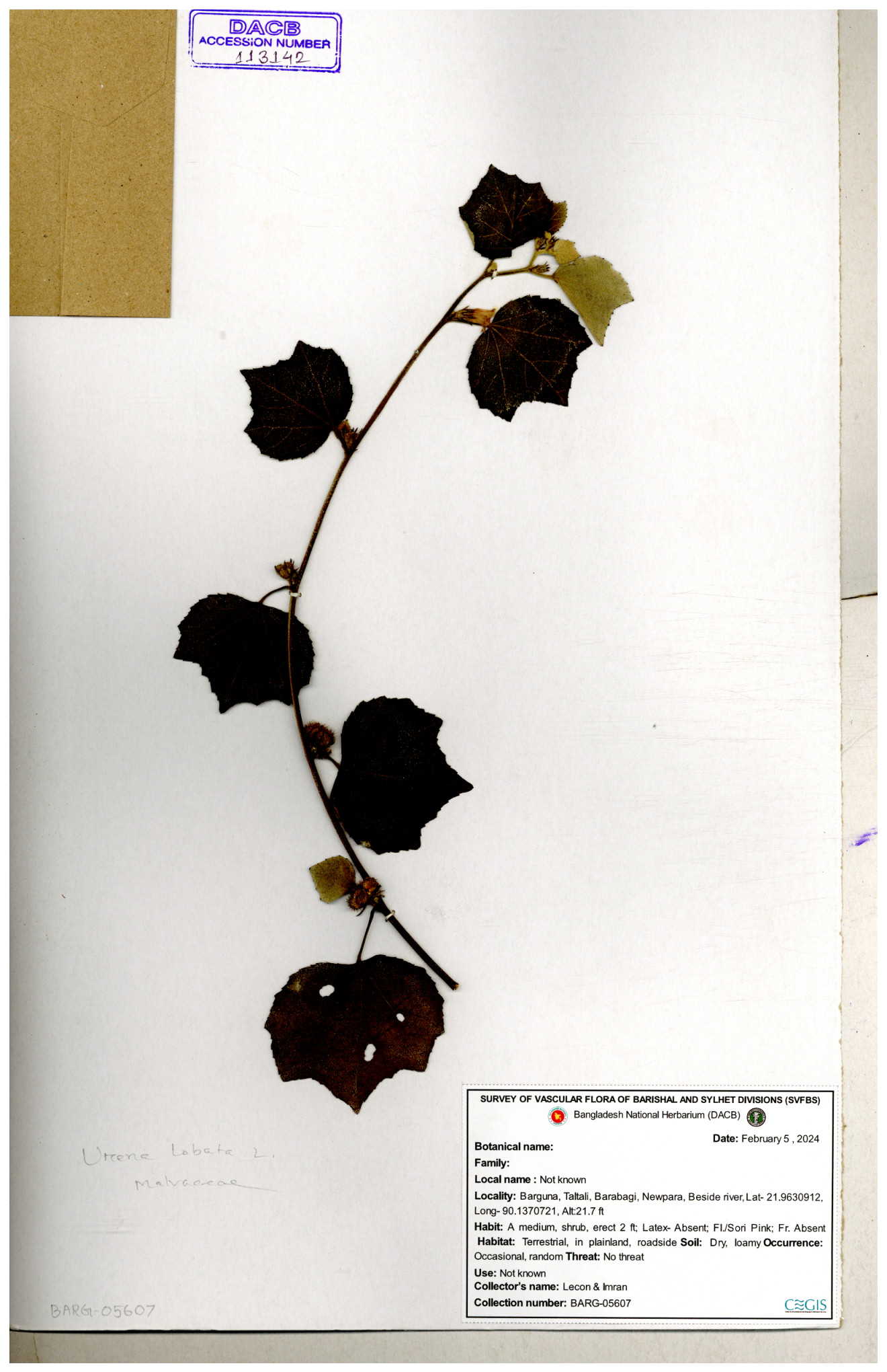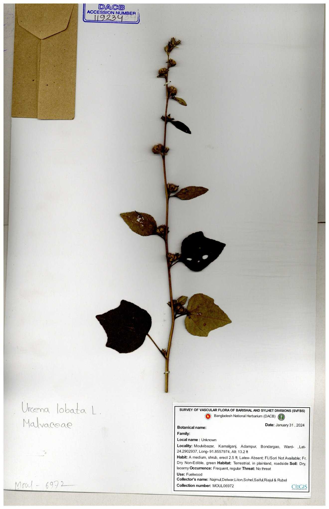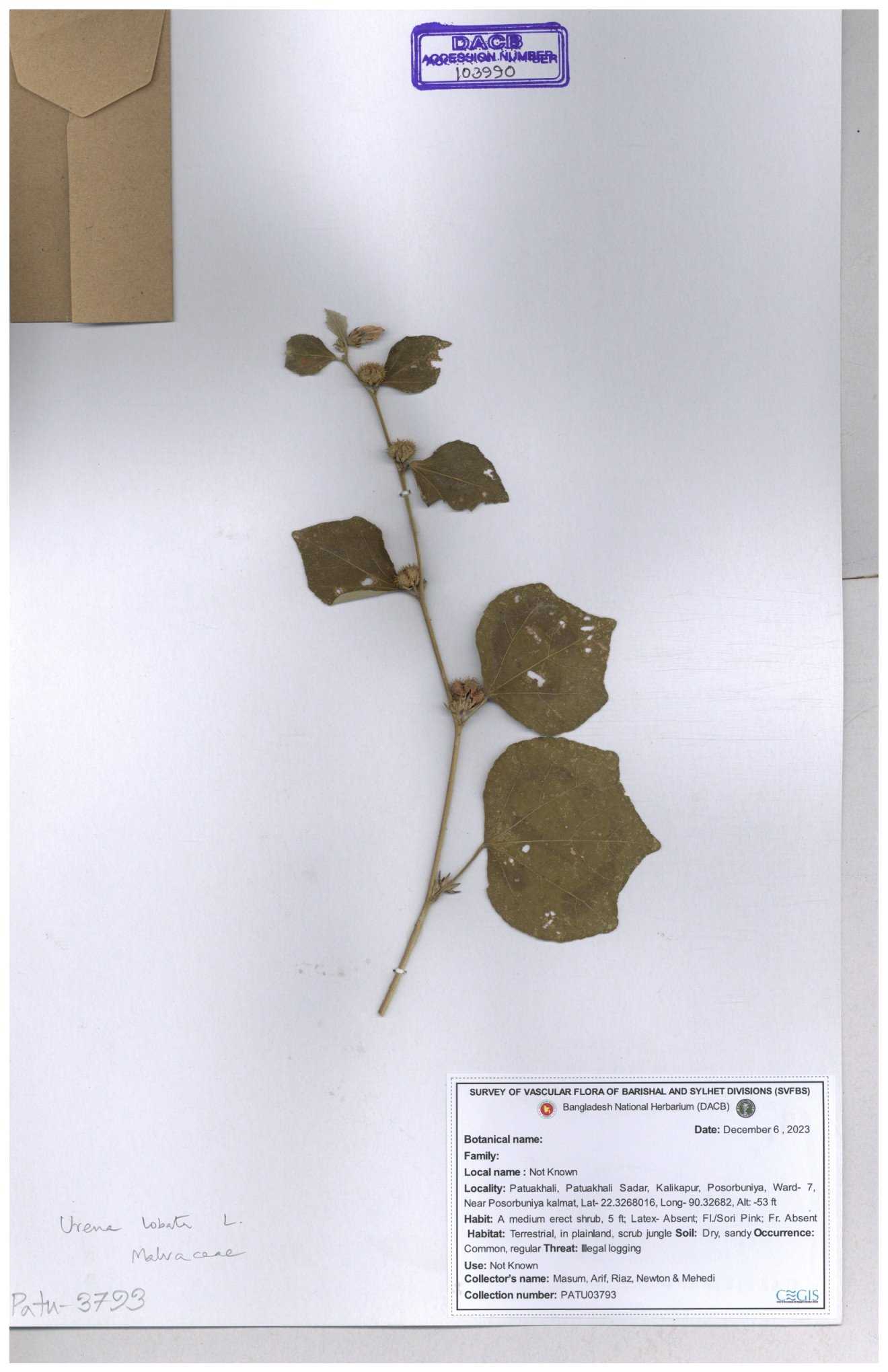 | 65947 | Malvaceae | Urena Urera L. | Khandakar Kamrul Islam | KKI-3982 12-02-2020 |