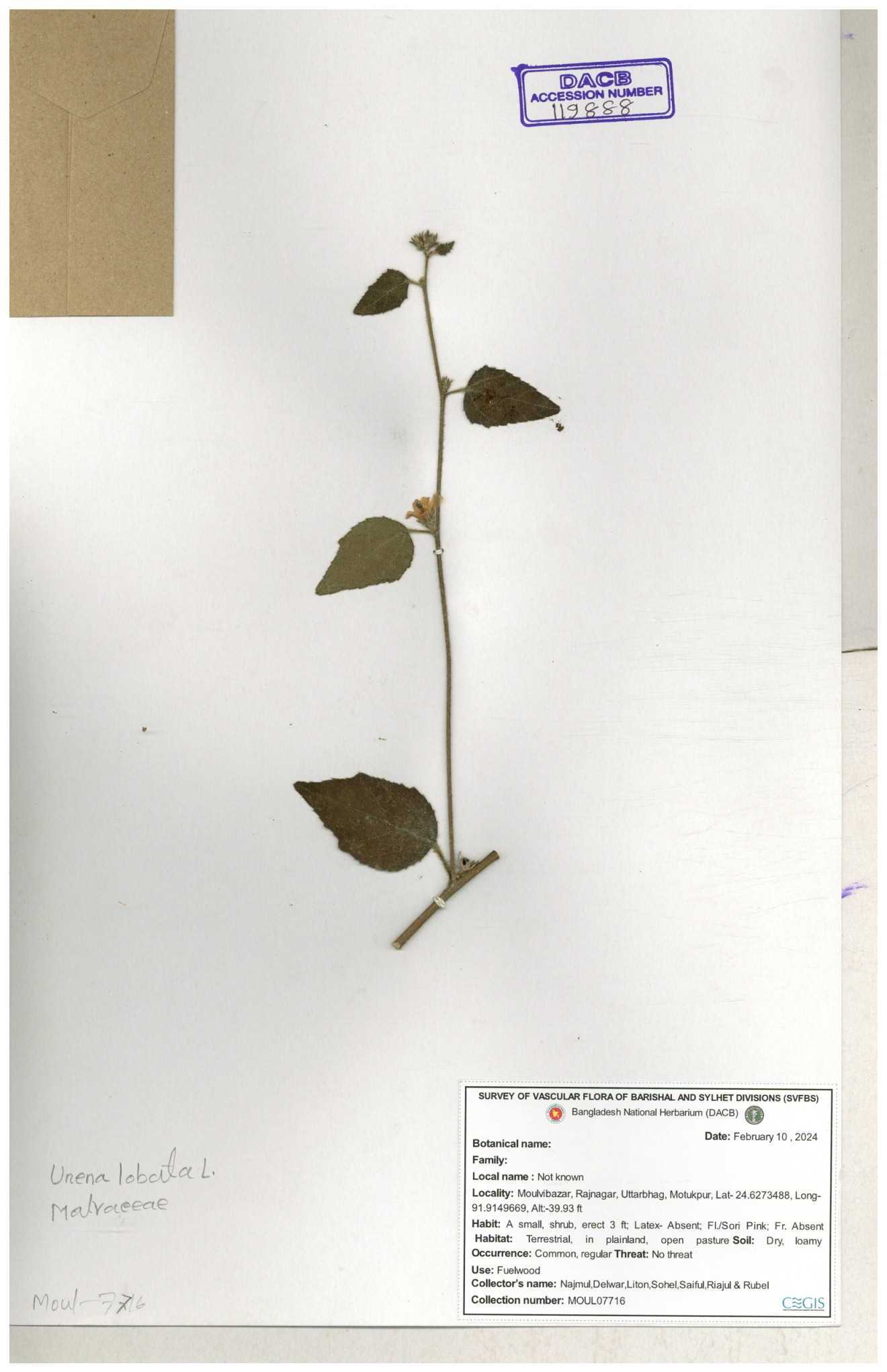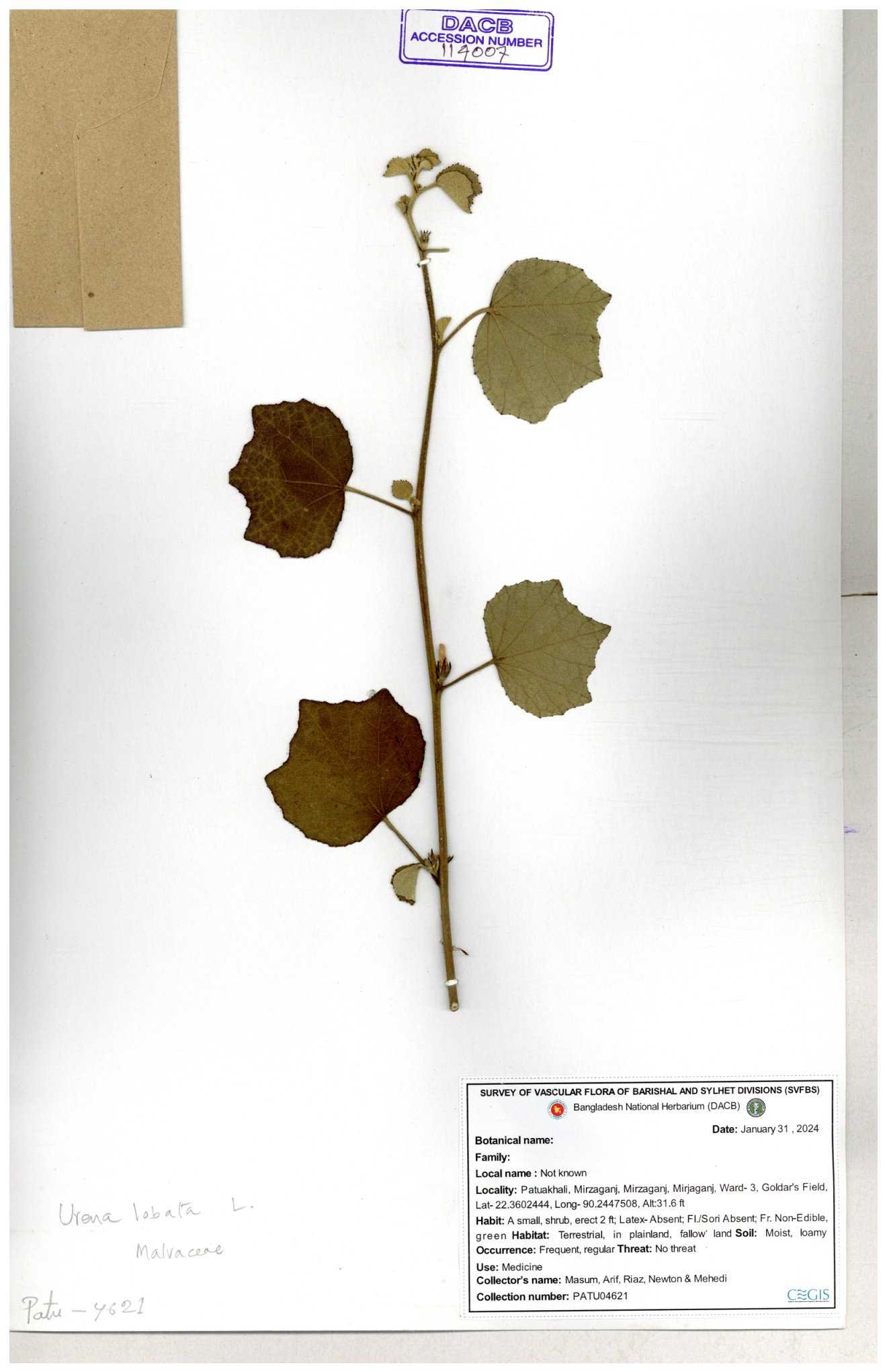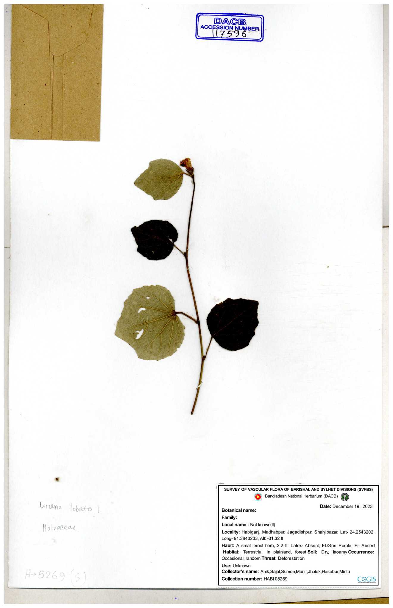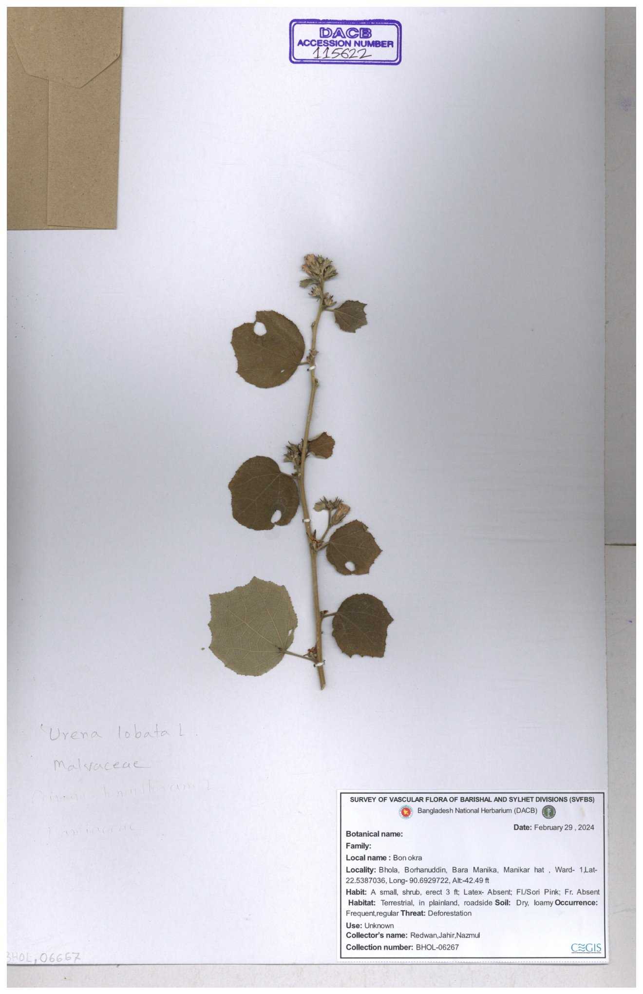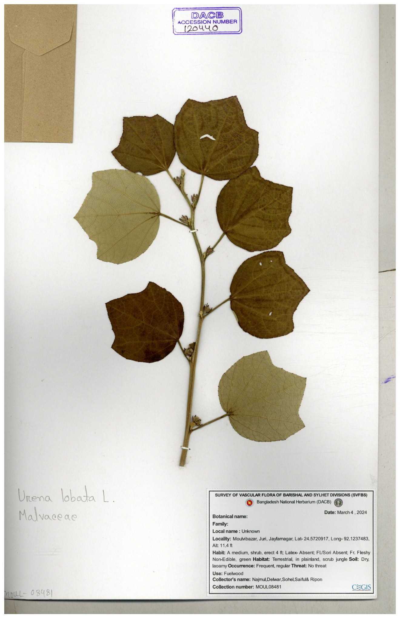 | 65947 | Malvaceae | Urena Urera L. | Khandakar Kamrul Islam | KKI-3982 12-02-2020 |