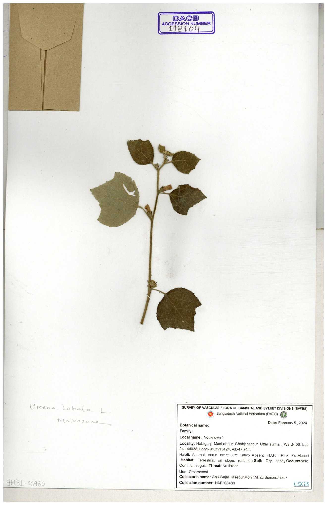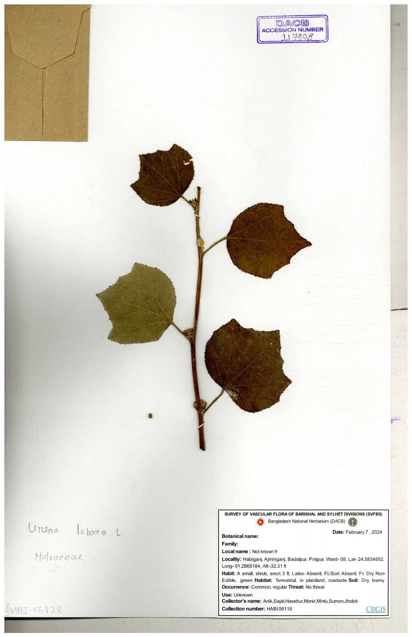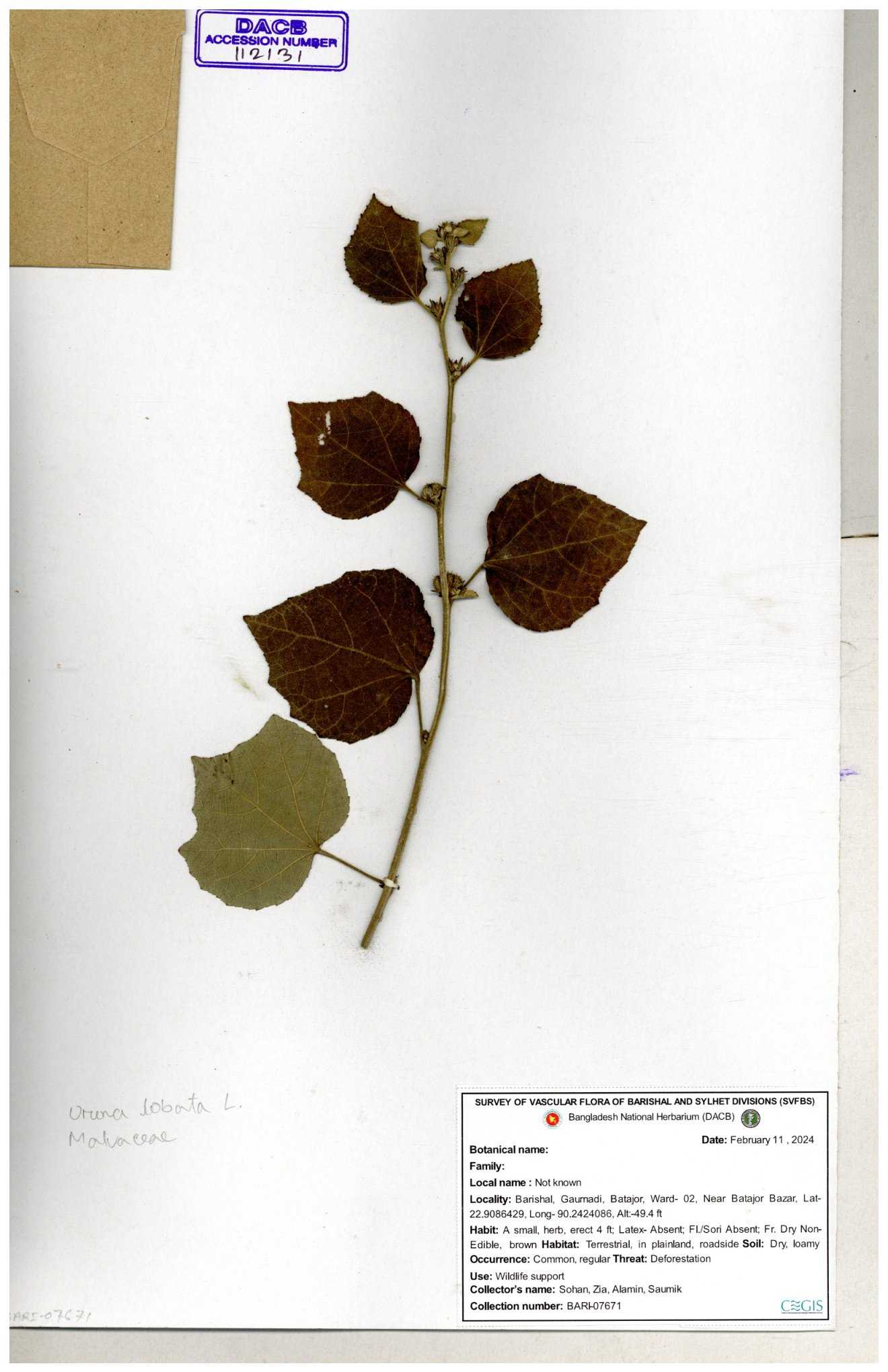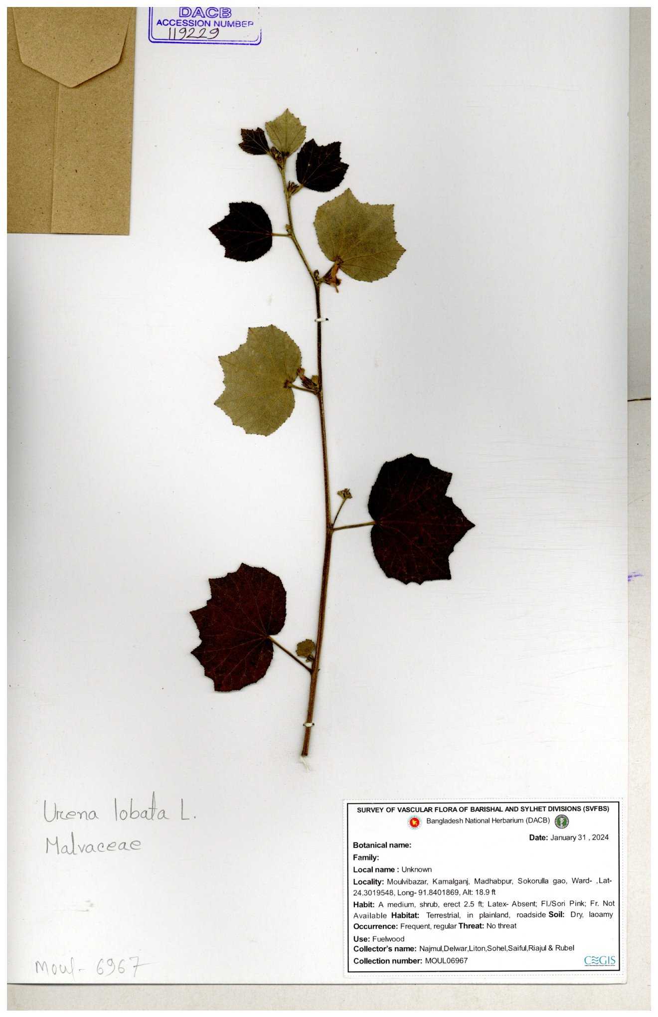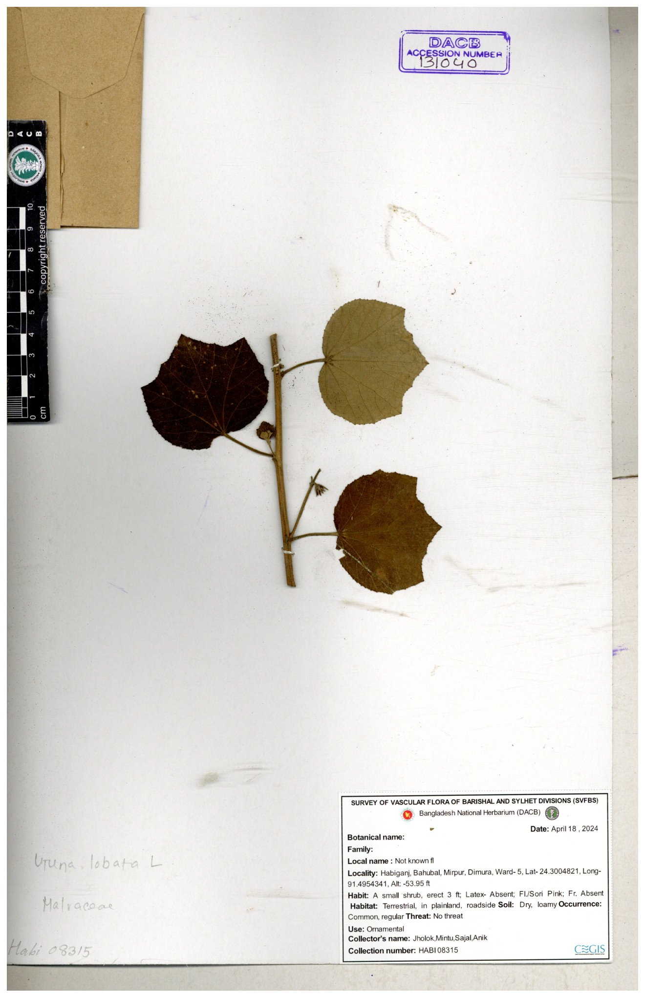 | 65947 | Malvaceae | Urena Urera L. | Khandakar Kamrul Islam | KKI-3982 12-02-2020 |