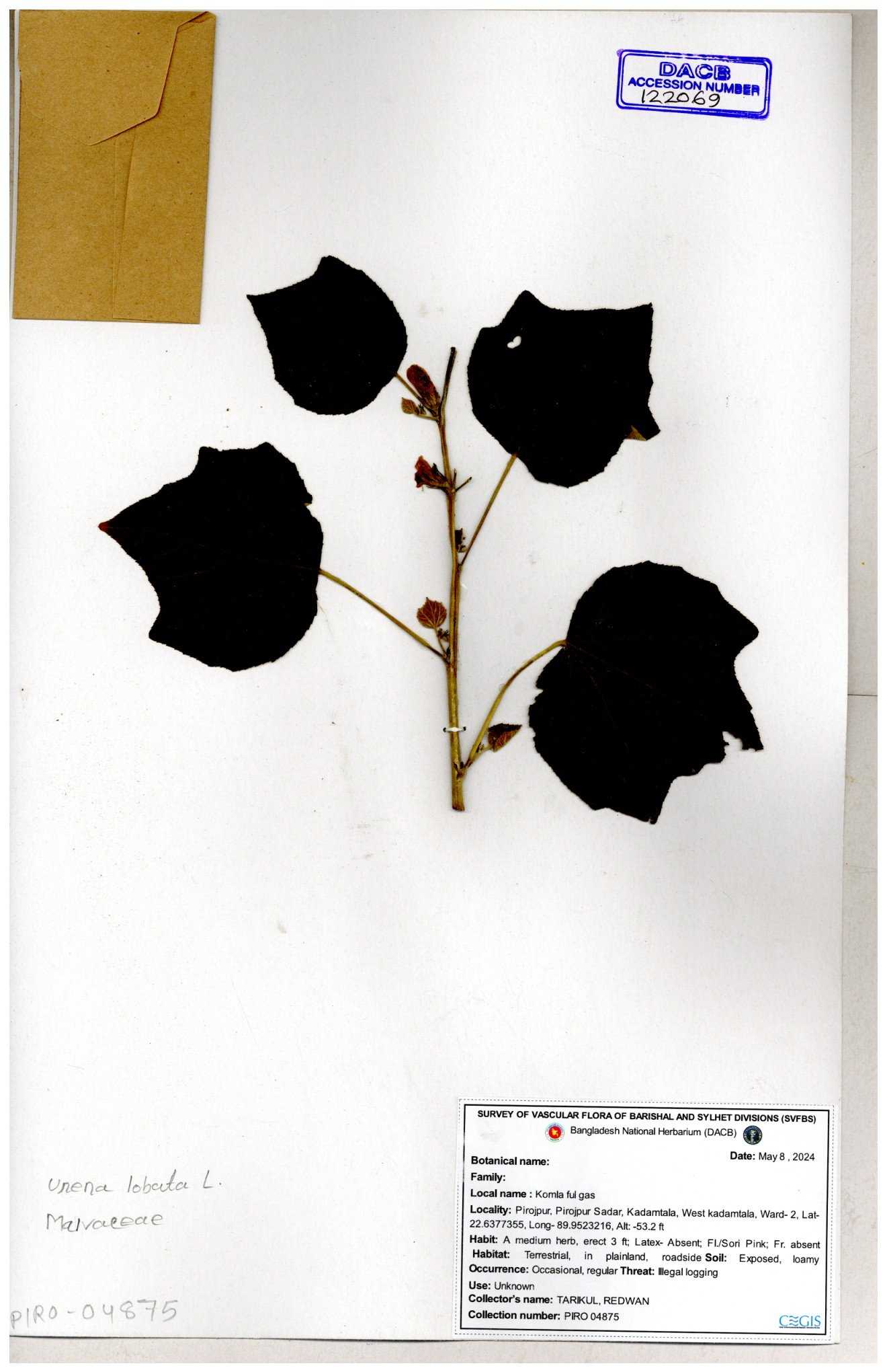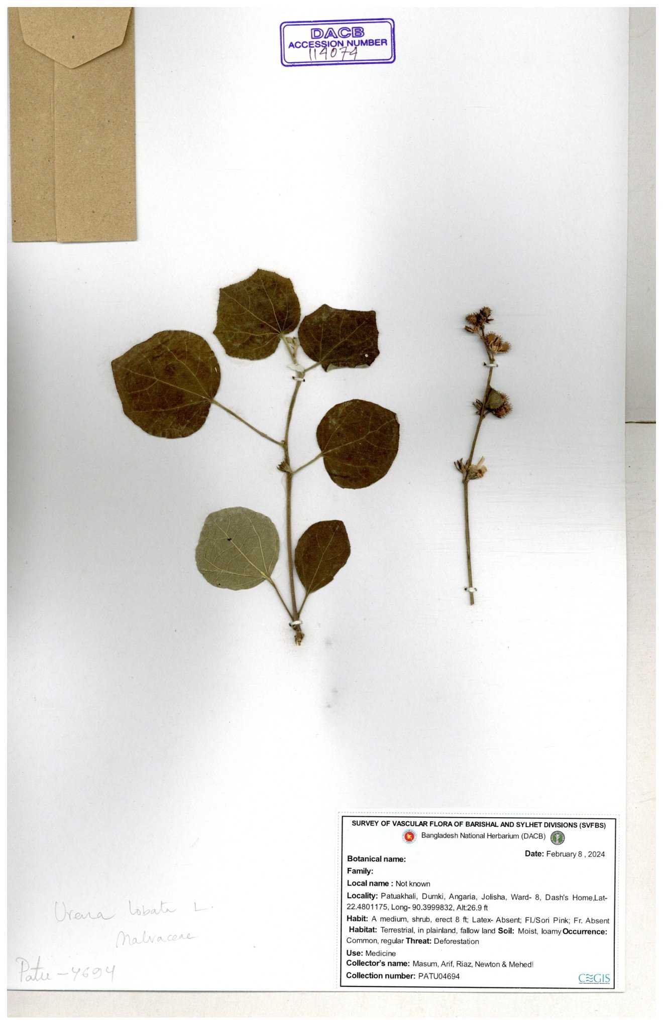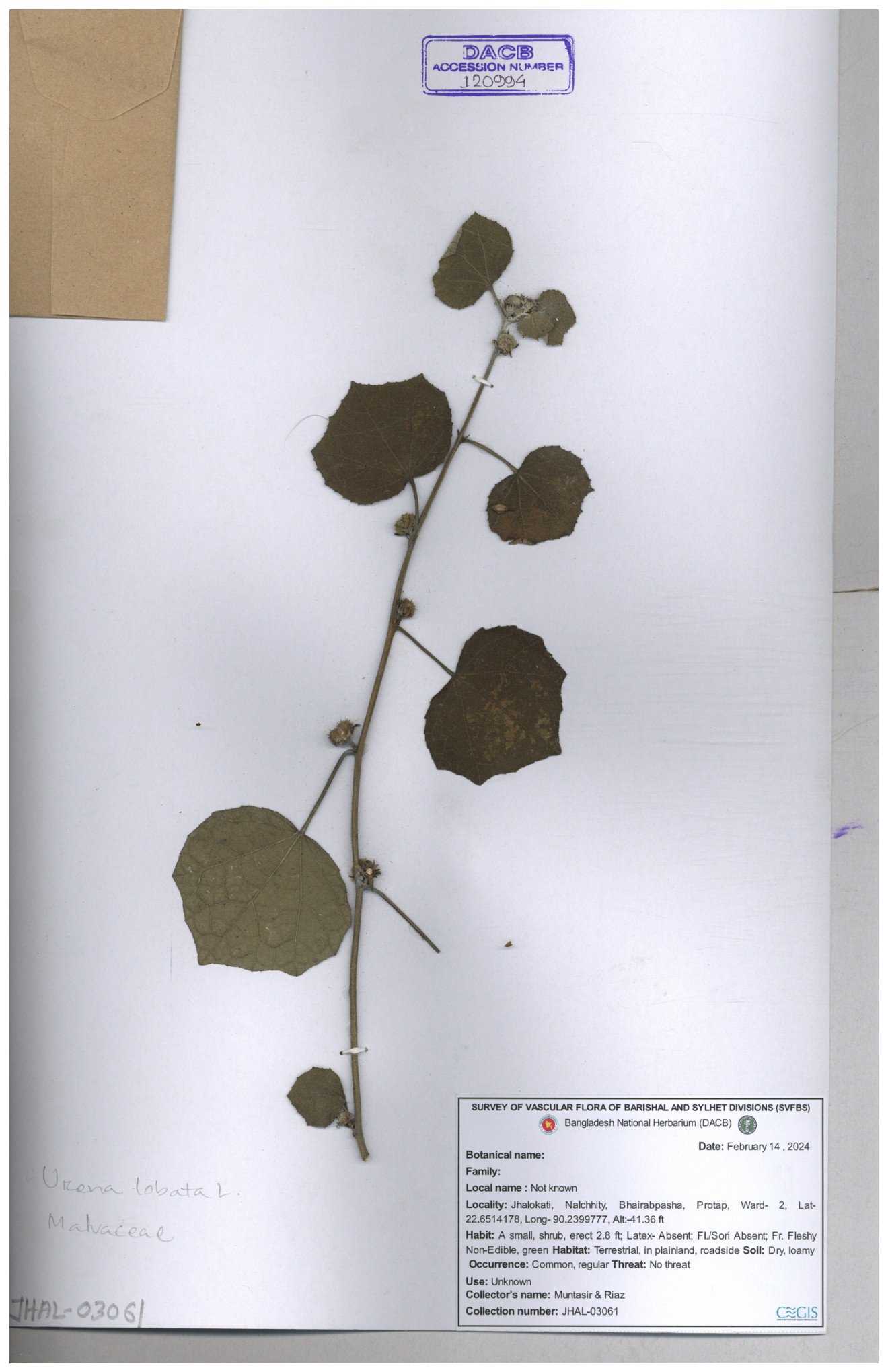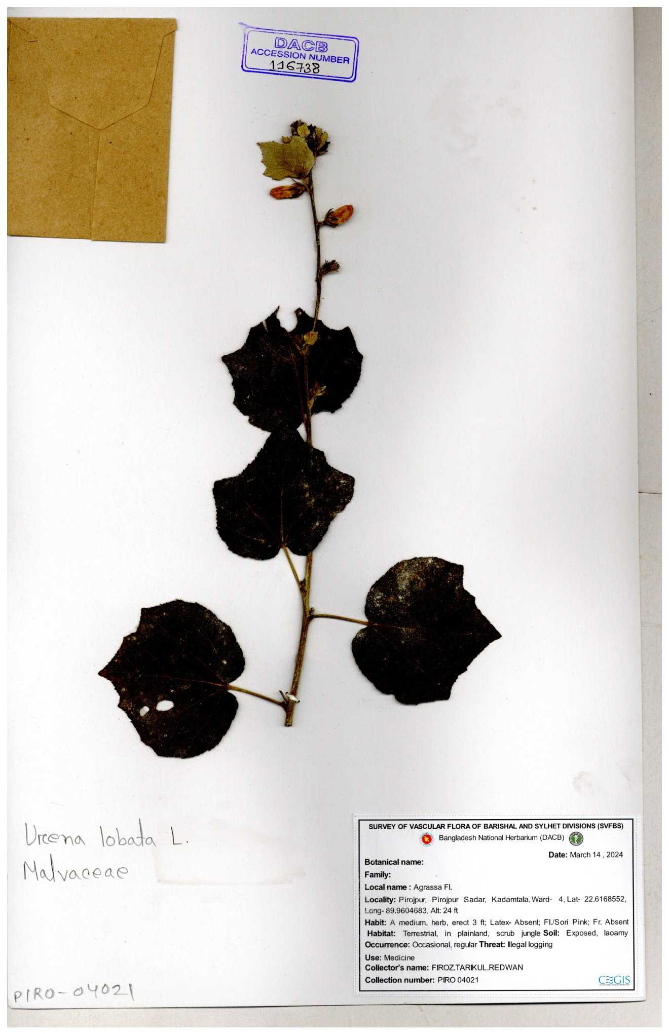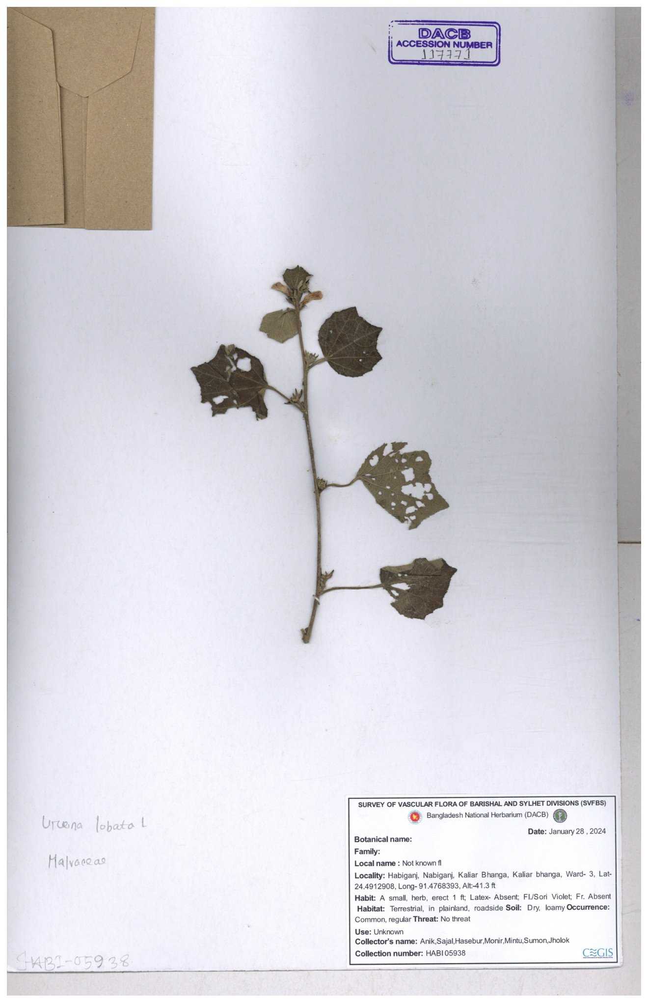 | 65947 | Malvaceae | Urena Urera L. | Khandakar Kamrul Islam | KKI-3982 12-02-2020 |