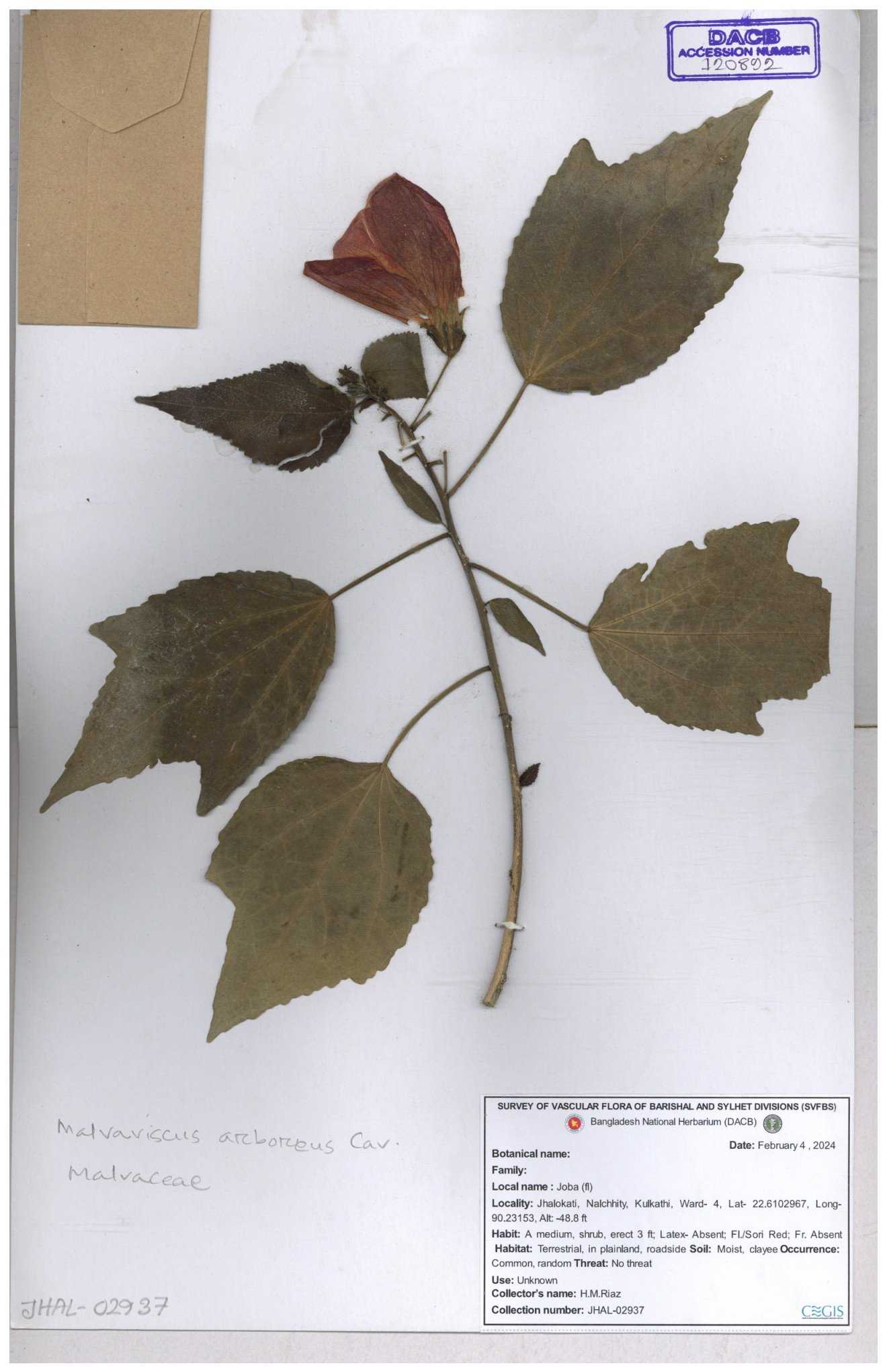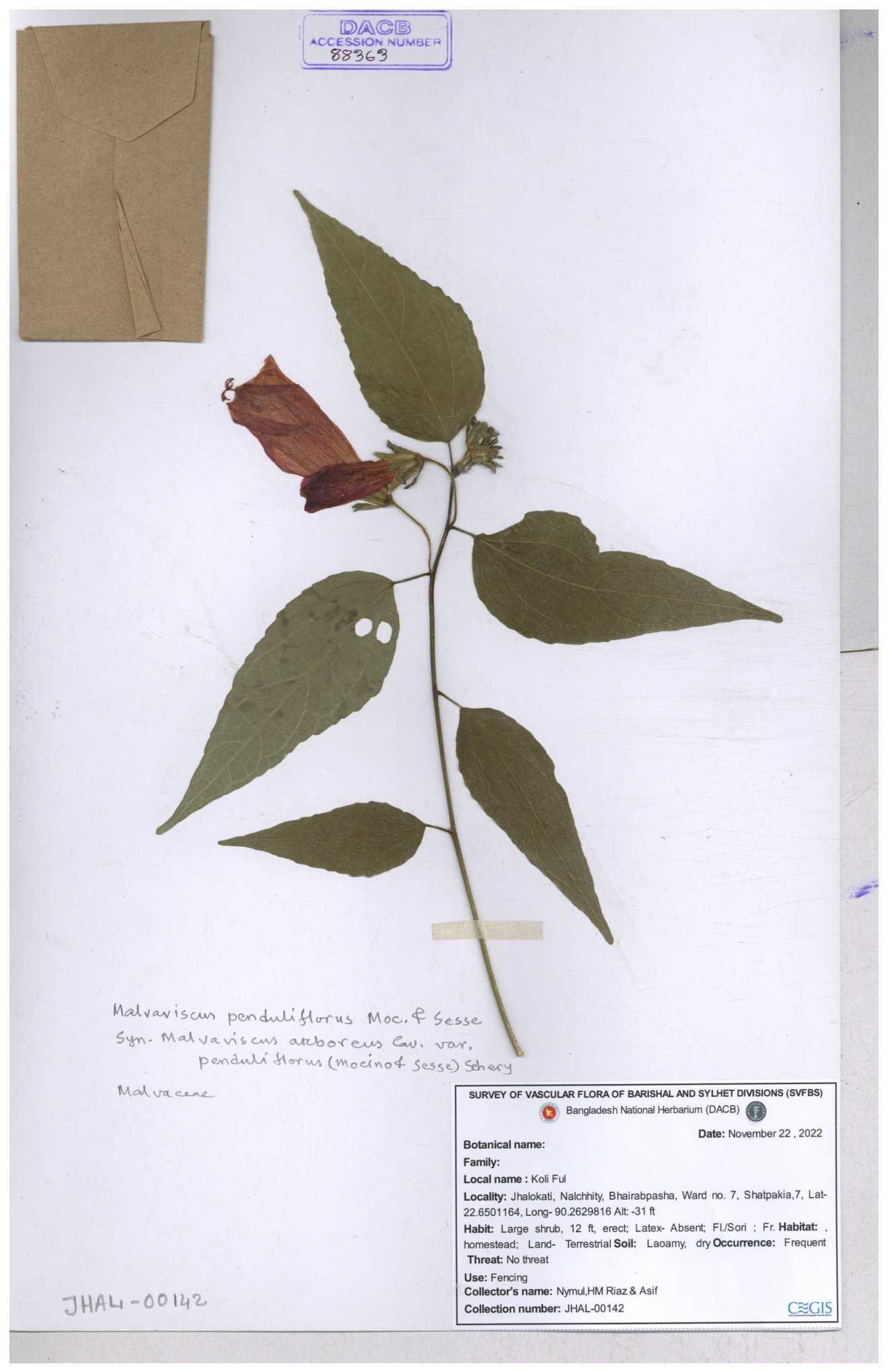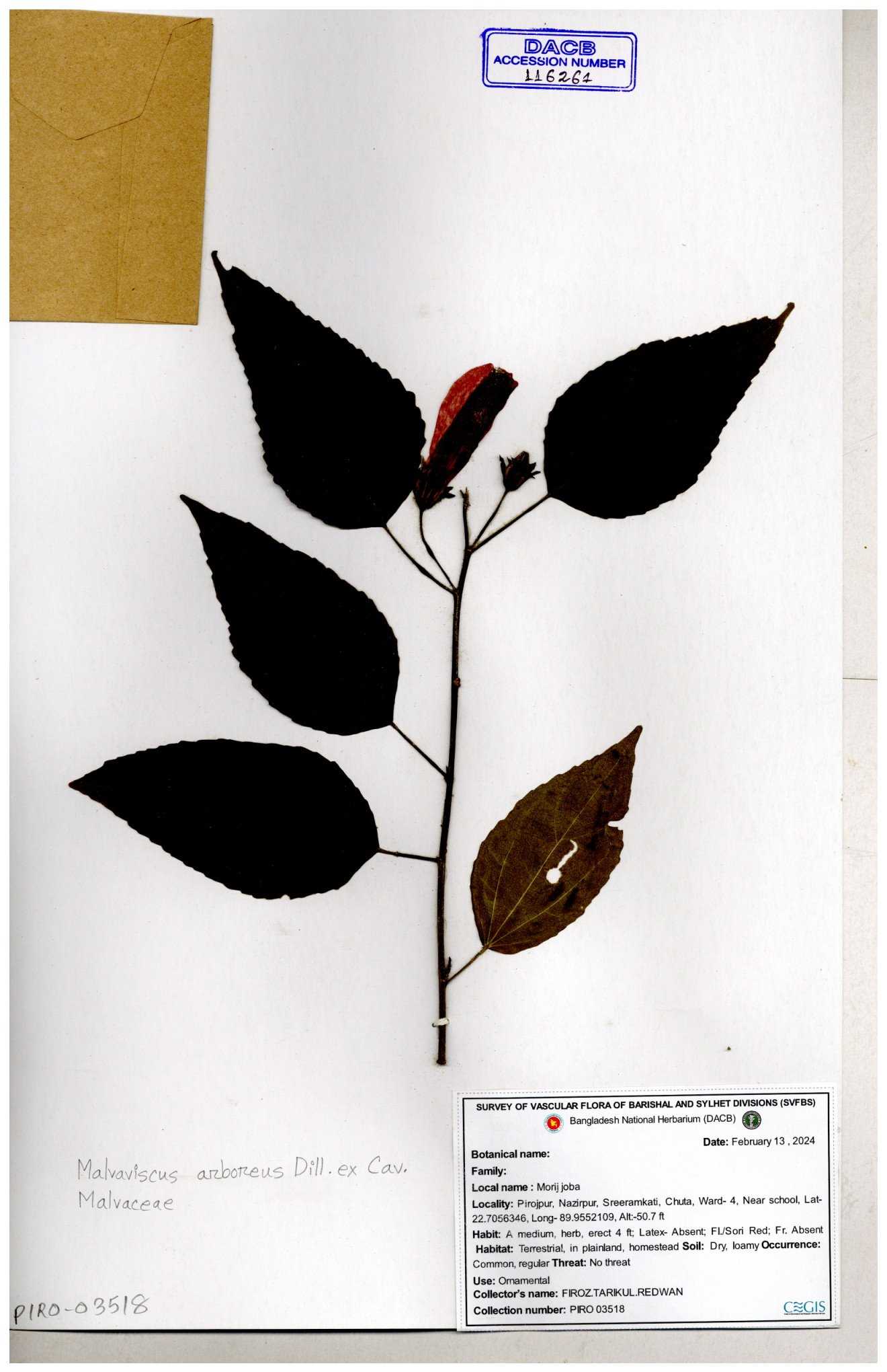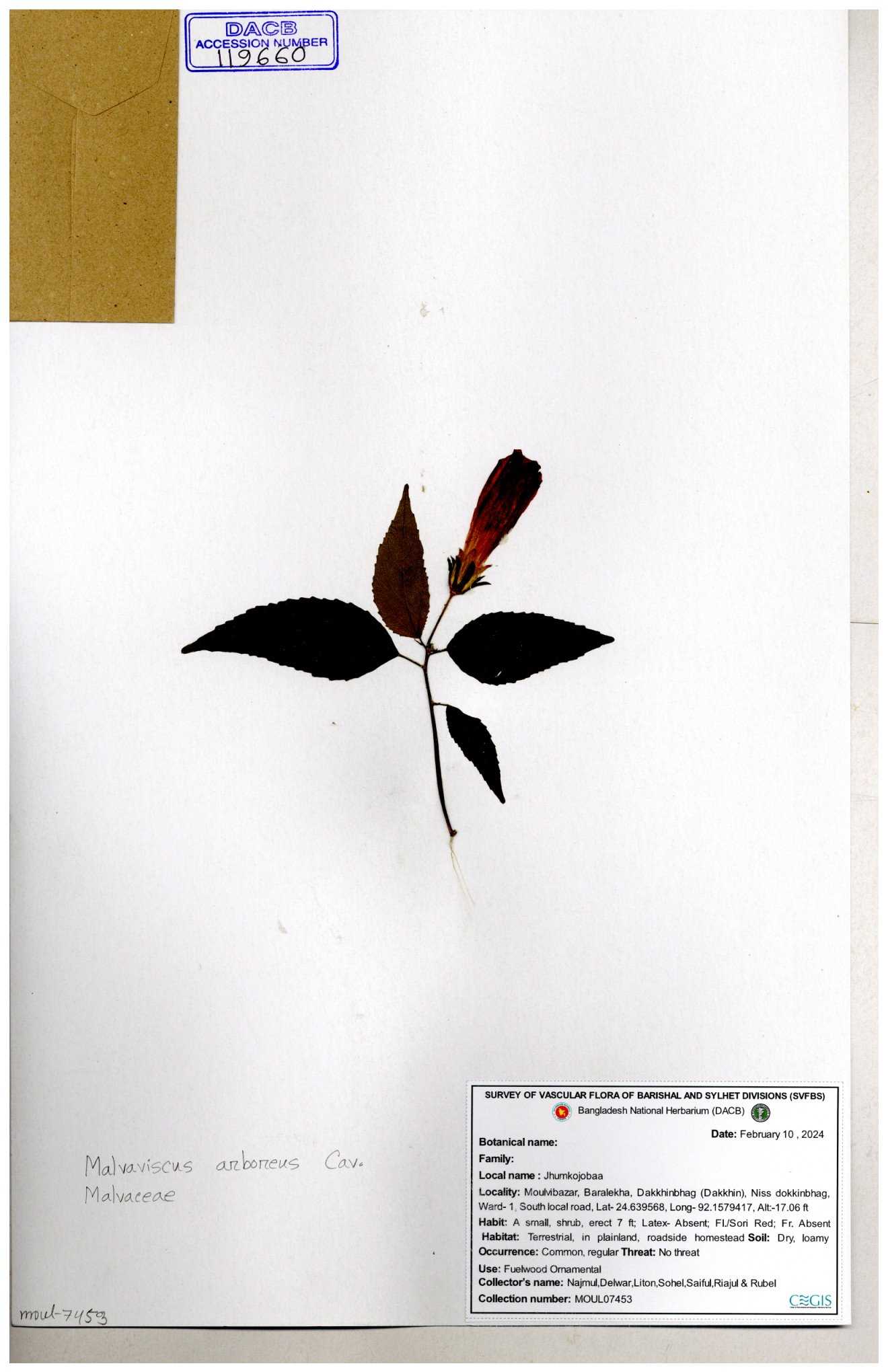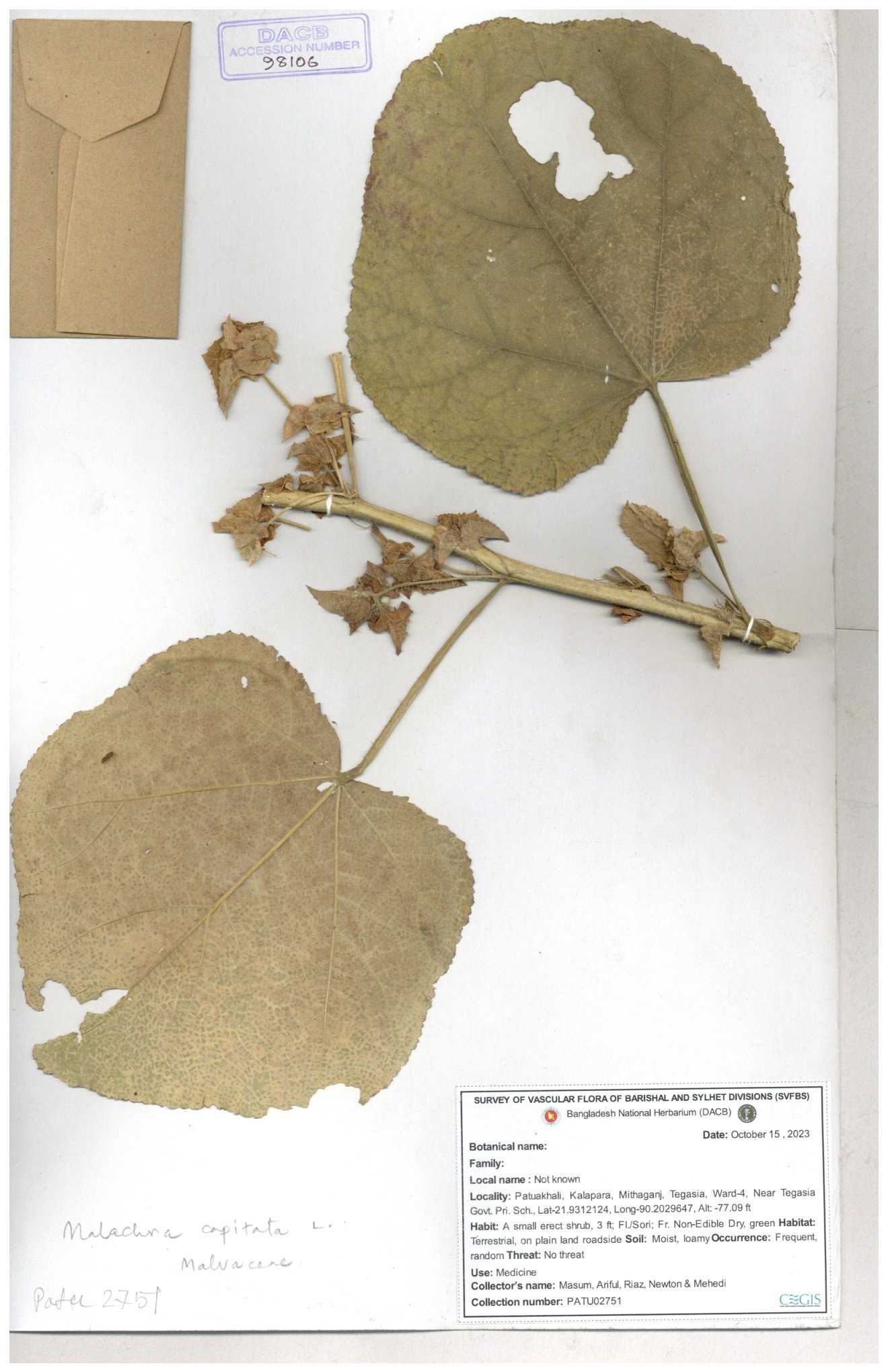 | 65947 | Malvaceae | Urena Urera L. | Khandakar Kamrul Islam | KKI-3982 12-02-2020 |