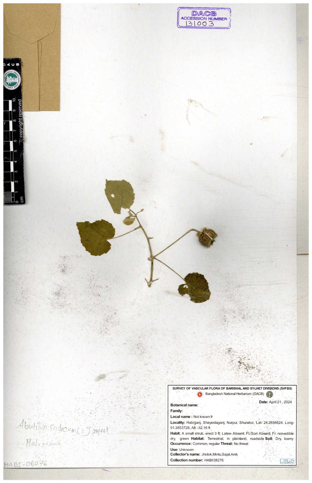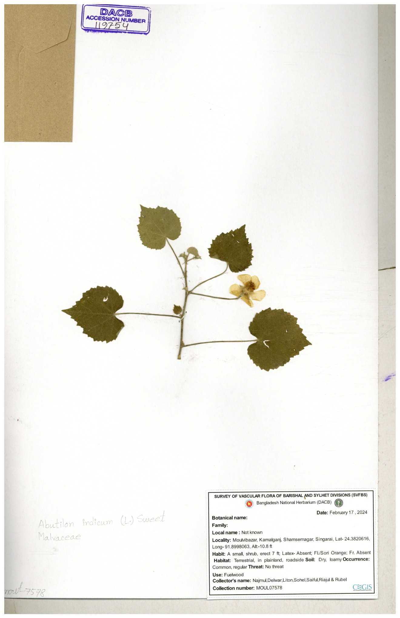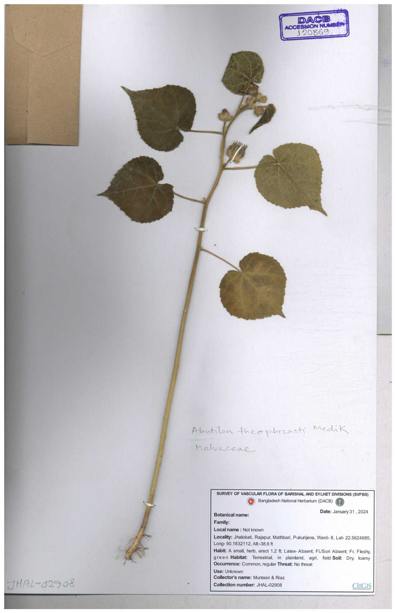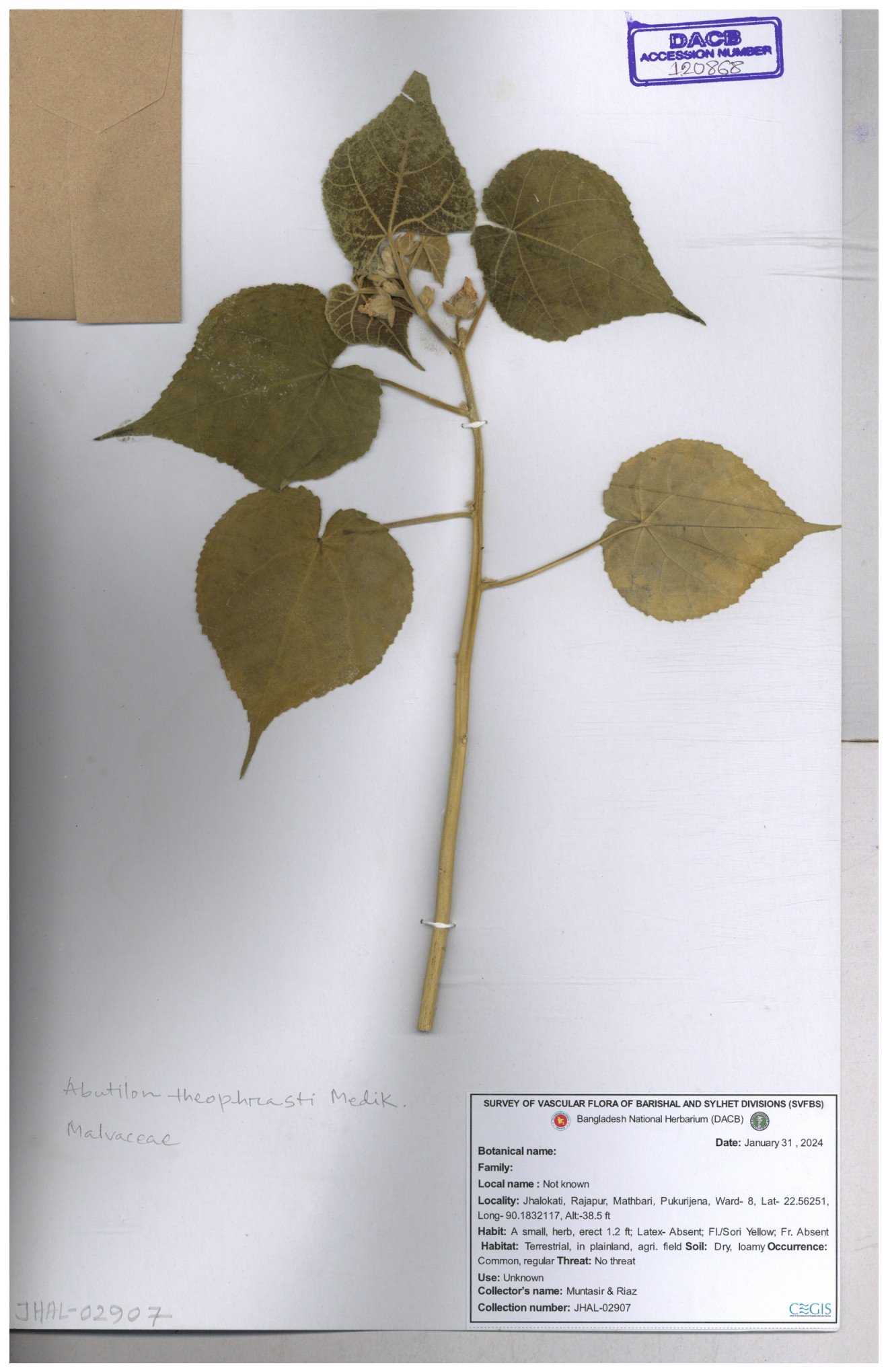| 39941 | Malvaceae | Abutilon theophrasti Medik. | Harun & Rahman | SH- 584 22-08-2001 |