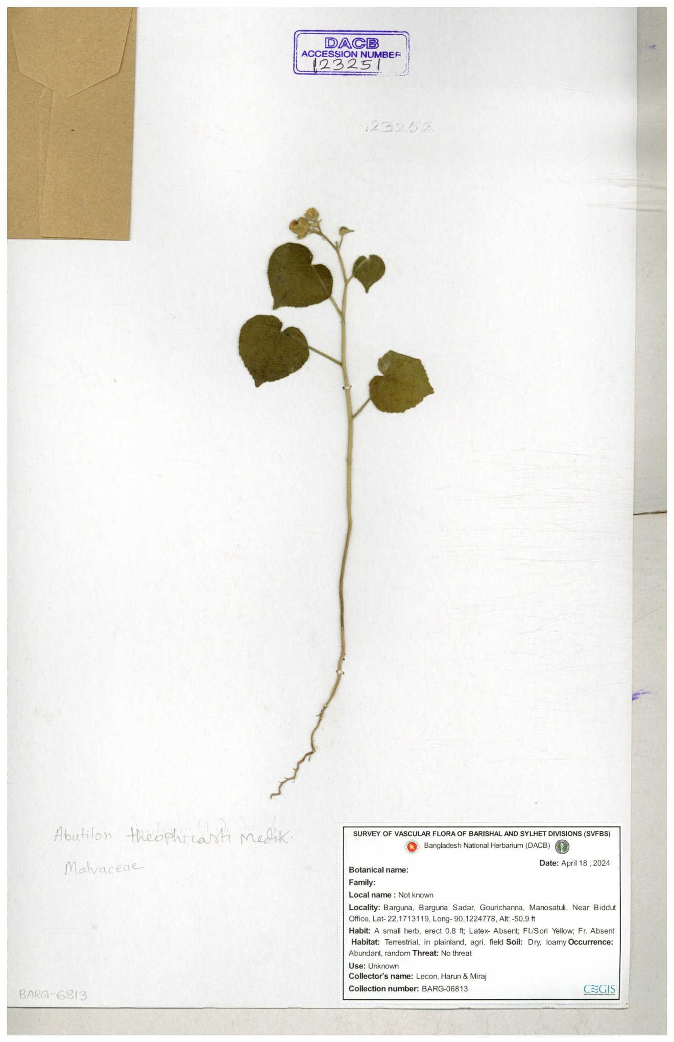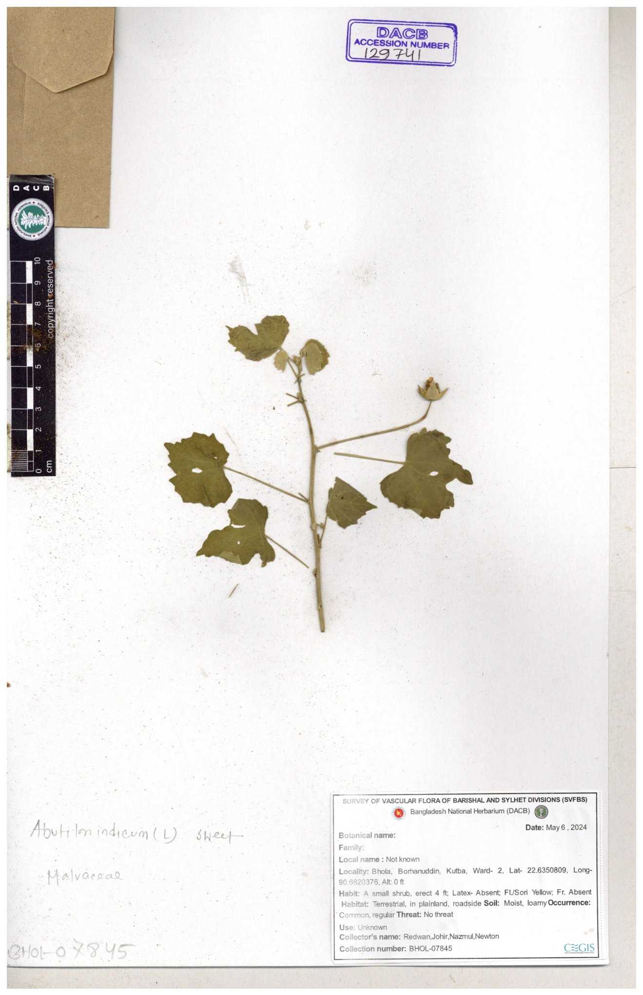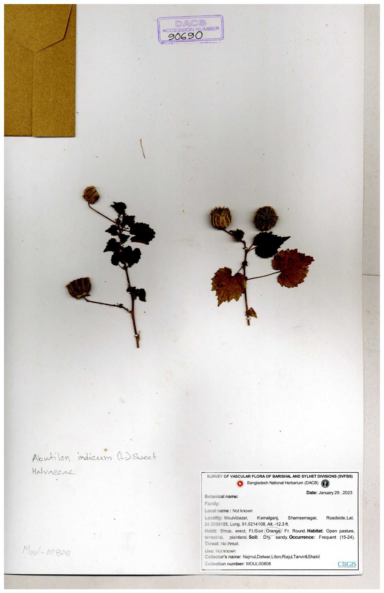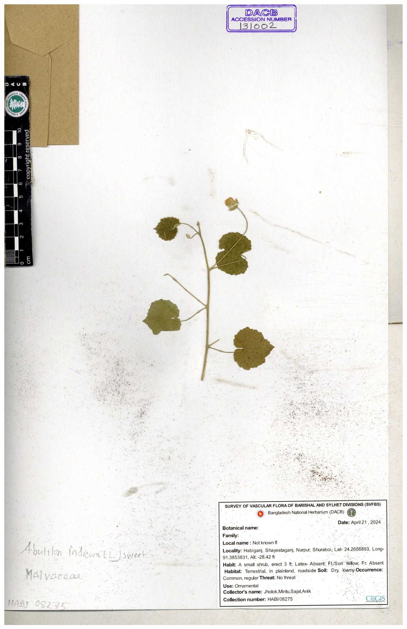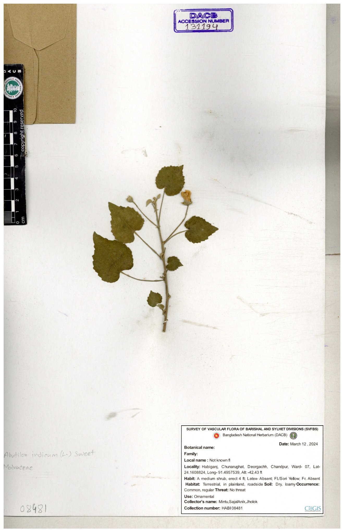 | 39941 | Malvaceae | Abutilon theophrasti Medik. | Harun & Rahman | SH- 584 22-08-2001 |