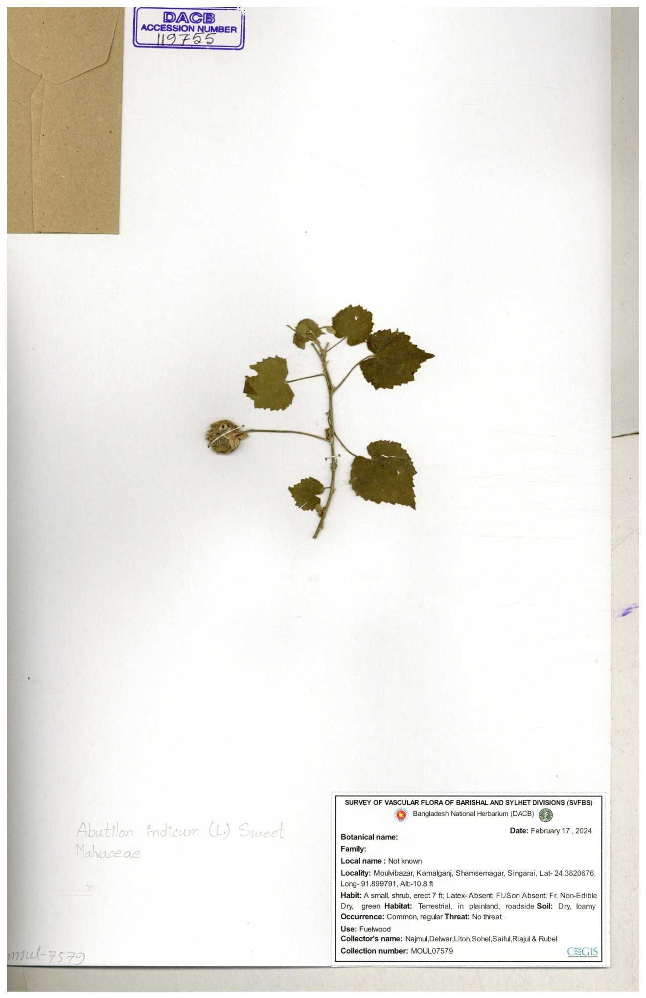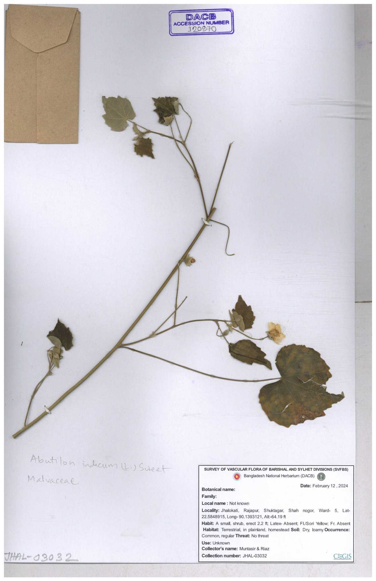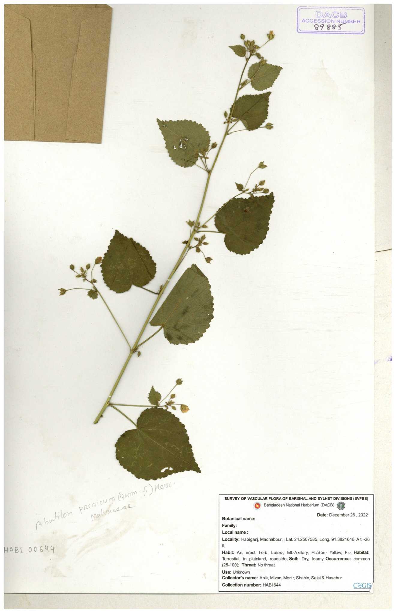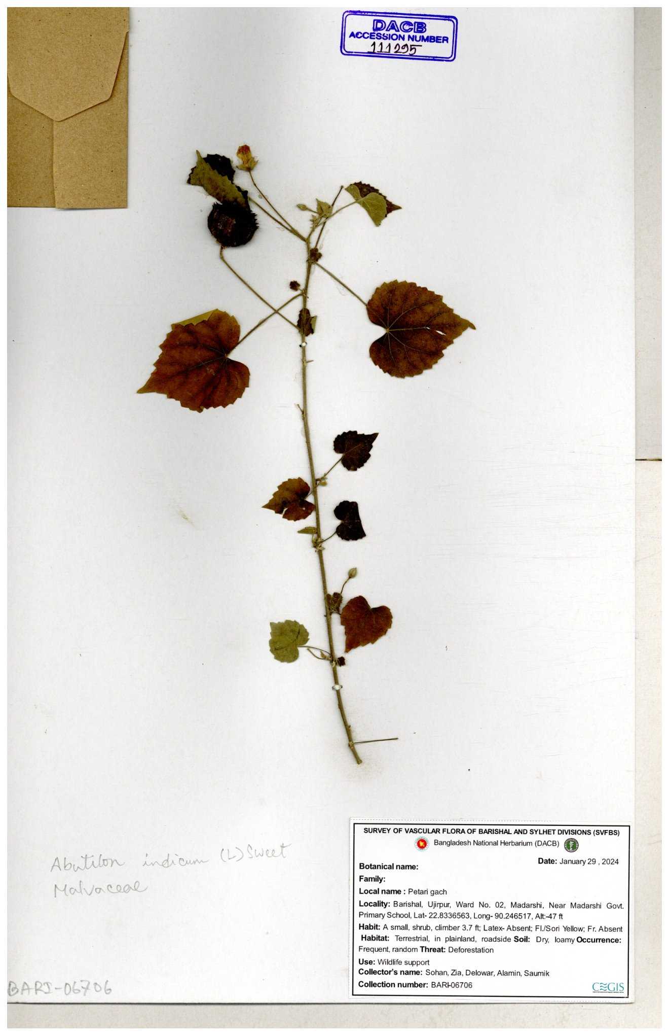 | 39941 | Malvaceae | Abutilon theophrasti Medik. | Harun & Rahman | SH- 584 22-08-2001 |