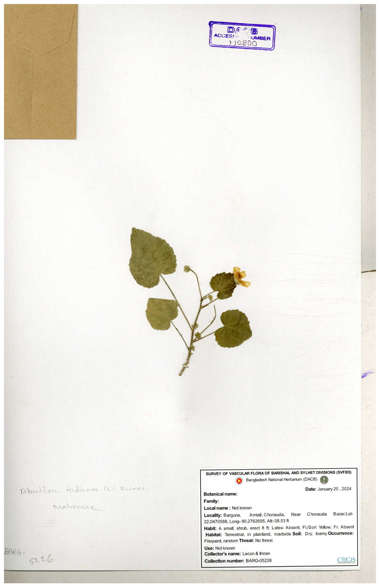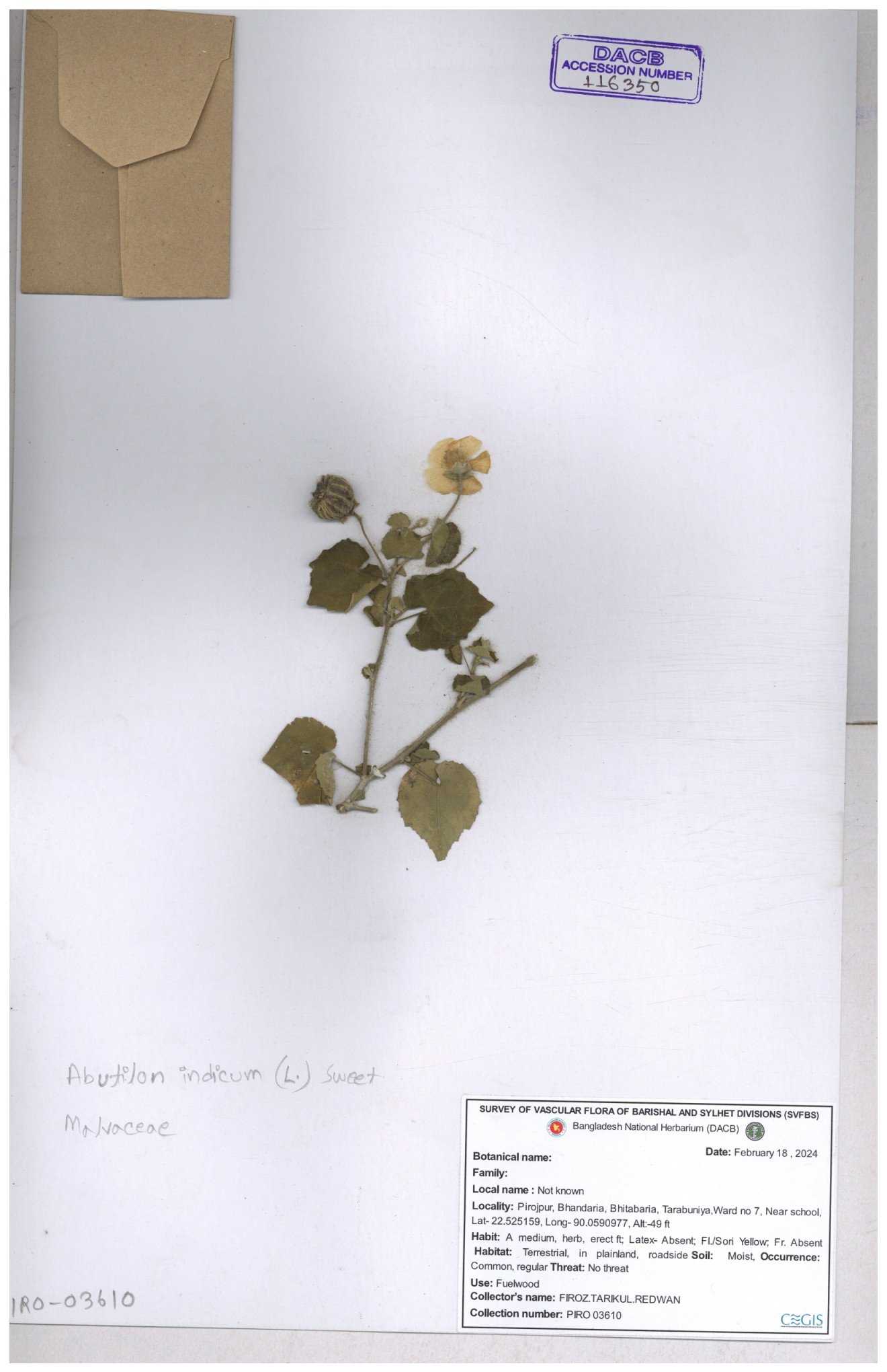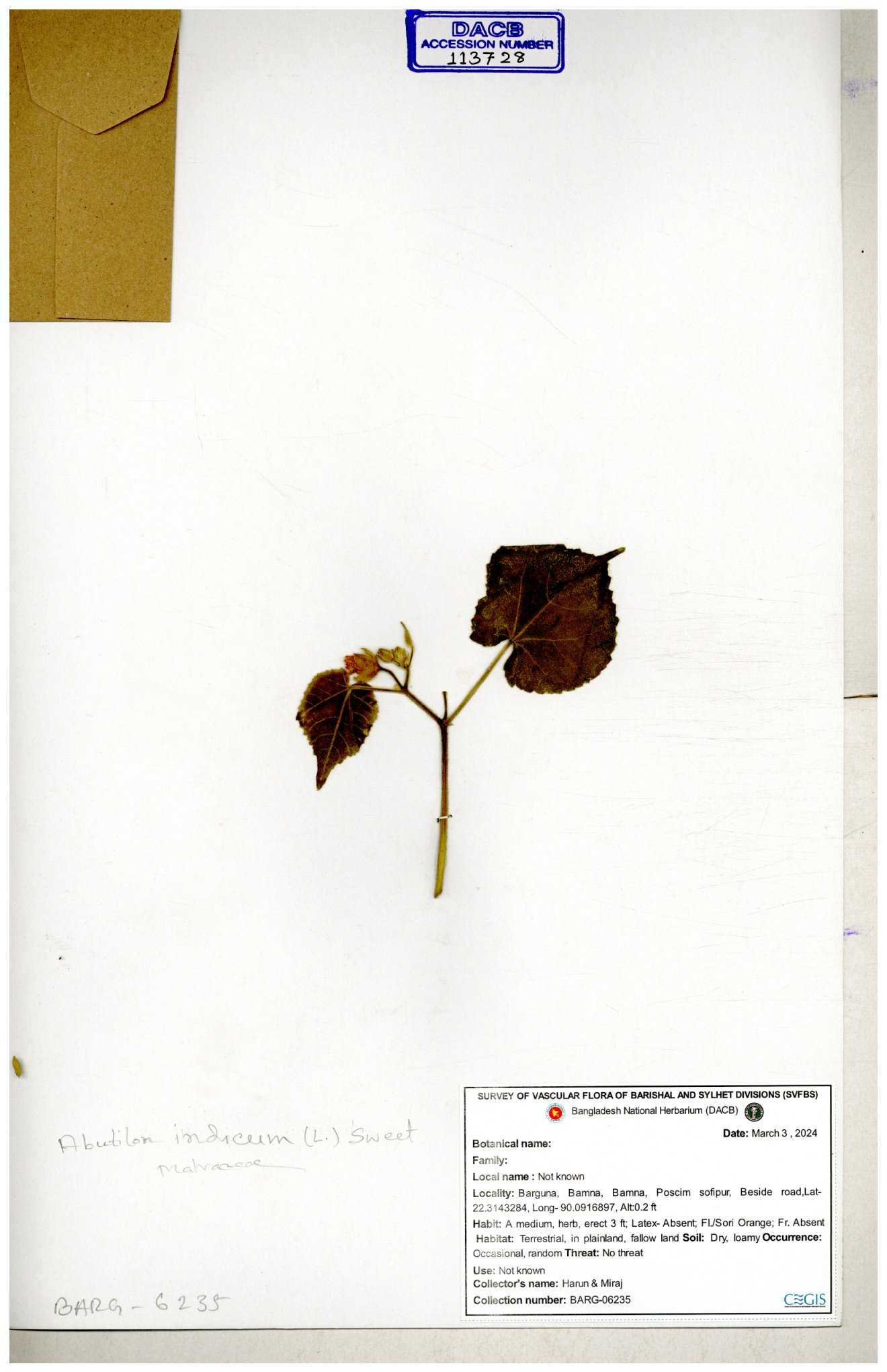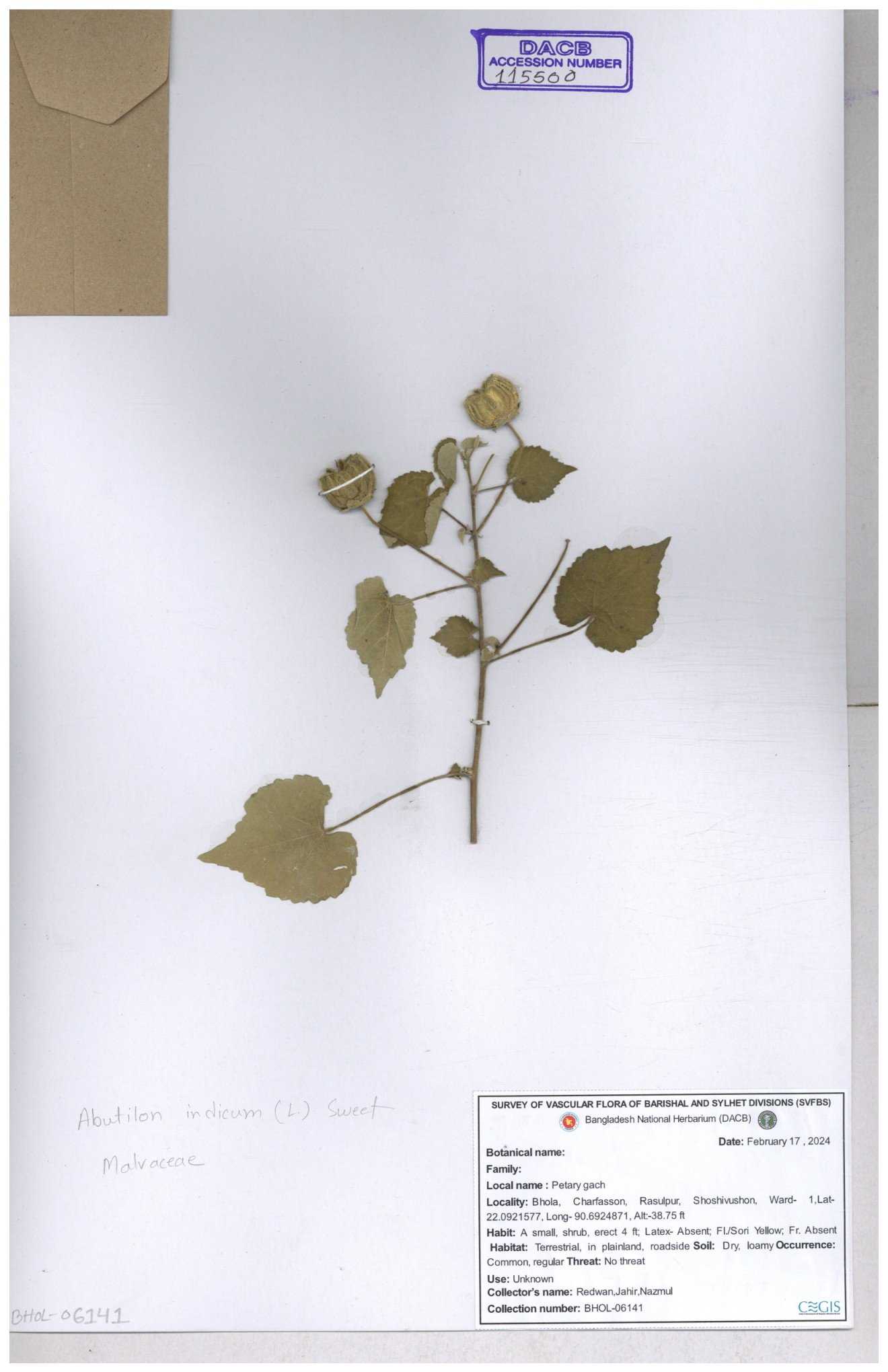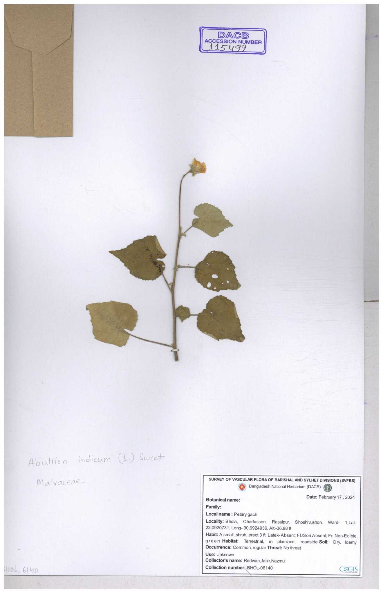 | 39941 | Malvaceae | Abutilon theophrasti Medik. | Harun & Rahman | SH- 584 22-08-2001 |