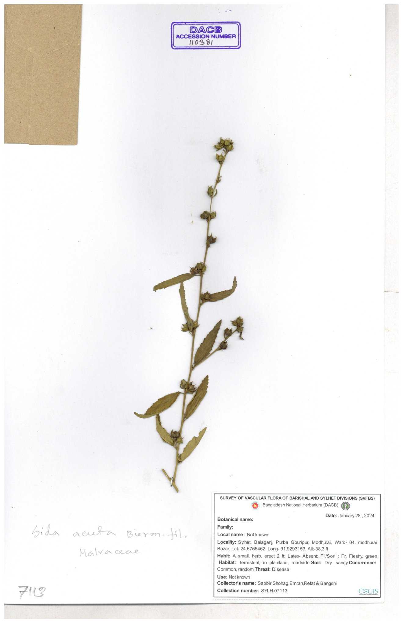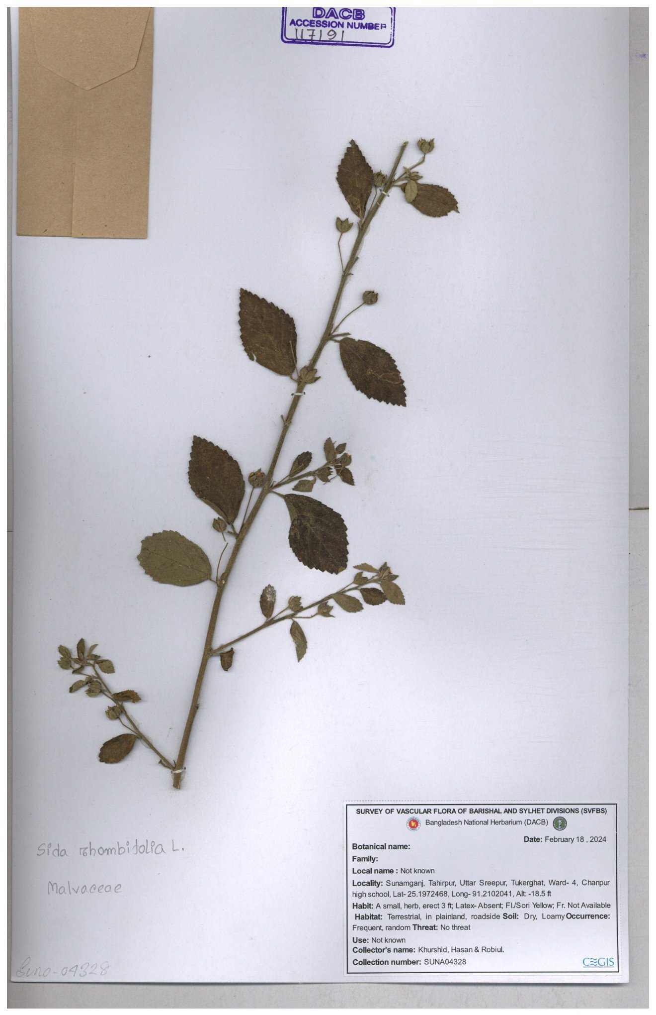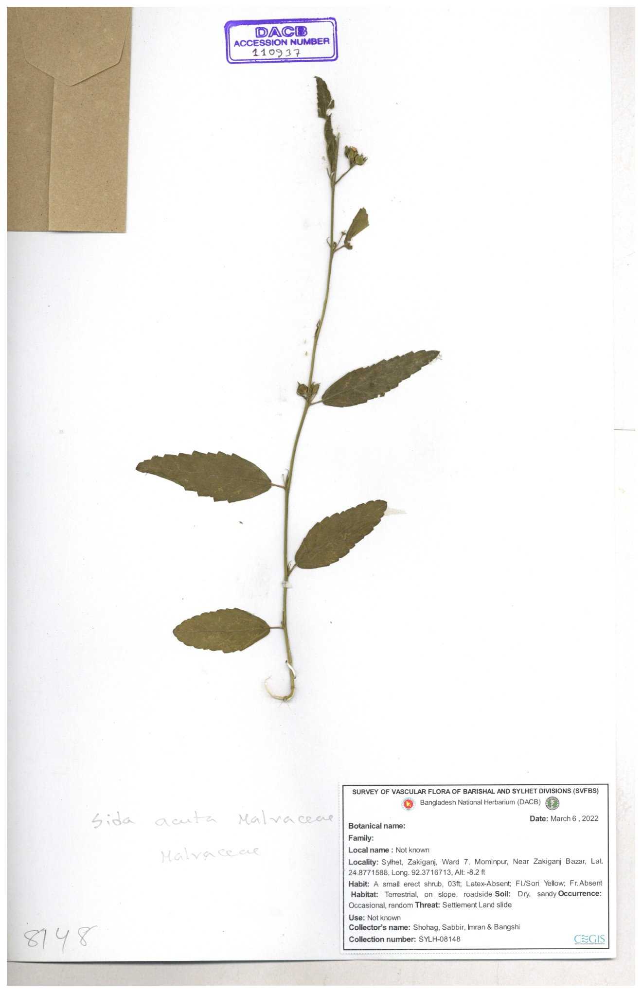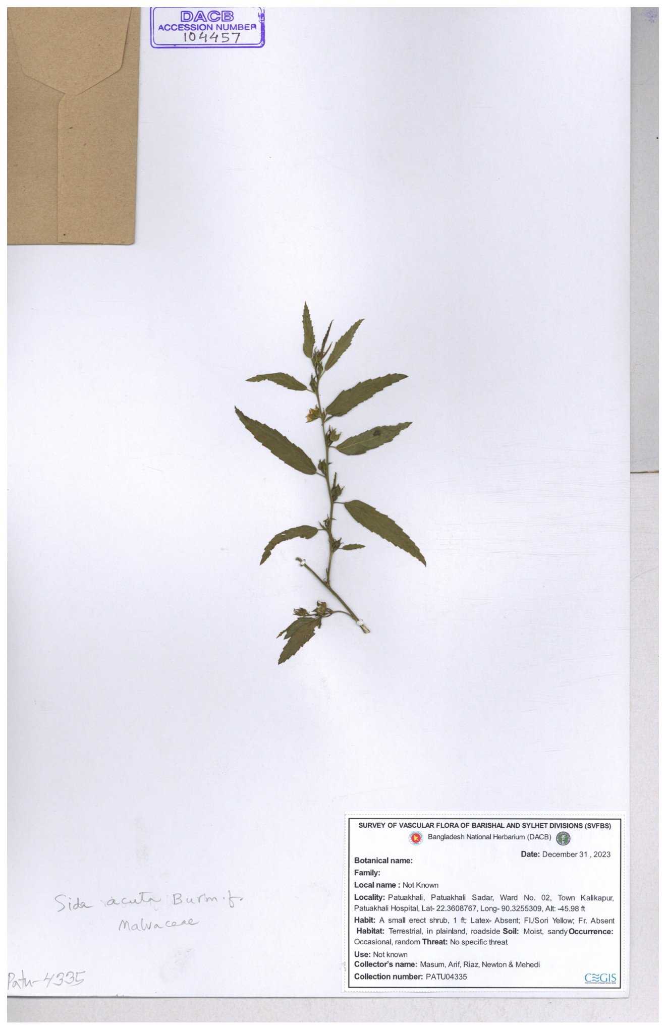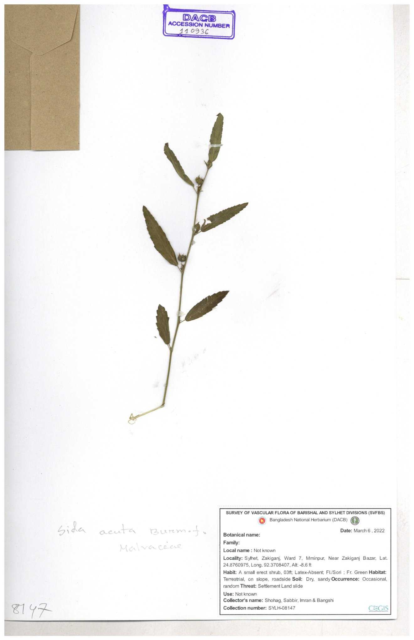 | 65982 | Malvaceae | Sida acuta Burm.f. | Berala | Khandakar Kamrul Islam | KKI-4066 (a) 12-03-2020 |