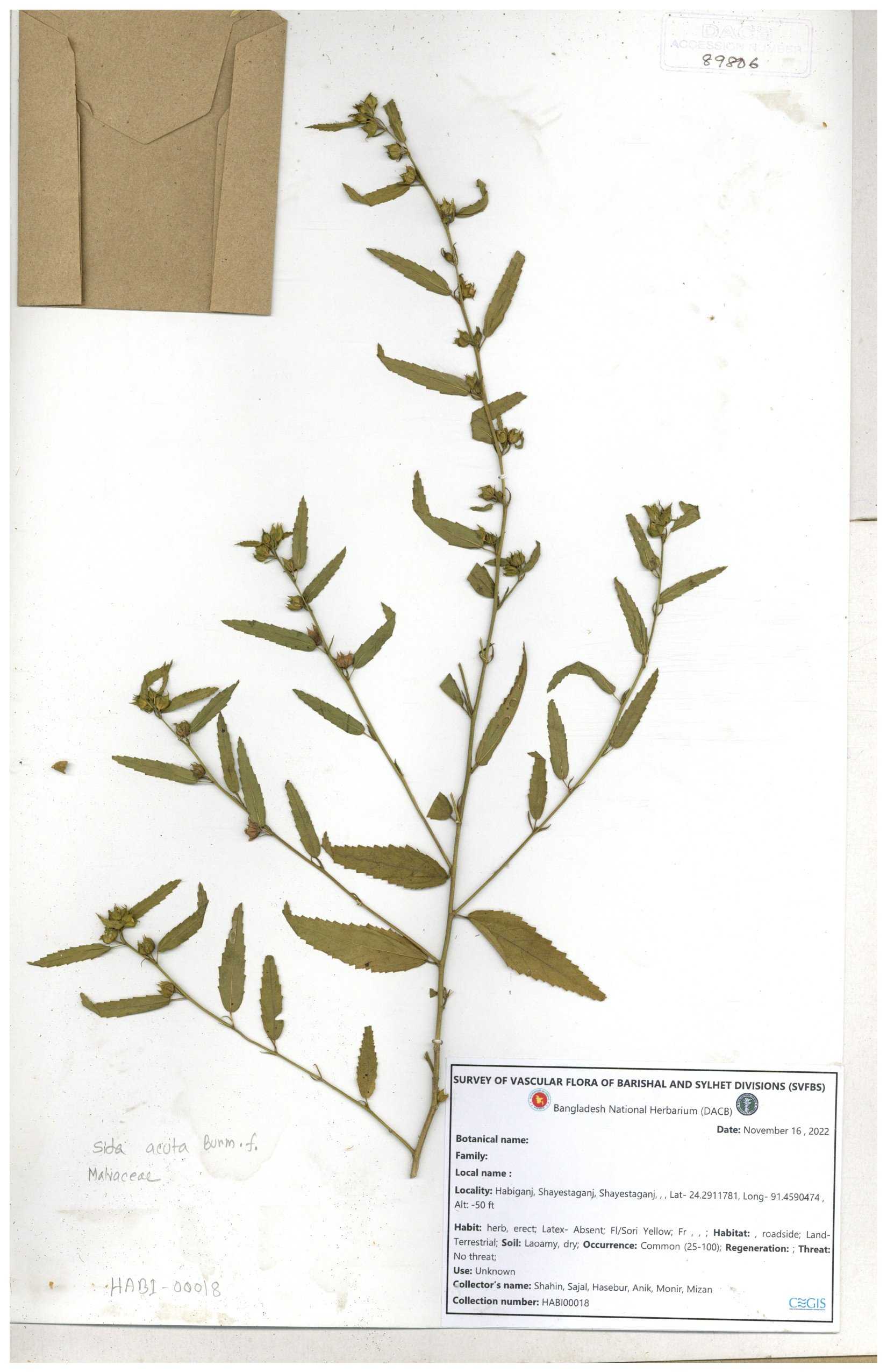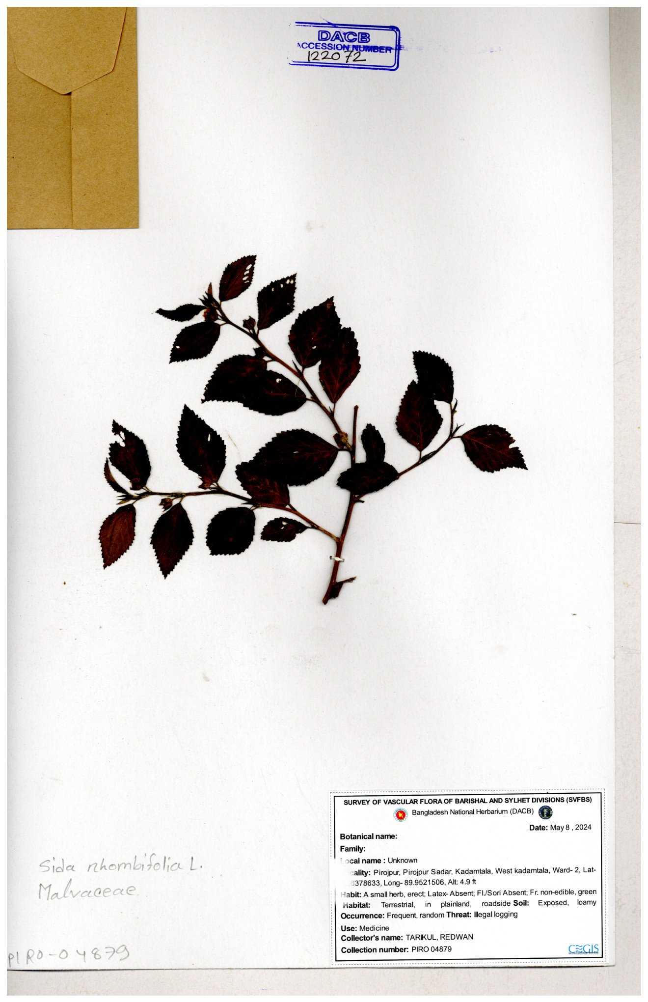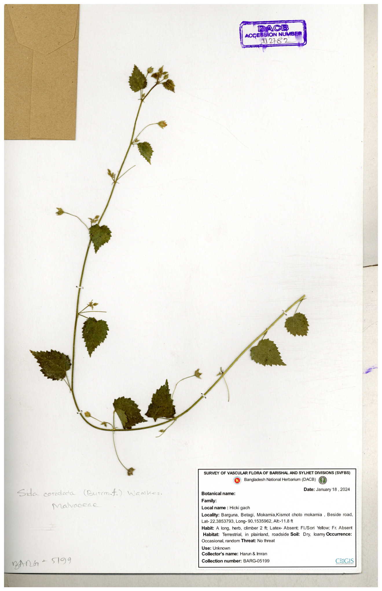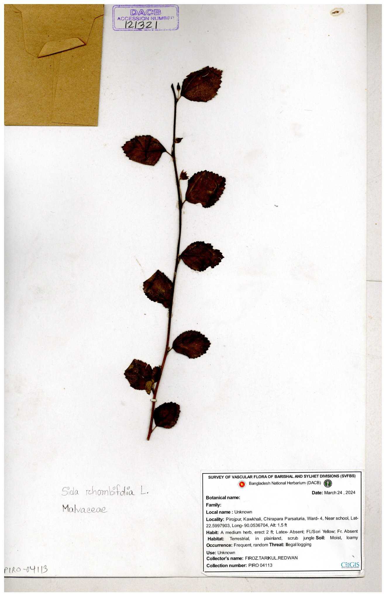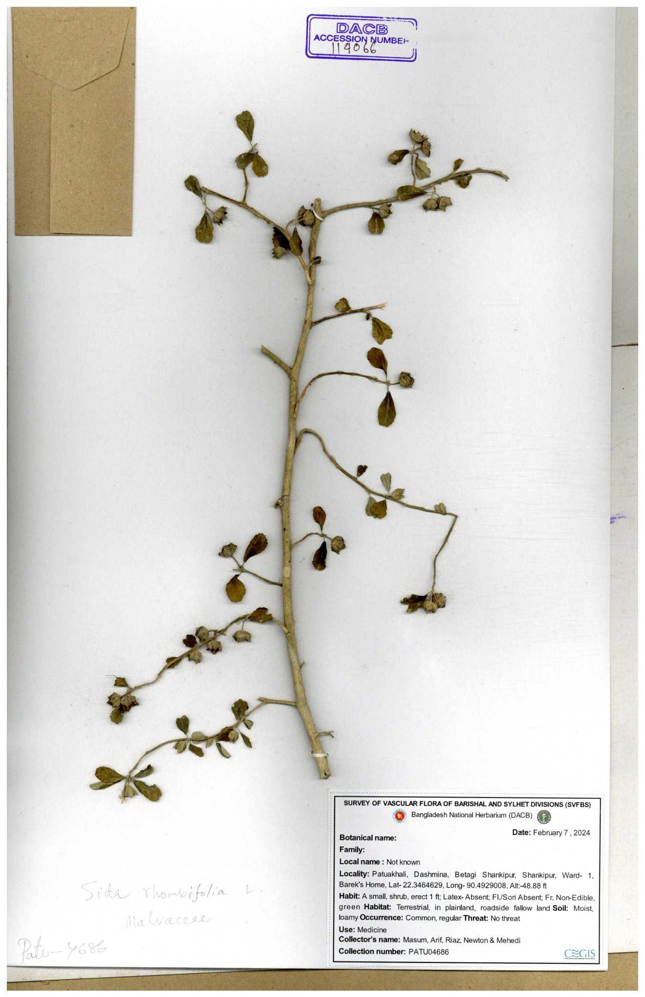 | 65982 | Malvaceae | Sida acuta Burm.f. | Berala | Khandakar Kamrul Islam | KKI-4066 (a) 12-03-2020 |