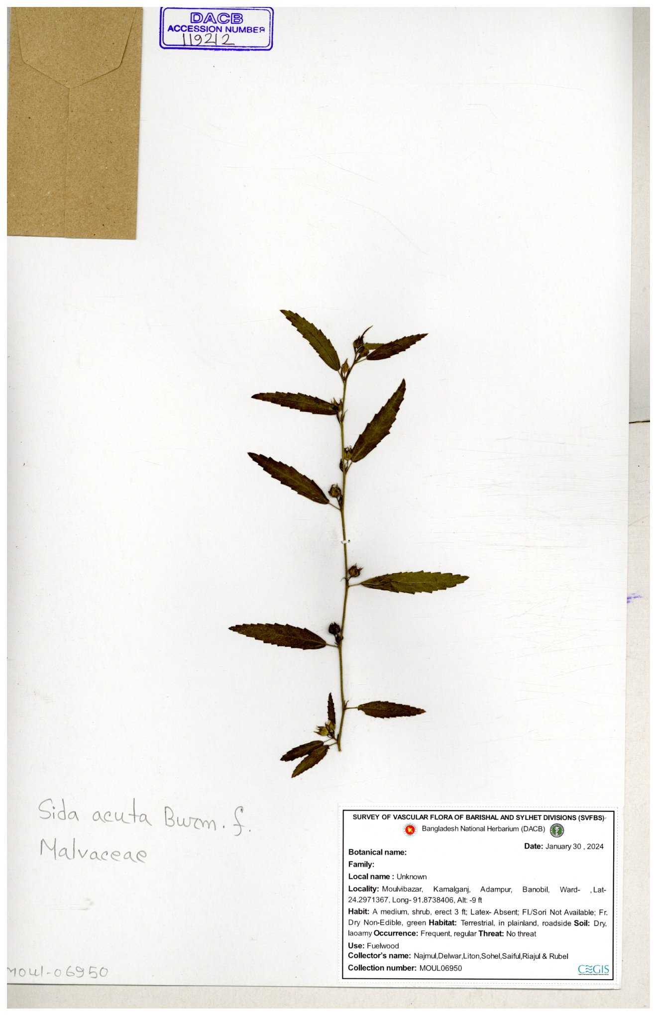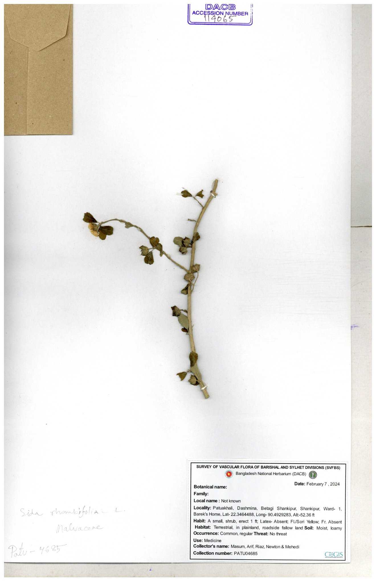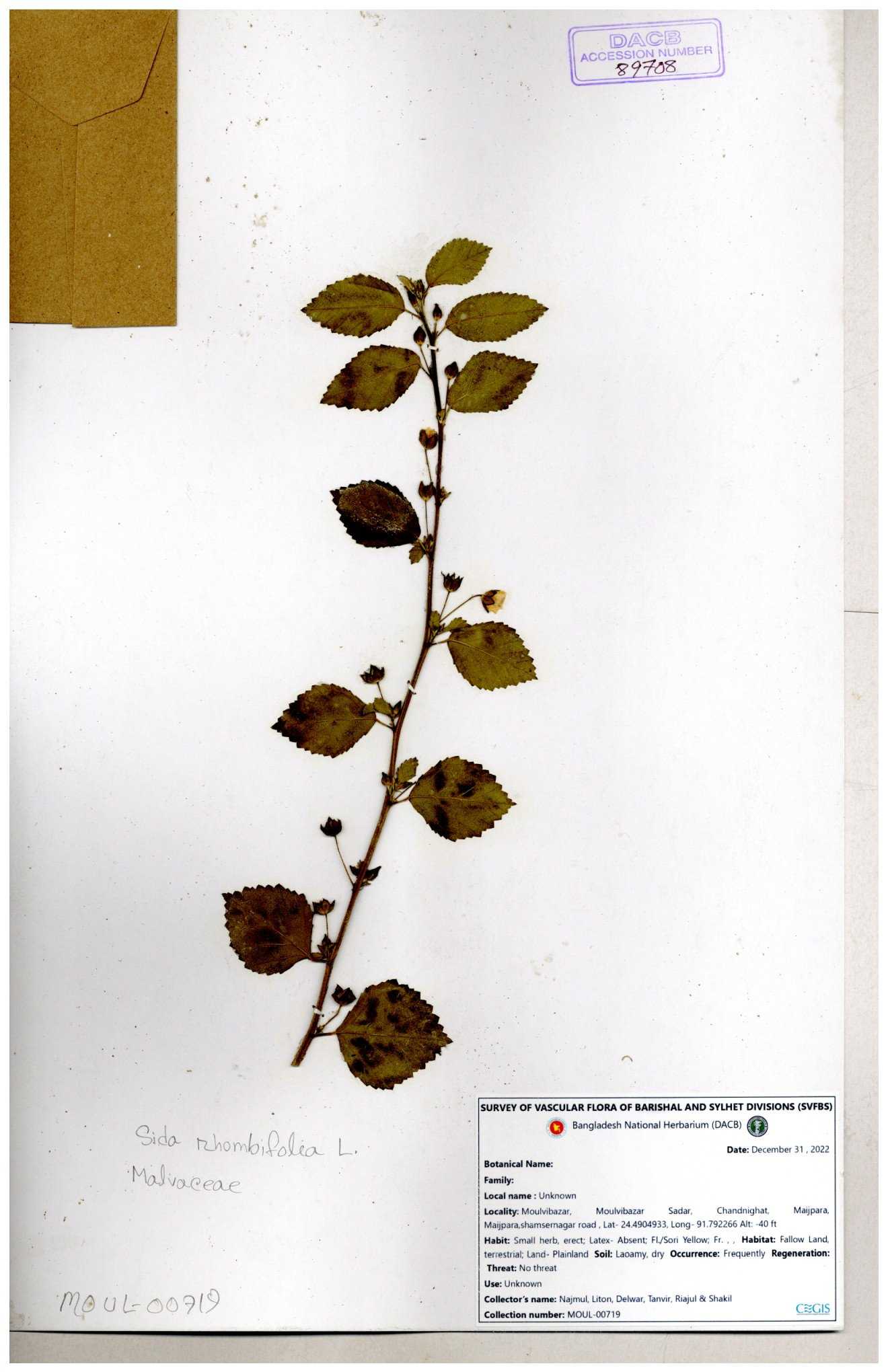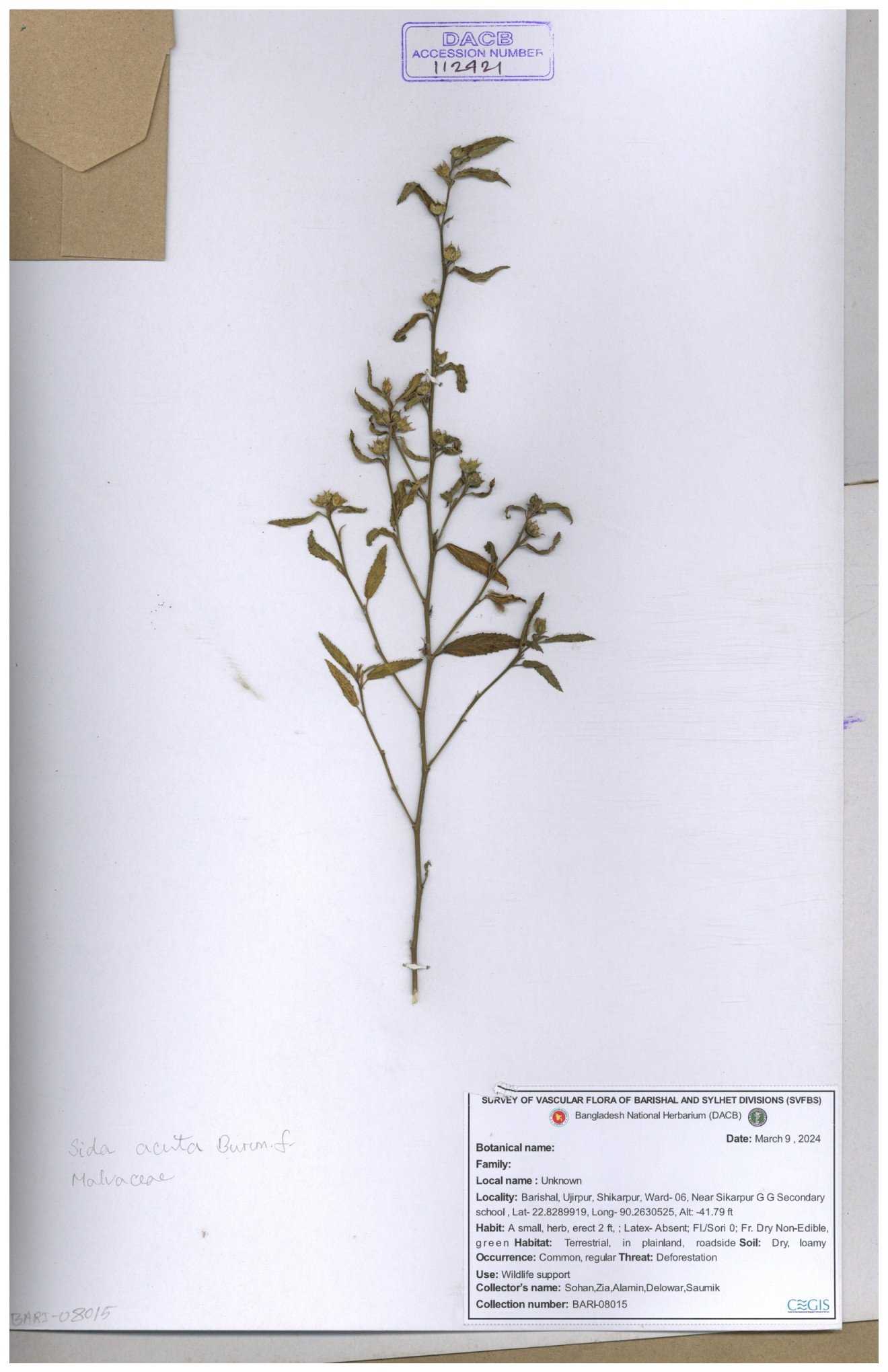 | 65982 | Malvaceae | Sida acuta Burm.f. | Berala | Khandakar Kamrul Islam | KKI-4066 (a) 12-03-2020 |