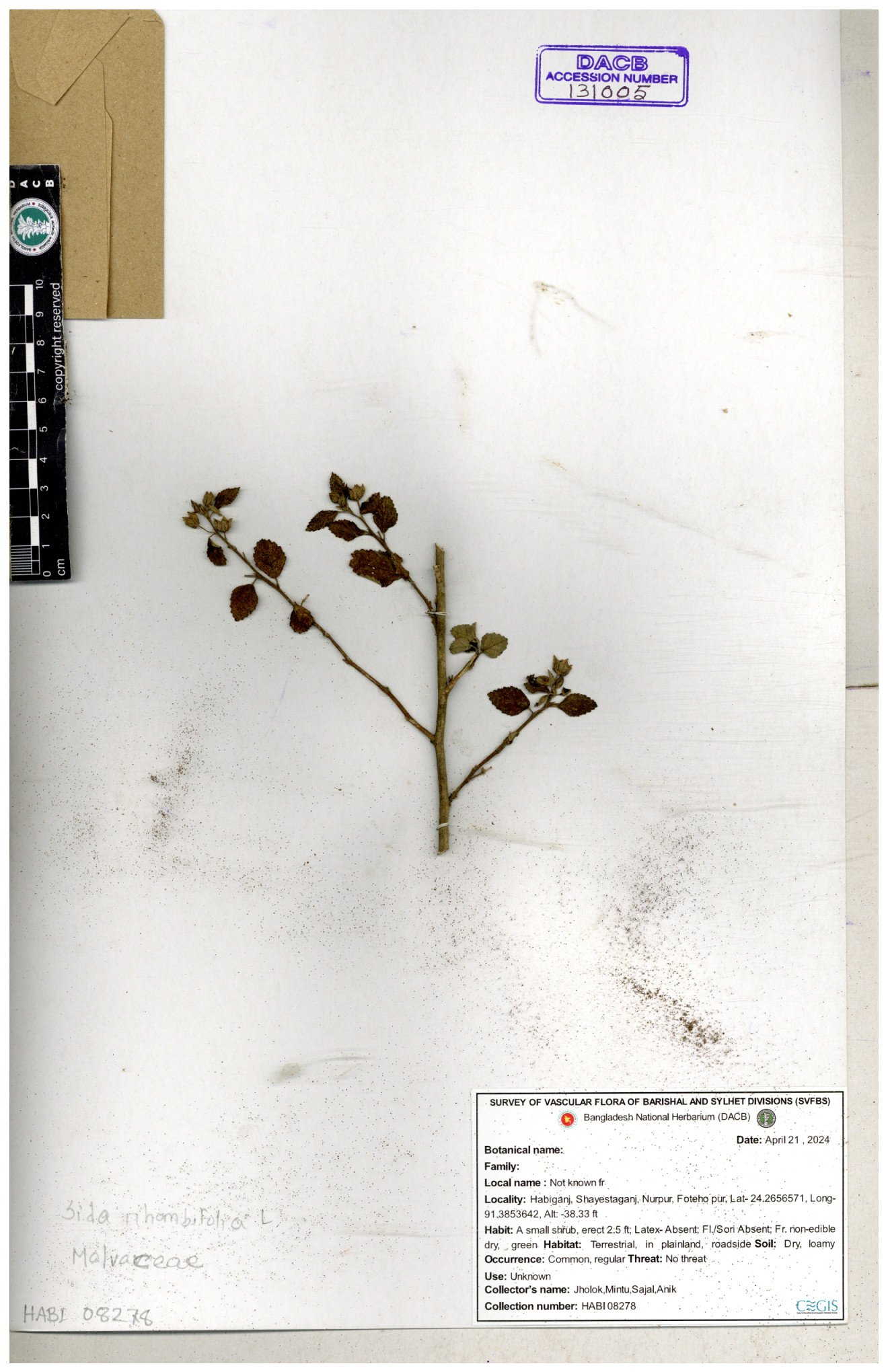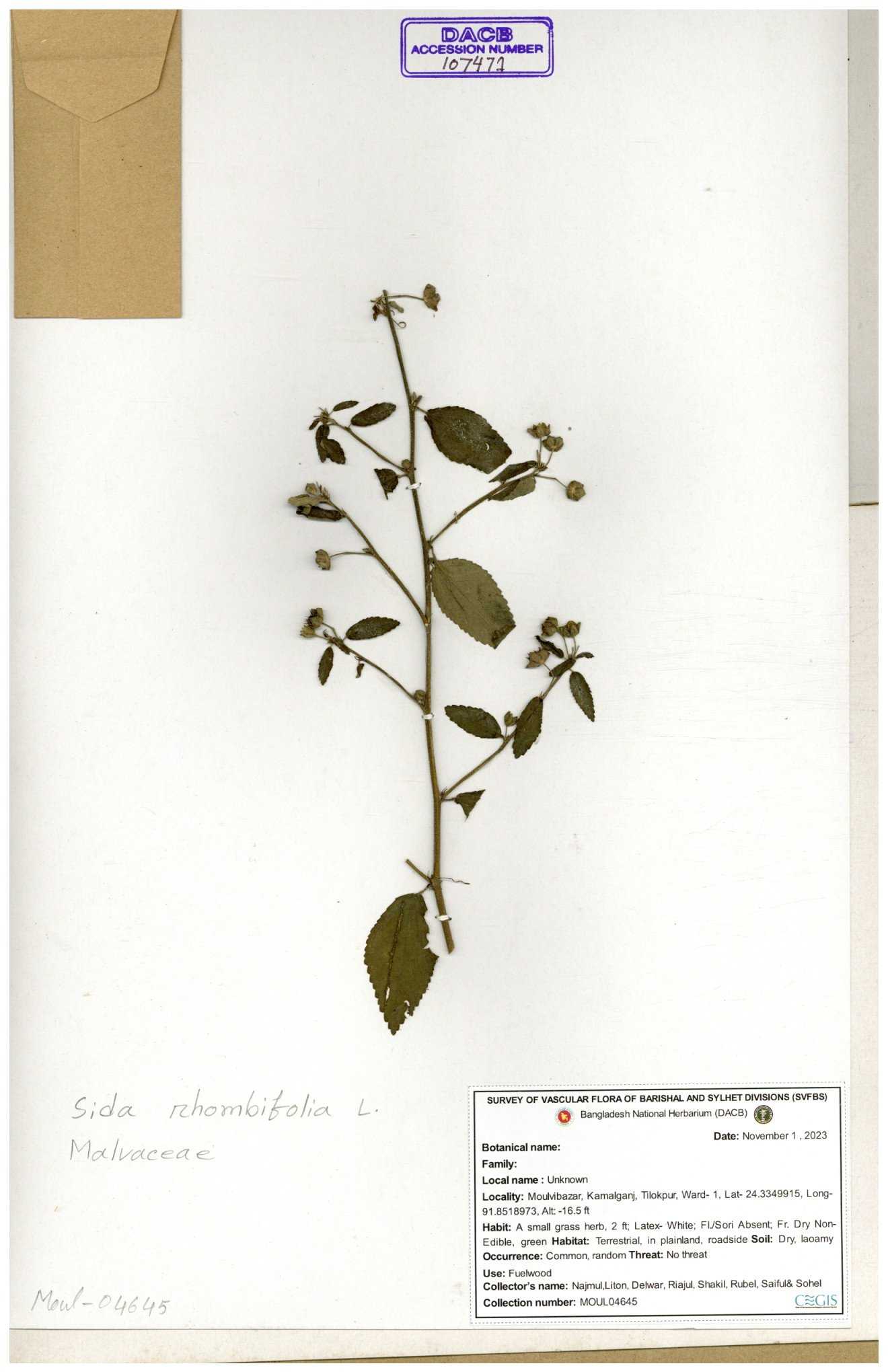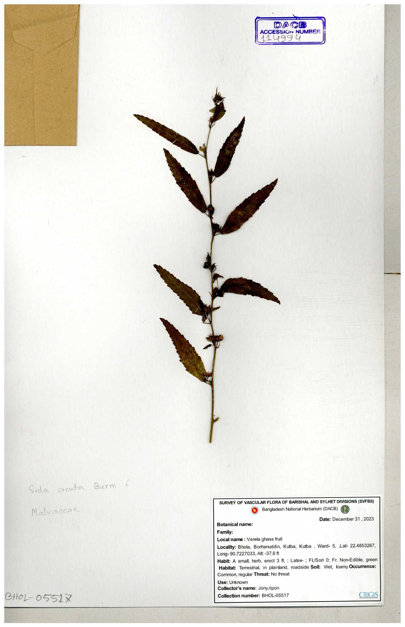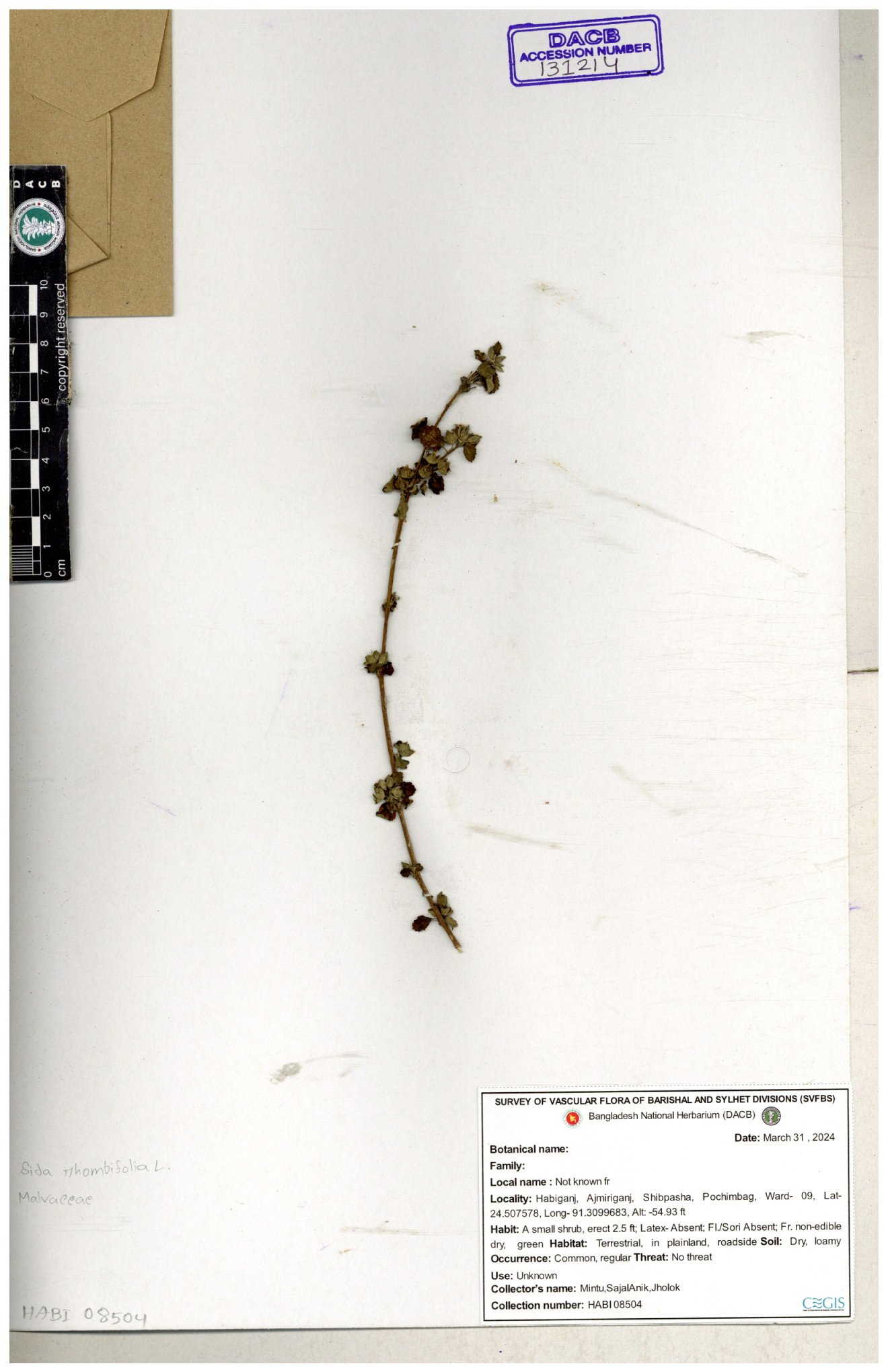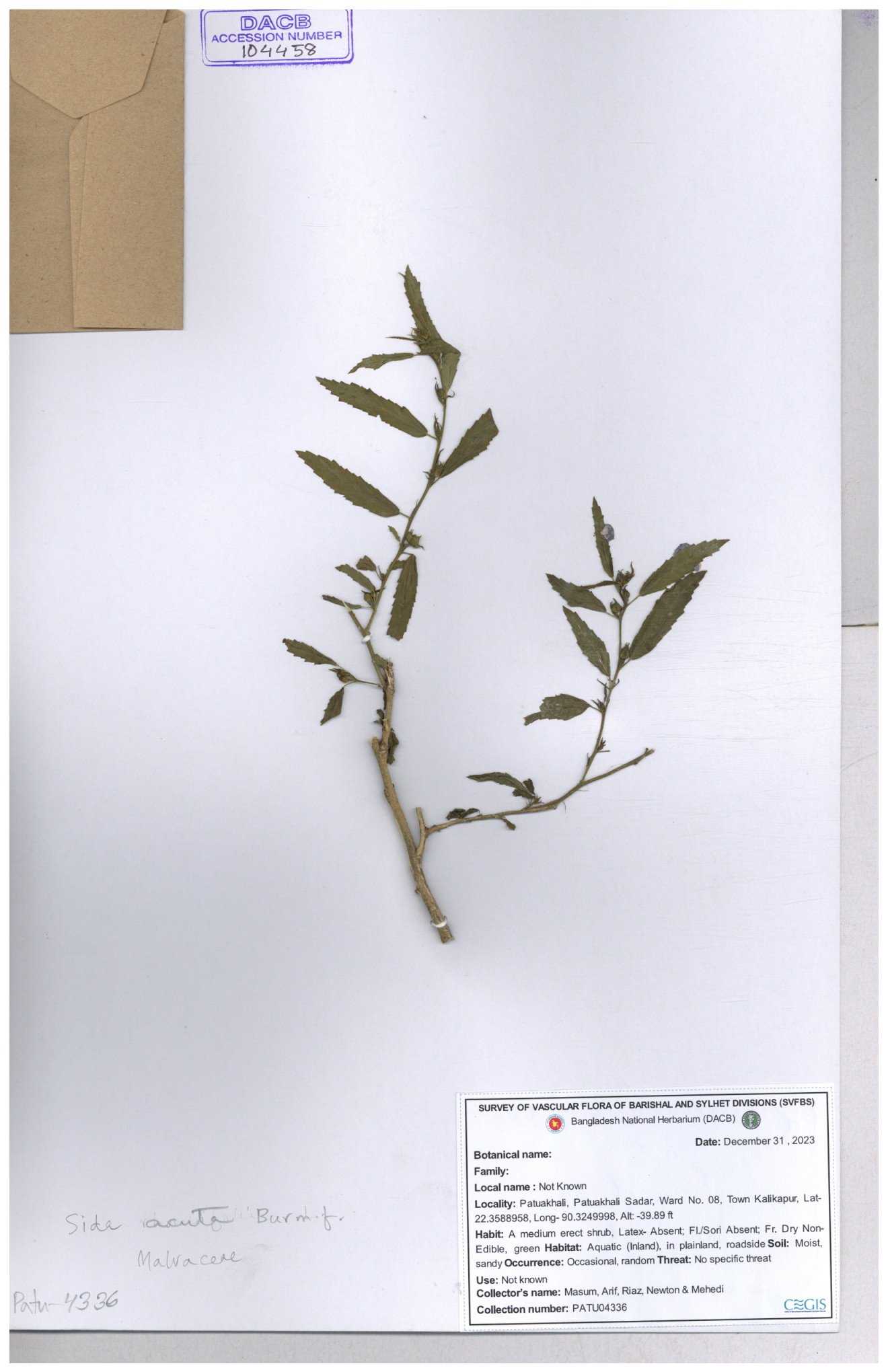 | 65982 | Malvaceae | Sida acuta Burm.f. | Berala | Khandakar Kamrul Islam | KKI-4066 (a) 12-03-2020 |