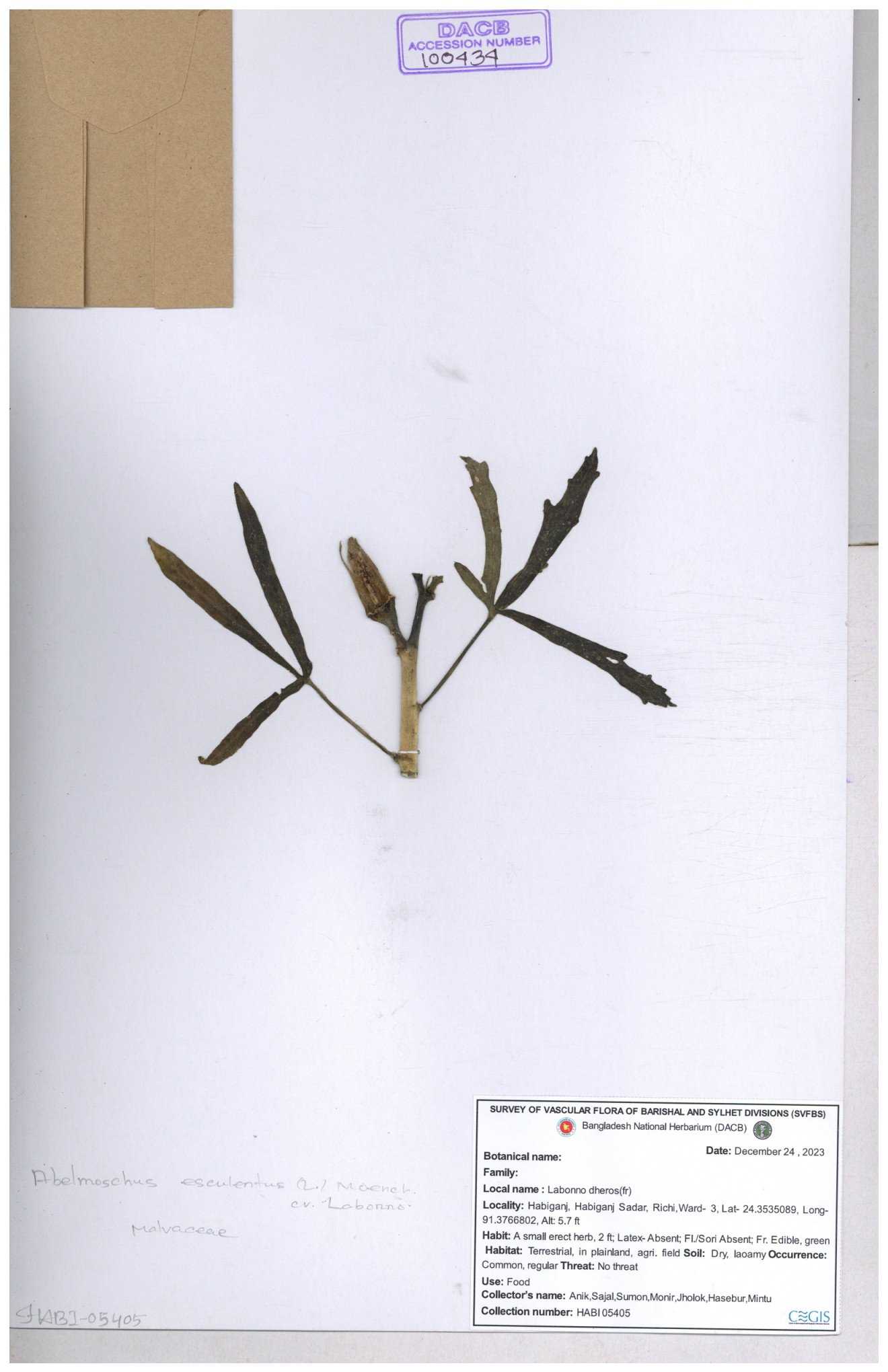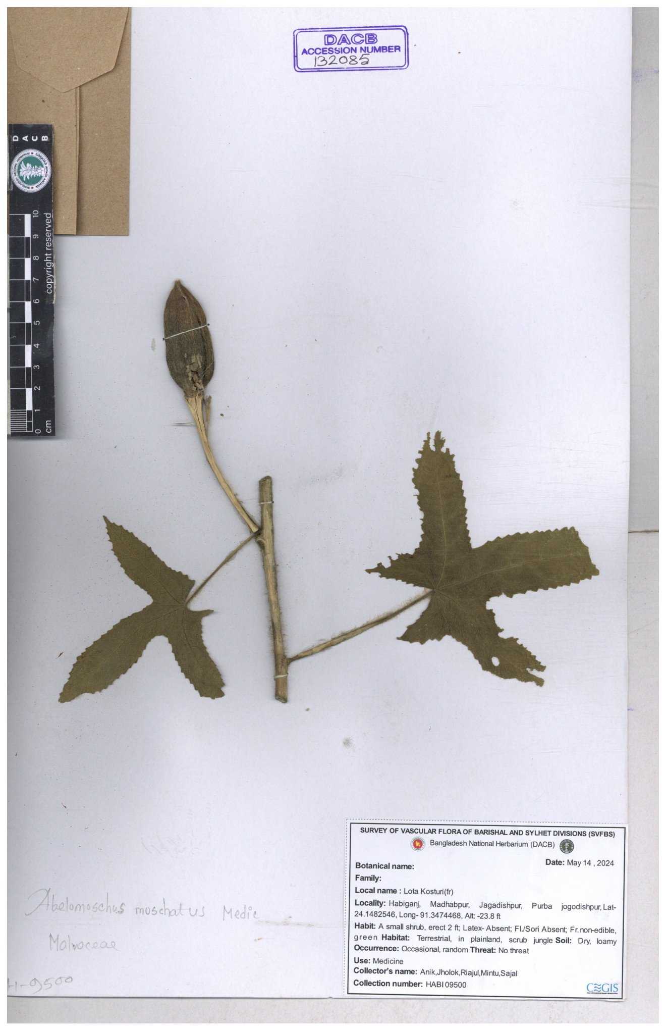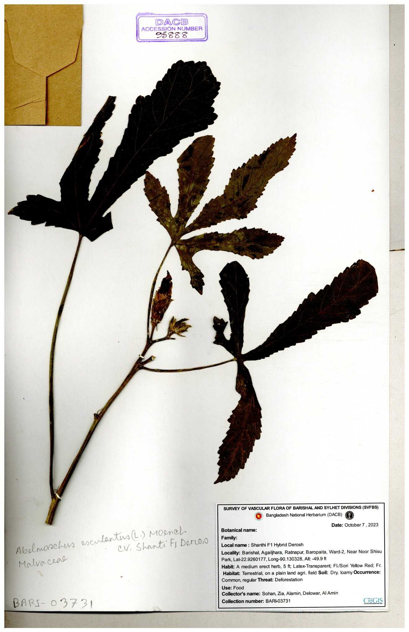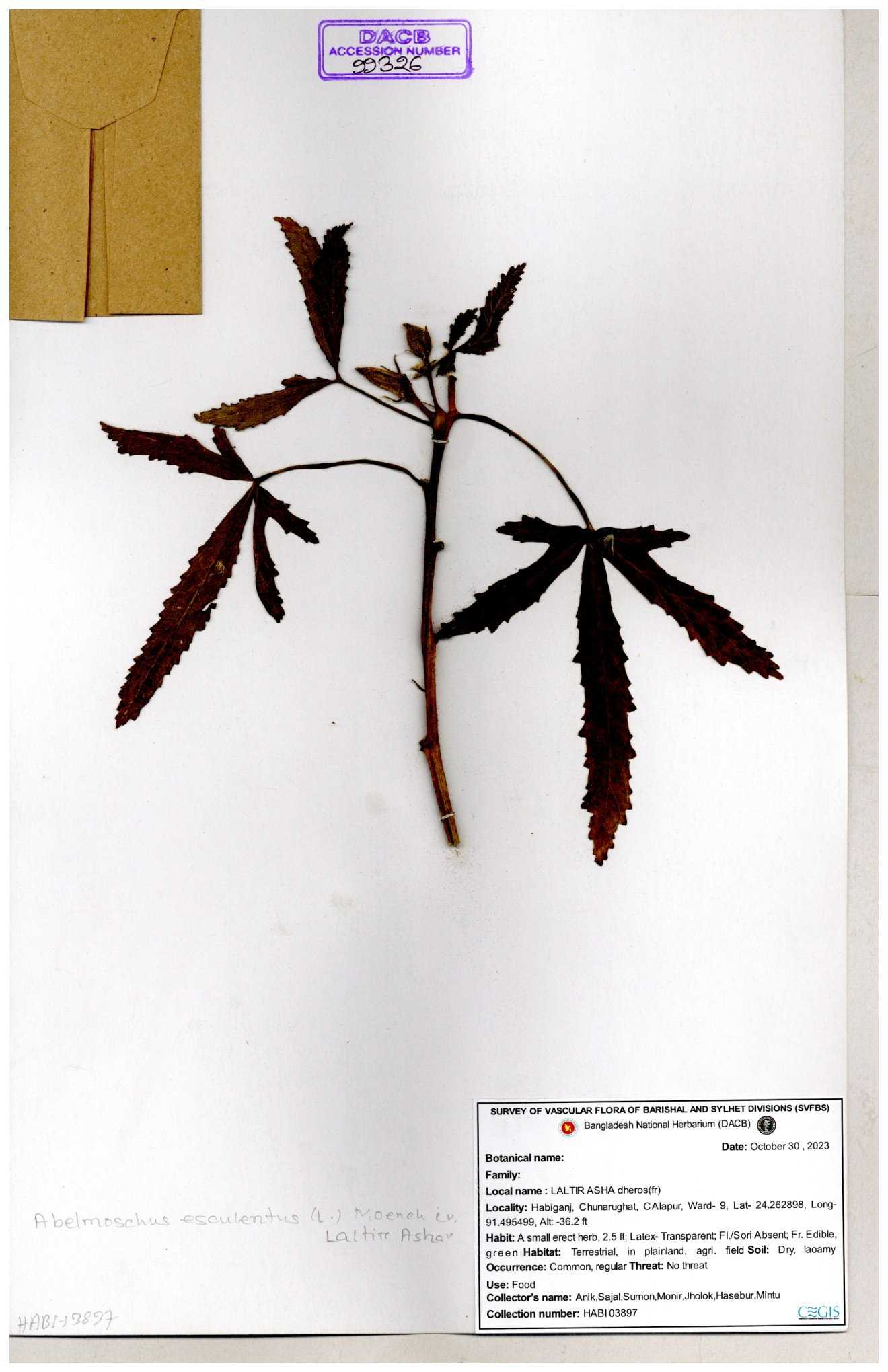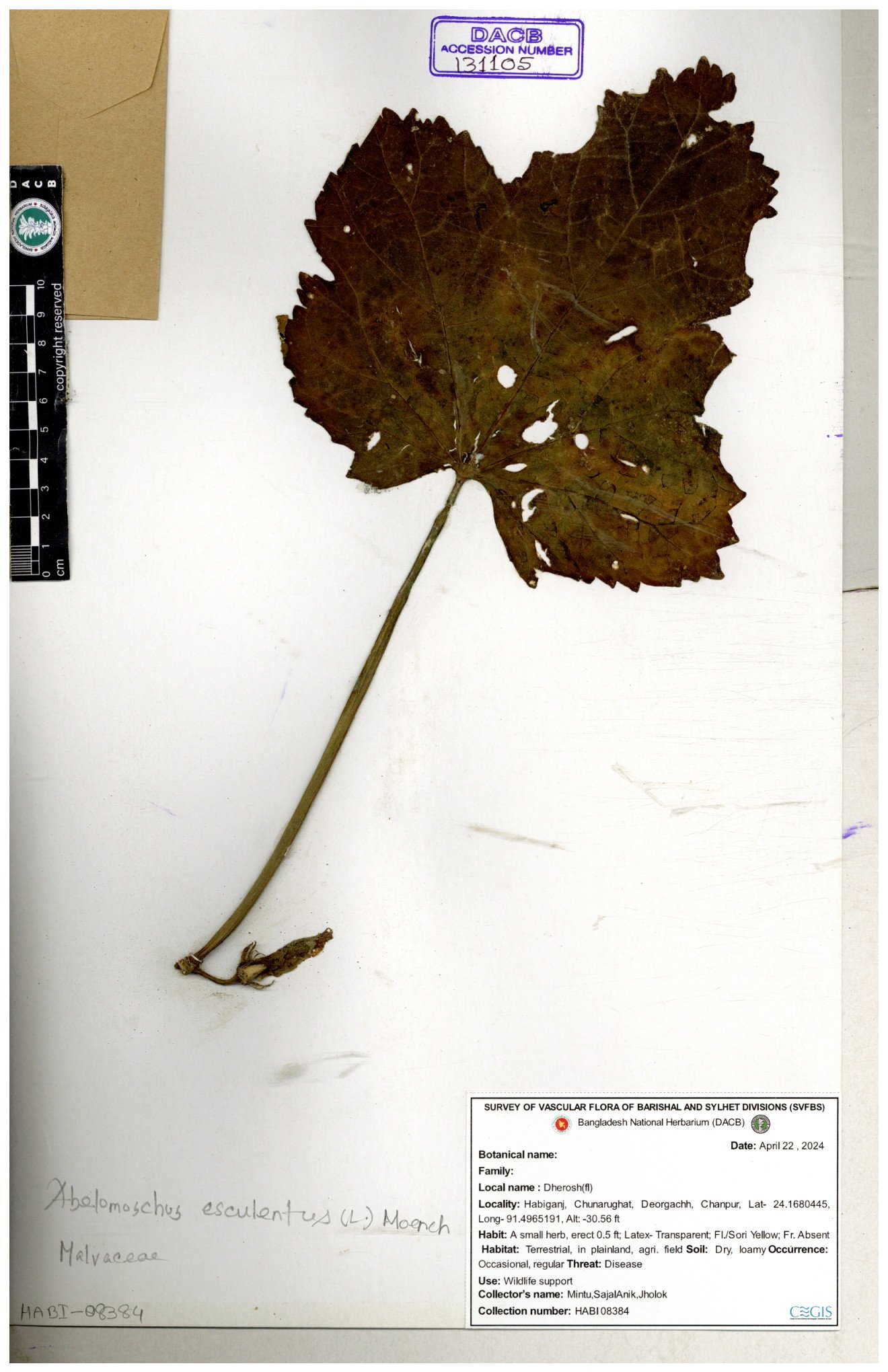 | 70337 | Malvaceae | Abelmoschus moschatus Medik. | I Hossen, MS Islam, MKR Rahman & MR Miah | IH- 3184 12-01-2017 |