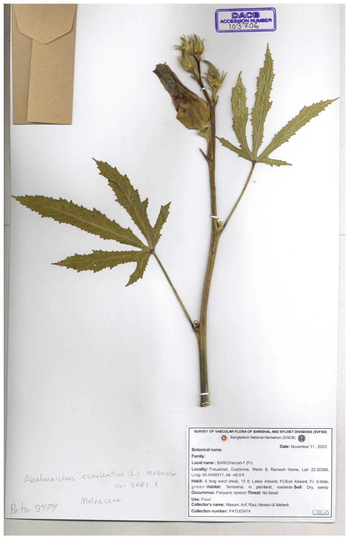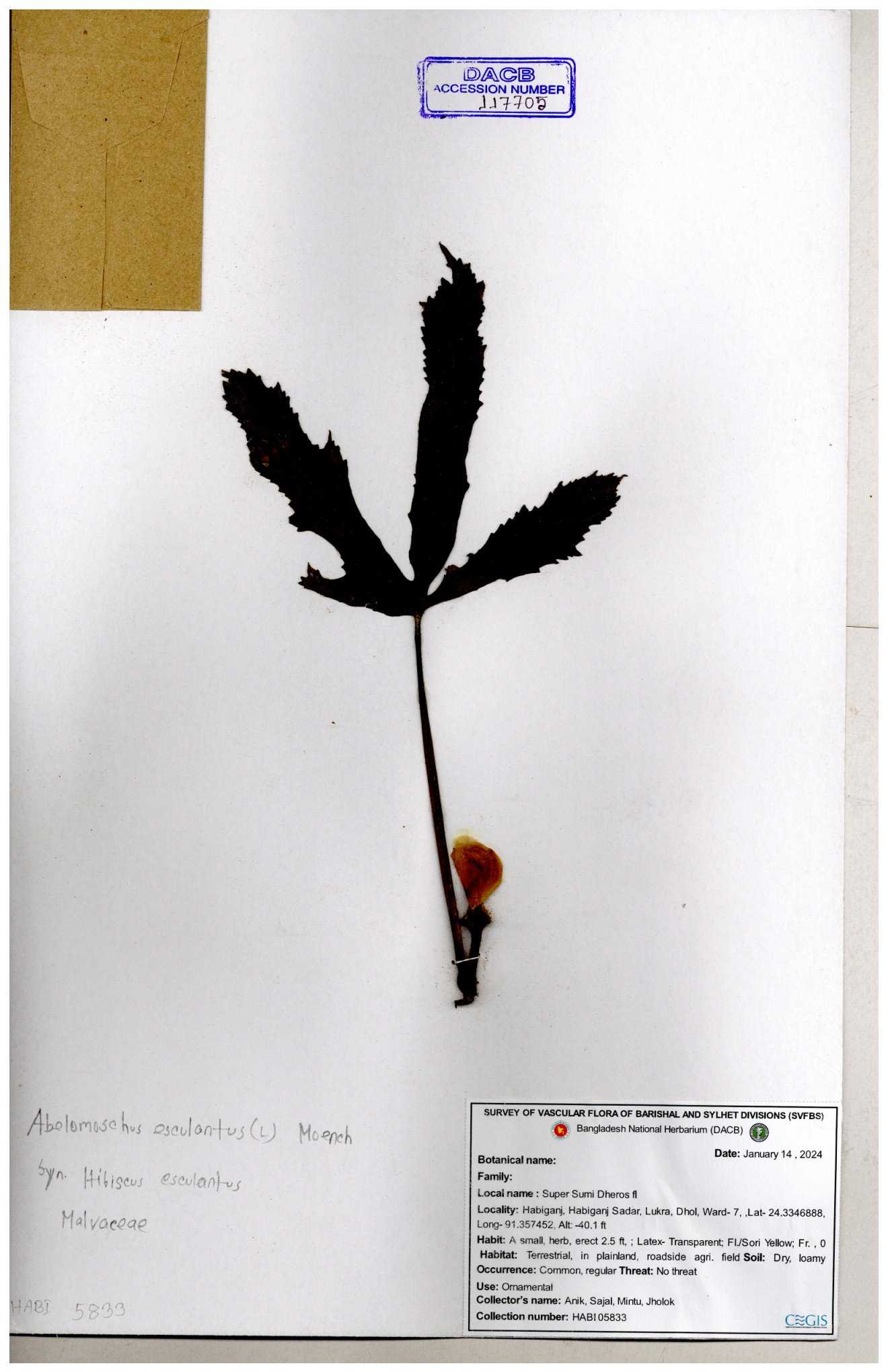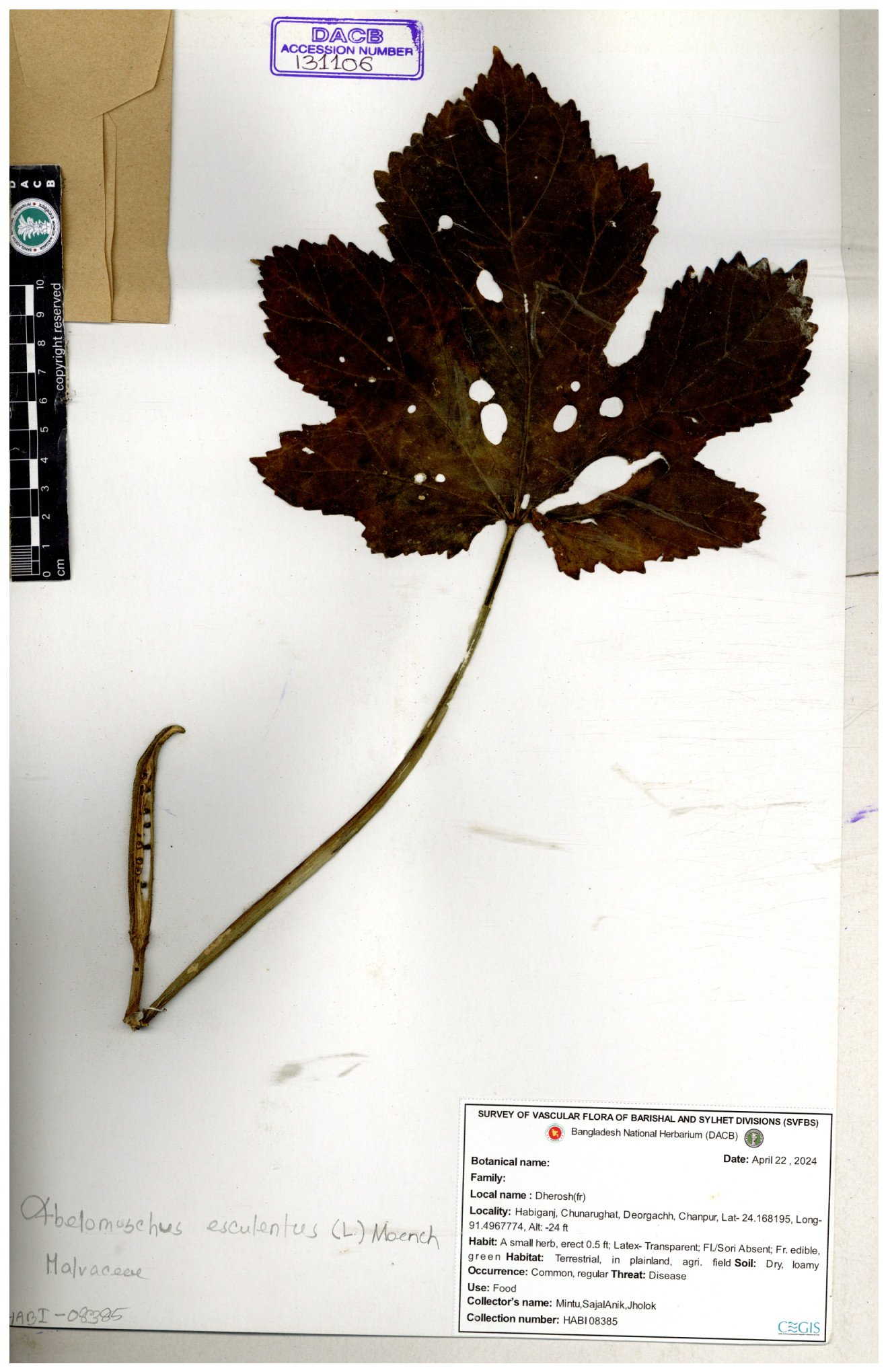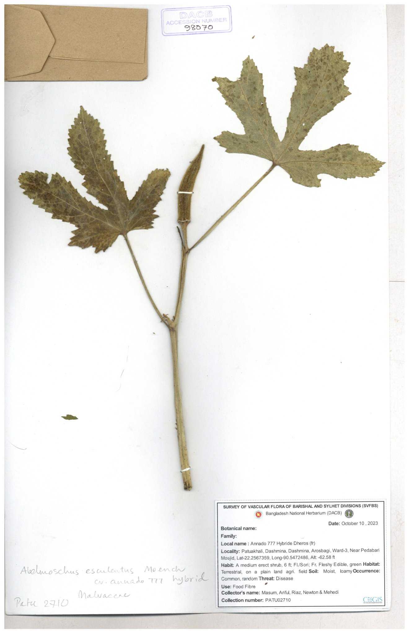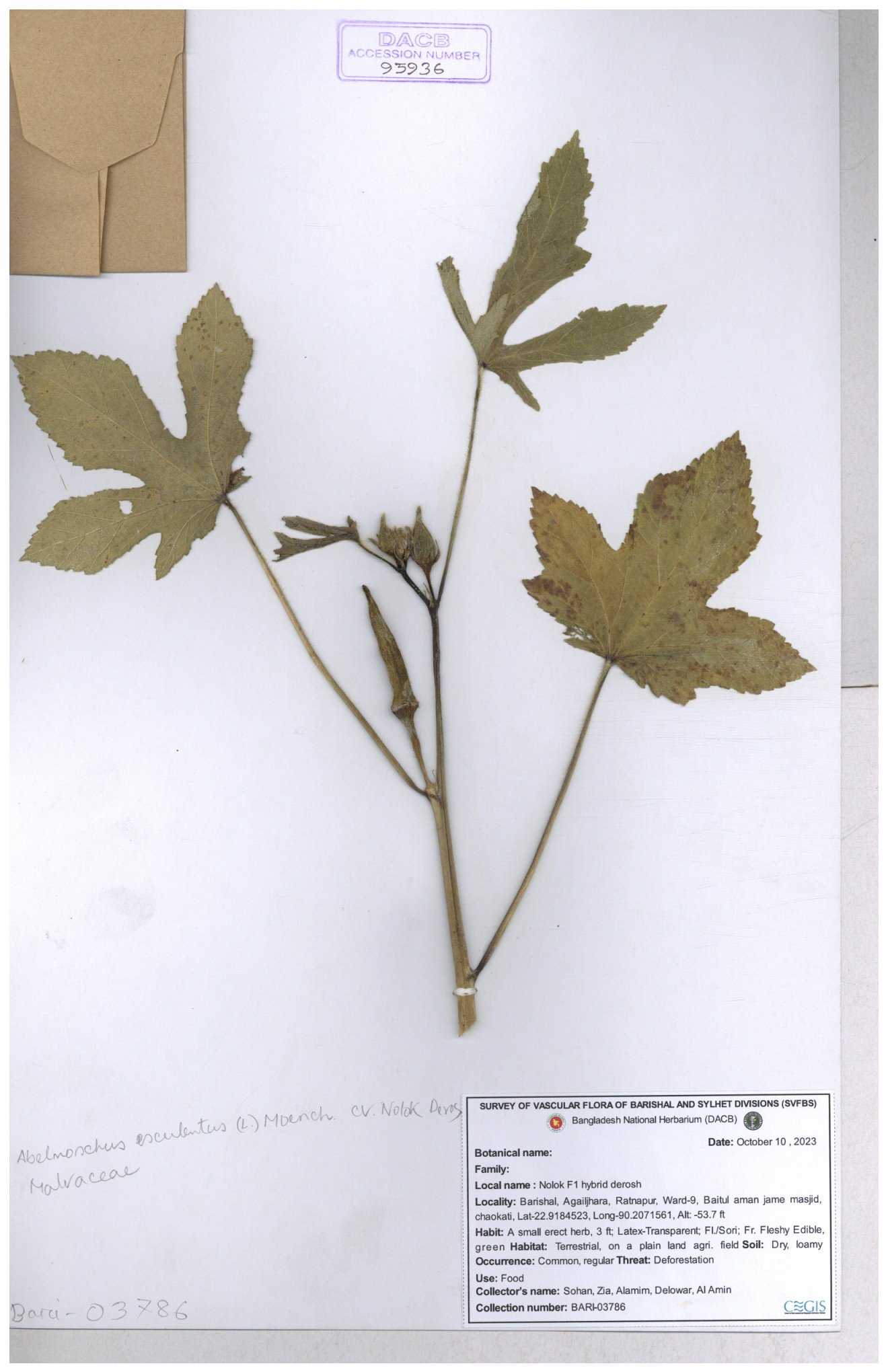 | 70337 | Malvaceae | Abelmoschus moschatus Medik. | I Hossen, MS Islam, MKR Rahman & MR Miah | IH- 3184 12-01-2017 |