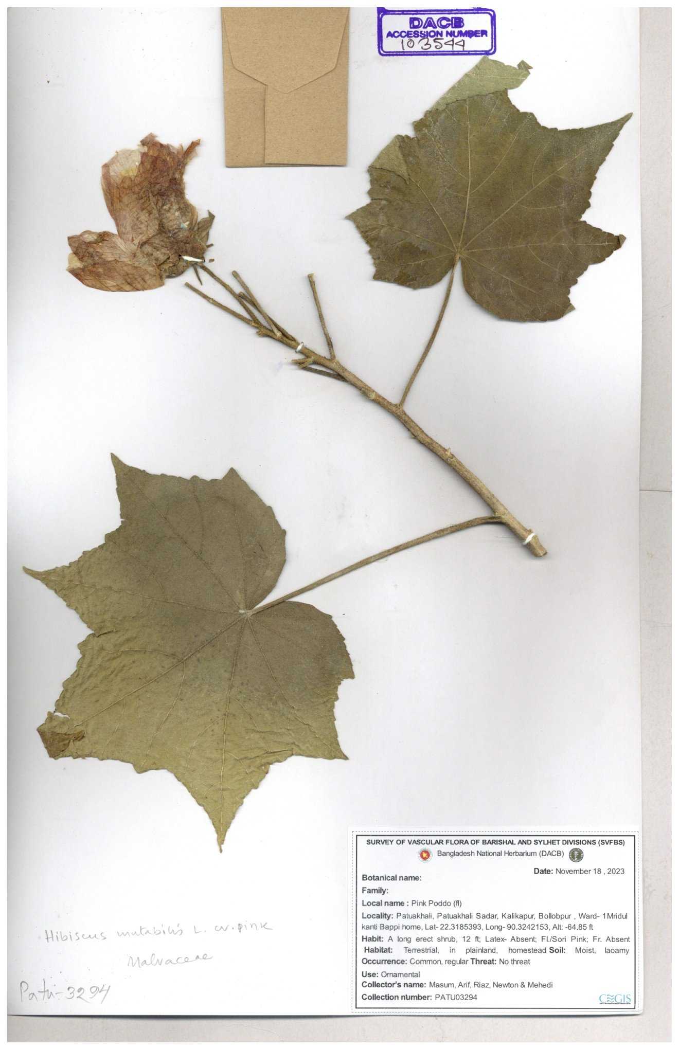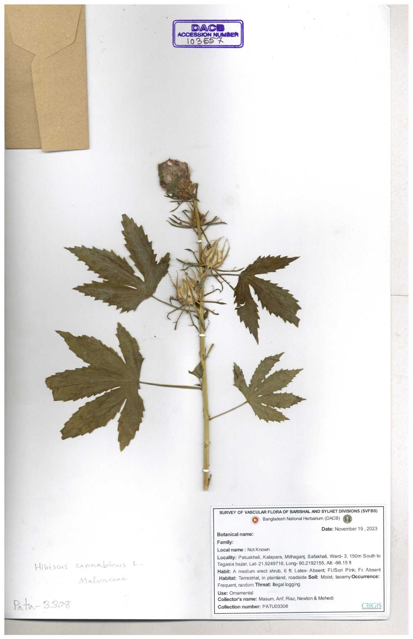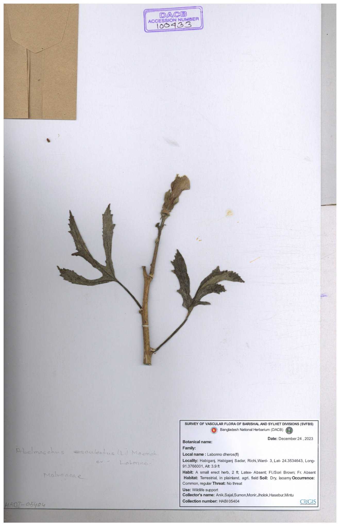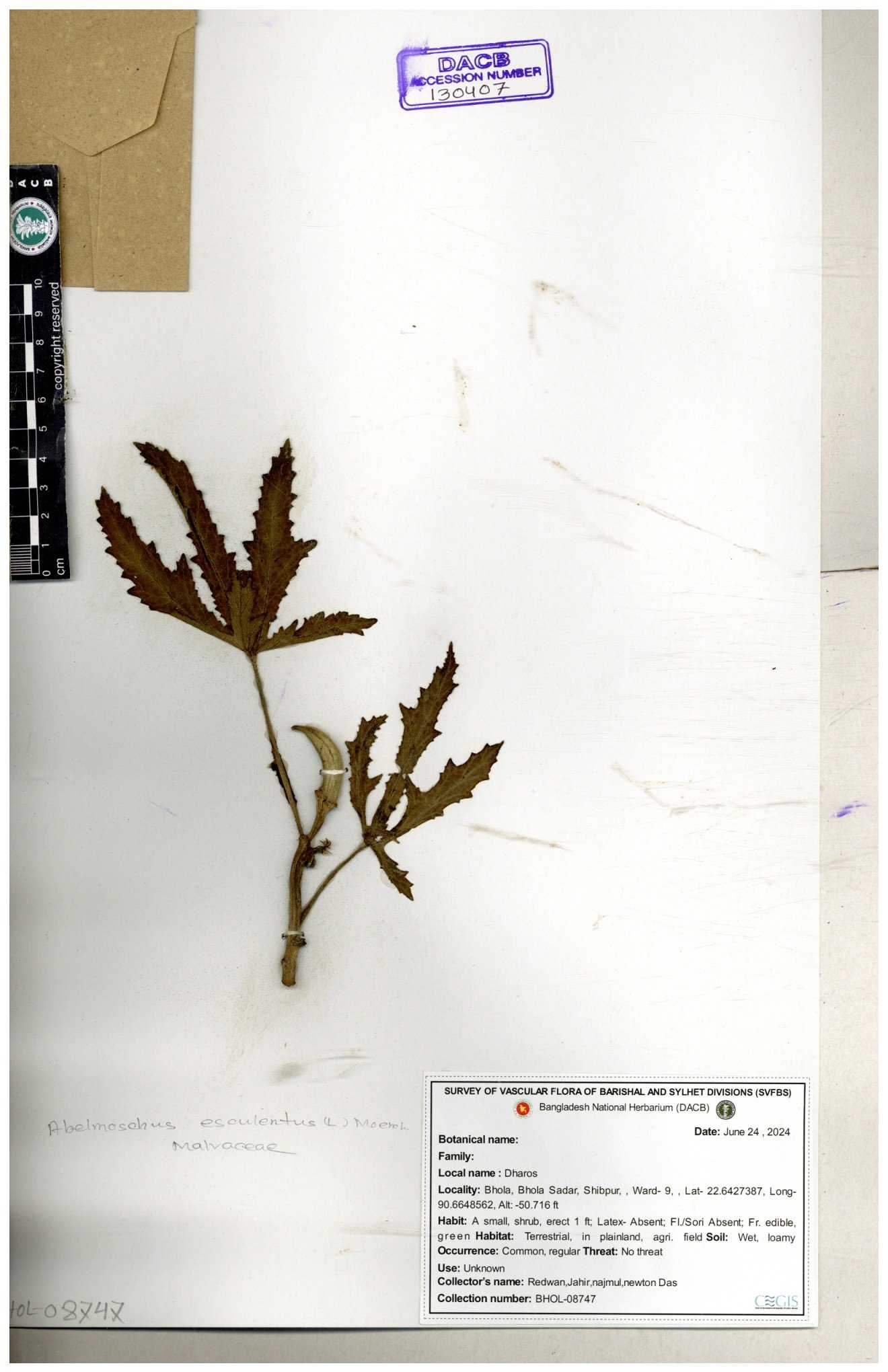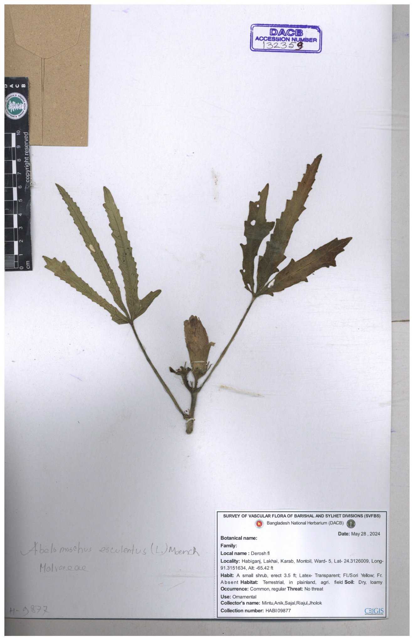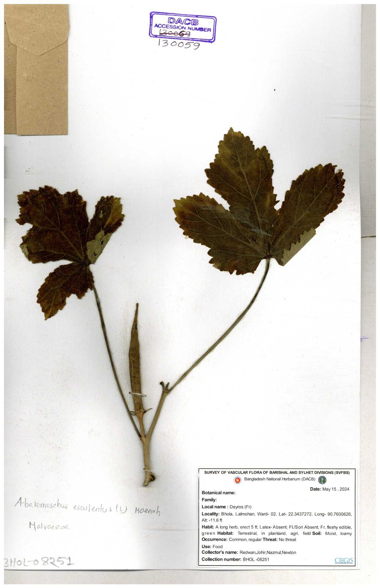| 70337 | Malvaceae | Abelmoschus moschatus Medik. | I Hossen, MS Islam, MKR Rahman & MR Miah | IH- 3184 12-01-2017 |
