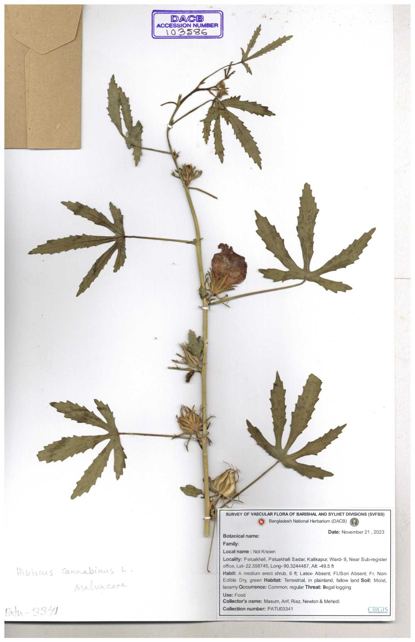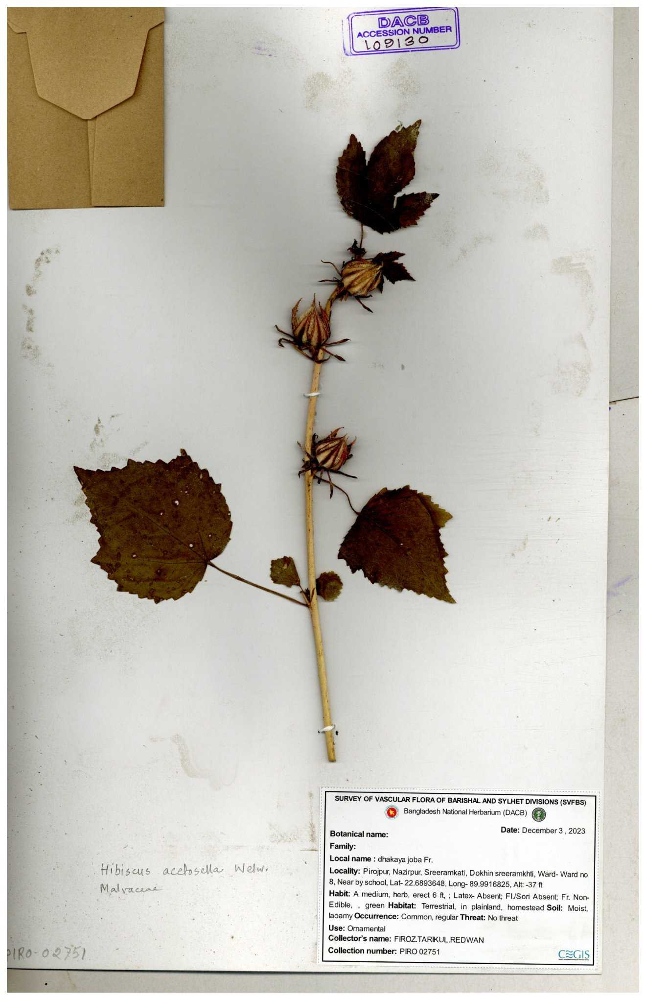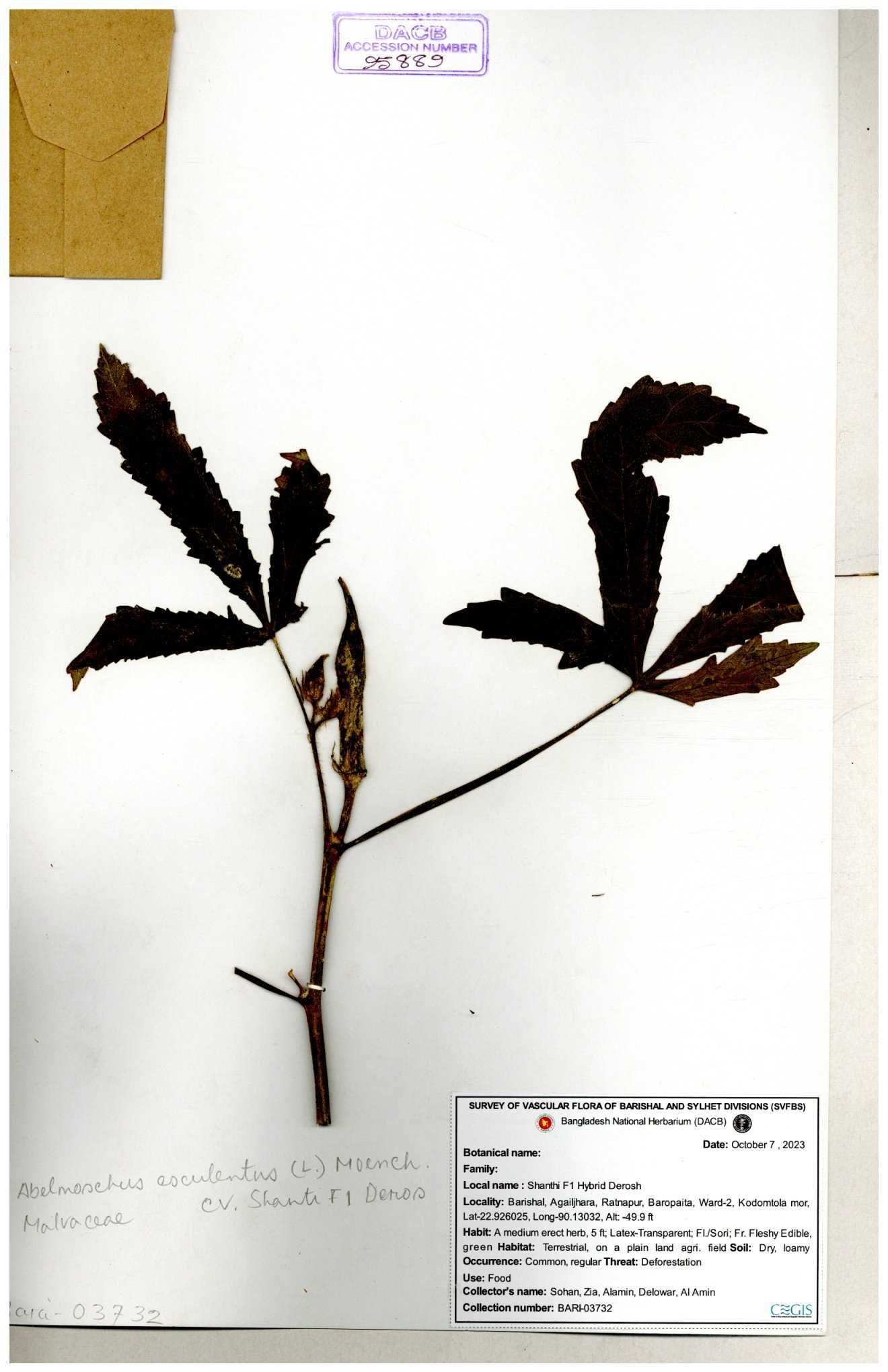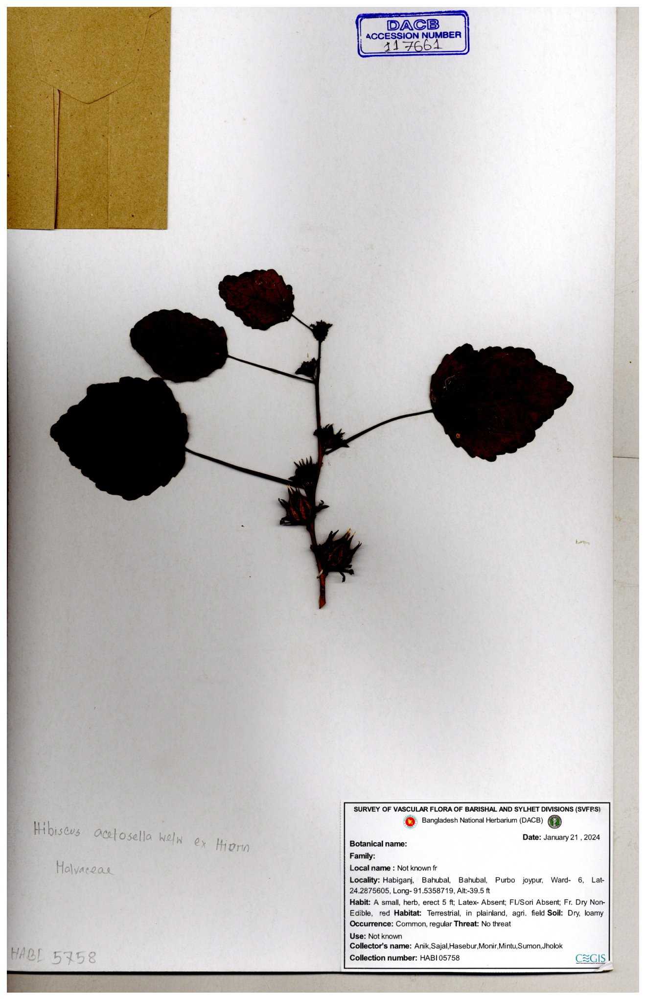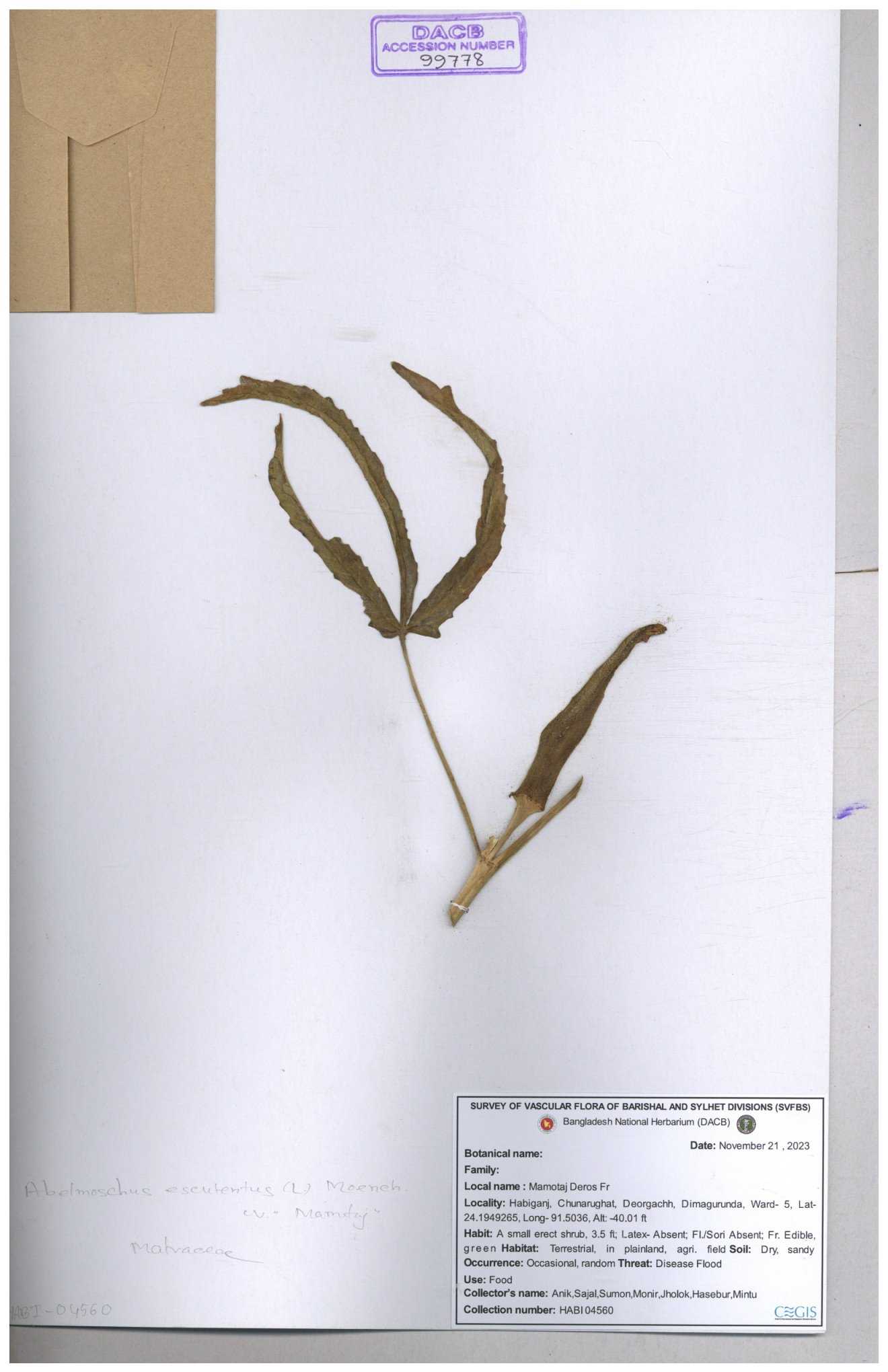 | 70337 | Malvaceae | Abelmoschus moschatus Medik. | I Hossen, MS Islam, MKR Rahman & MR Miah | IH- 3184 12-01-2017 |