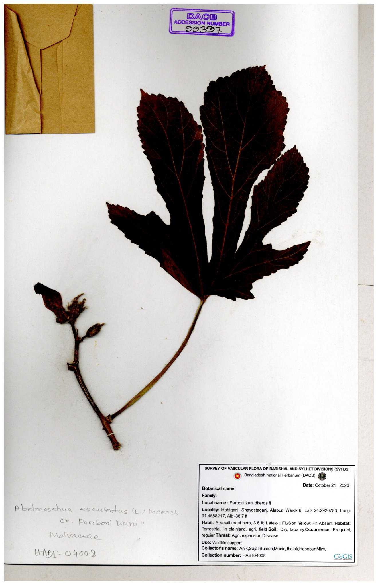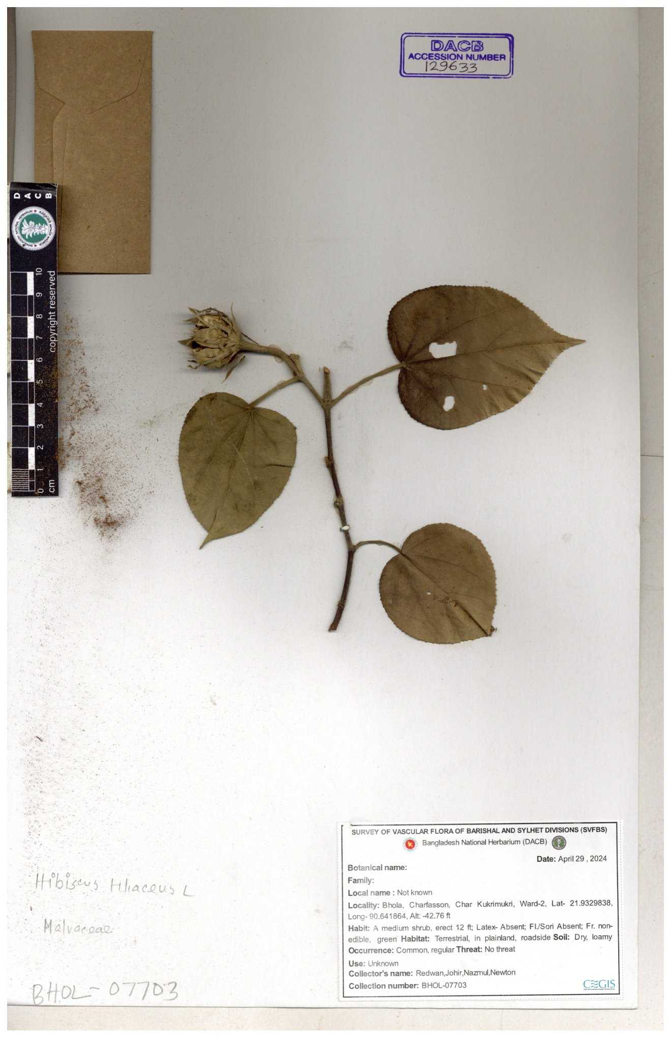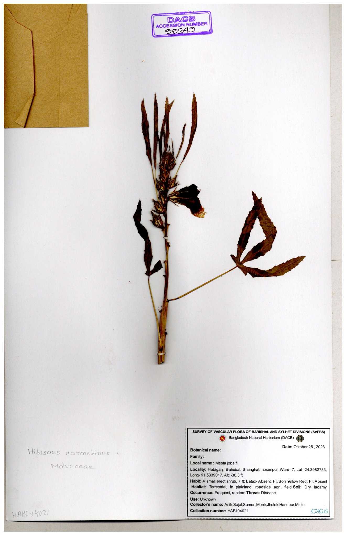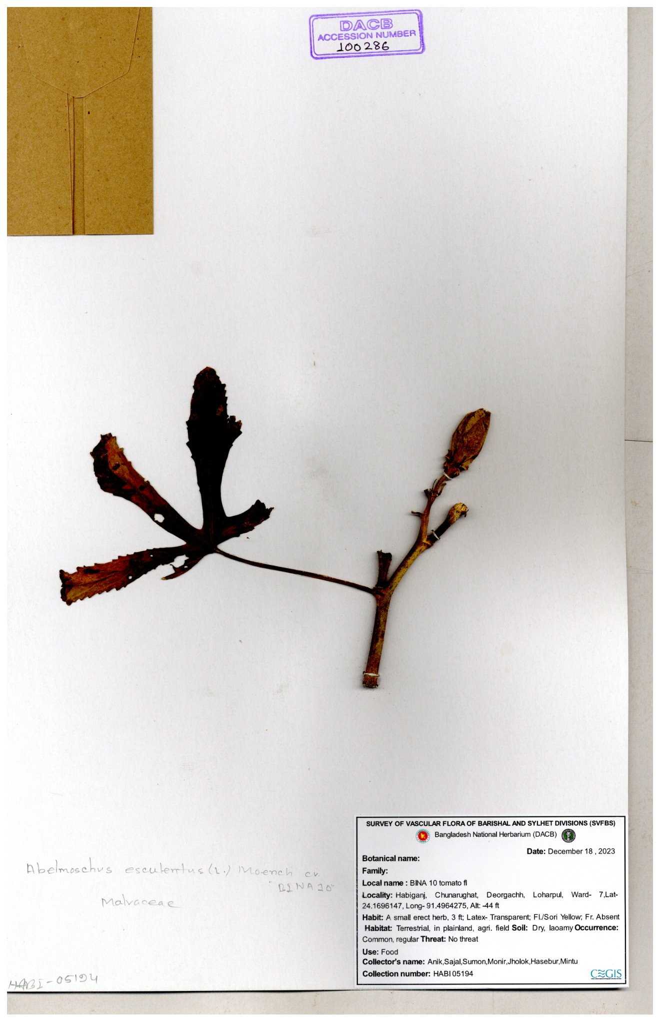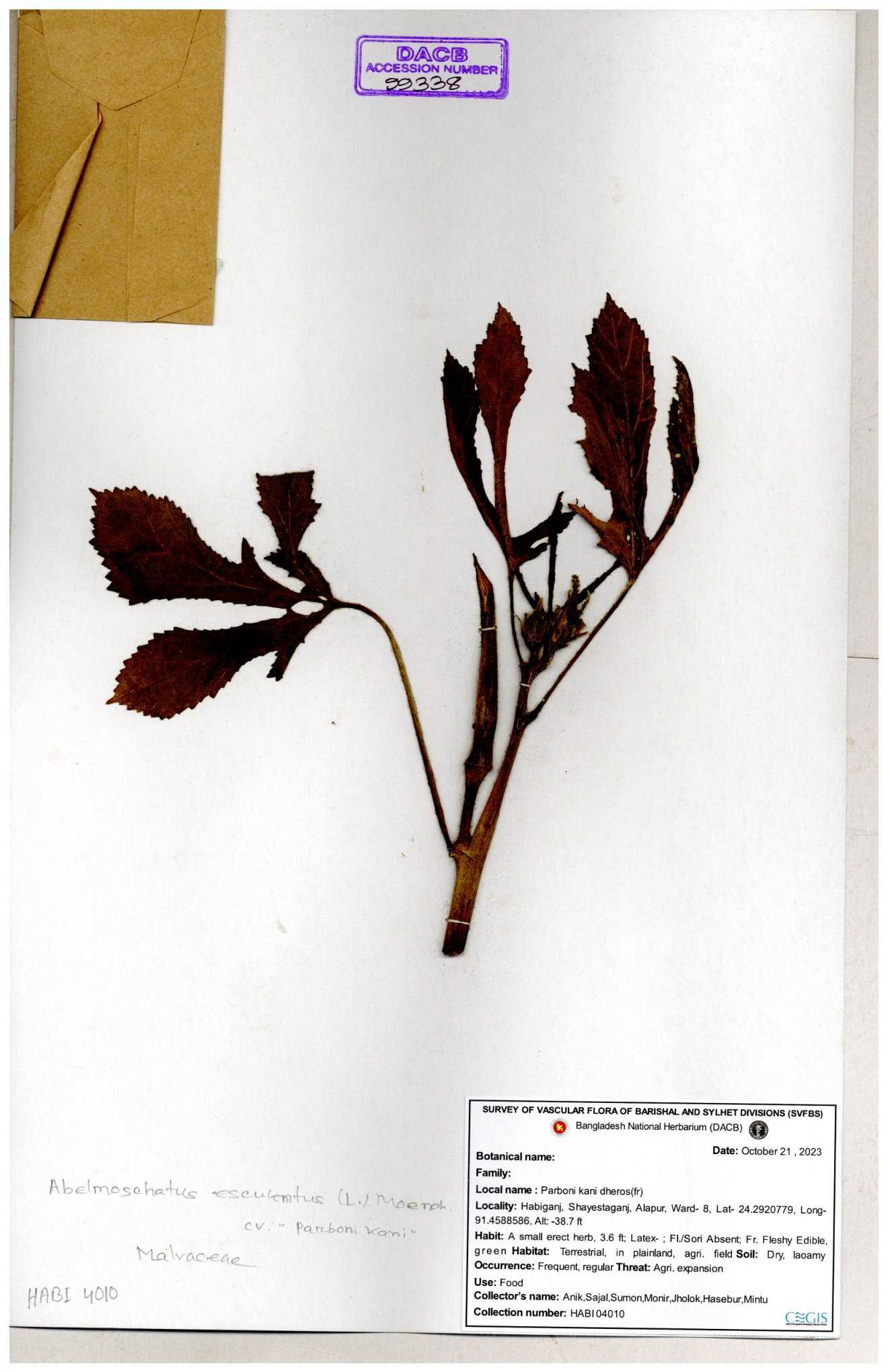 | 70337 | Malvaceae | Abelmoschus moschatus Medik. | I Hossen, MS Islam, MKR Rahman & MR Miah | IH- 3184 12-01-2017 |