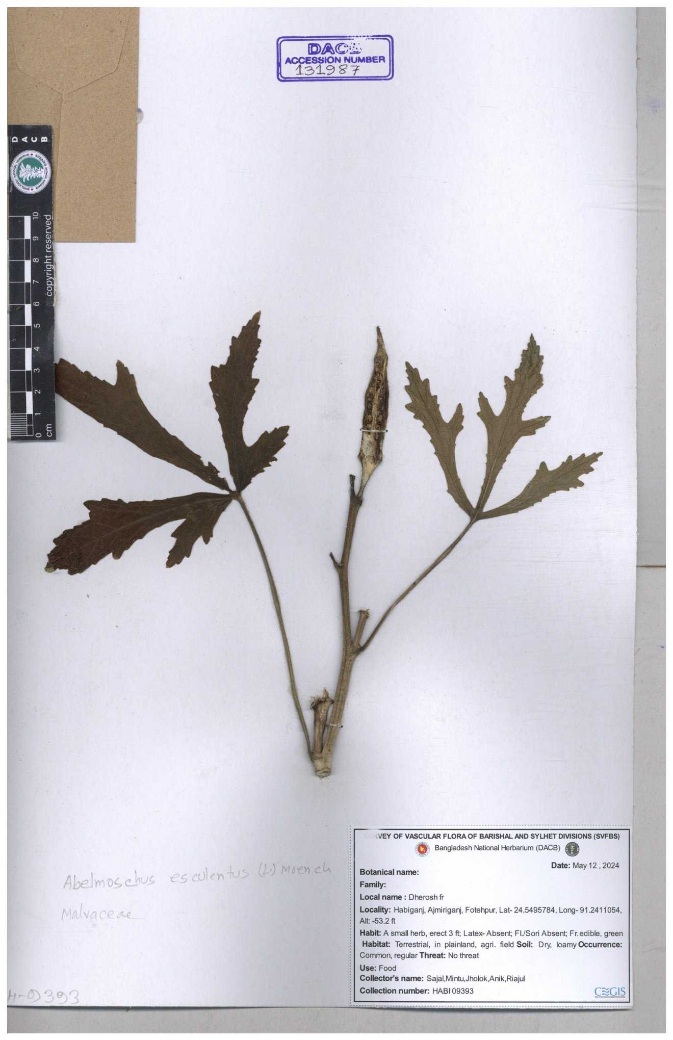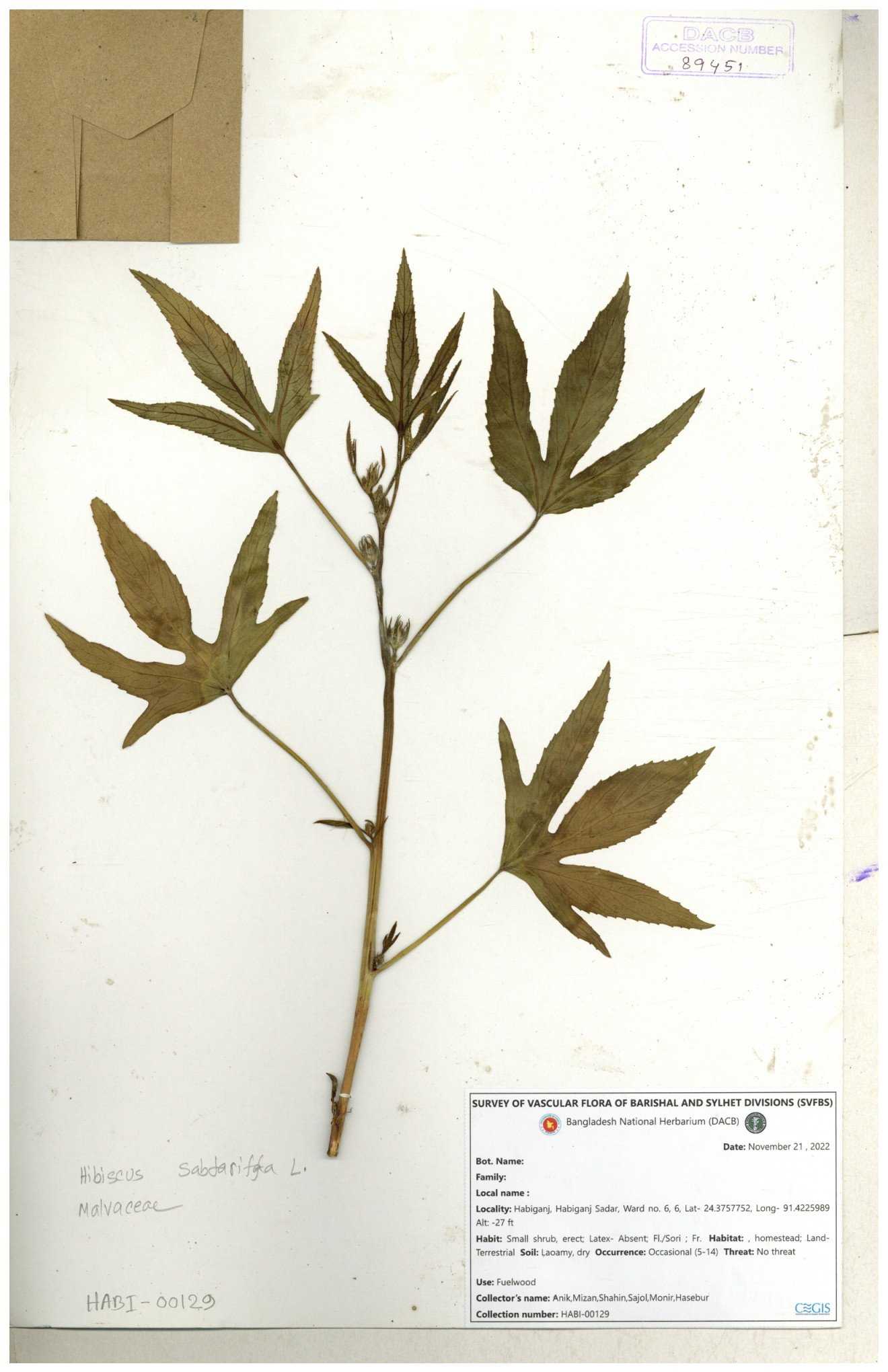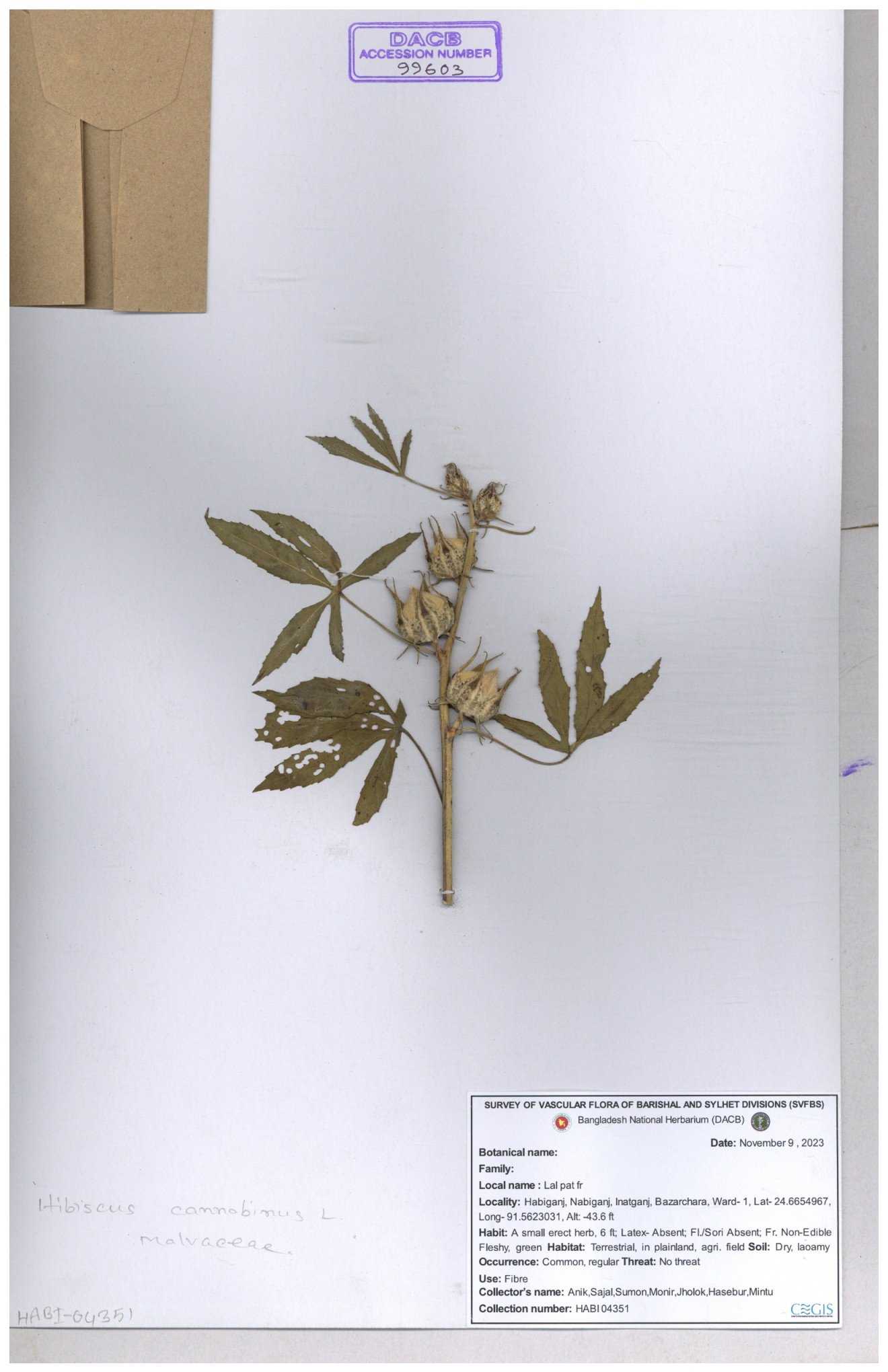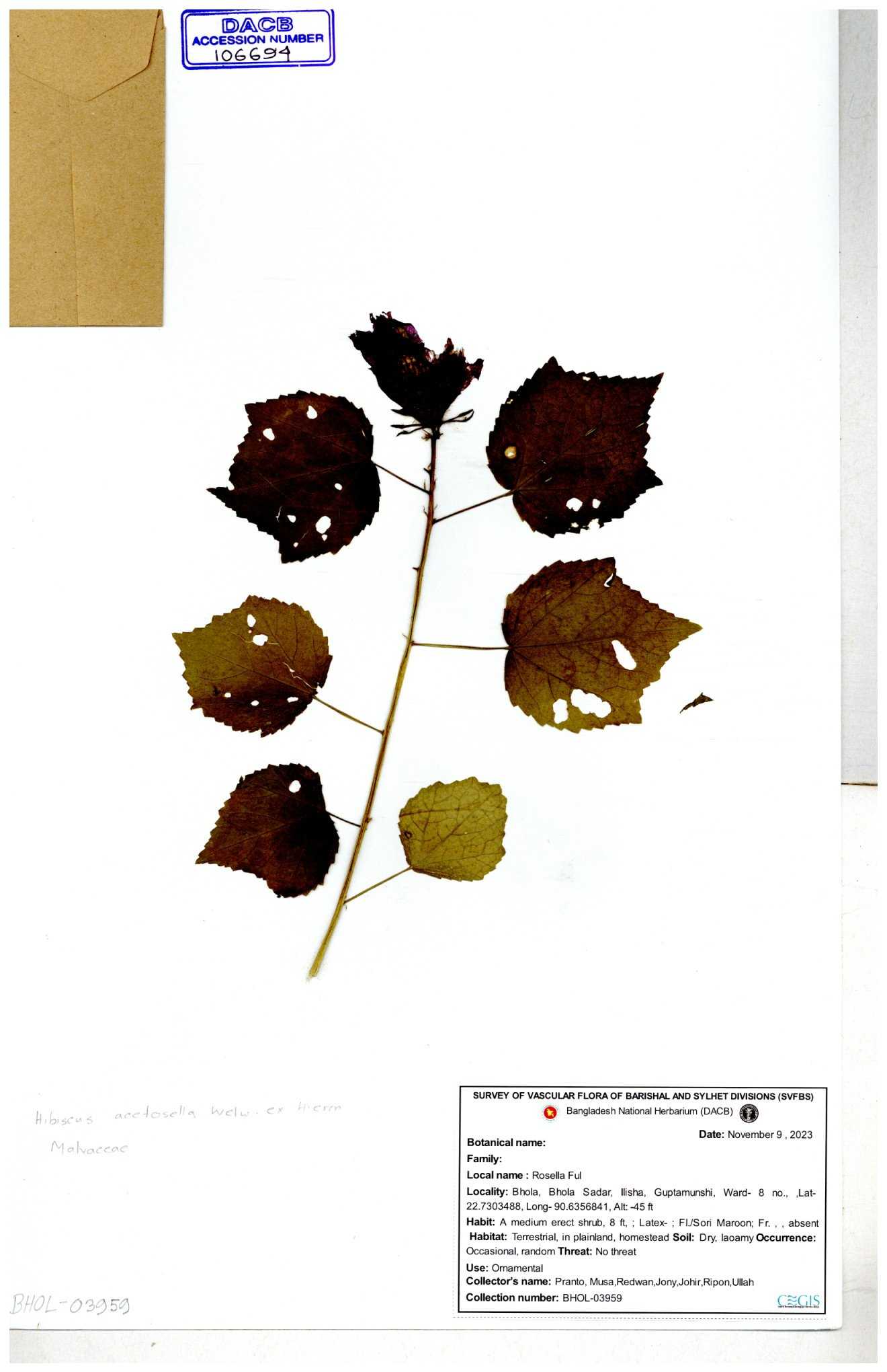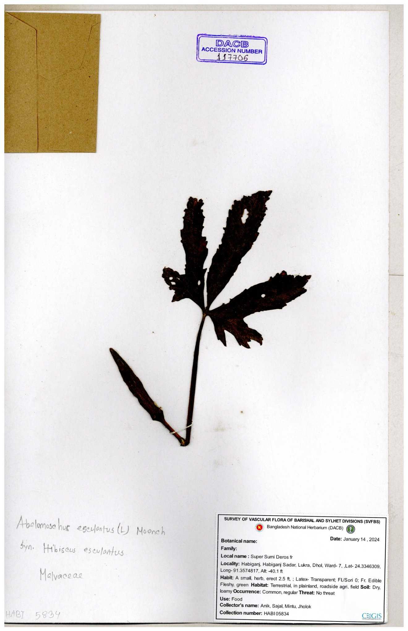 | 70337 | Malvaceae | Abelmoschus moschatus Medik. | I Hossen, MS Islam, MKR Rahman & MR Miah | IH- 3184 12-01-2017 |