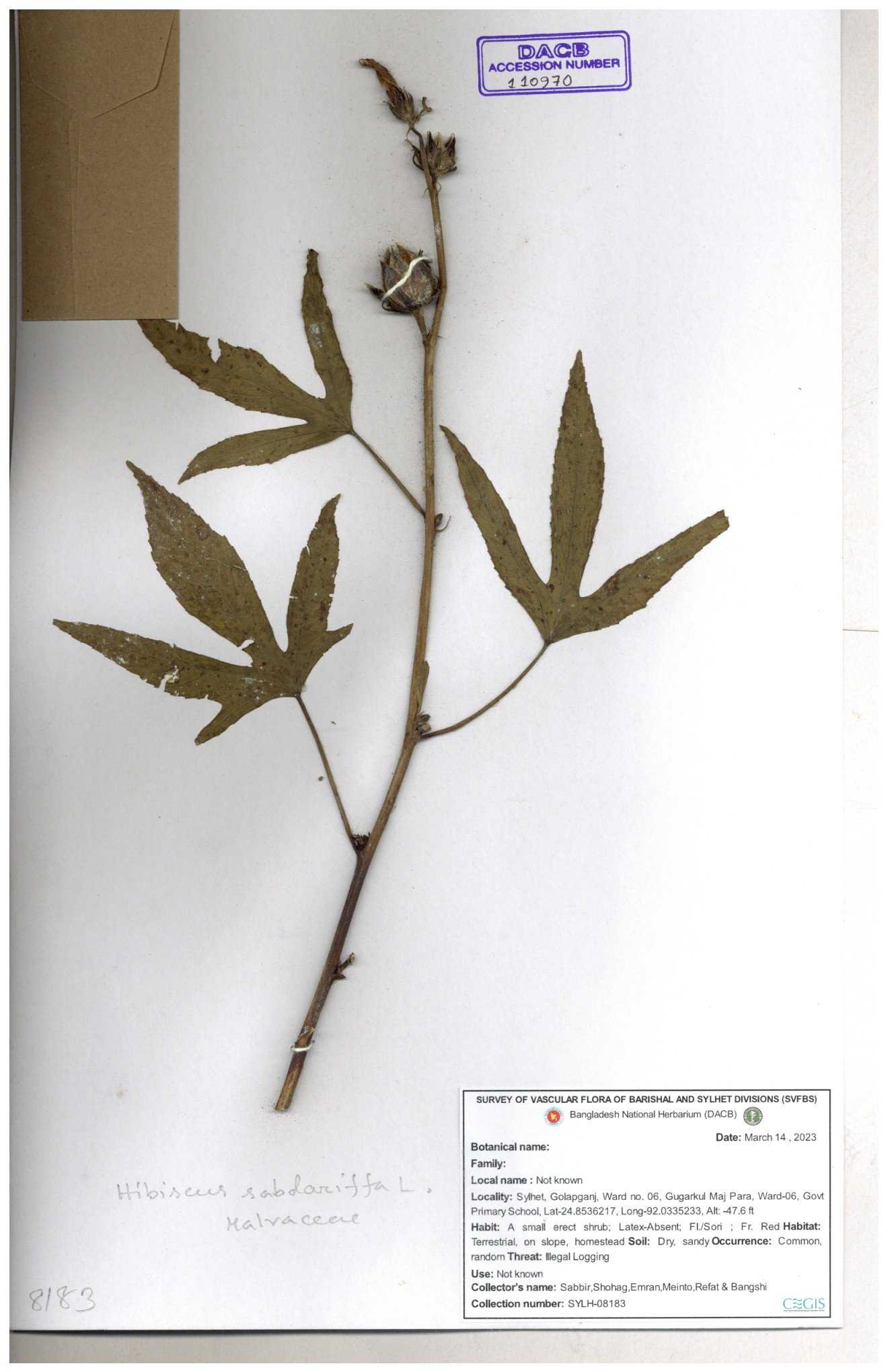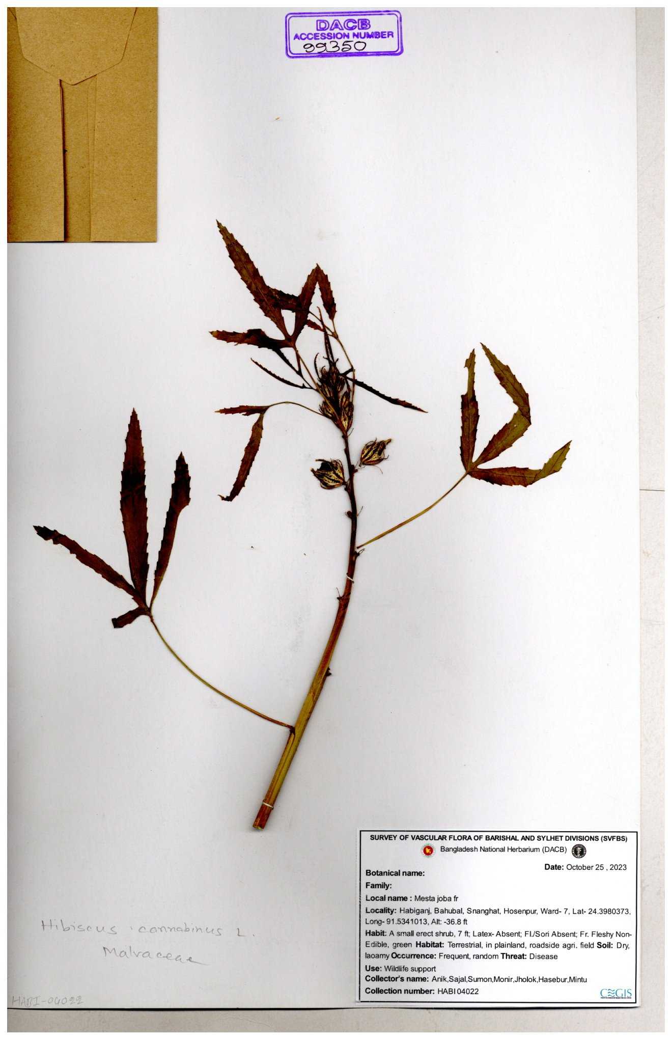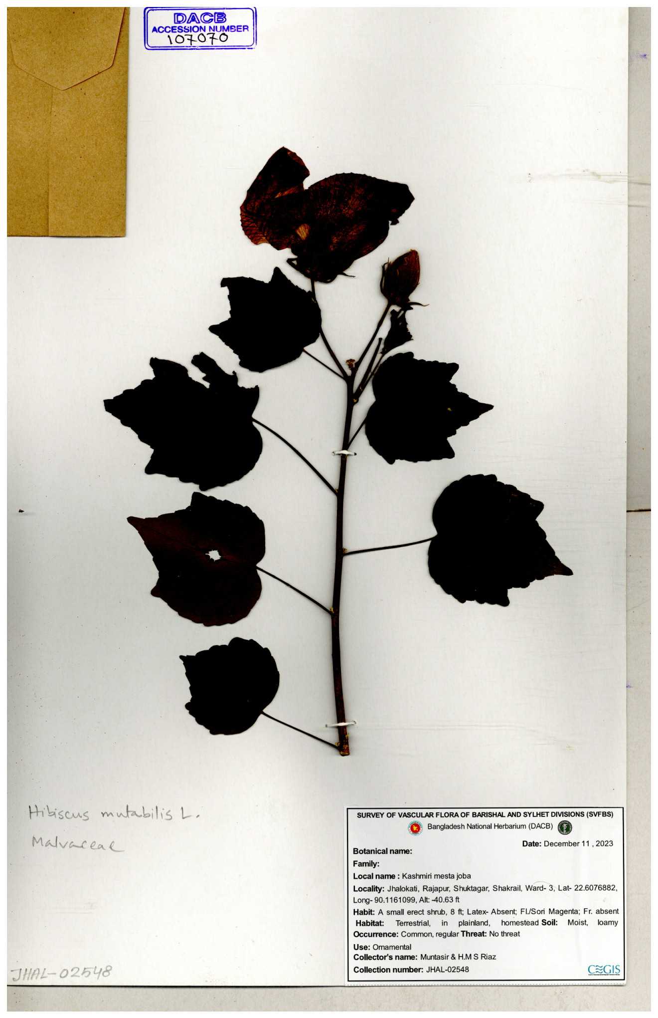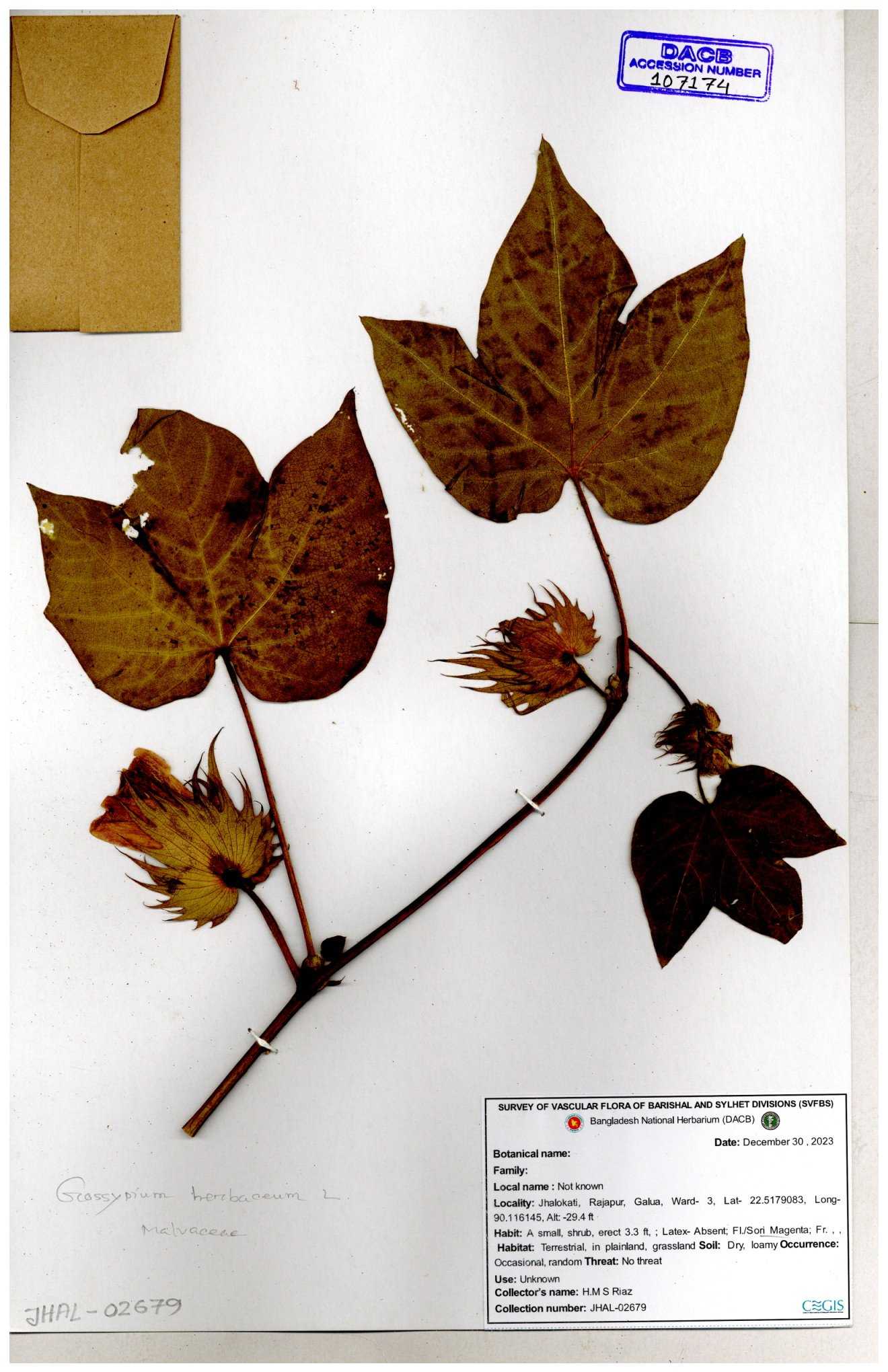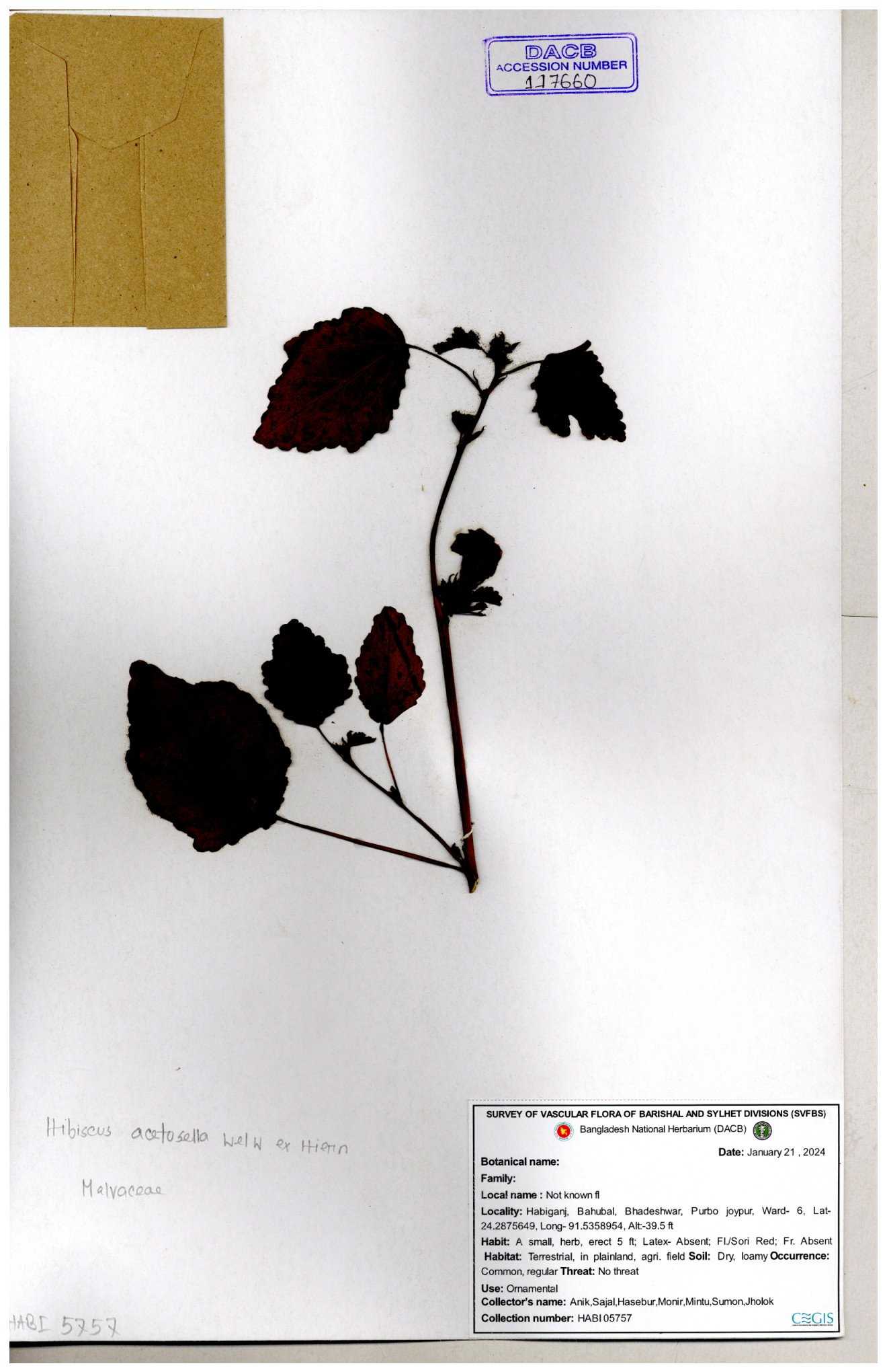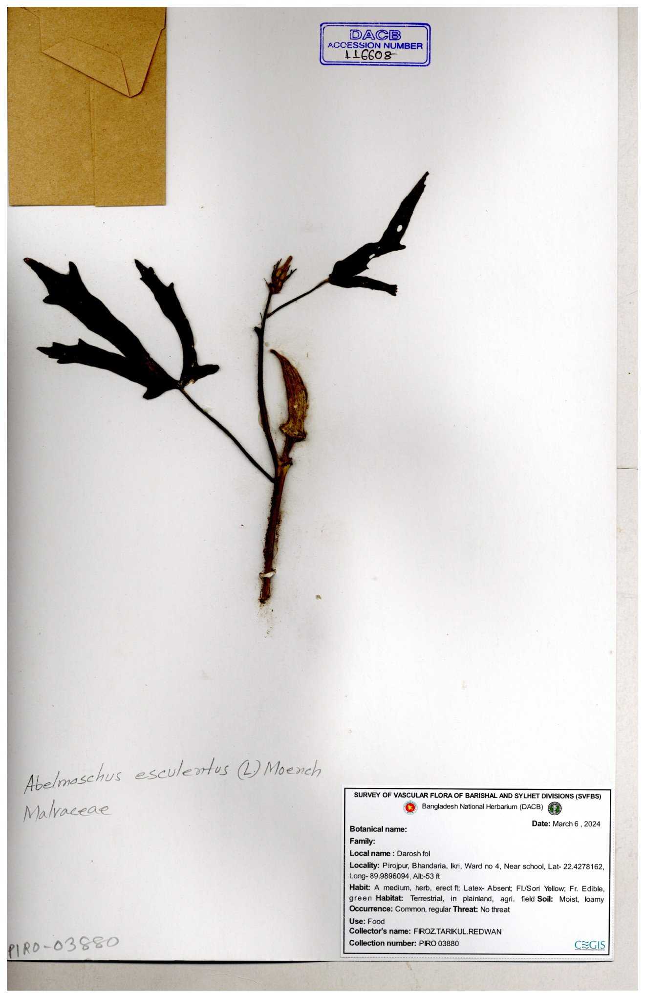 | 70337 | Malvaceae | Abelmoschus moschatus Medik. | I Hossen, MS Islam, MKR Rahman & MR Miah | IH- 3184 12-01-2017 |