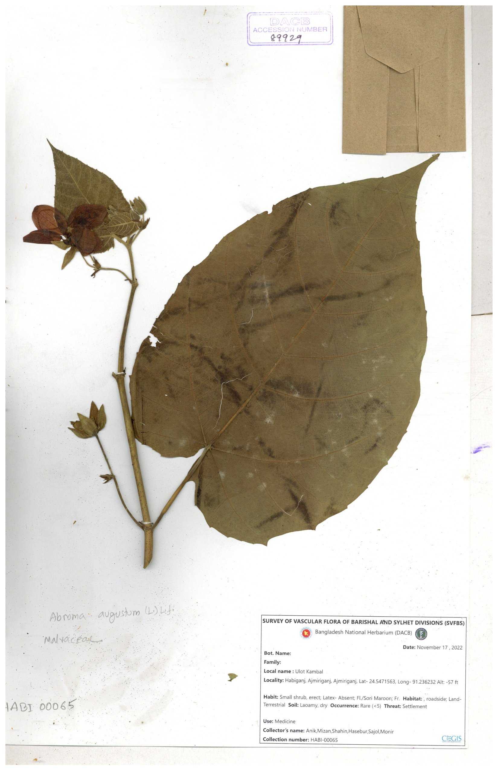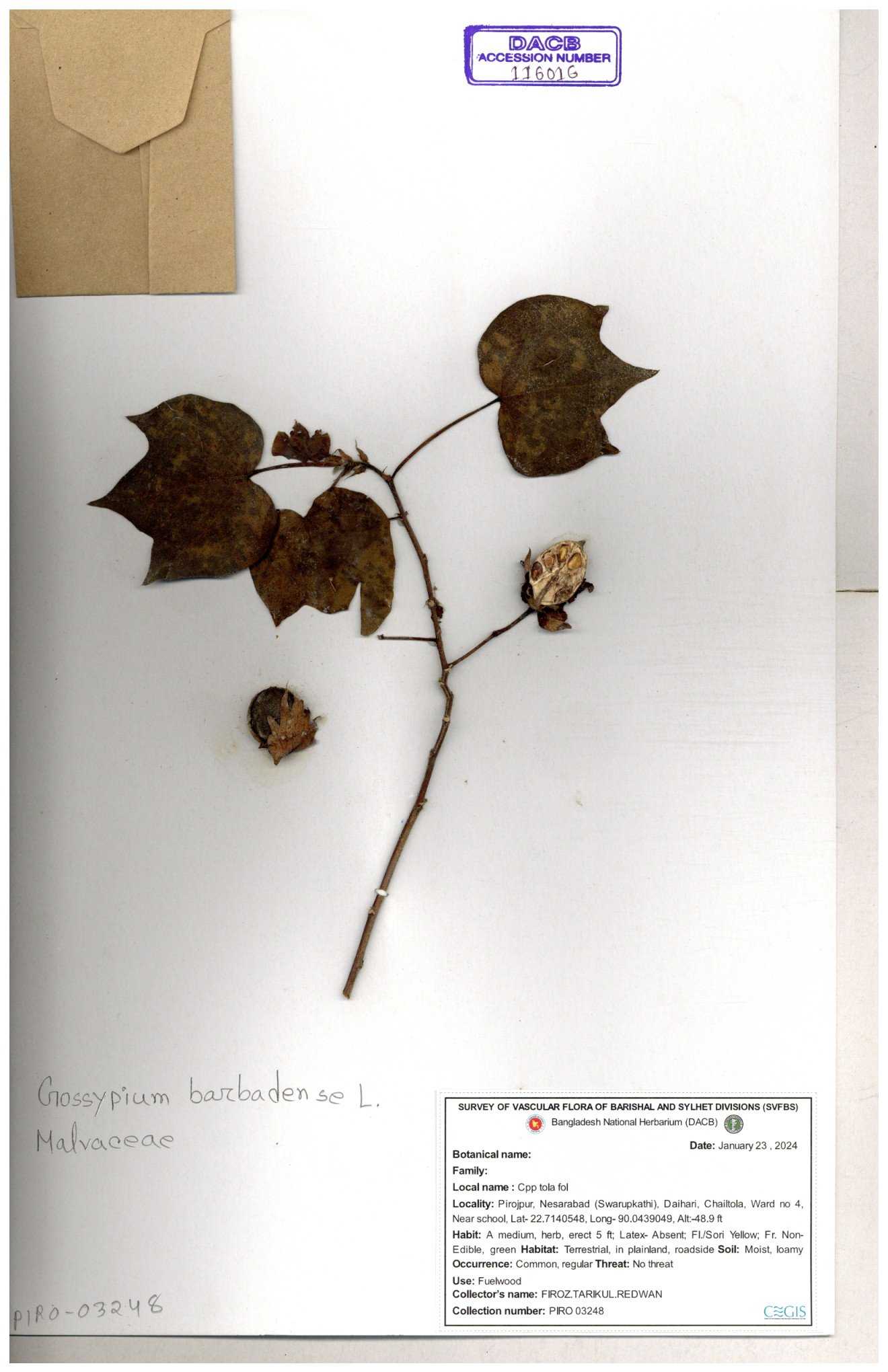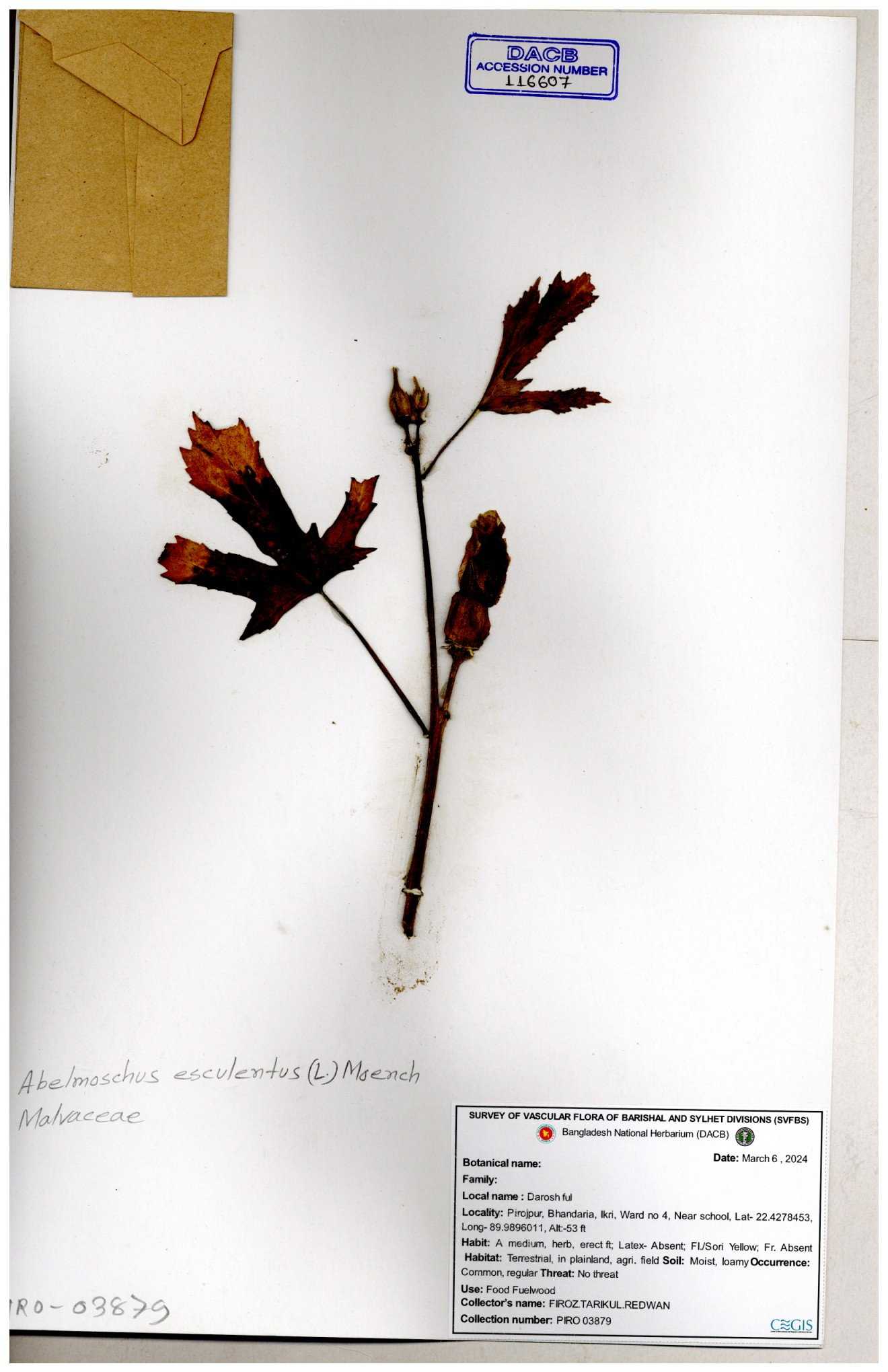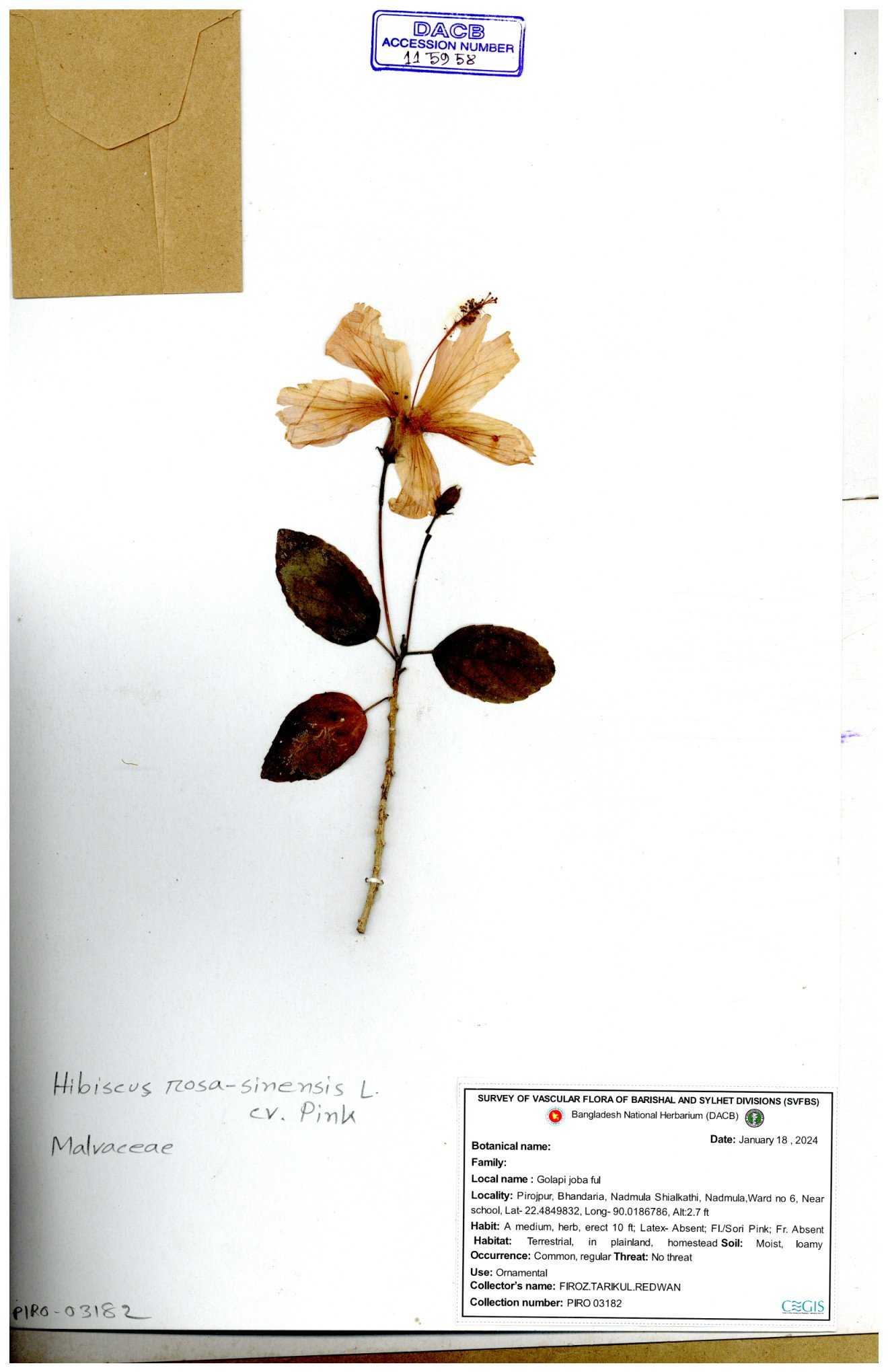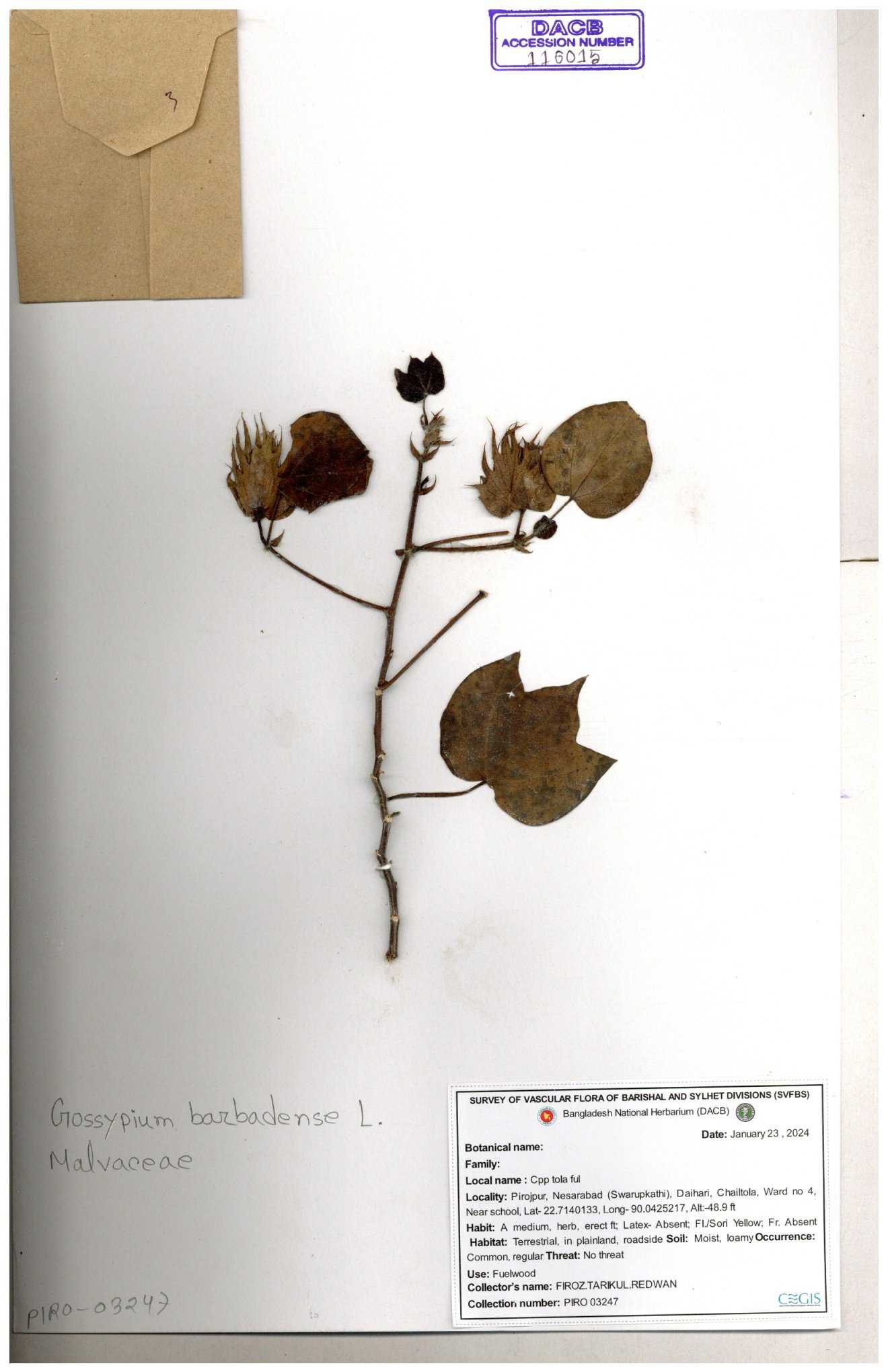 | 70337 | Malvaceae | Abelmoschus moschatus Medik. | I Hossen, MS Islam, MKR Rahman & MR Miah | IH- 3184 12-01-2017 |