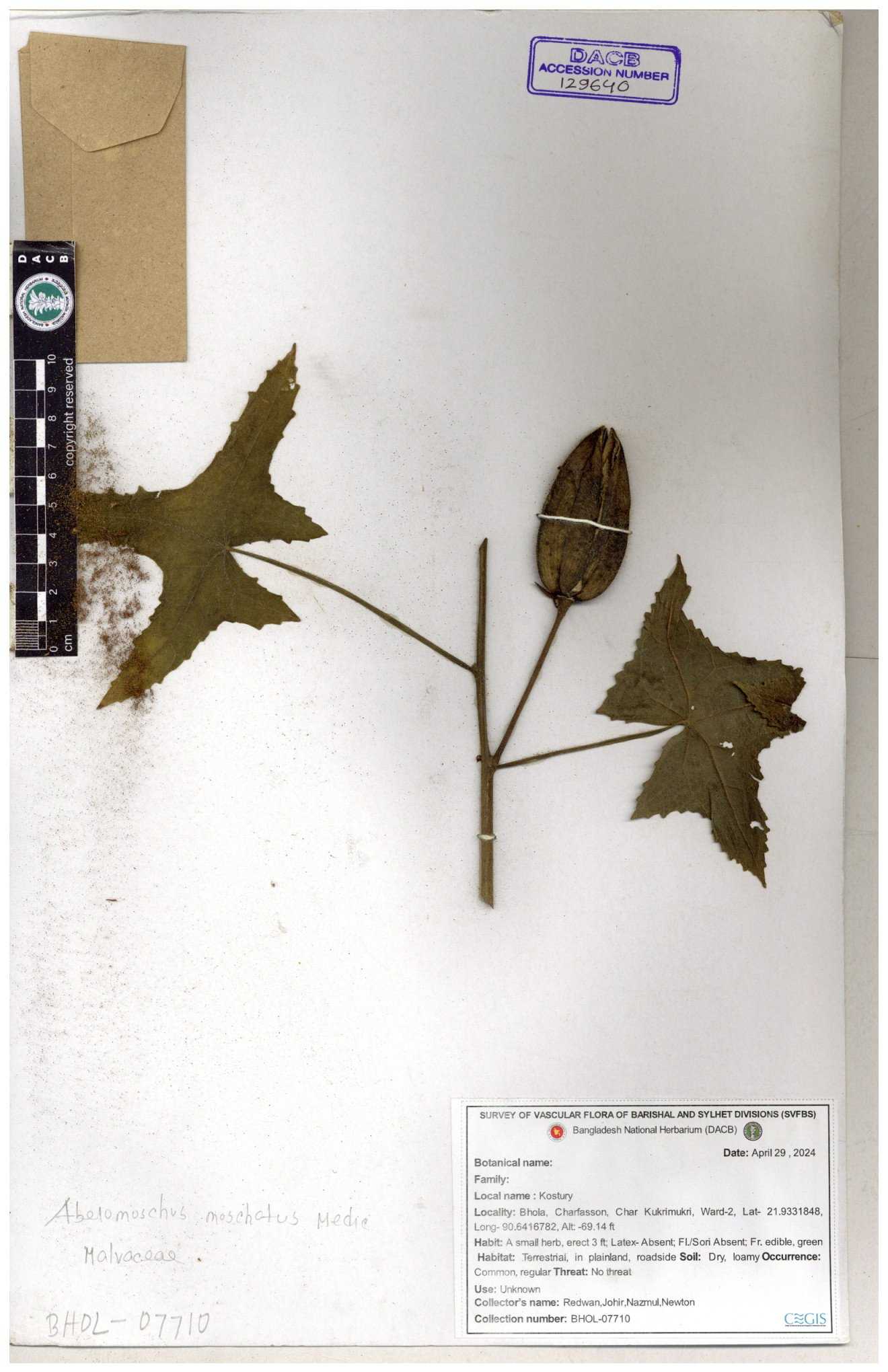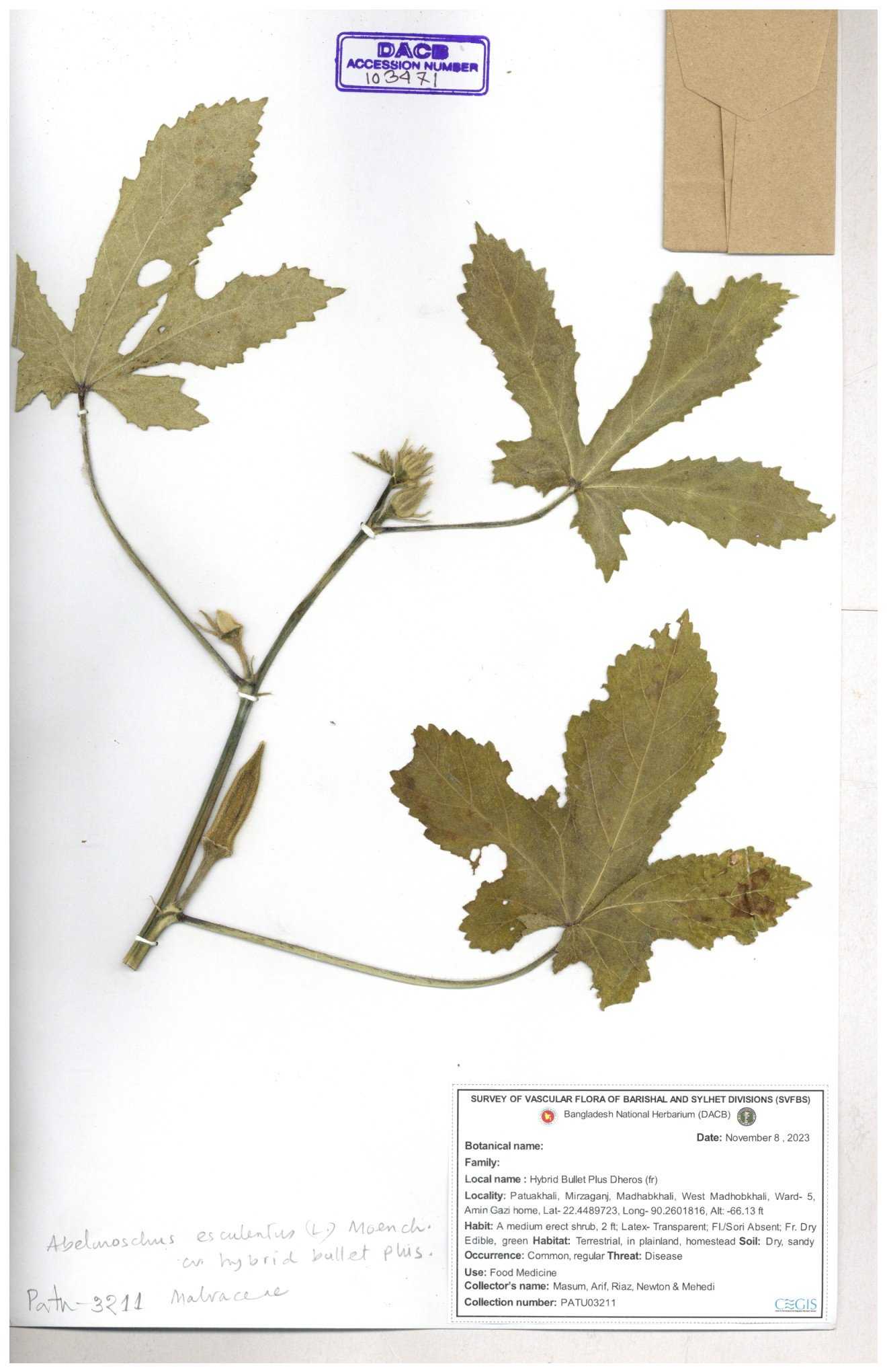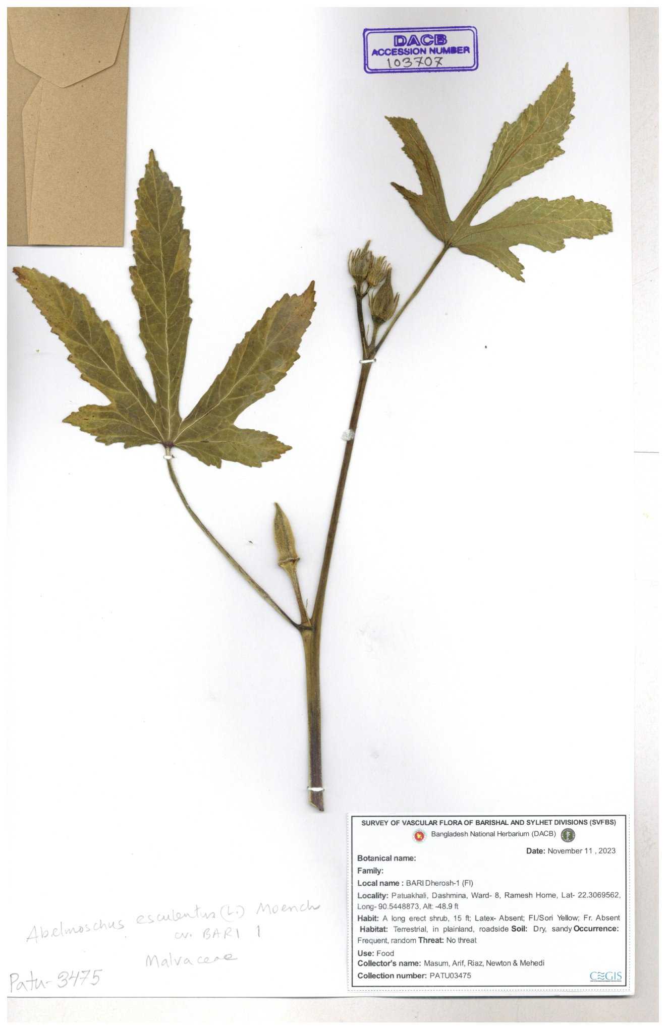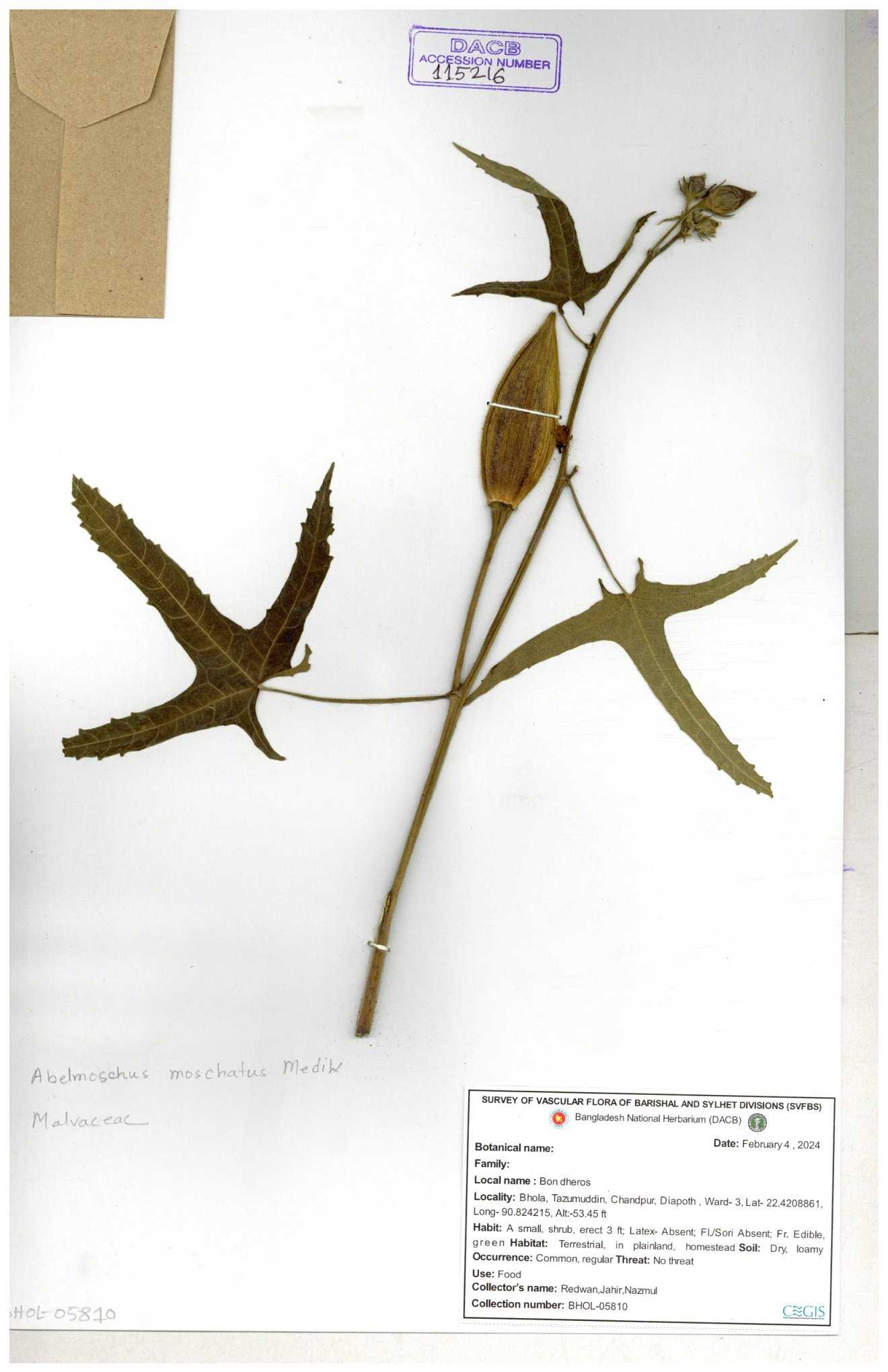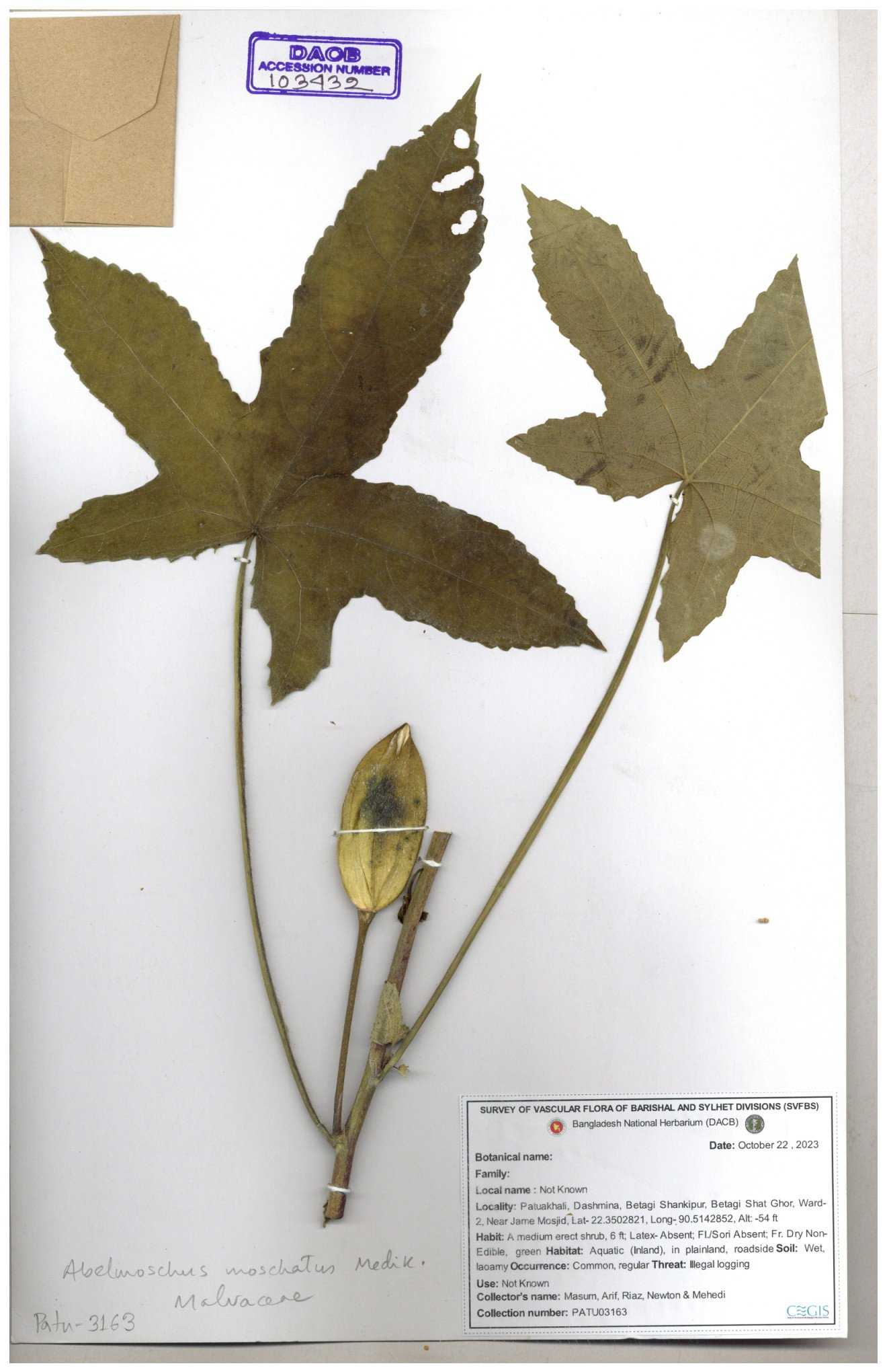 | 54204 | Malvaceae | Abelmoschus moschatus Medik. | Ban-Dheras | Md. Moniruzzaman, Al-Amin & Kawsar | MAK- 7136 10-01-2018 |