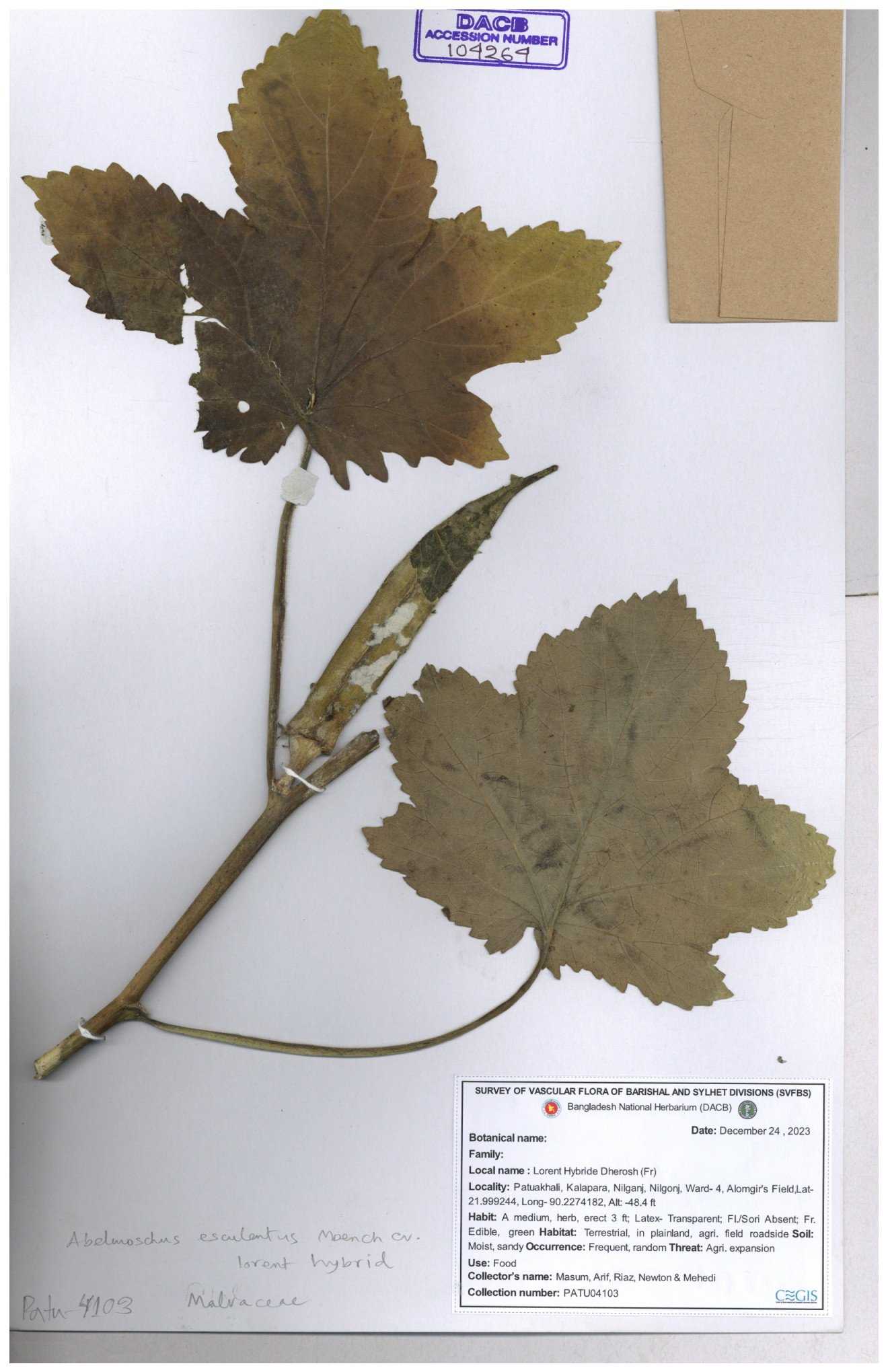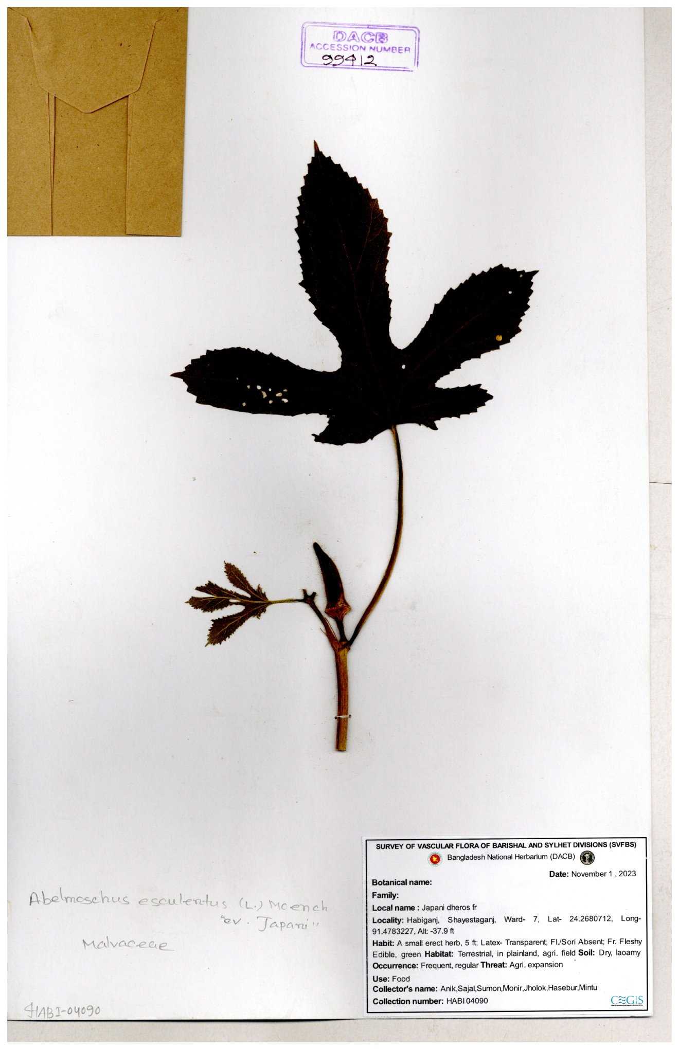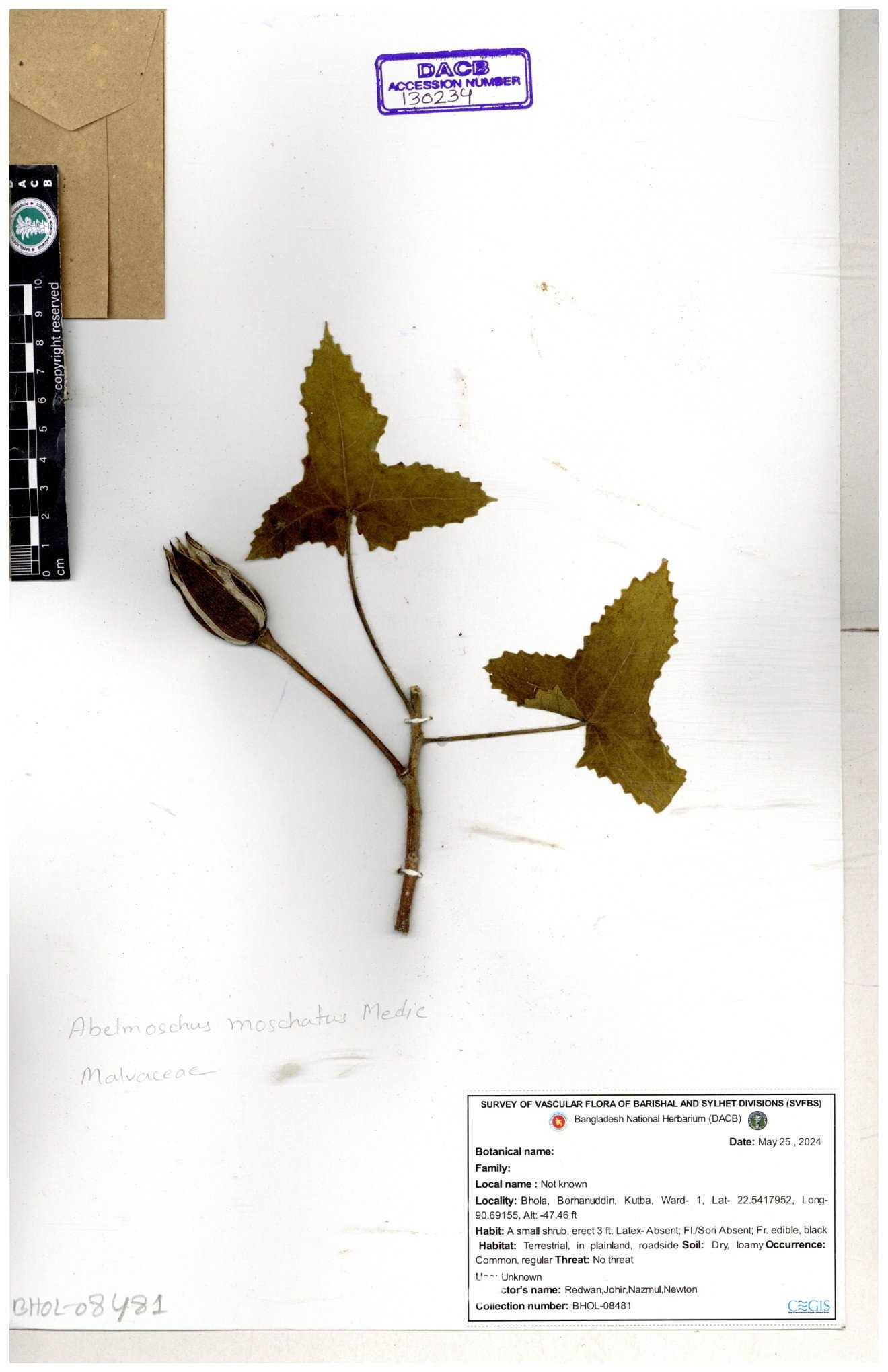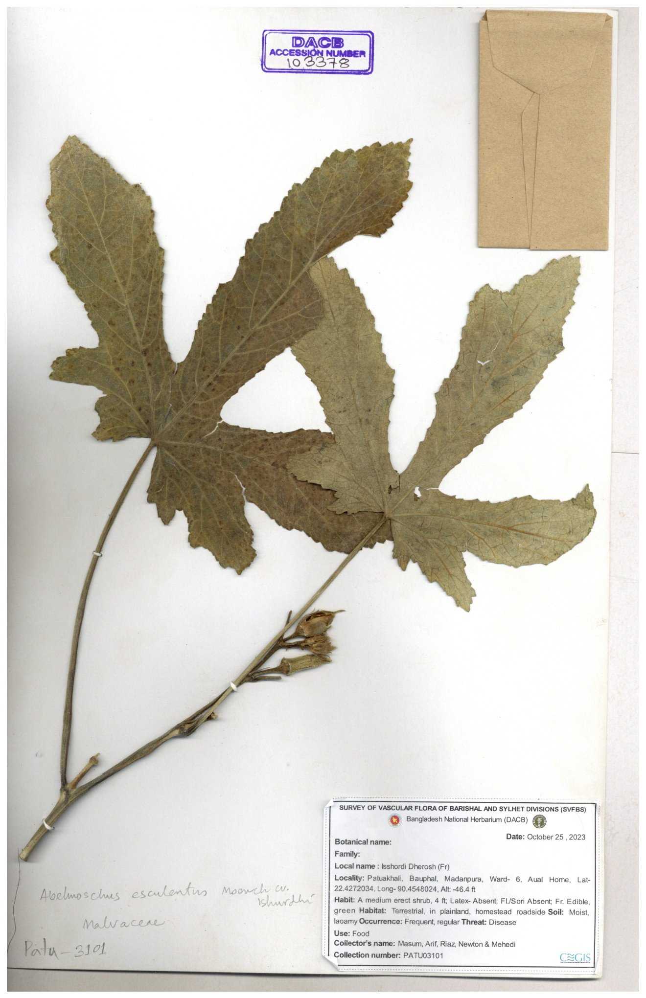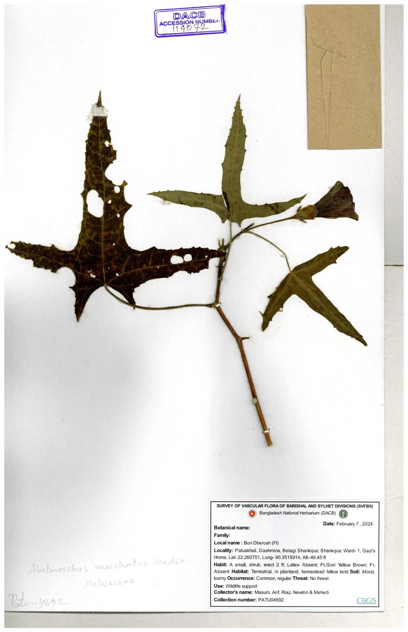 | 54204 | Malvaceae | Abelmoschus moschatus Medik. | Ban-Dheras | Md. Moniruzzaman, Al-Amin & Kawsar | MAK- 7136 10-01-2018 |