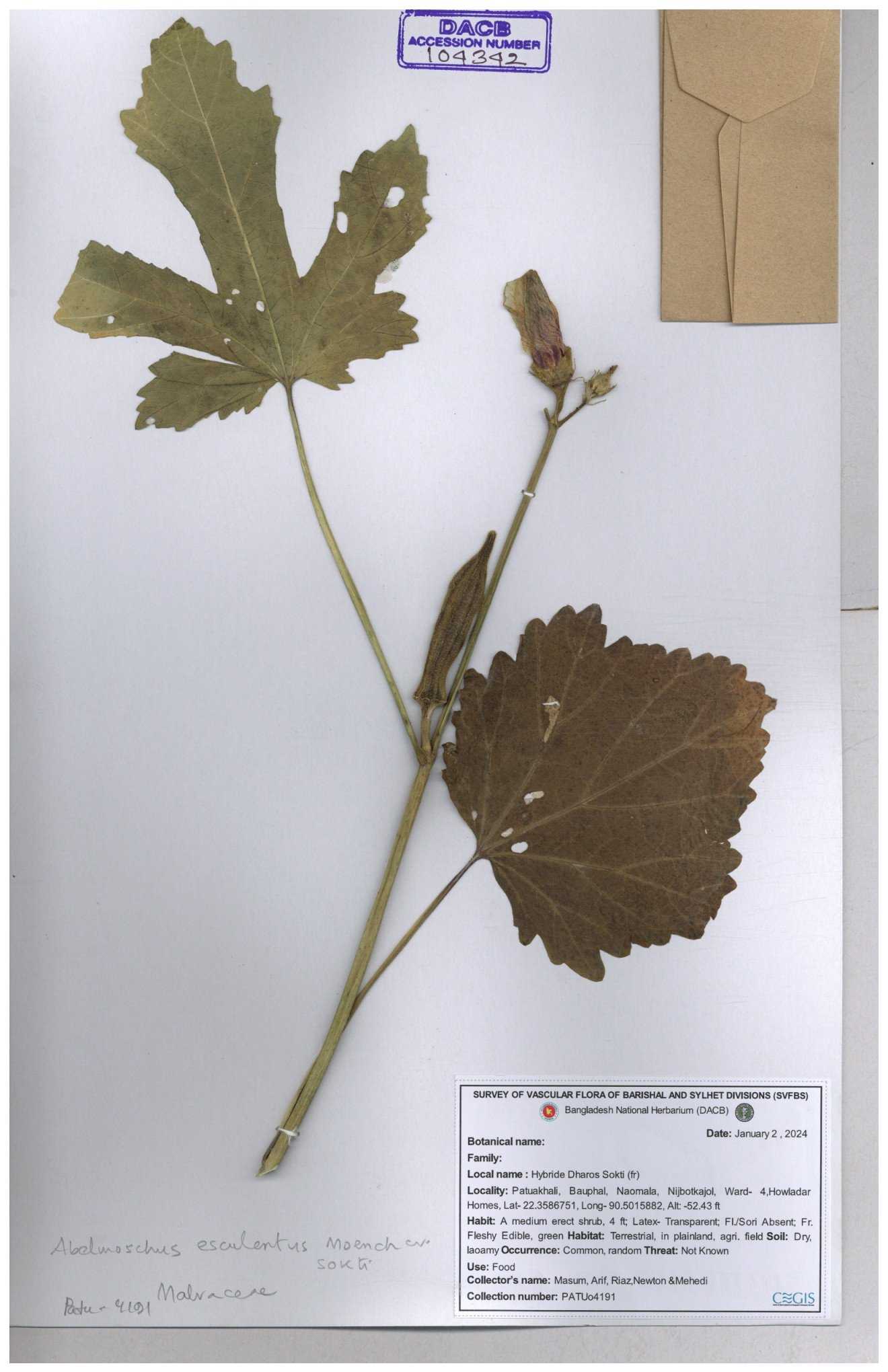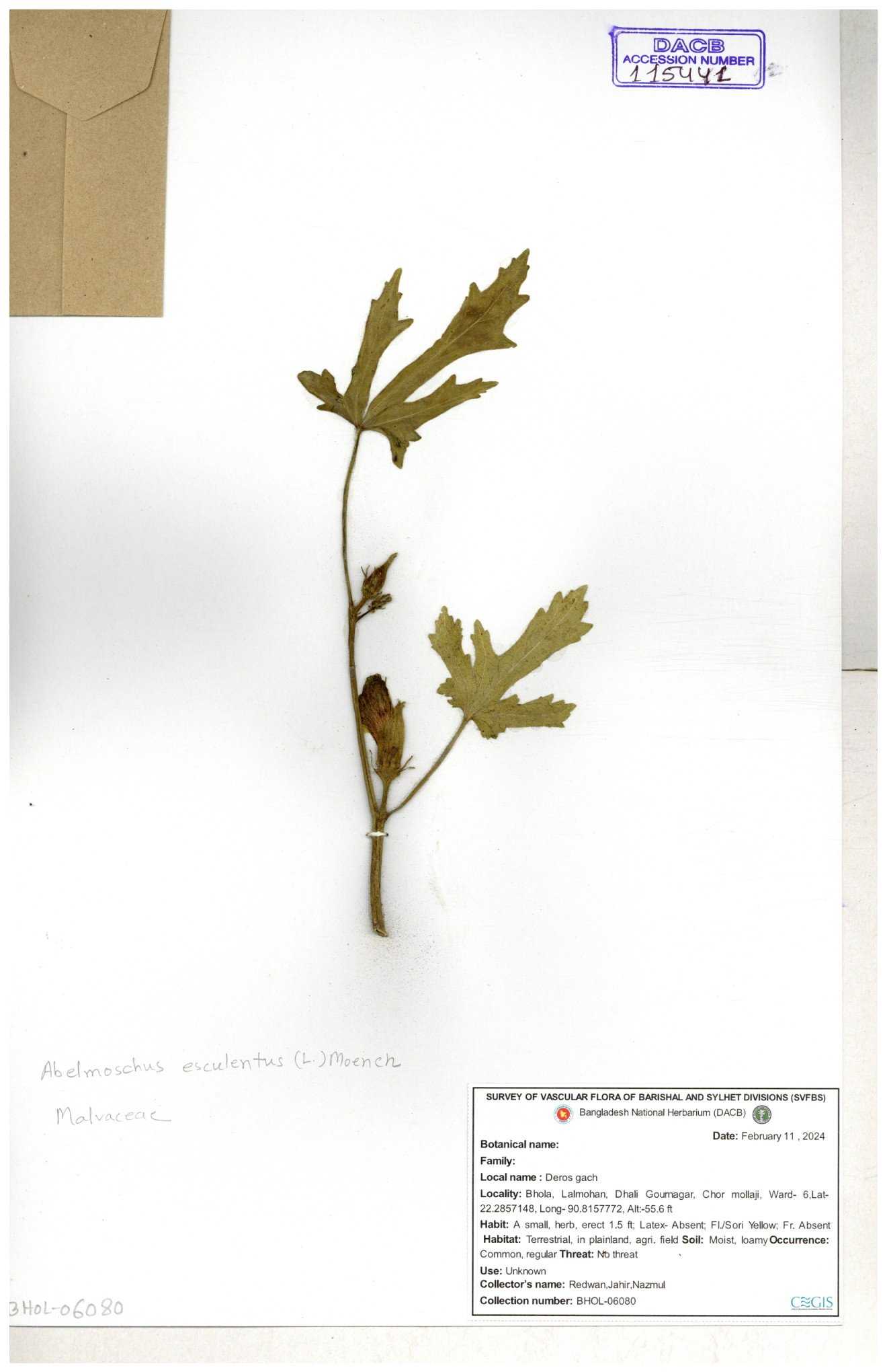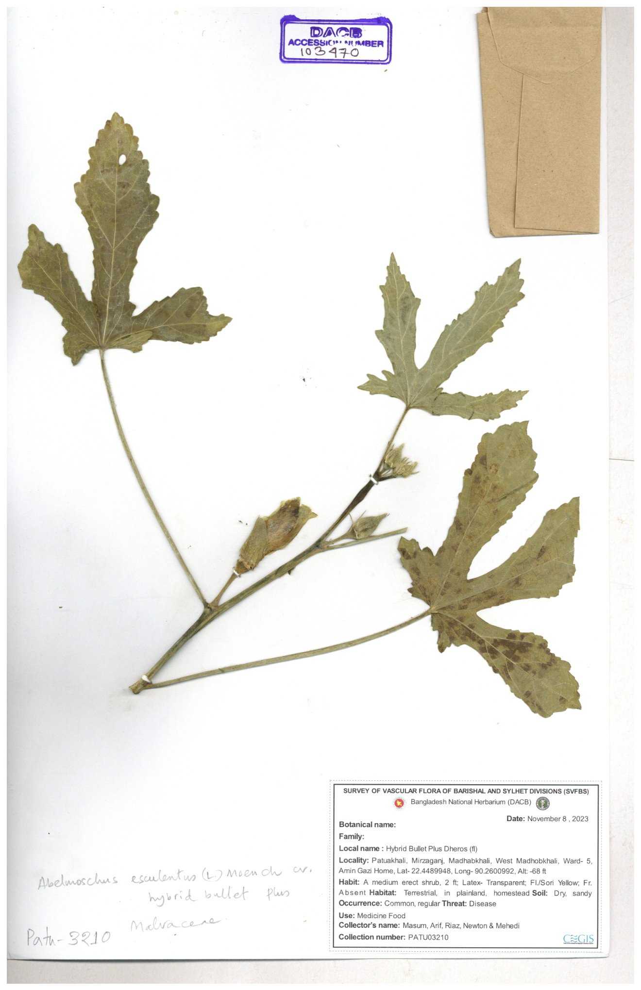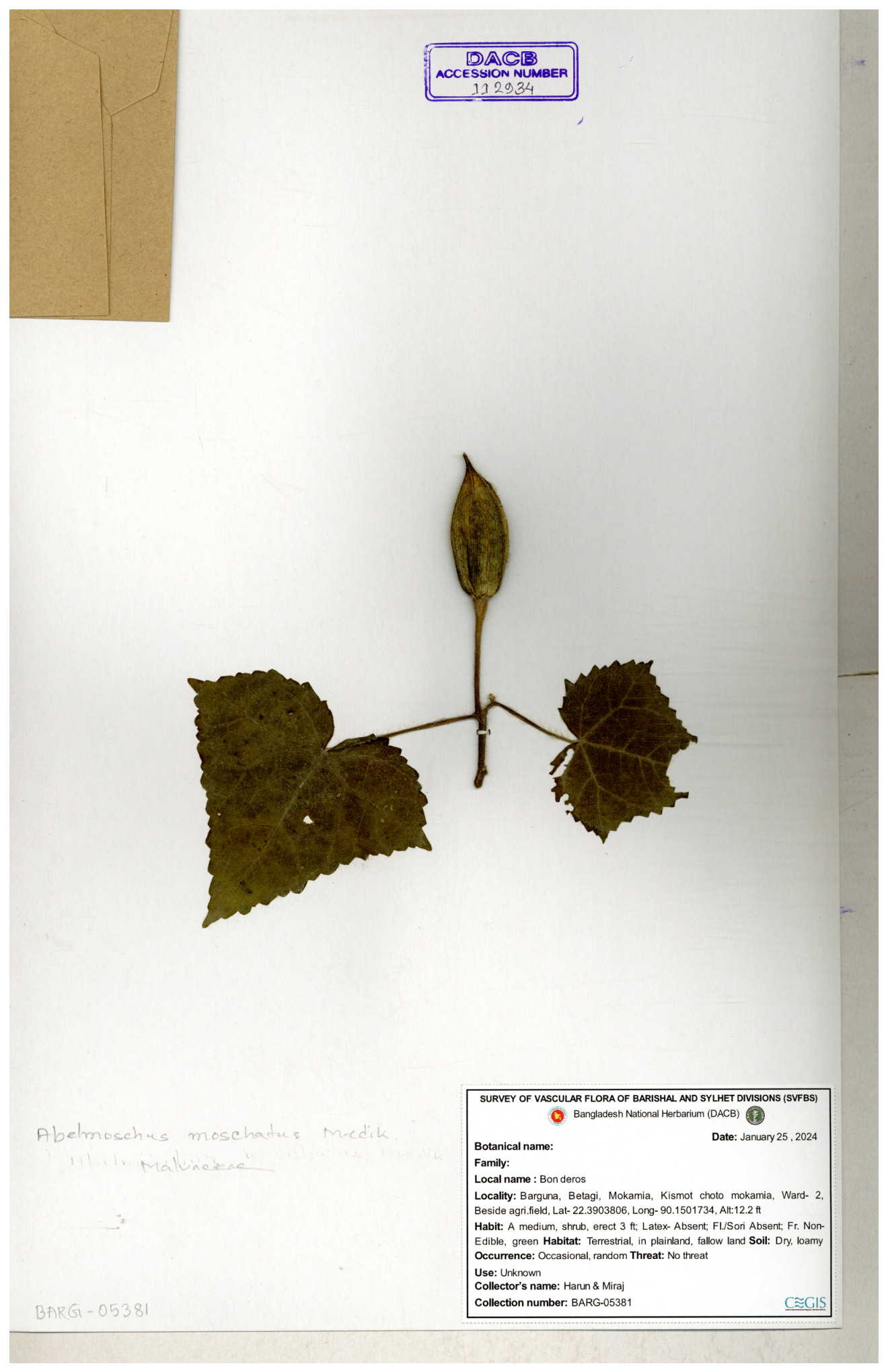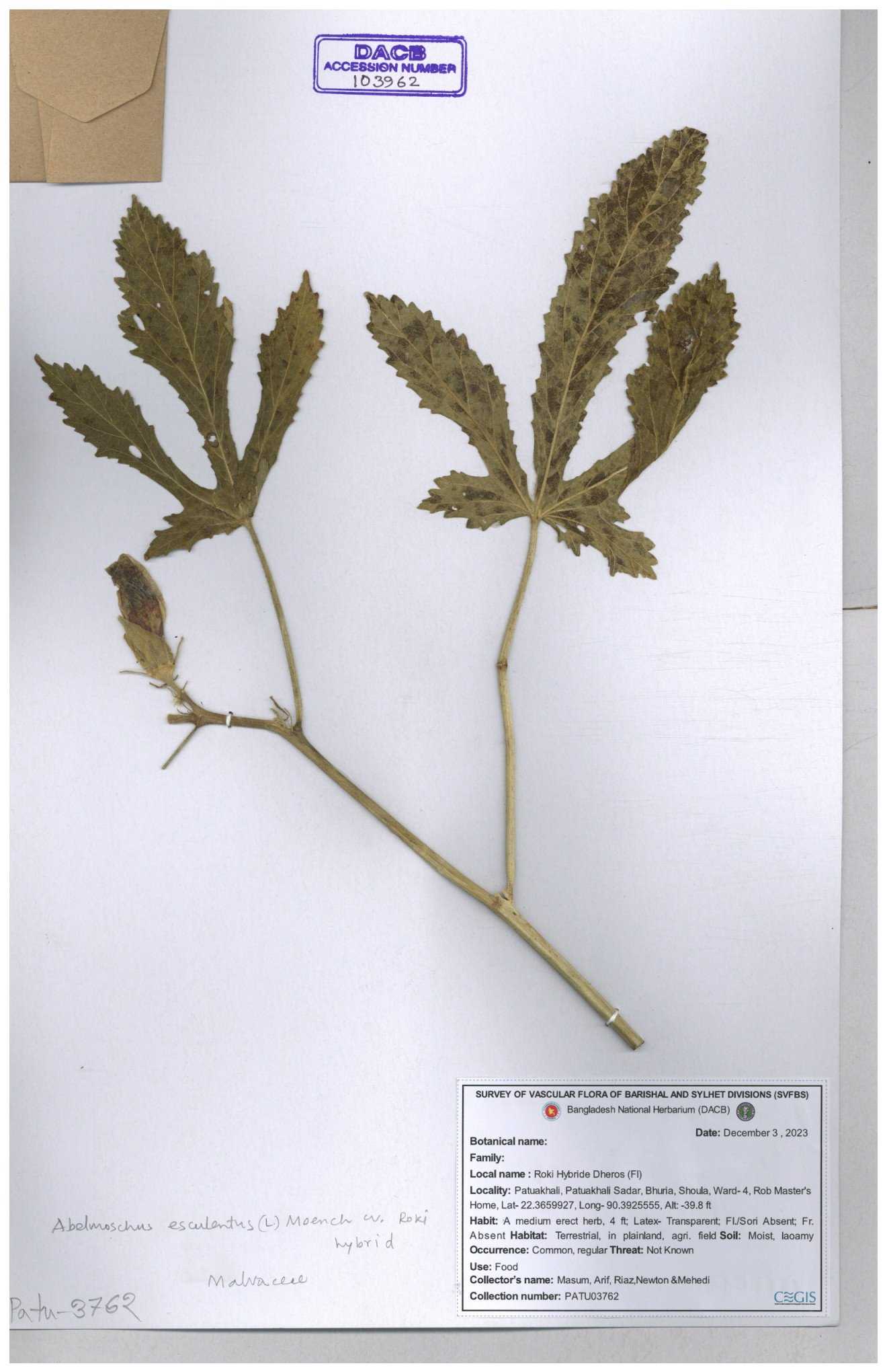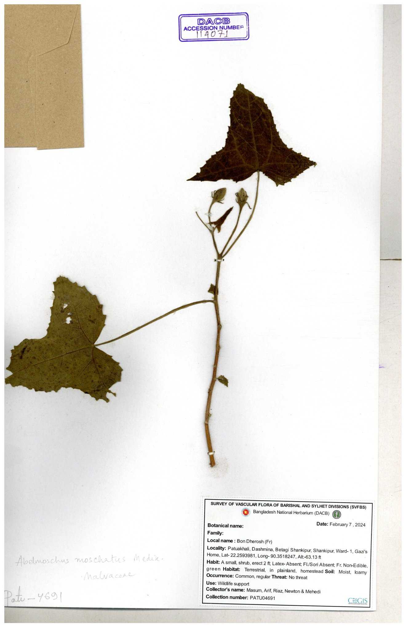 | 54204 | Malvaceae | Abelmoschus moschatus Medik. | Ban-Dheras | Md. Moniruzzaman, Al-Amin & Kawsar | MAK- 7136 10-01-2018 |