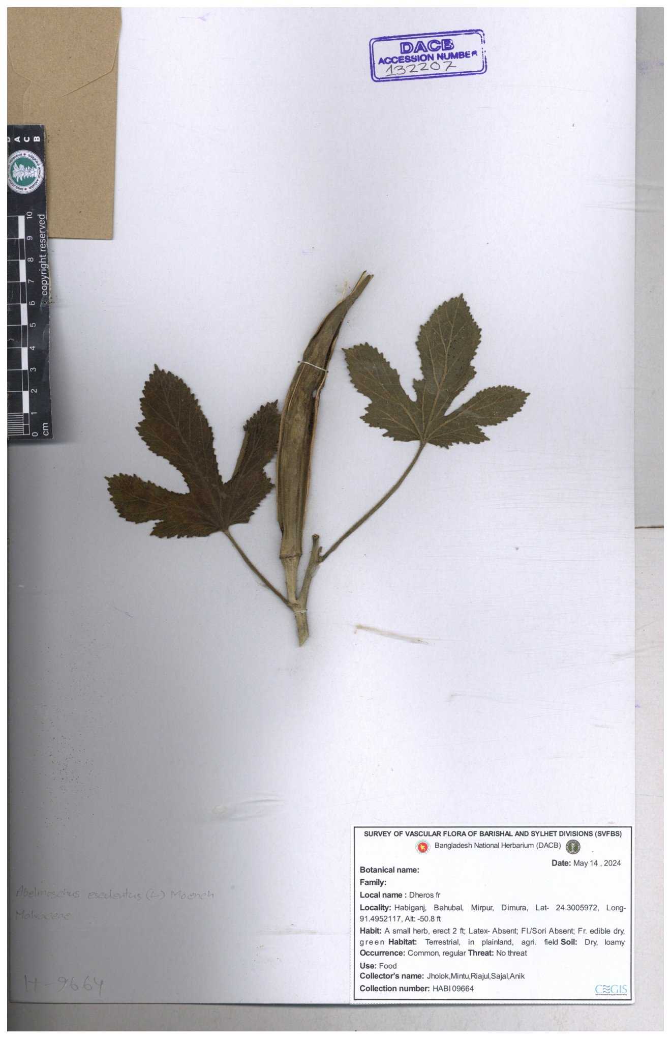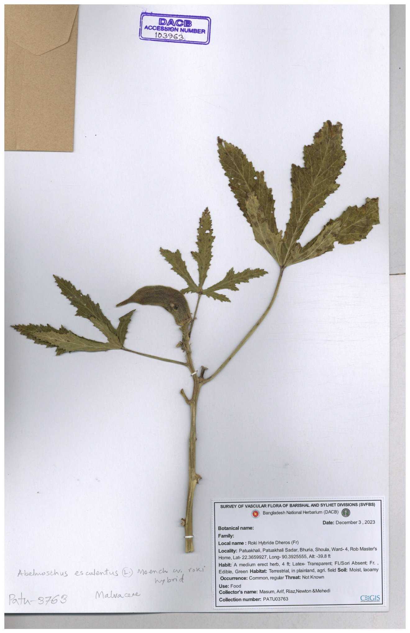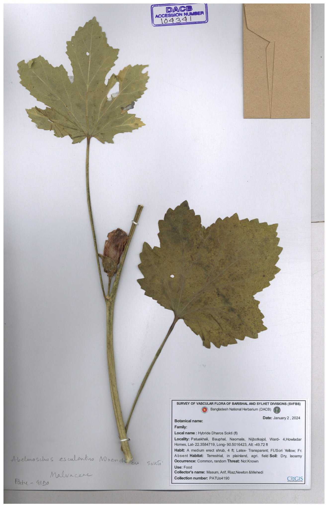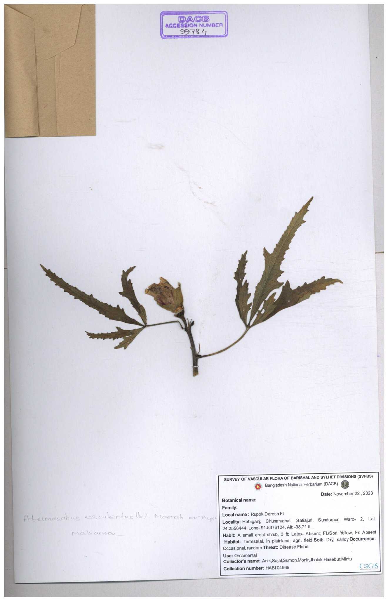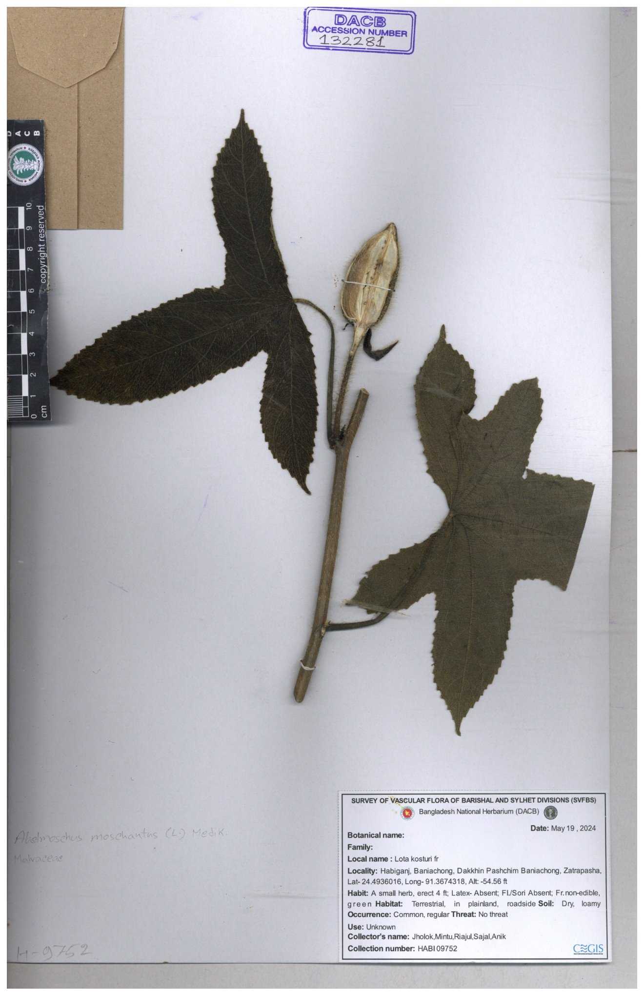 | 54204 | Malvaceae | Abelmoschus moschatus Medik. | Ban-Dheras | Md. Moniruzzaman, Al-Amin & Kawsar | MAK- 7136 10-01-2018 |