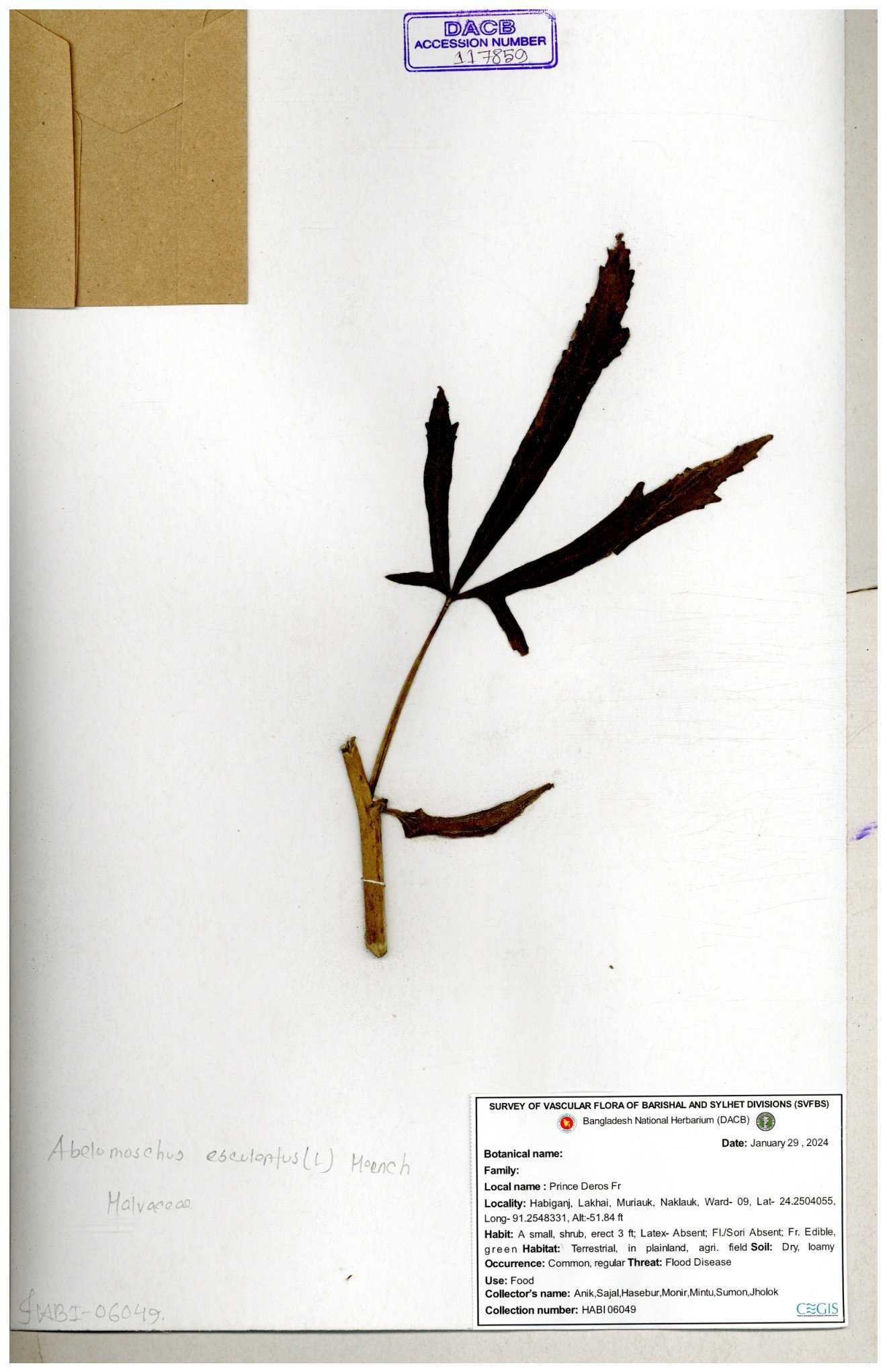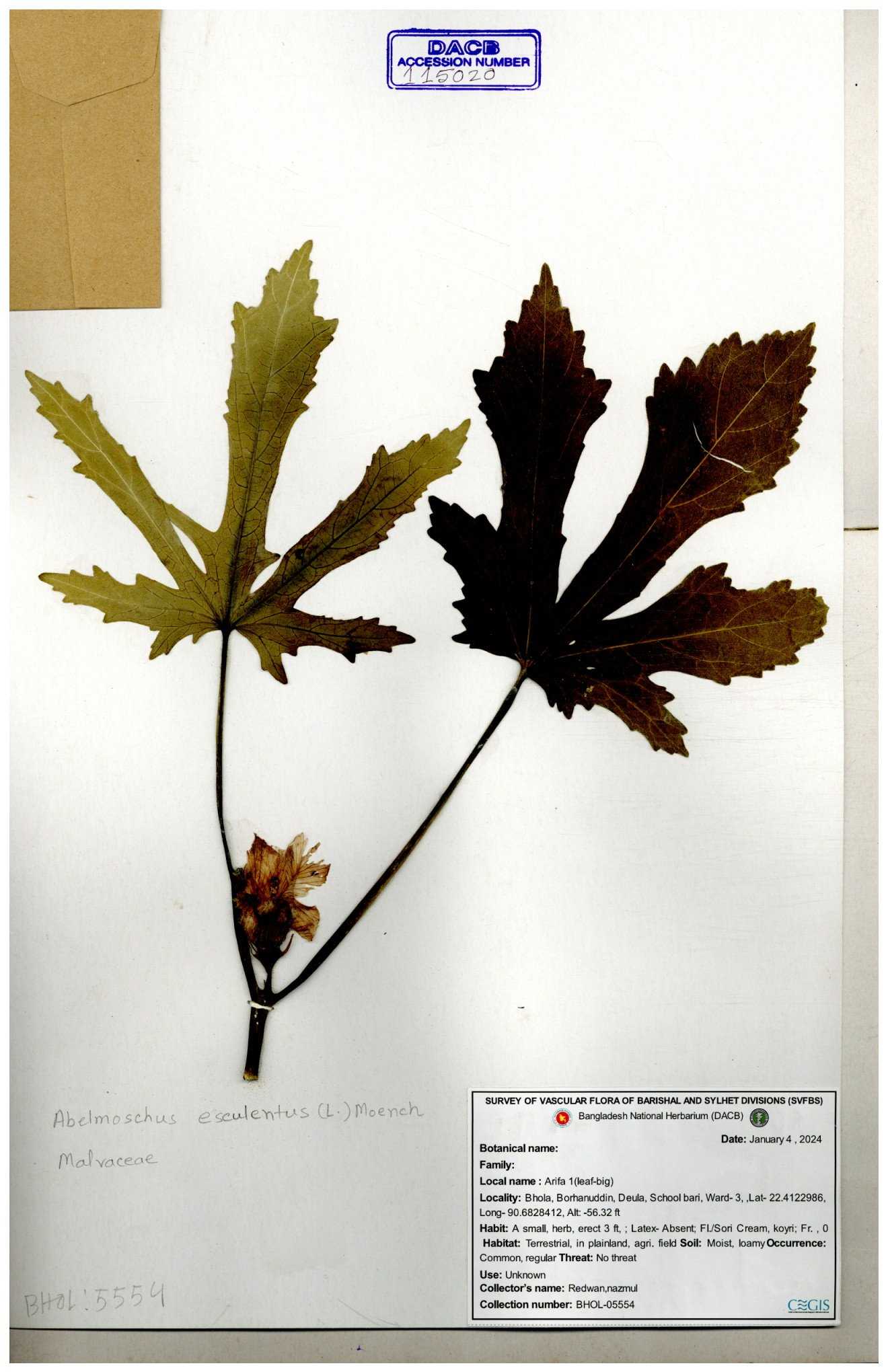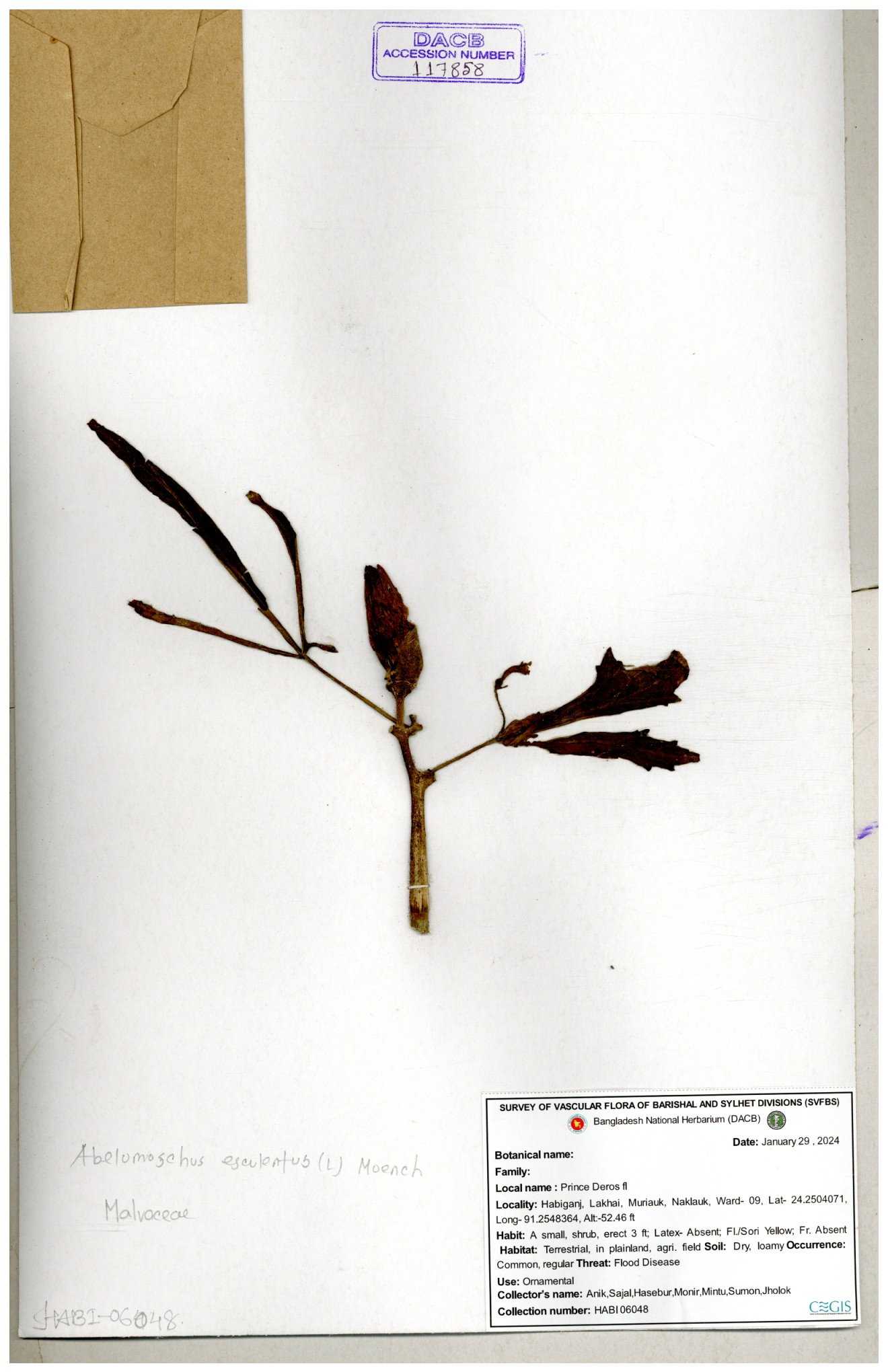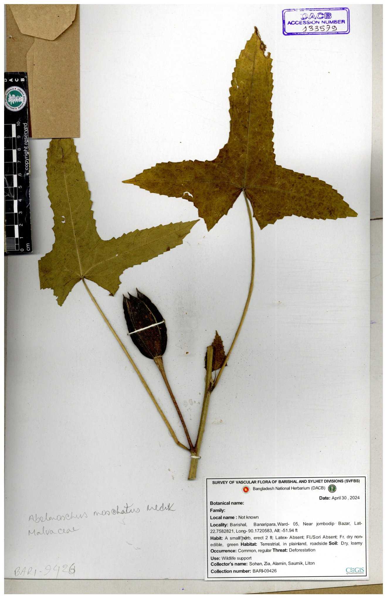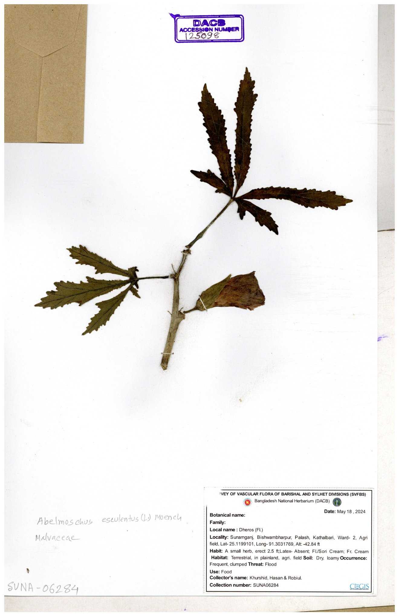 | 54204 | Malvaceae | Abelmoschus moschatus Medik. | Ban-Dheras | Md. Moniruzzaman, Al-Amin & Kawsar | MAK- 7136 10-01-2018 |