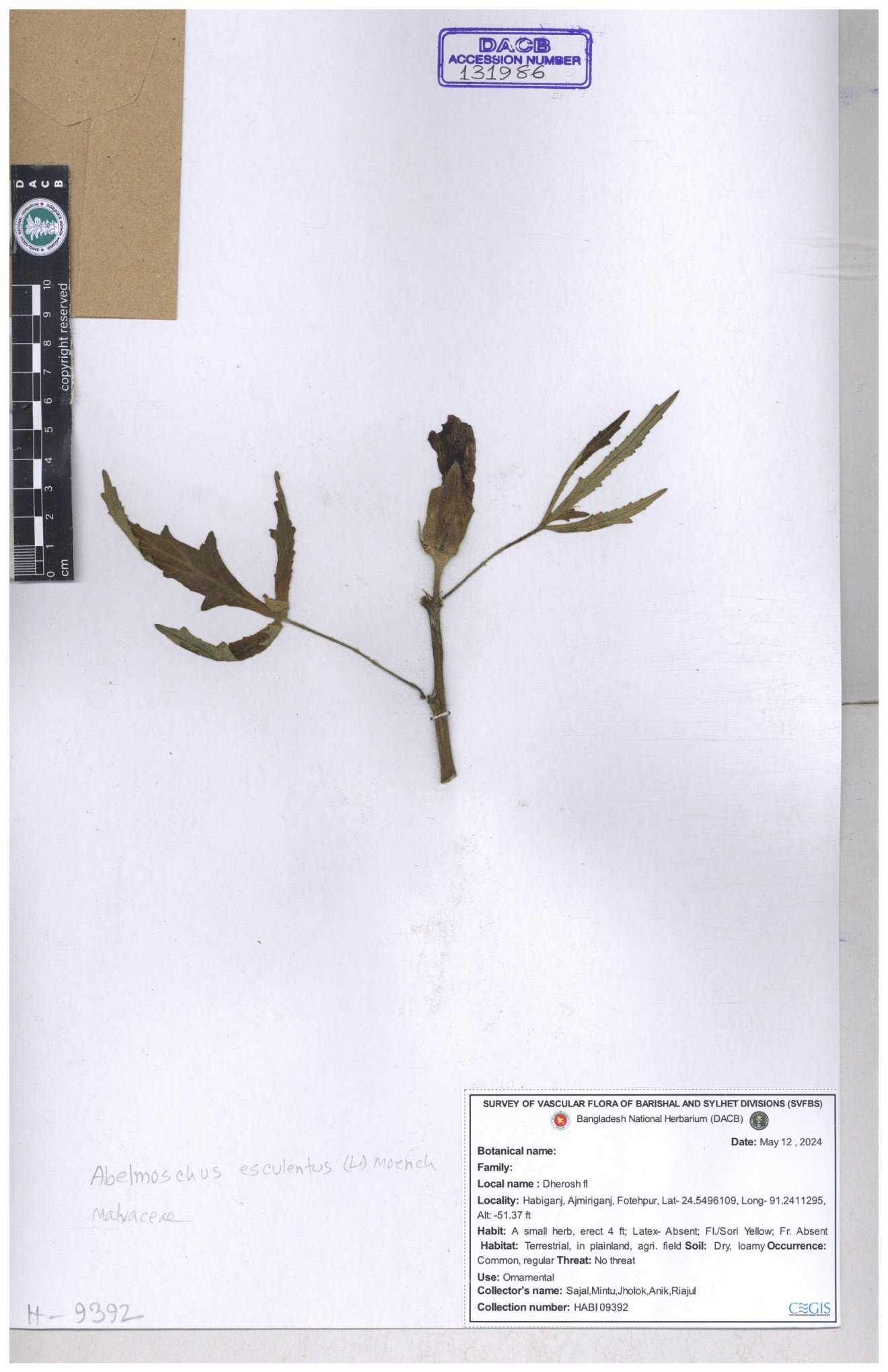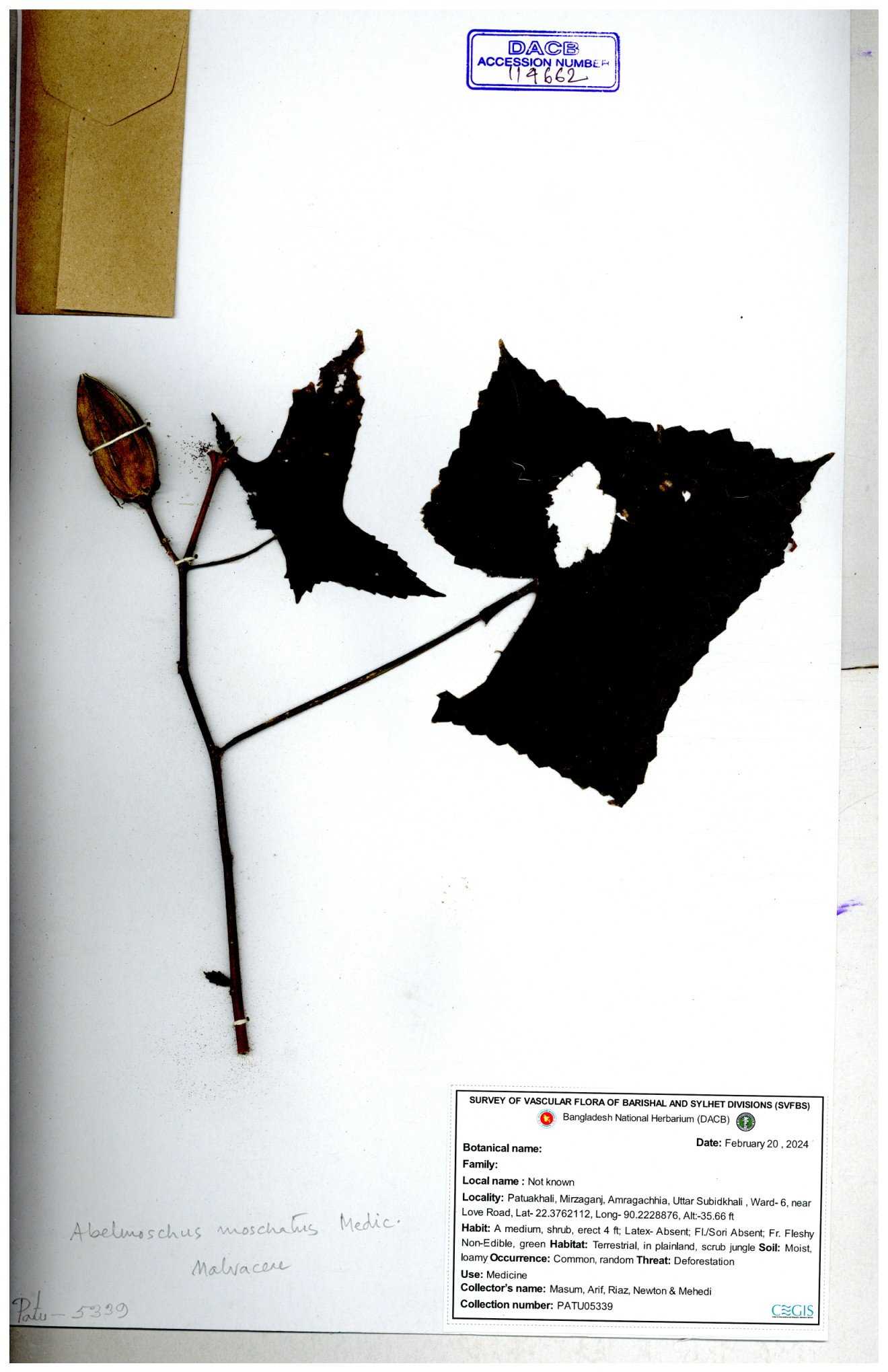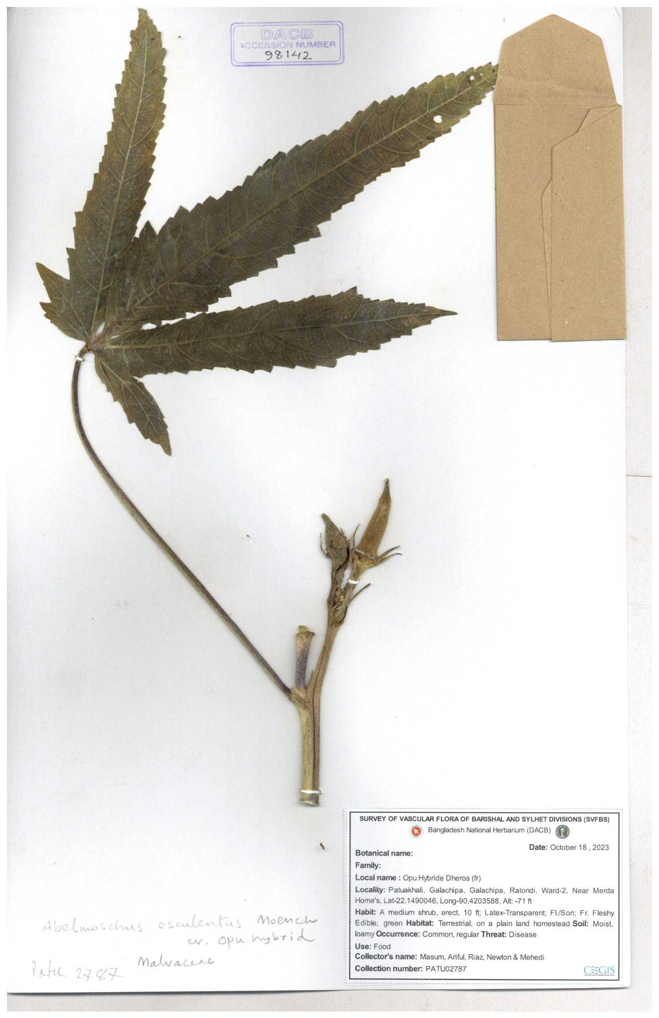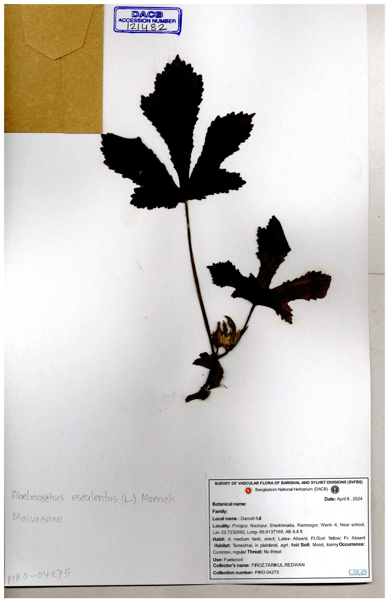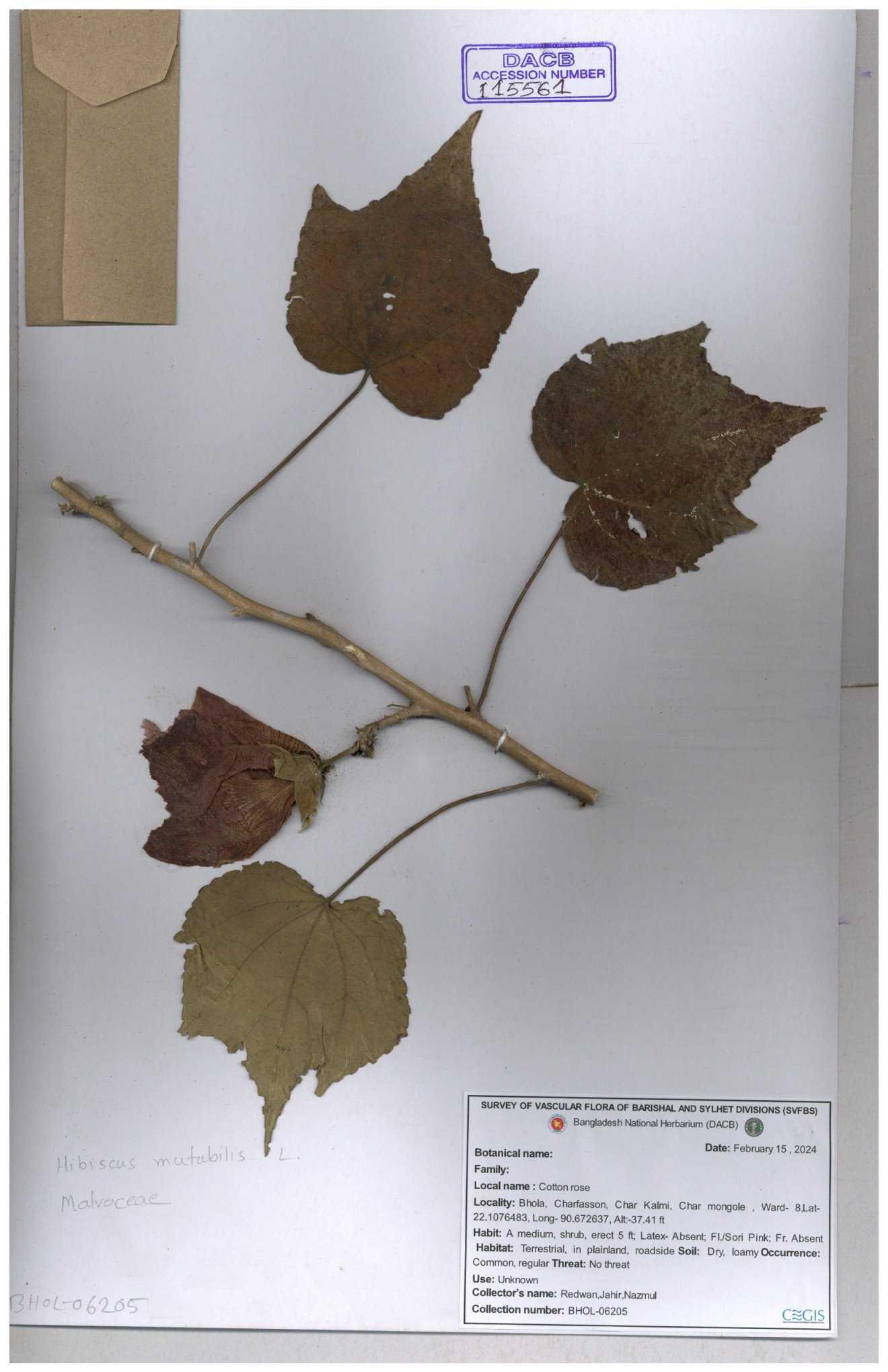 | 54204 | Malvaceae | Abelmoschus moschatus Medik. | Ban-Dheras | Md. Moniruzzaman, Al-Amin & Kawsar | MAK- 7136 10-01-2018 |