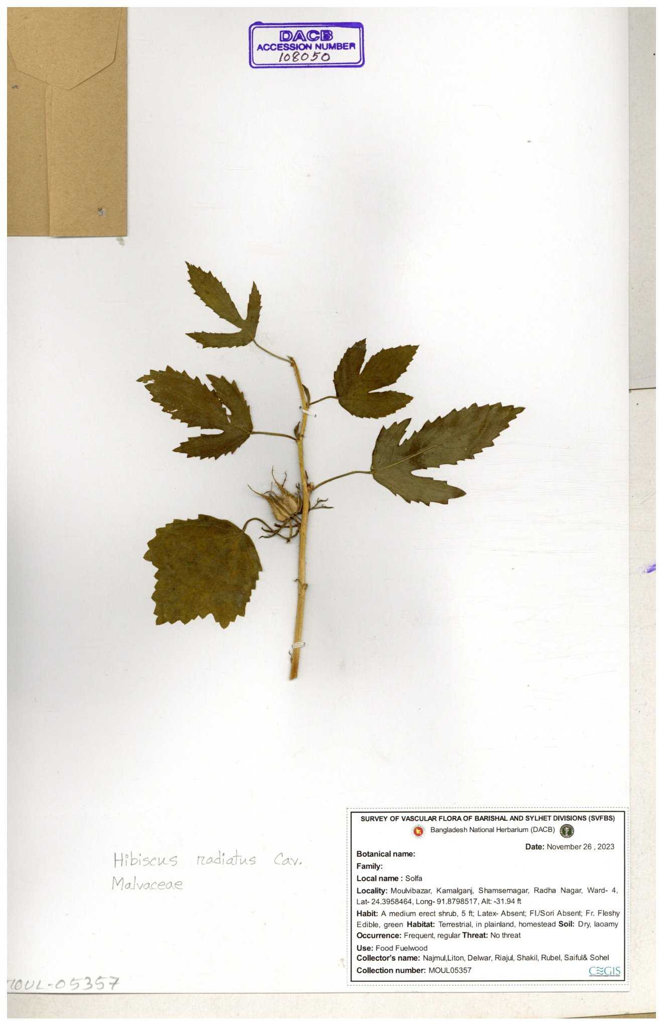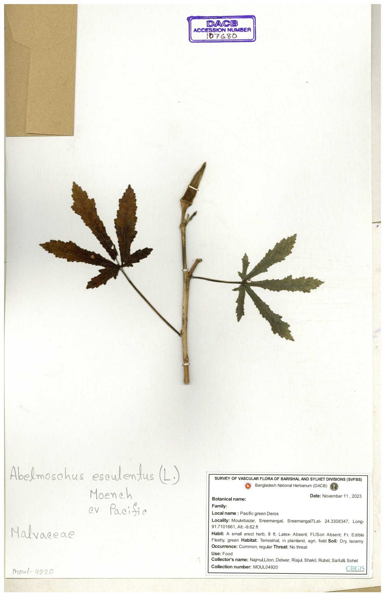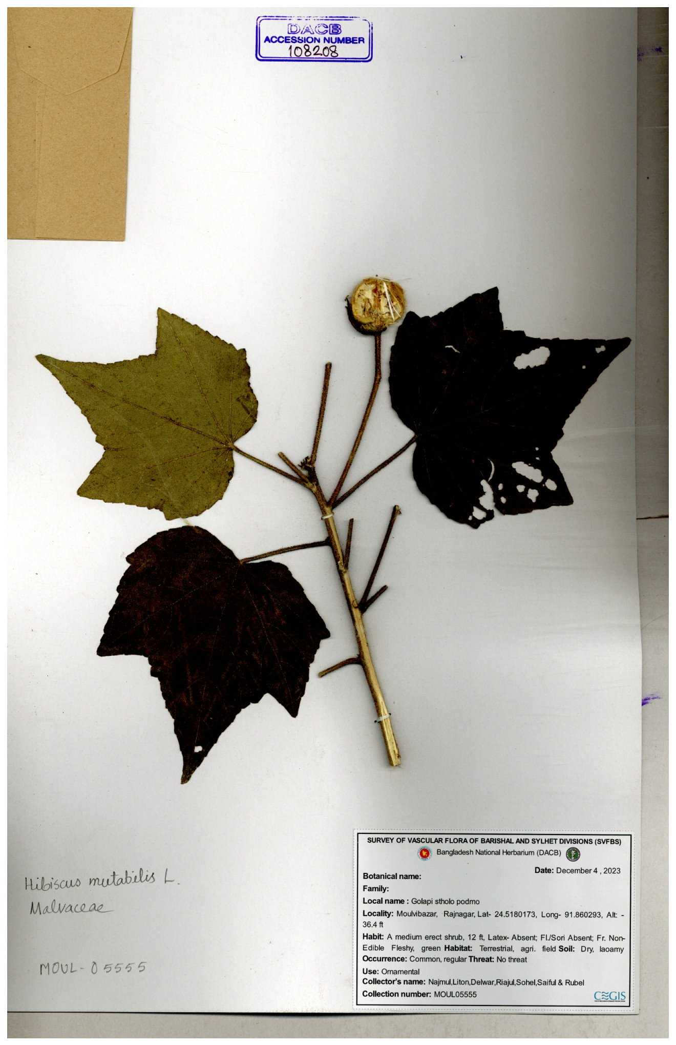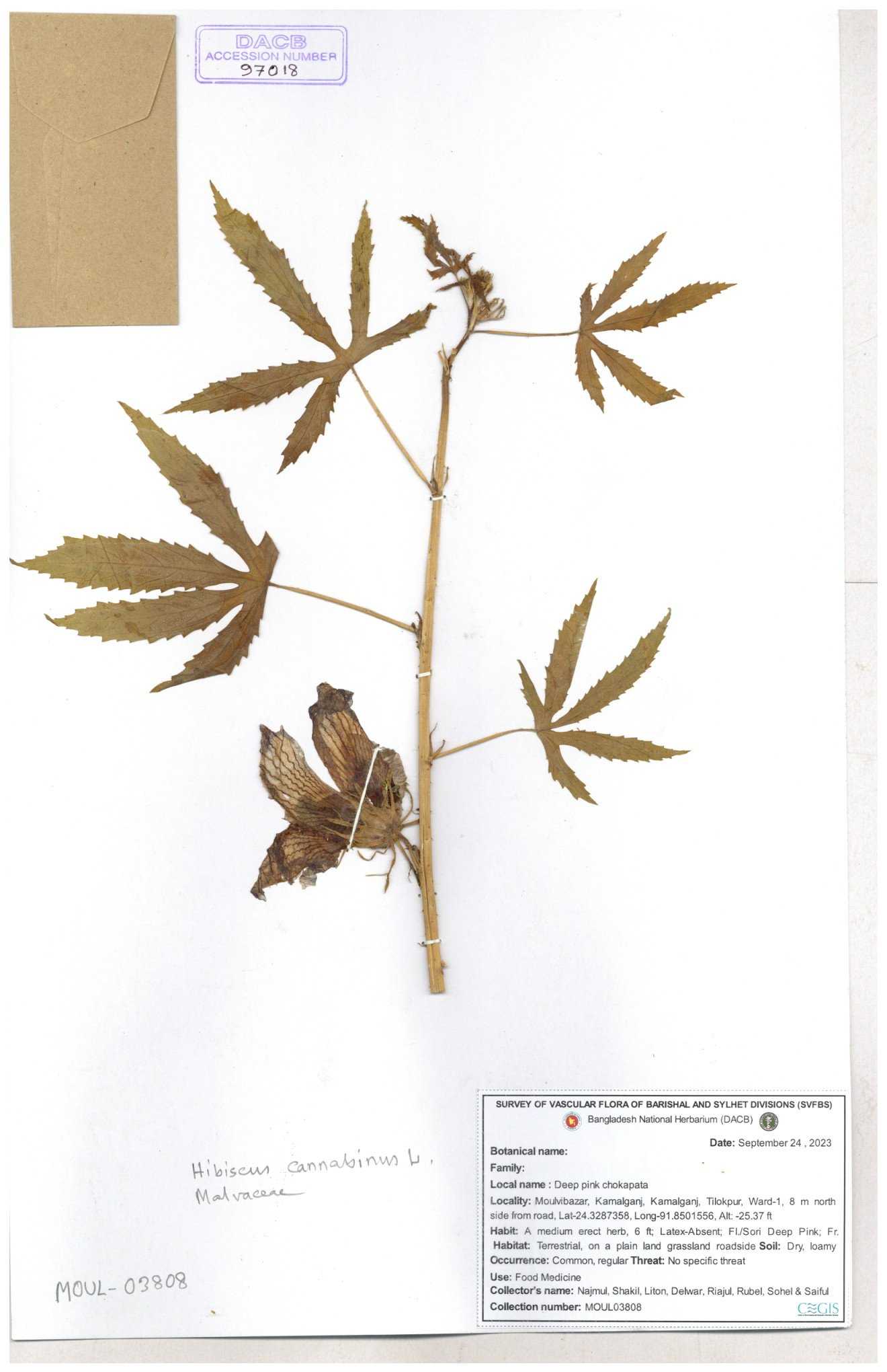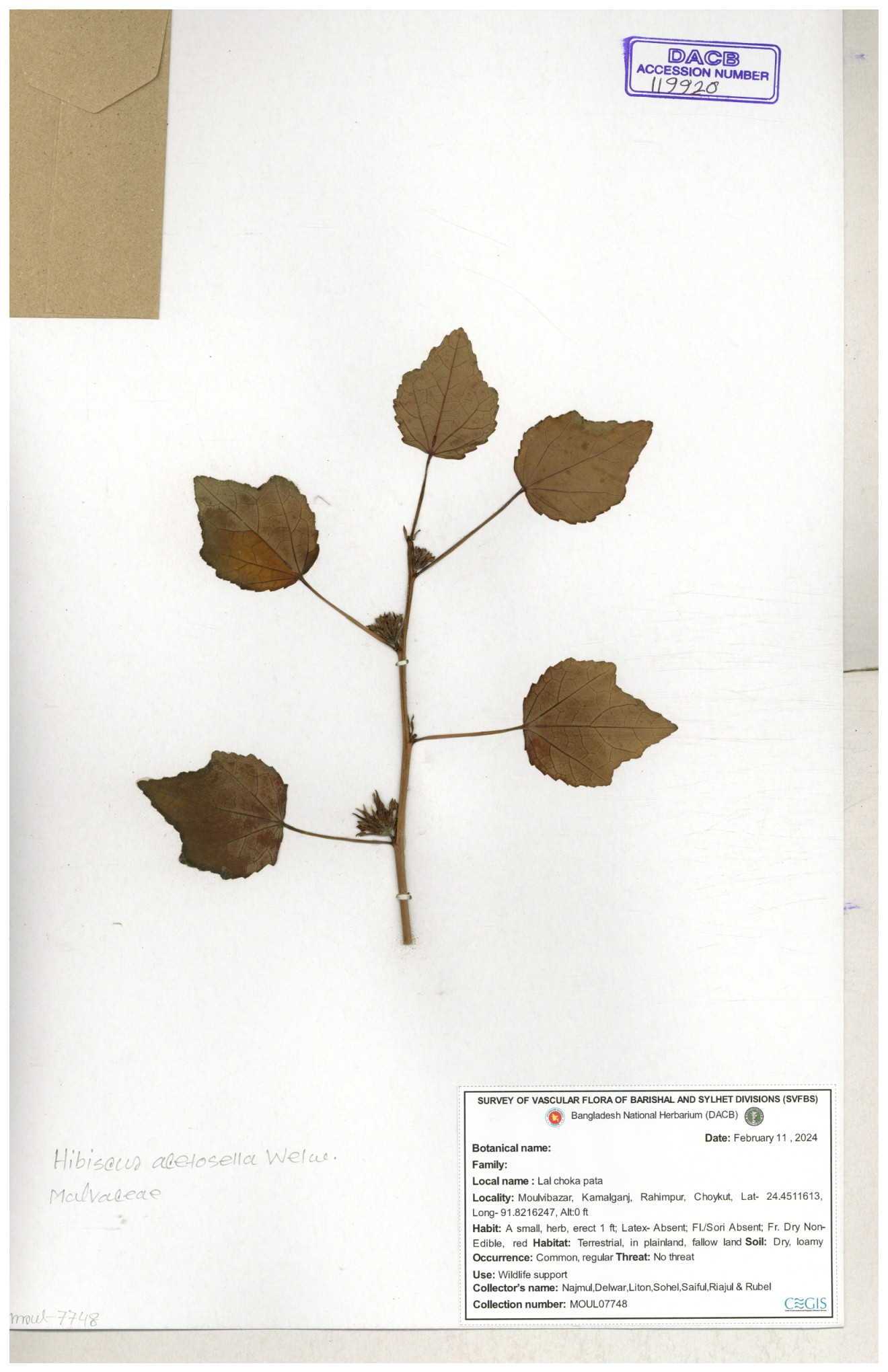 | 54204 | Malvaceae | Abelmoschus moschatus Medik. | Ban-Dheras | Md. Moniruzzaman, Al-Amin & Kawsar | MAK- 7136 10-01-2018 |