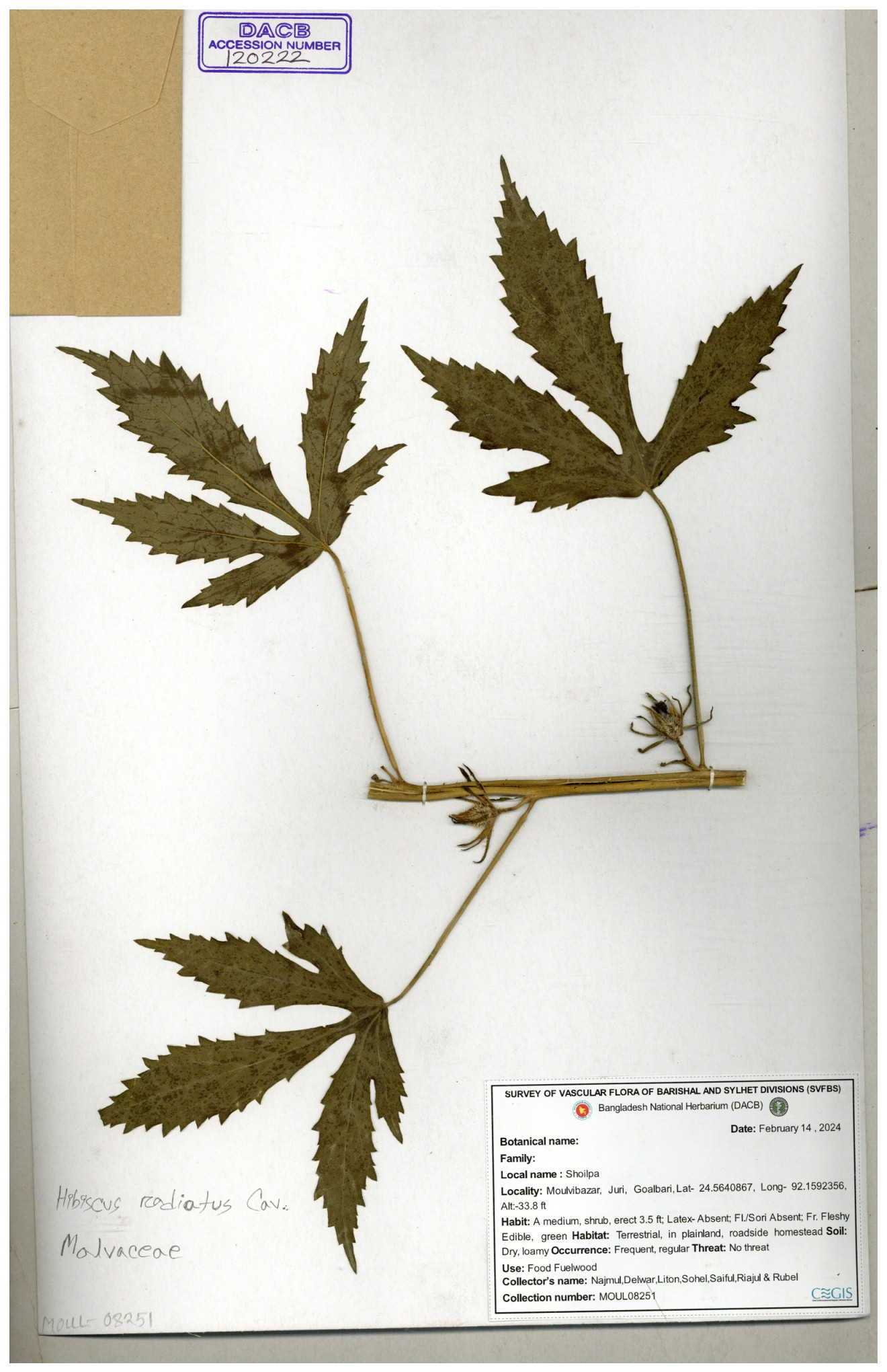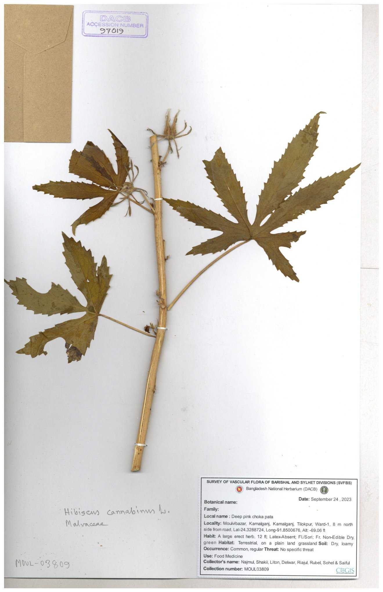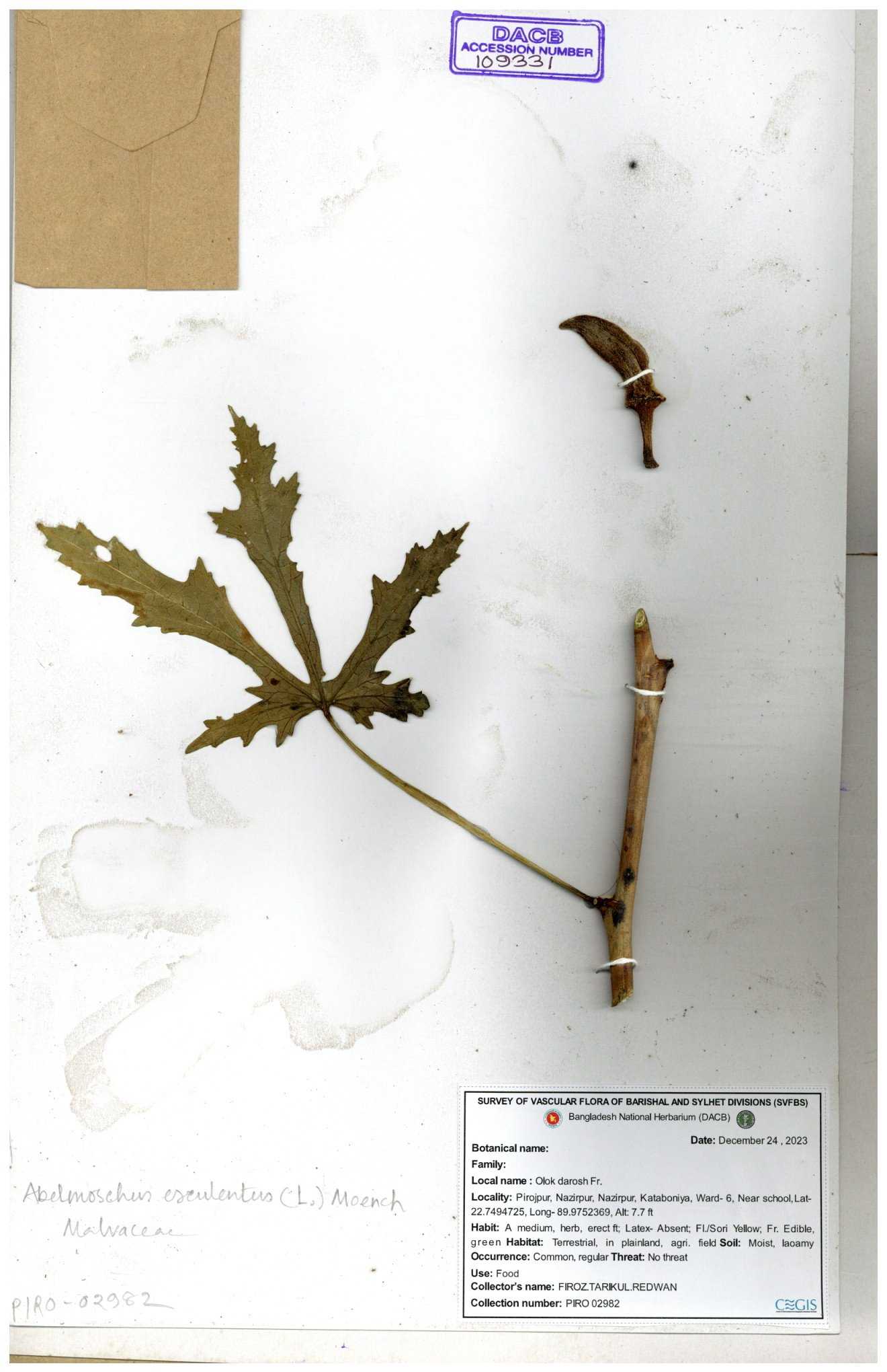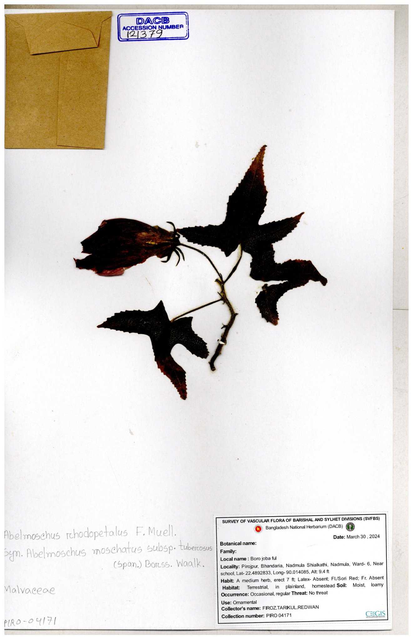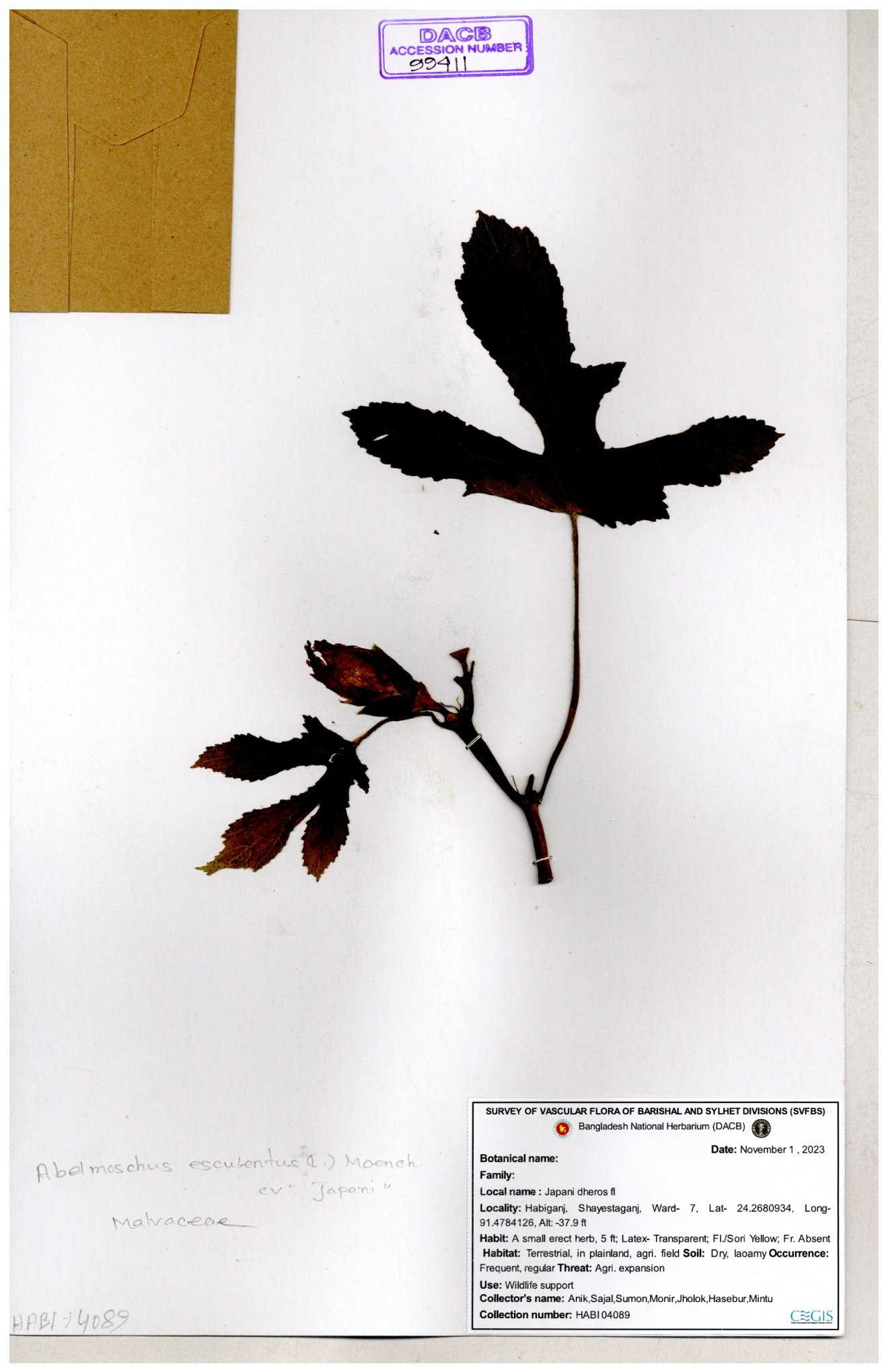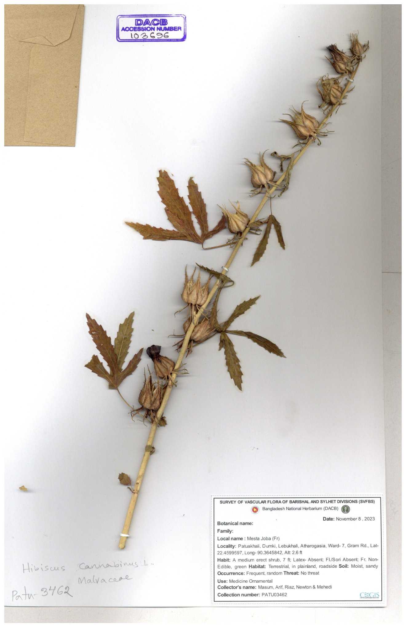 | 54204 | Malvaceae | Abelmoschus moschatus Medik. | Ban-Dheras | Md. Moniruzzaman, Al-Amin & Kawsar | MAK- 7136 10-01-2018 |