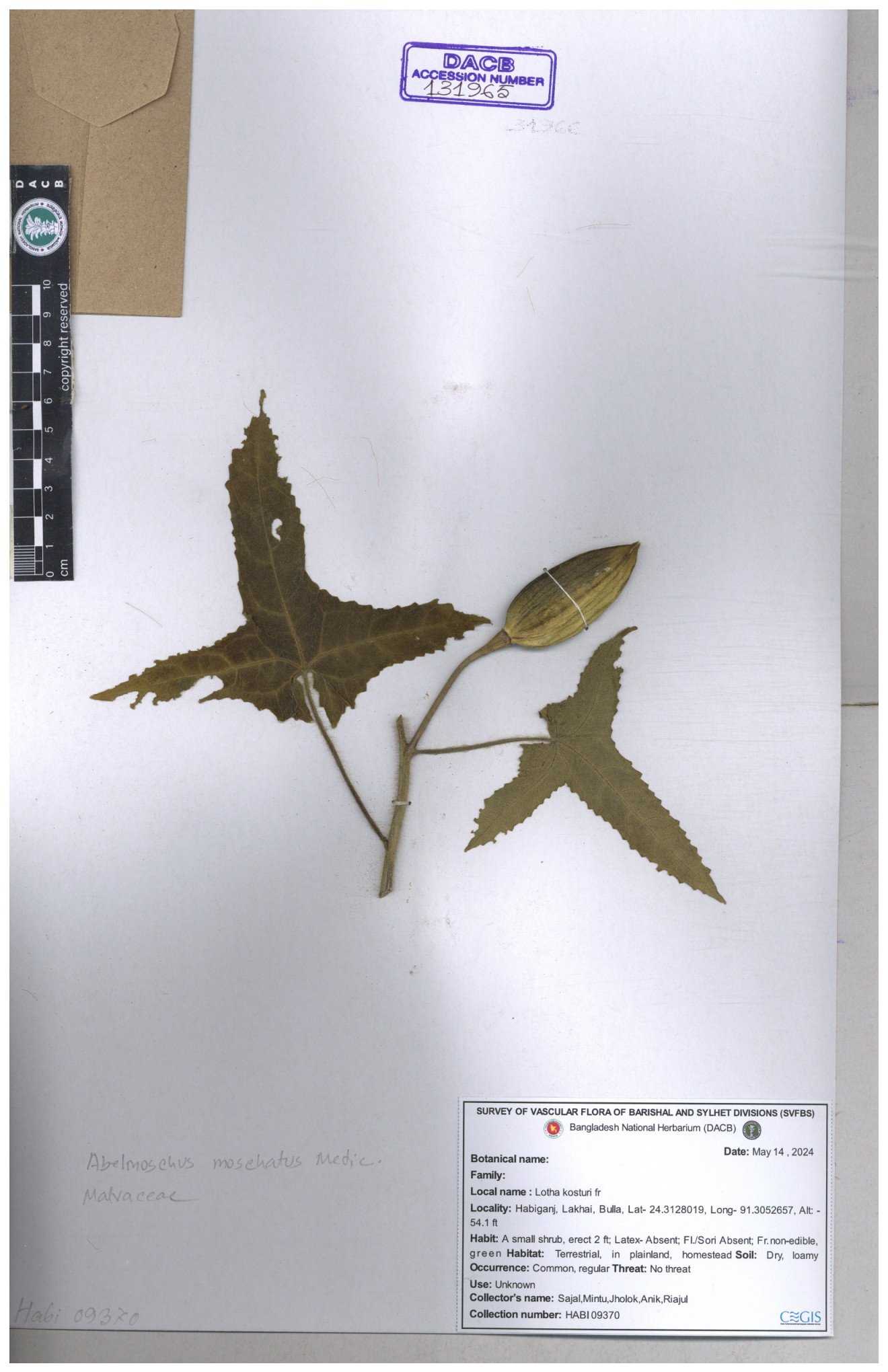 | 54194 | Malvaceae | Abelmoschus moschatus Medik. | Bon-Dheras | Md. Moniruzzaman, Al-Amin & Kawsar | MAK- 6456 24-11-2017 |