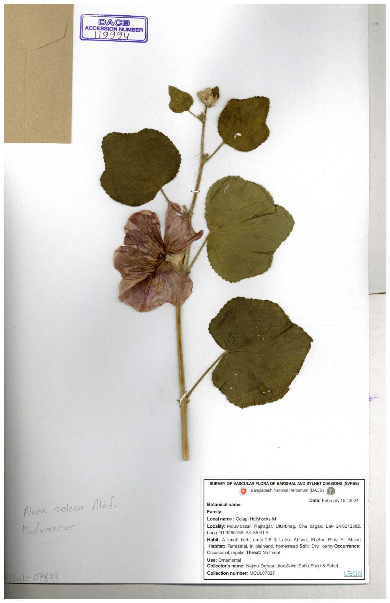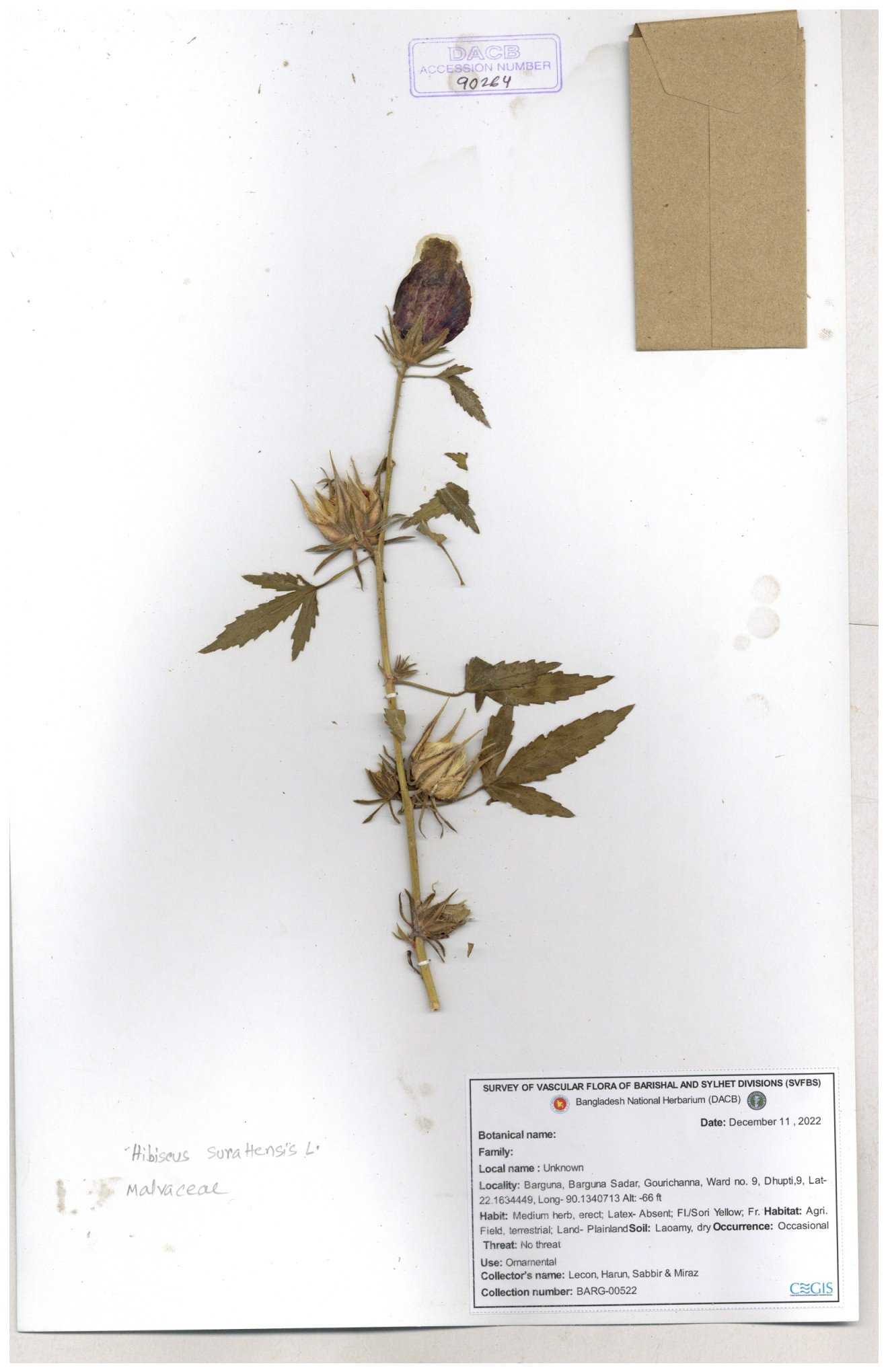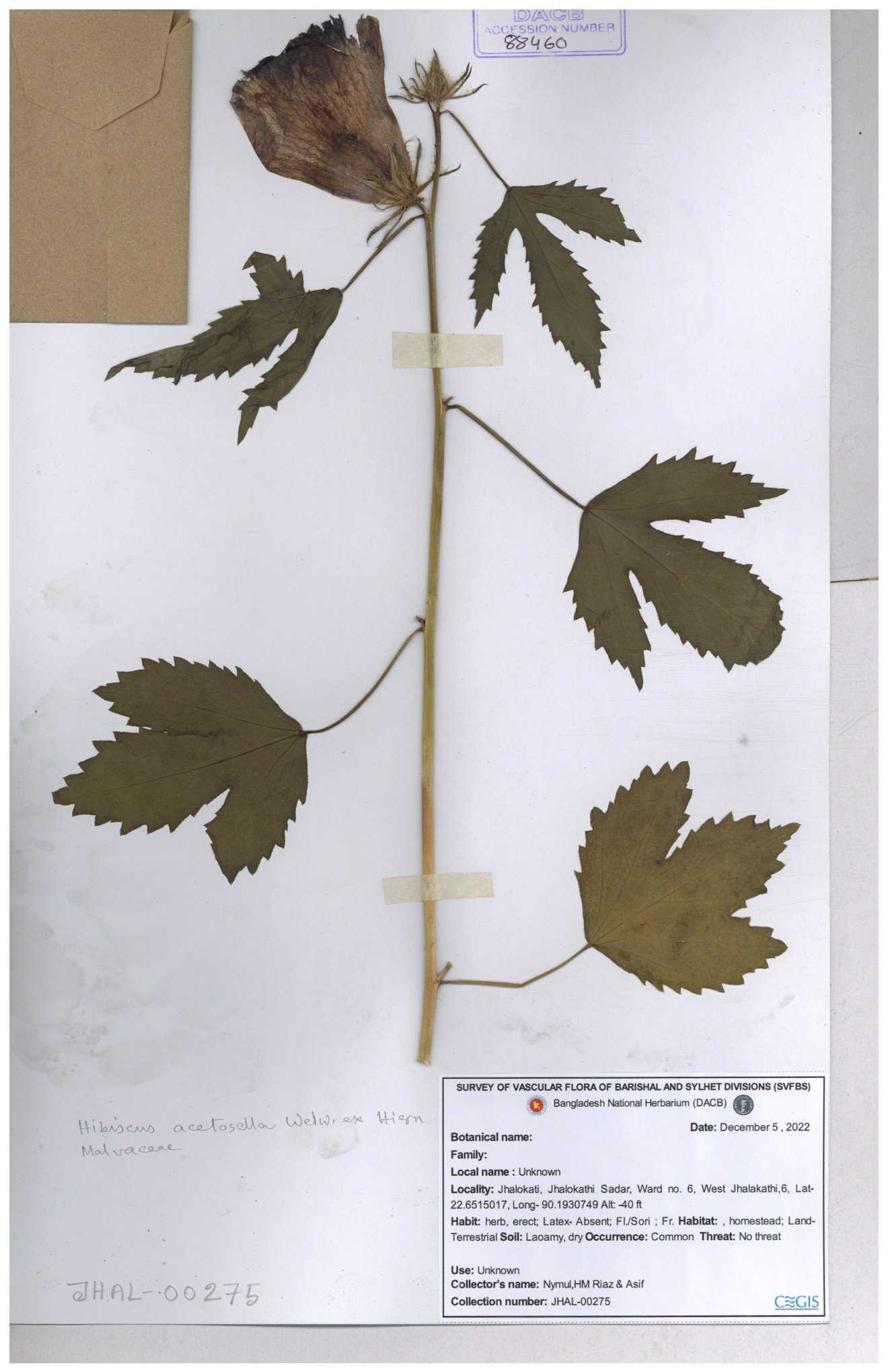 | 52725 | Malvaceae | Abelmoschus moschatus Medik. | Ban-Dheros | Md. Moniruzzaman, Al-Amin & Kawsar | MAK- 5712 19-09-2017 |