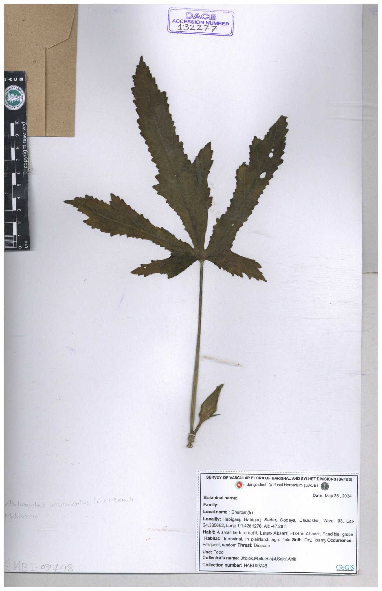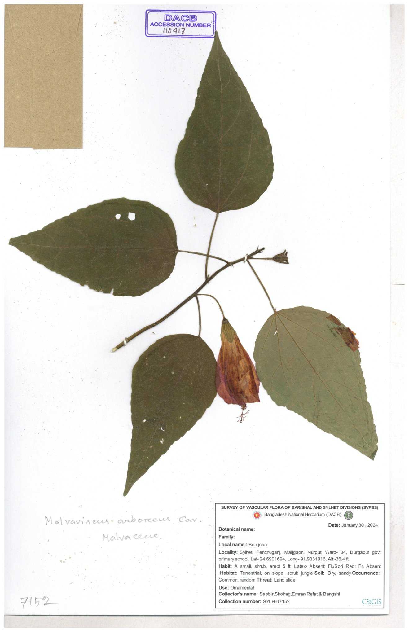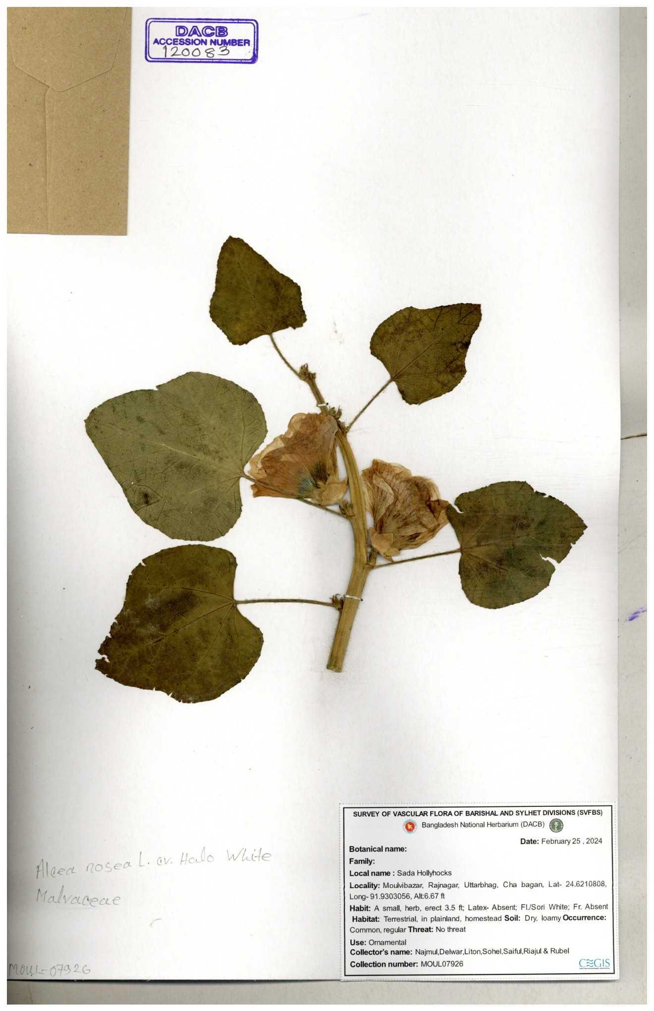 | 52725 | Malvaceae | Abelmoschus moschatus Medik. | Ban-Dheros | Md. Moniruzzaman, Al-Amin & Kawsar | MAK- 5712 19-09-2017 |